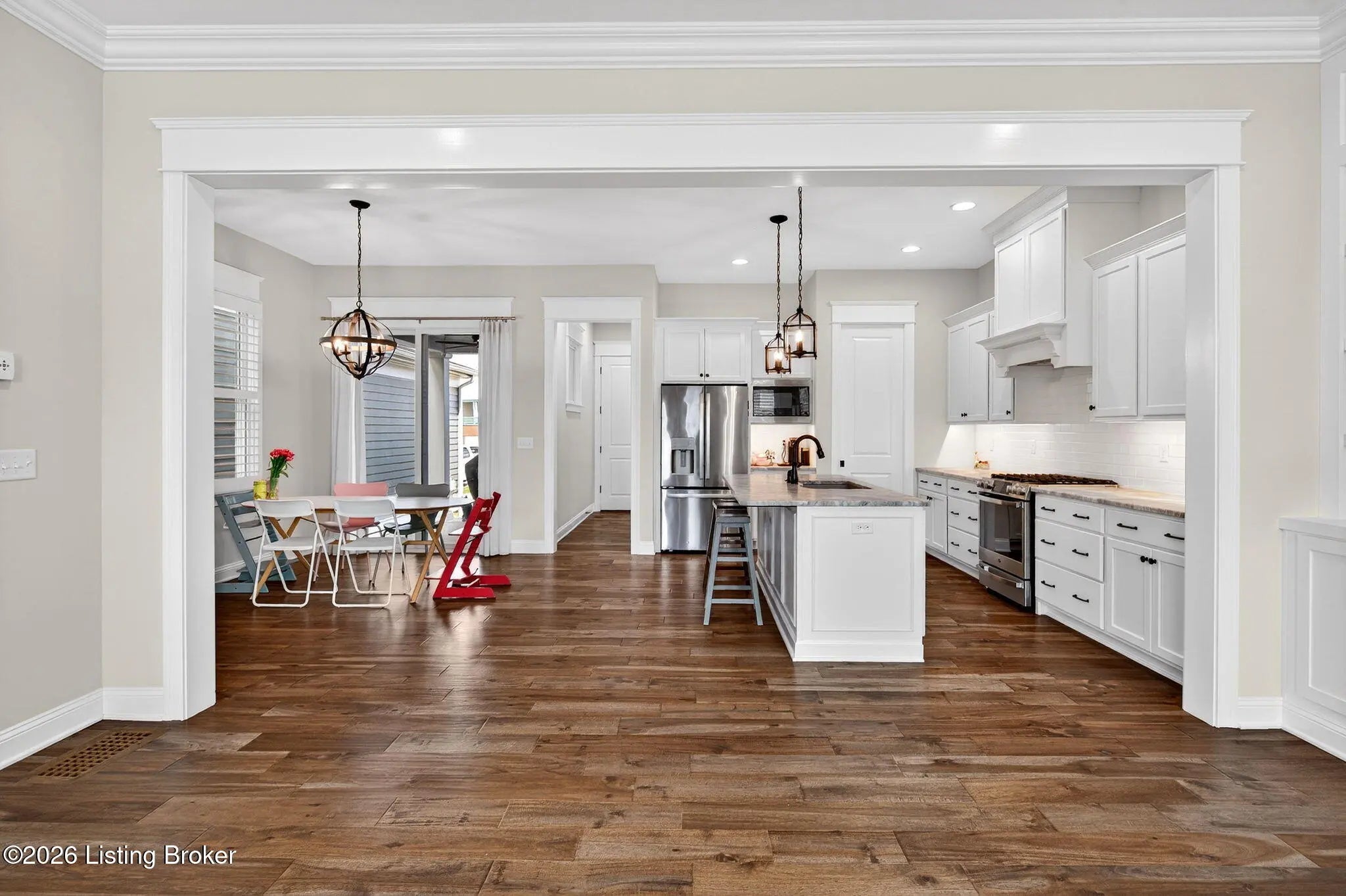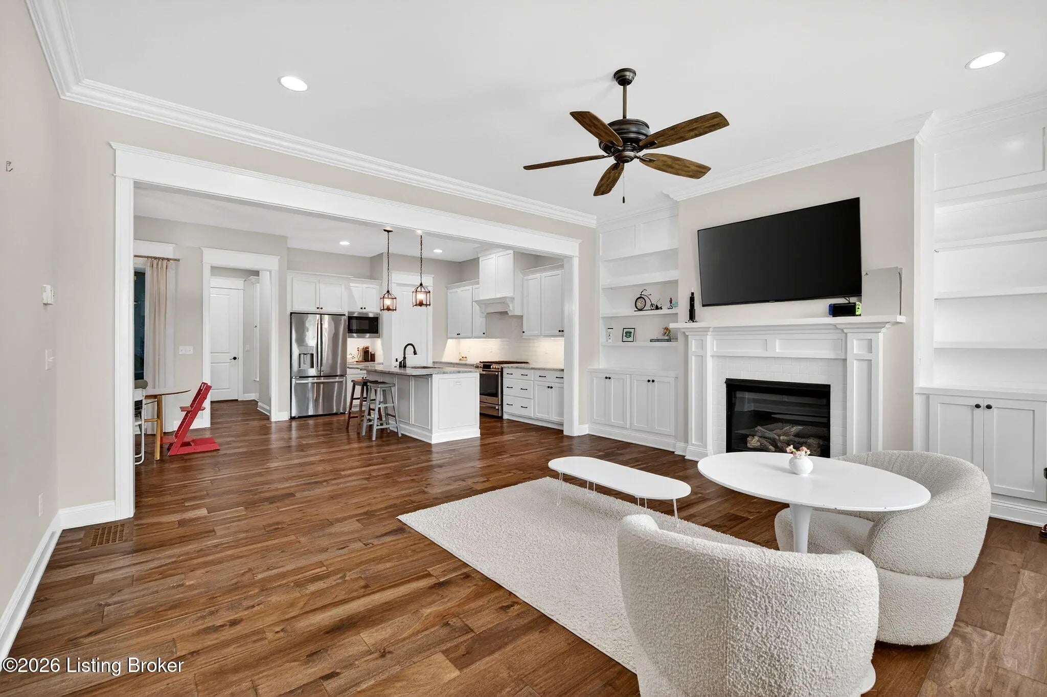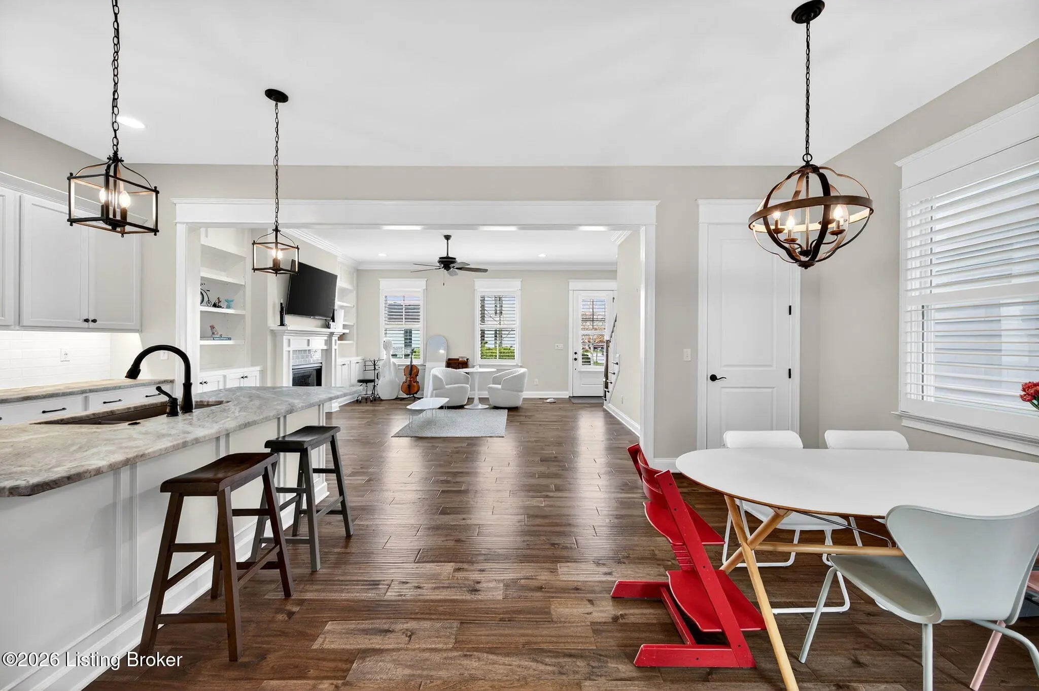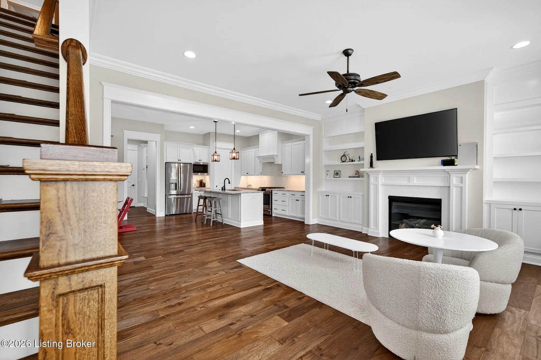WONDERFUL and IMMACULATE two story 4 BEDROOM, 3 FULL BATH, FINISHED BASEMENT, CUSTOM BUILT home by Built by Mastercraft Homes, LLC that FEELS LIKE BRAND NEW!! Elegant trim work, 10 ft ceilings, hardwood floors throughout first floor, custom built ins, bookshelves, fireplace, lots of natural light, plantation shutters, custom cabinets in the kitchen, large island, nice sized pantry, stainless steel appliances, this home has it all! Be welcomed into the warm open floor plan with a brilliant great room flowing into the kitchen and dining area and then out to the covered side porch though the glass doors. The back entrance off the attached garage has a mud room with cubbies and a half bath. The amazing kitchen has lots of counter space and pantry has wood shelves for storage. The second floor has a private primary suite with two walk-in closets, and serene primary bathroom with tiled shower. There are two additional bedrooms, with a Jack and Jill 2nd full bath with tile surround in the tub/shower and a very nice laundry room with cabinets for storage. There is also an oversized large linen closet with wood shelving in the hallway. The basement has been professionally completed with a nice size family room with built in shelving with mini refrigerator. There is also a 4th bedroom with an egress window and attached full bathroom with tiled bath! Geothermal HVAC system and a very young roof make this home move in ready and maintenance free living! Be steps away or ride in a few minutes to restaurants, shopping, doctors offices, parks, 3 pools, music by the water events and SO many great activities available in NORTON COMMONS!!