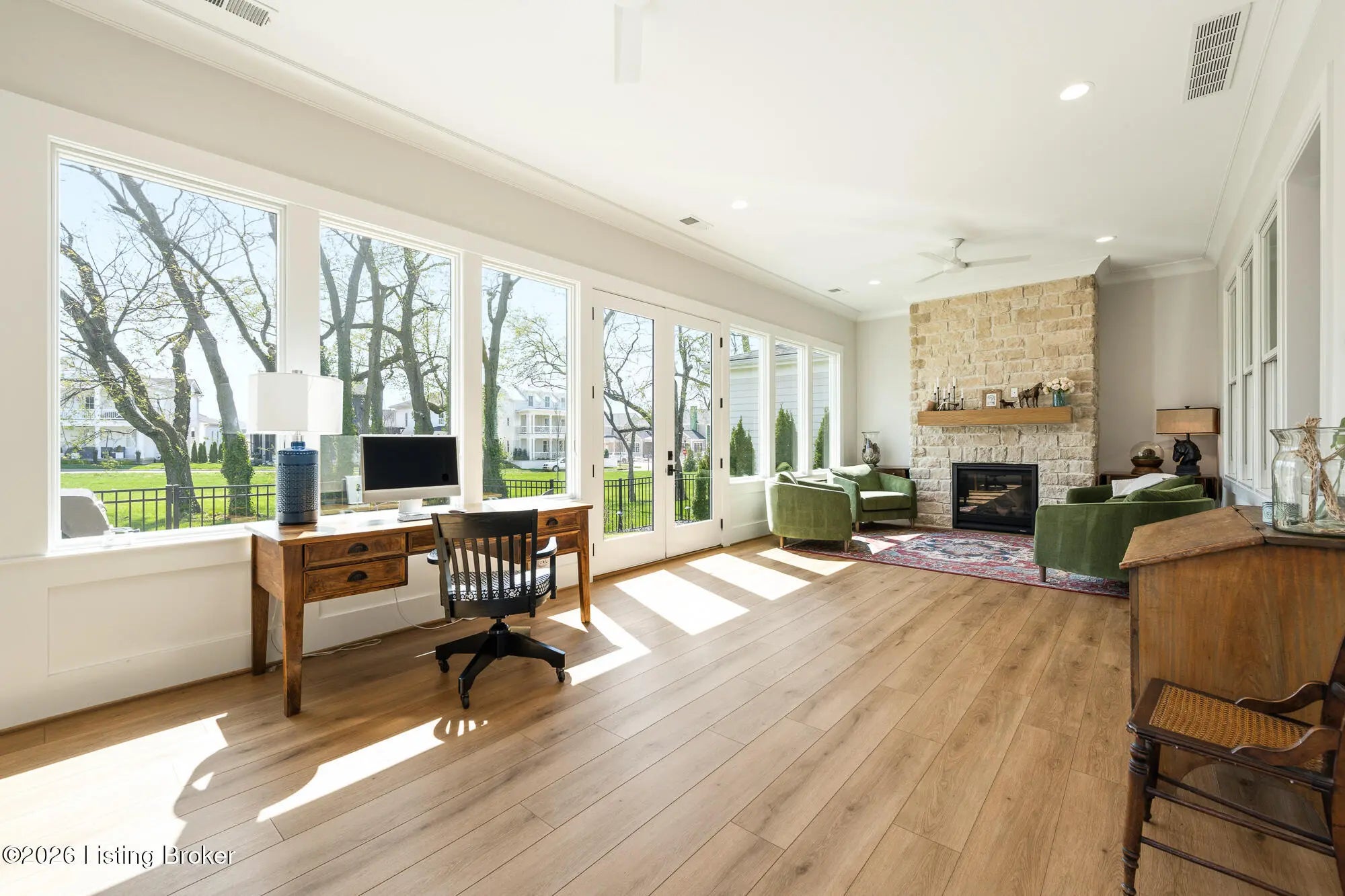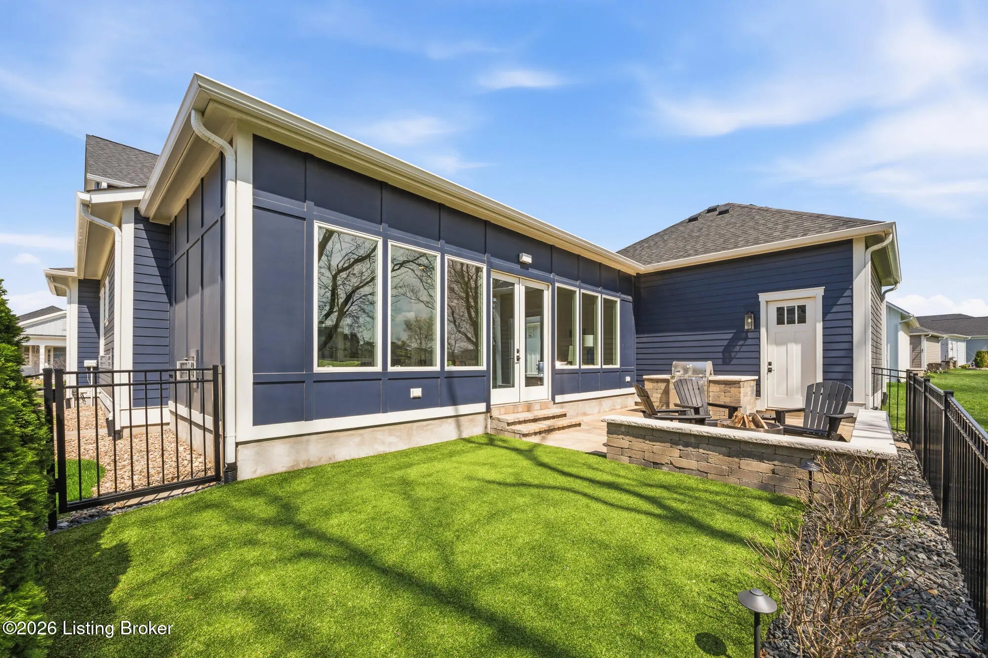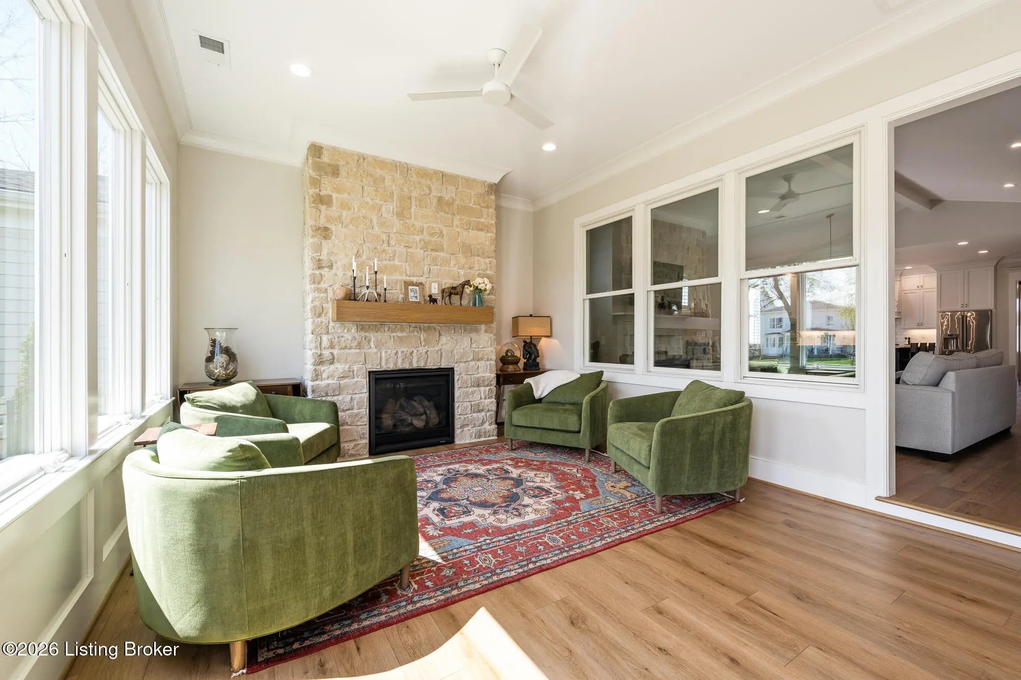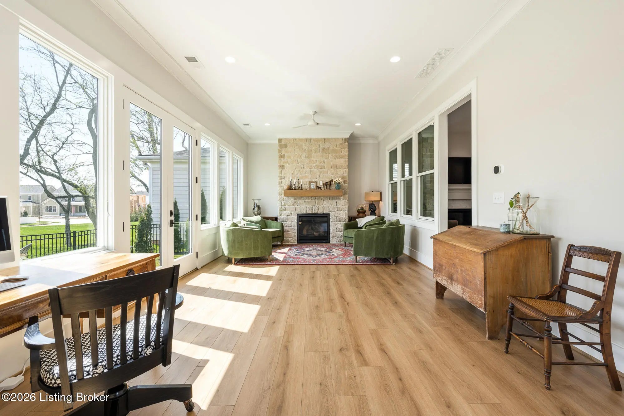 Nestled in highly sought-after Norton Commons, this exceptional newer home offers a thoughtful blend of luxury, comfort, and everyday livability. A perfectly manicured yard and inviting front porch set the tone, welcoming you into a light-filled interior anchored by beautiful wood floors and an open, flowing floor plan designed for both entertaining and relaxed living. The kitchen is as functional as it is stylish, featuring abundant storage, an oversized island, and a dining area that opens to the family room with fireplace. From there, step into the expansive sunroom, complete with its own fireplace, creating a warm, year-round retreat that opens to the outdoor patio. The first floor also includes a dedicated office with closet space, a full bath, and a well-appointed laundry room. The first-floor primary suite is a private haven with a large walk-in closet and a spa-like bath featuring double vanities, a soaking tub, and a separate walk-in shower. Upstairs, an open sitting area can be used as study area or cozy reading nook providing additional flexibility, along with two large bedrooms and a full bath. The finished basement expands your living space with a generous family room, game room with a Full Swing sport golf simulator, a workout room, and a full bath. Outdoors the fenced patio, with built-in gas grill, is adjacent to a park offering a true backyard retreat. A two-car garage plus a one-car garage wired for an EV charger and extended driveway provide ample parking. Geothermal systems provide energy-efficient comfort year-round. Living in Norton Commons in the Oldham County school district offers a true sense of community, with walkable access to neighborhood parks, dining, shops, and year-round events. Schedule your showing today!