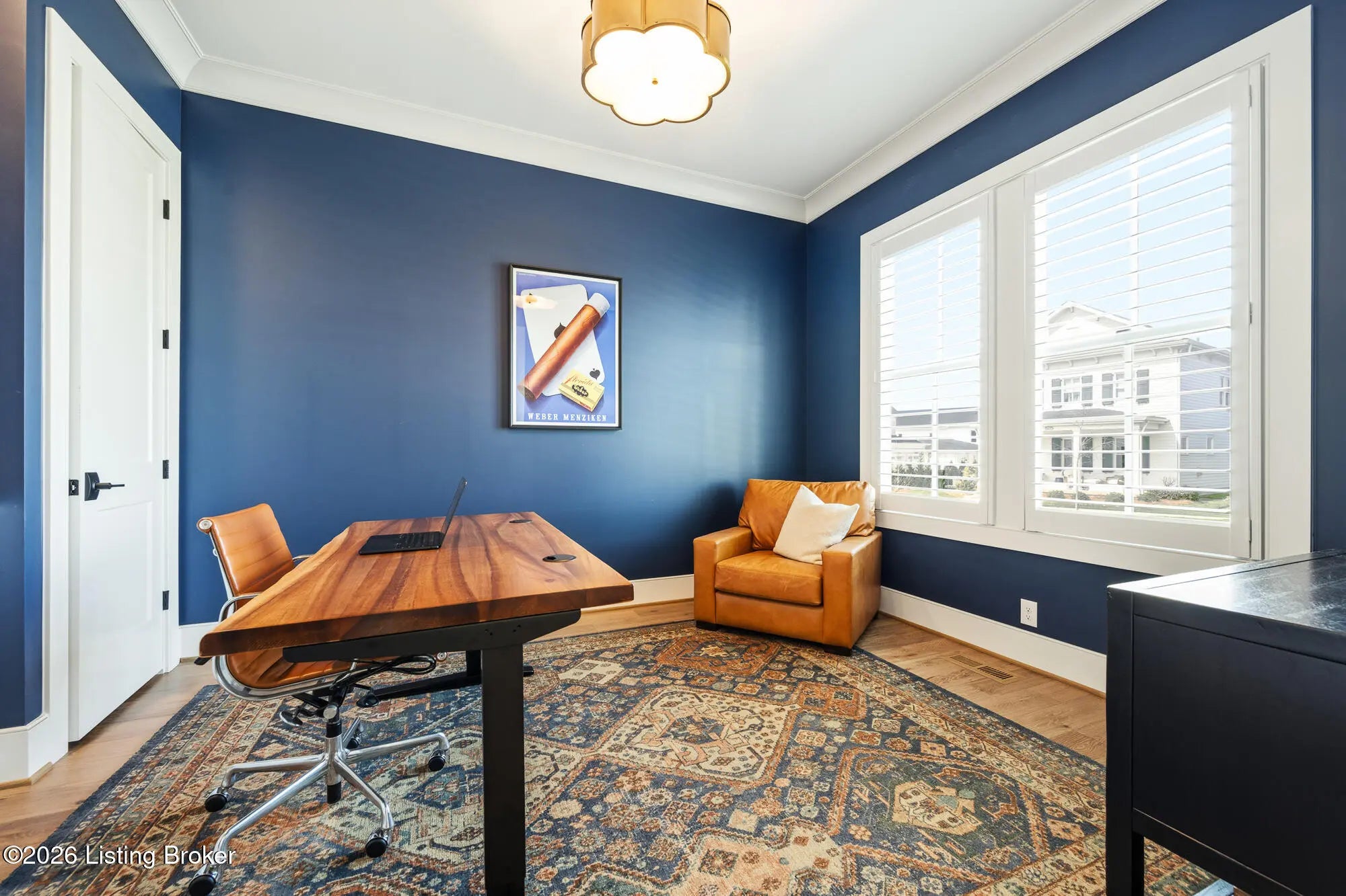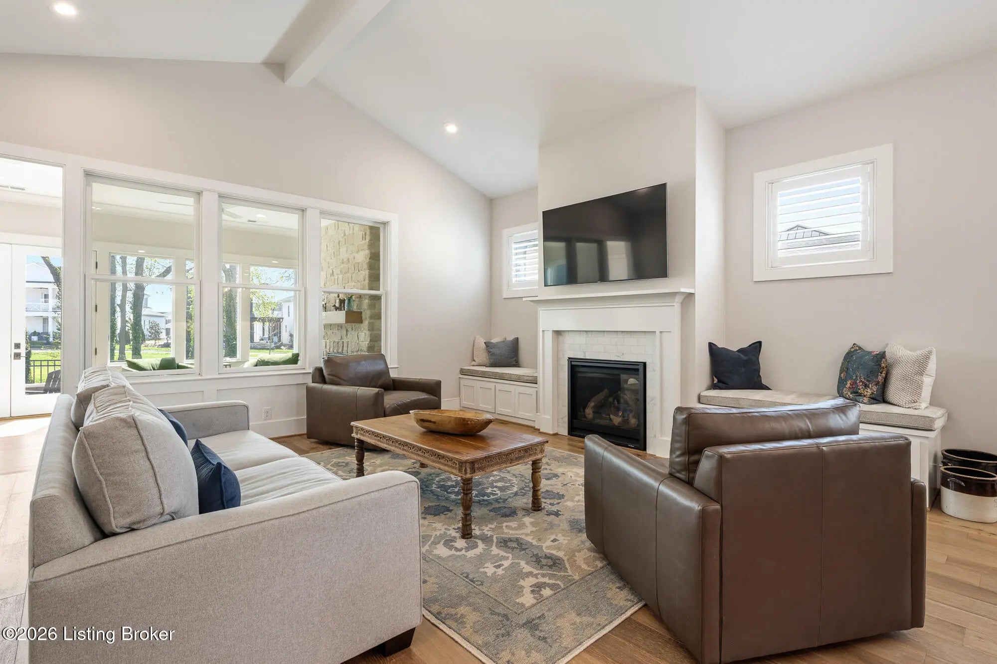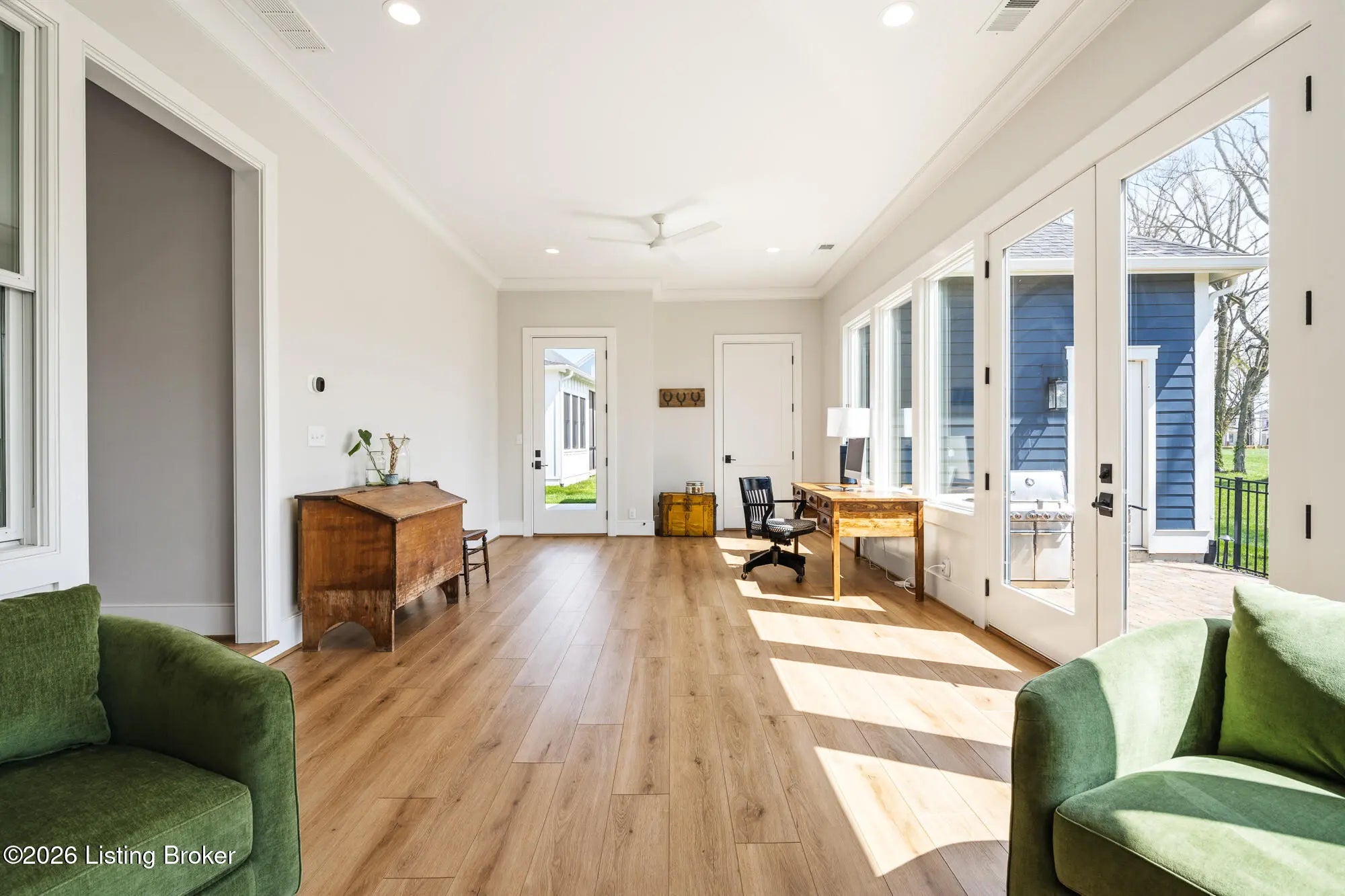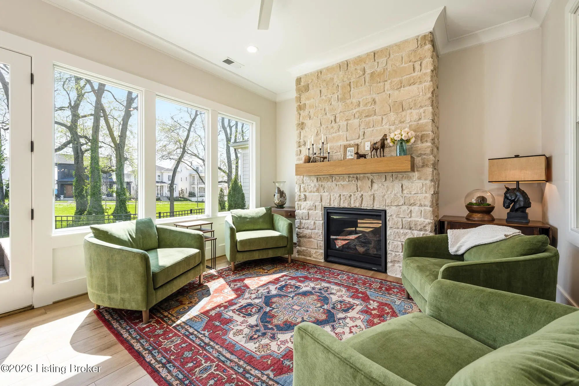 Nestled in highly sought-after Norton Commons, this exceptional newer home offers a thoughtful blend of luxury, comfort, and everyday livability. A perfectly manicured yard and inviting front porch set the tone, welcoming you into a light-filled interior anchored by beautiful wood floors and an open, flowing floor plan designed for both entertaining and relaxed living. The kitchen is as functional as it is stylish, featuring abundant storage, an oversized island, and a dining area that opens to the family room with fireplace. From there, step into the expansive sunroom, complete with its own fireplace, creating a warm, year-round retreat that opens to the outdoor patio. The first floor also includes a dedicated office with closet space, a full bath, and a well-appointed laundry room. The first-floor primary suite is a private haven with a large walk-in closet and a spa-like bath featuring double vanities, a soaking tub, and a separate walk-in shower. Upstairs, an open sitting area can be used as study area or cozy reading nook providing additional flexibility, along with two large bedrooms and a full bath. The finished basement expands your living space with a generous family room, game room with a Full Swing sport golf simulator, a workout room, and a full bath. Outdoors the fenced patio, with built-in gas grill, is adjacent to a park offering a true backyard retreat. A two-car garage plus a one-car garage wired for an EV charger and extended driveway provide ample parking. Geothermal systems provide energy-efficient comfort year-round. Living in Norton Commons in the Oldham County school district offers a true sense of community, with walkable access to neighborhood parks, dining, shops, and year-round events. Schedule your showing today!