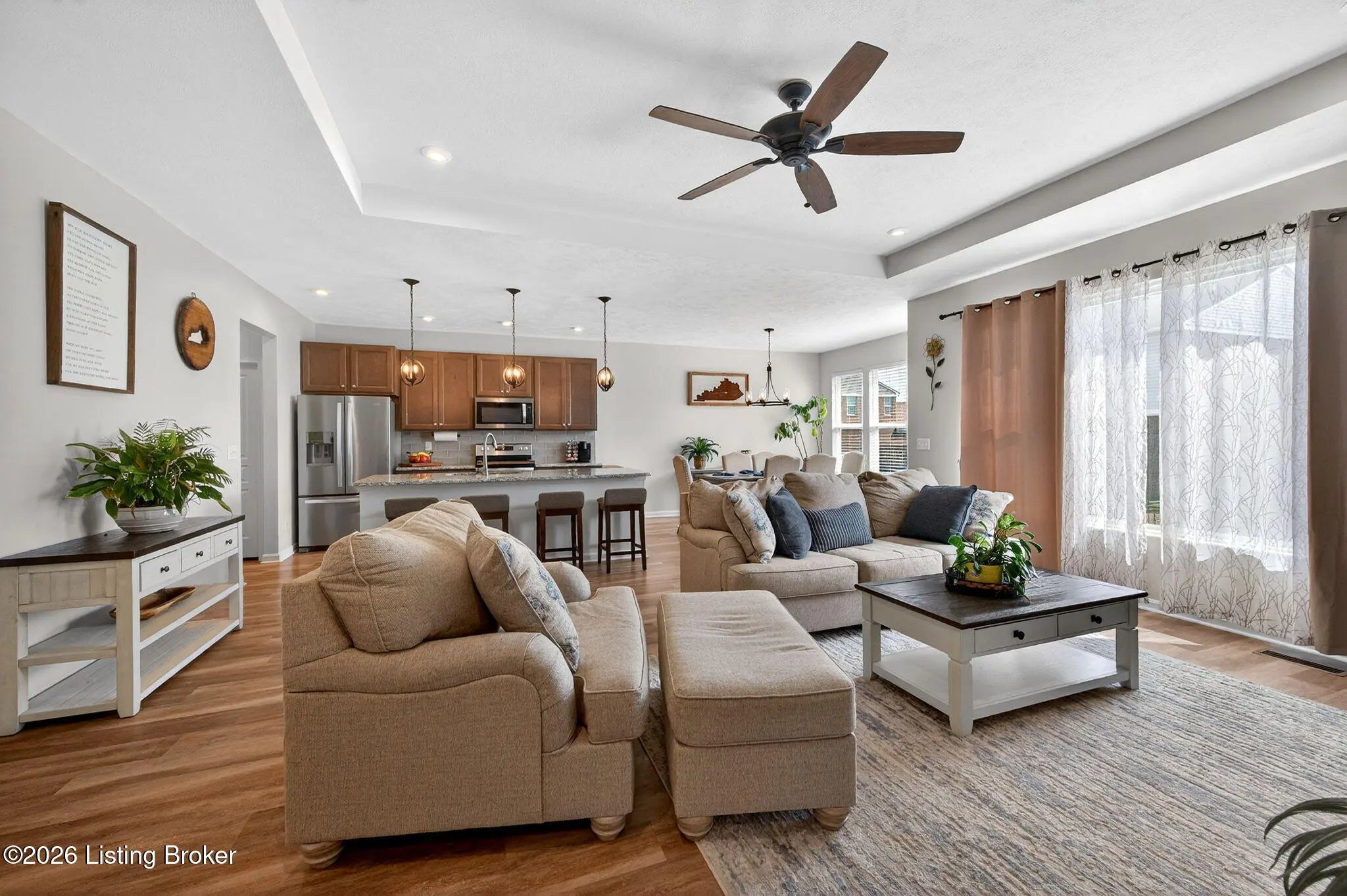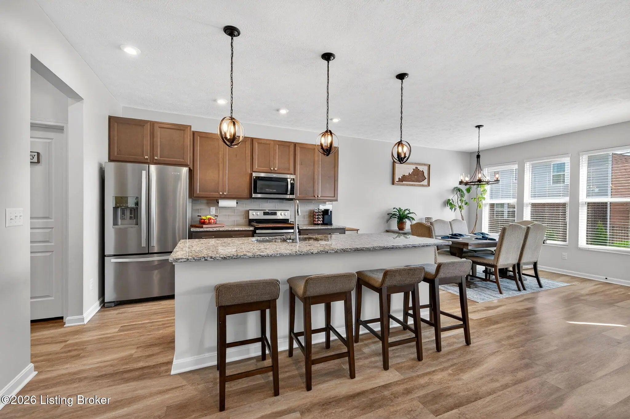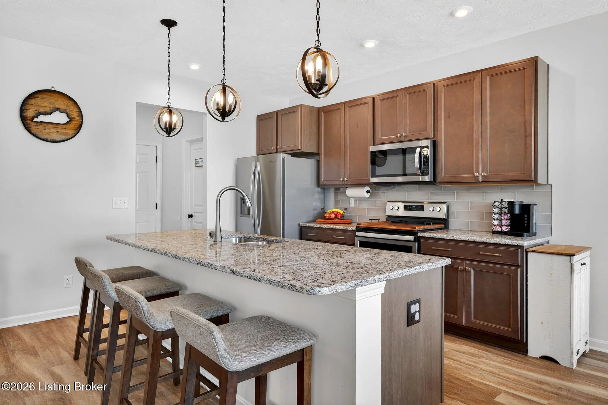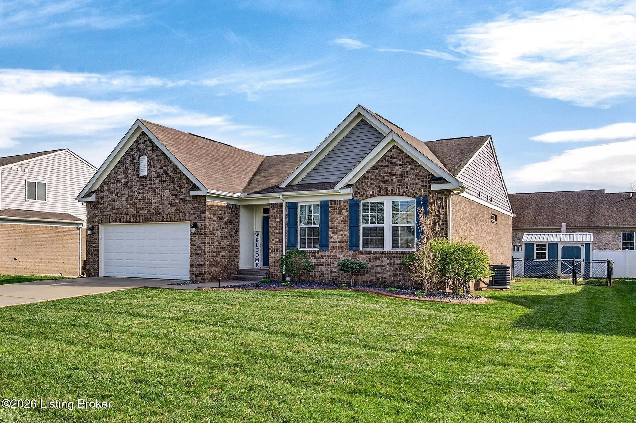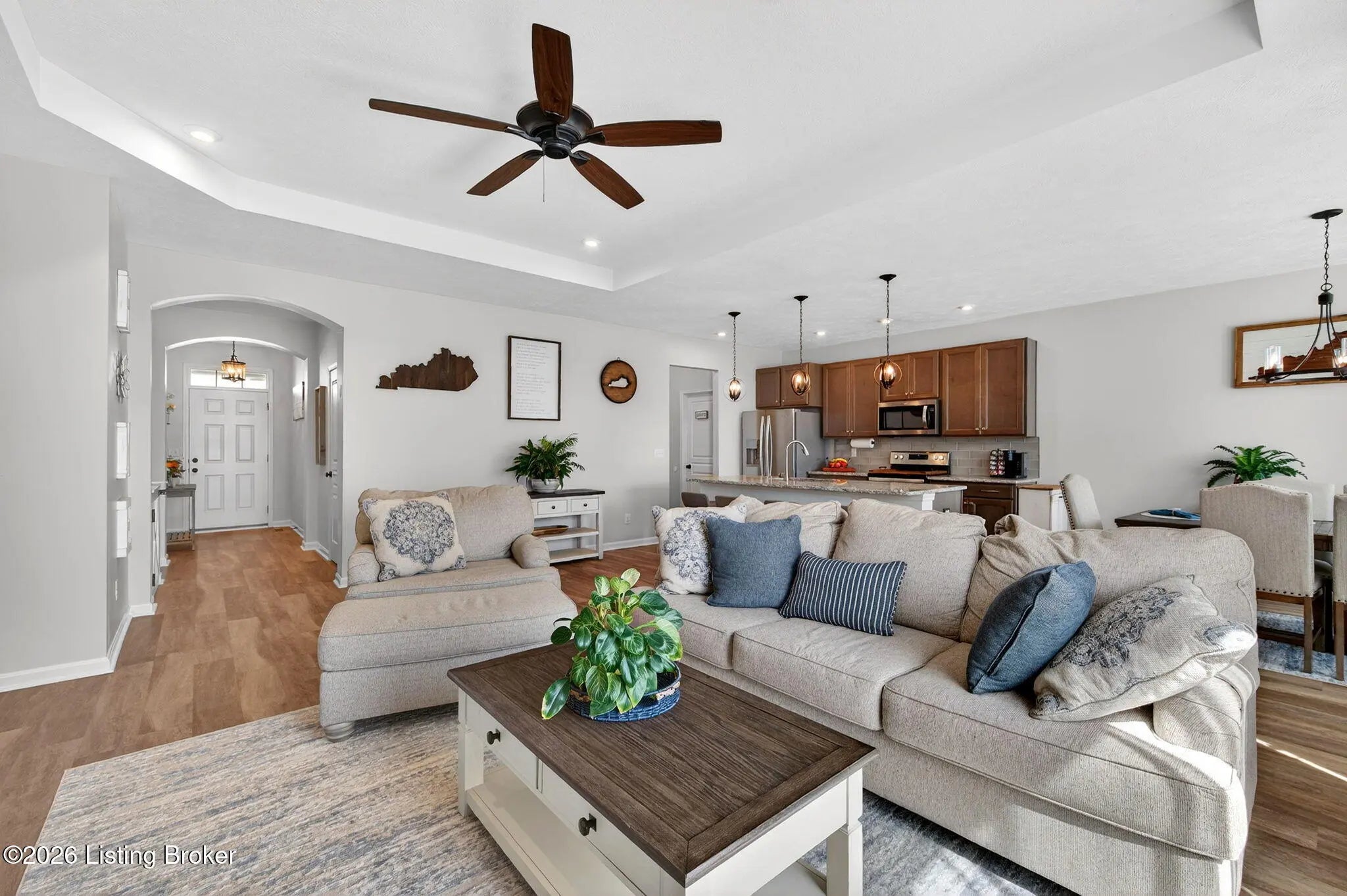 Move right in to this well-maintained, turn-key ranch in Oakwood, offering a functional layout and thoughtful finishes throughout. From the covered front porch, LVP flooring welcomes you into the foyer and flows through the main living areas. Arched openings lead into the open-concept living space, ideal for both everyday living and entertaining. The spacious living room features a tray ceiling and direct access to the patio, and opens seamlessly to the kitchen and dining area. The kitchen is well-appointed with granite countertops, tile backsplash, stainless appliances, and shaker-style cabinetry, complemented by a warm wood perimeter and contrasting white center island with breakfast bar seating. Just off the garage entry, you'll find a convenient walk-in pantry and laundry room. The primary suite is privately positioned apart from the secondary bedrooms and includes a walk-in closet and en suite bath with double vanity, walk-in shower, and water closet. Two additional bedrooms and a full bath complete the main level. The finished lower level expands your living space with a large family room, wet bar, game area, full bath, and a flexible bonus room. Enjoy the outdoors from the patio overlooking the fully fenced backyard with a storage shed. Two-car garage. Conveniently located with easy access to local shopping, dining, and I-65, this home offers a comfortable lifestyle just minutes from the heart of Shepherdsville and a straightforward commute to Louisville.