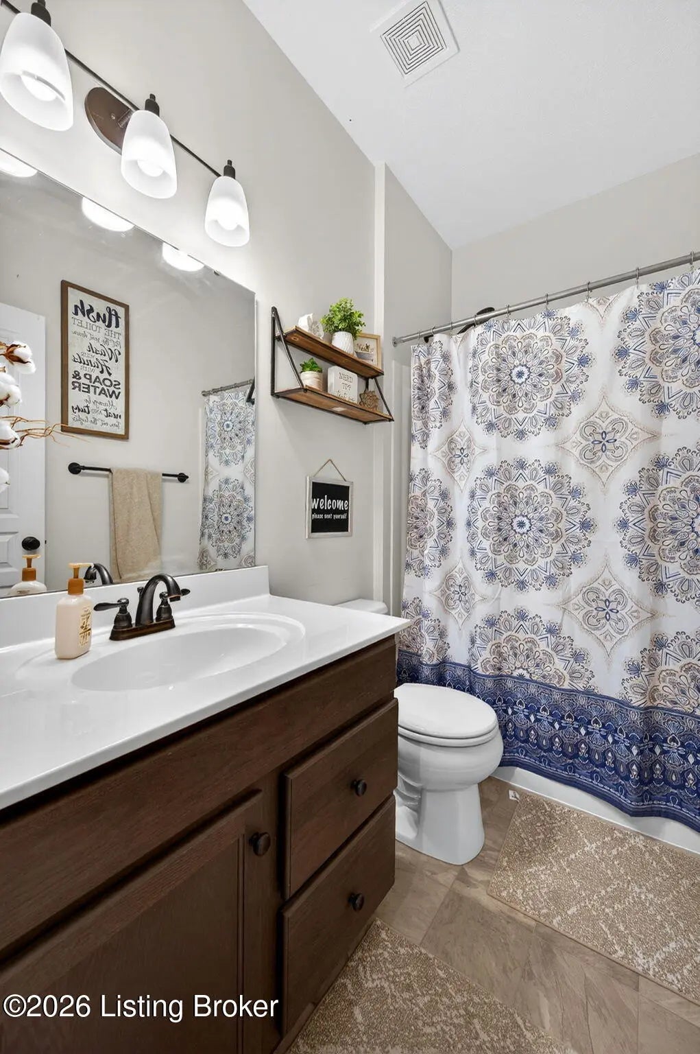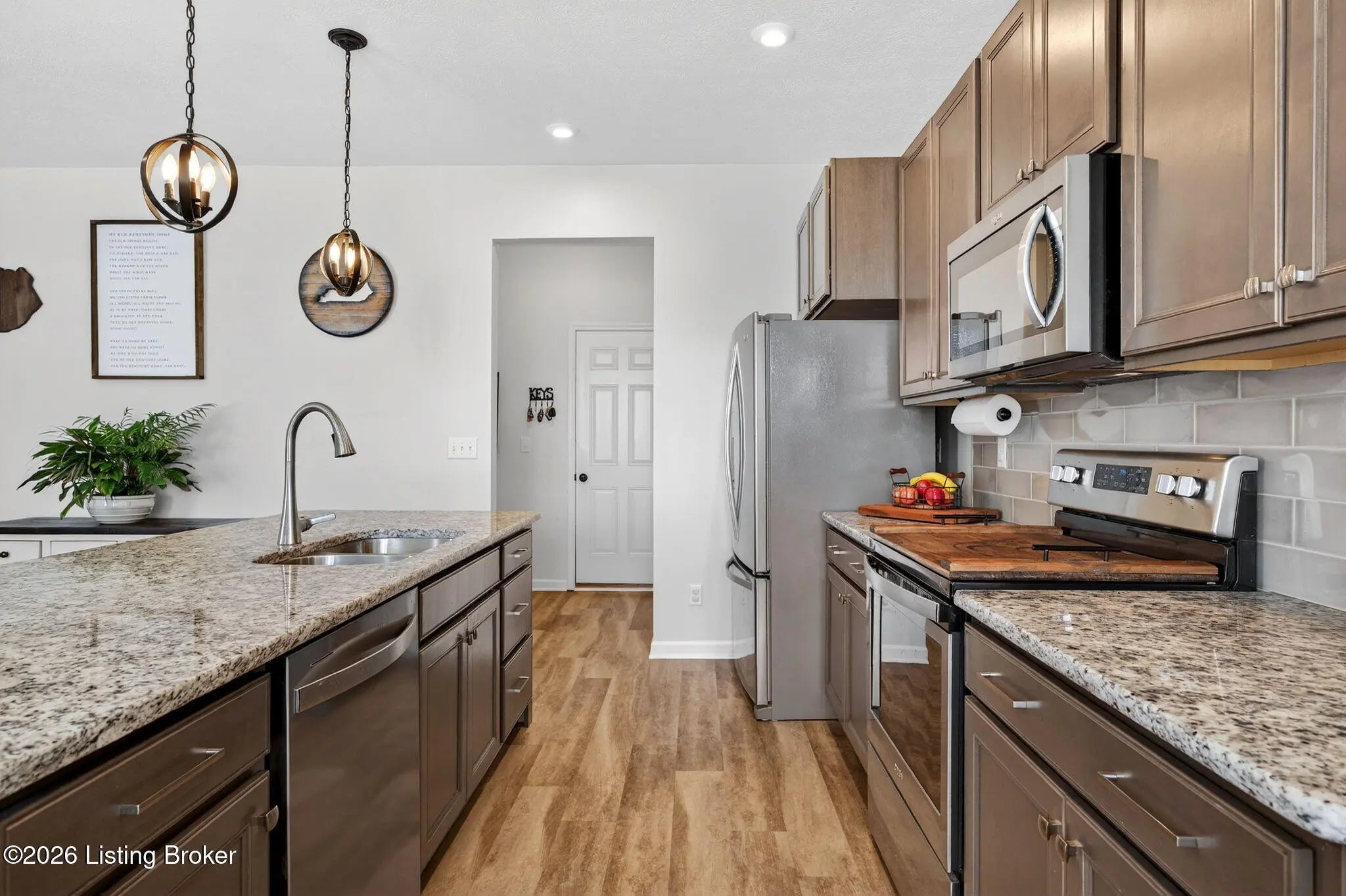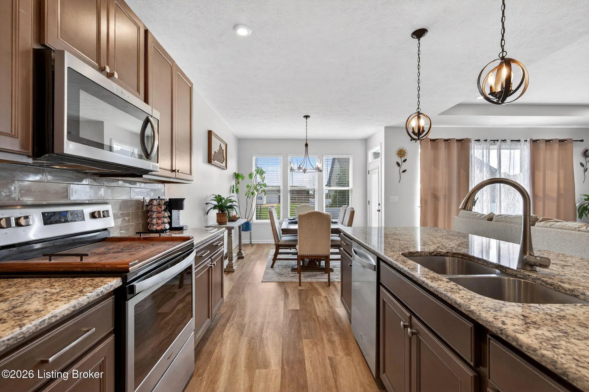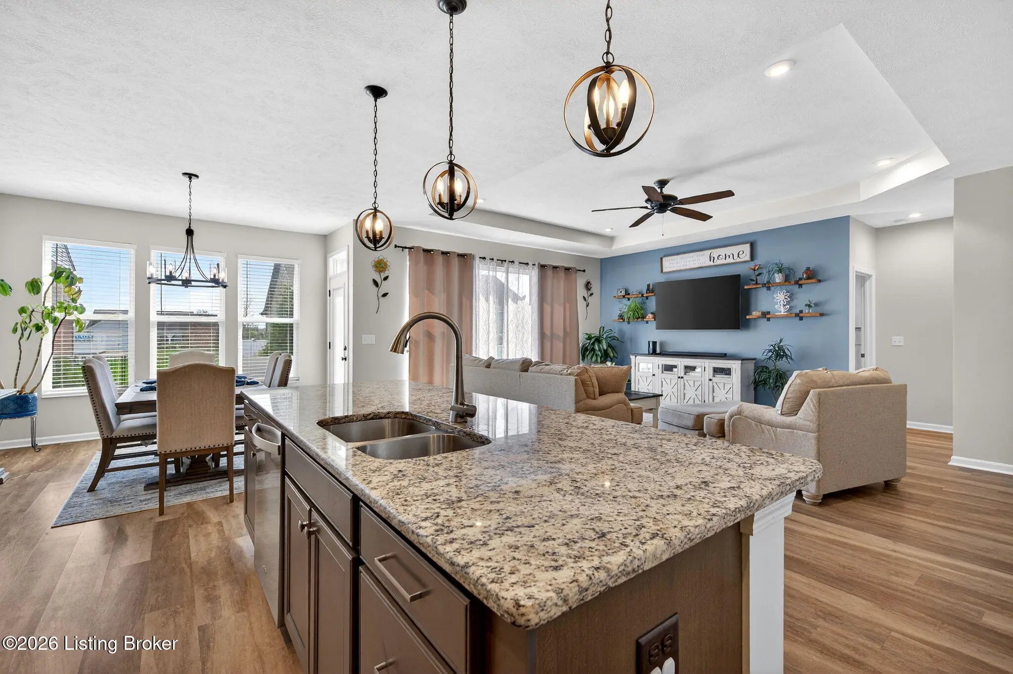 Move right in to this well-maintained, turn-key ranch in Oakwood, offering a functional layout and thoughtful finishes throughout. From the covered front porch, LVP flooring welcomes you into the foyer and flows through the main living areas. Arched openings lead into the open-concept living space, ideal for both everyday living and entertaining. The spacious living room features a tray ceiling and direct access to the patio, and opens seamlessly to the kitchen and dining area. The kitchen is well-appointed with granite countertops, tile backsplash, stainless appliances, and shaker-style cabinetry, complemented by a warm wood perimeter and contrasting white center island with breakfast bar seating. Just off the garage entry, you'll find a convenient walk-in pantry and laundry room. The primary suite is privately positioned apart from the secondary bedrooms and includes a walk-in closet and en suite bath with double vanity, walk-in shower, and water closet. Two additional bedrooms and a full bath complete the main level. The finished lower level expands your living space with a large family room, wet bar, game area, full bath, and a flexible bonus room. Enjoy the outdoors from the patio overlooking the fully fenced backyard with a storage shed. Two-car garage. Conveniently located with easy access to local shopping, dining, and I-65, this home offers a comfortable lifestyle just minutes from the heart of Shepherdsville and a straightforward commute to Louisville.