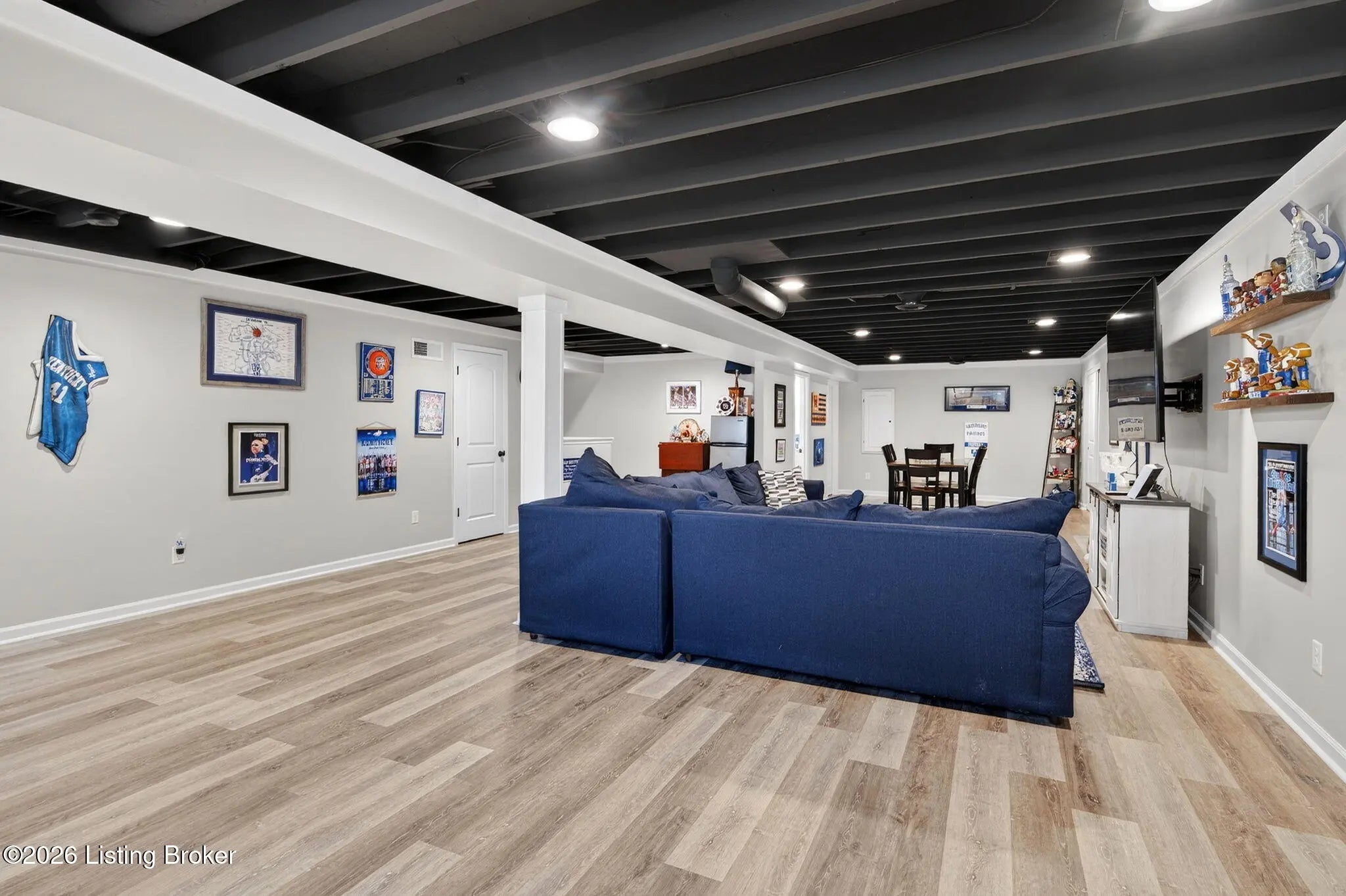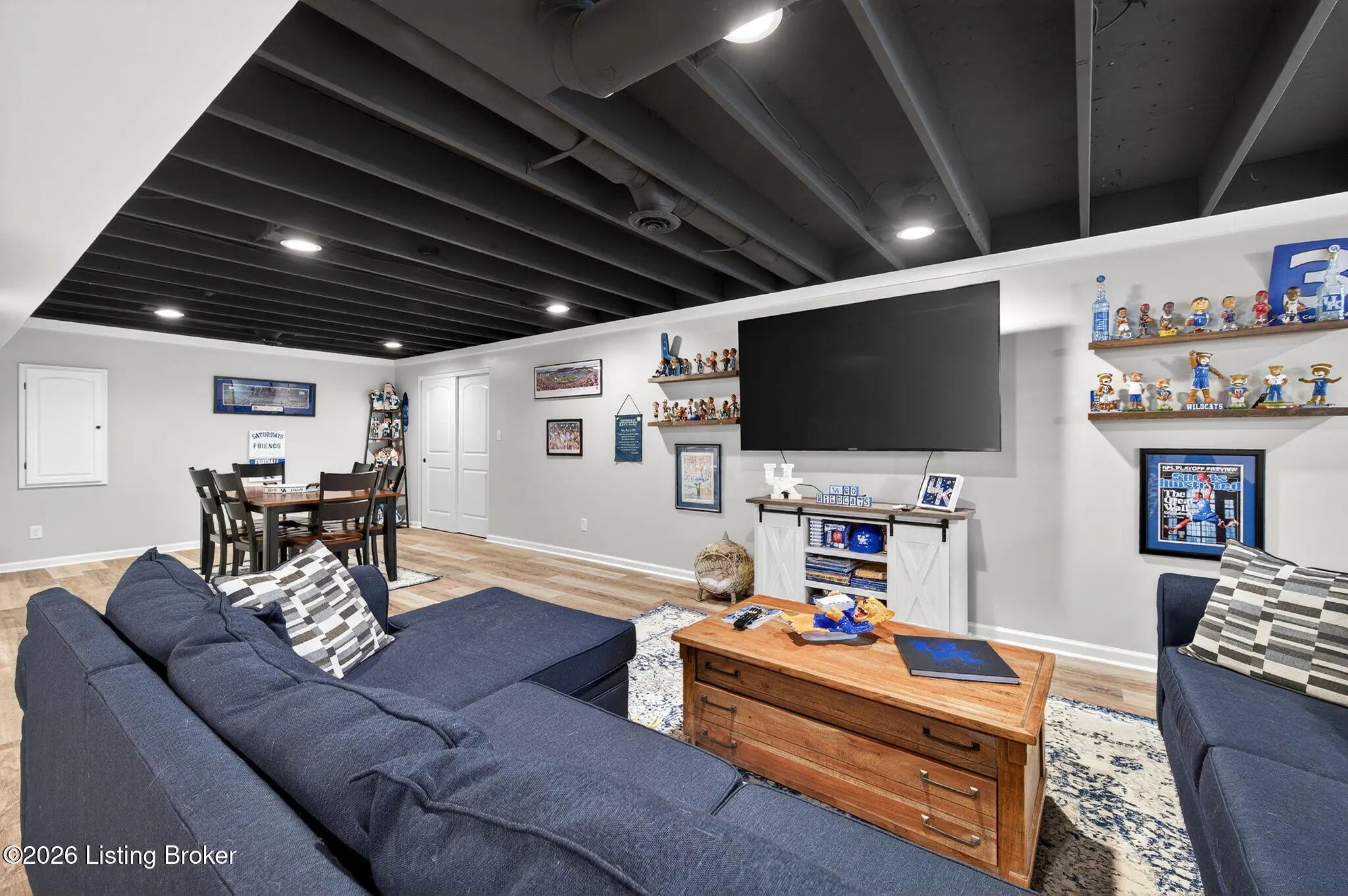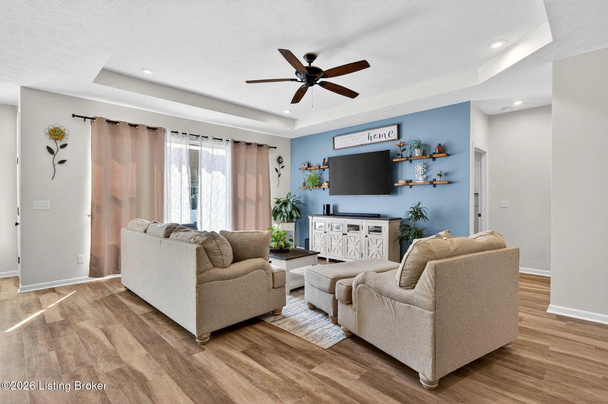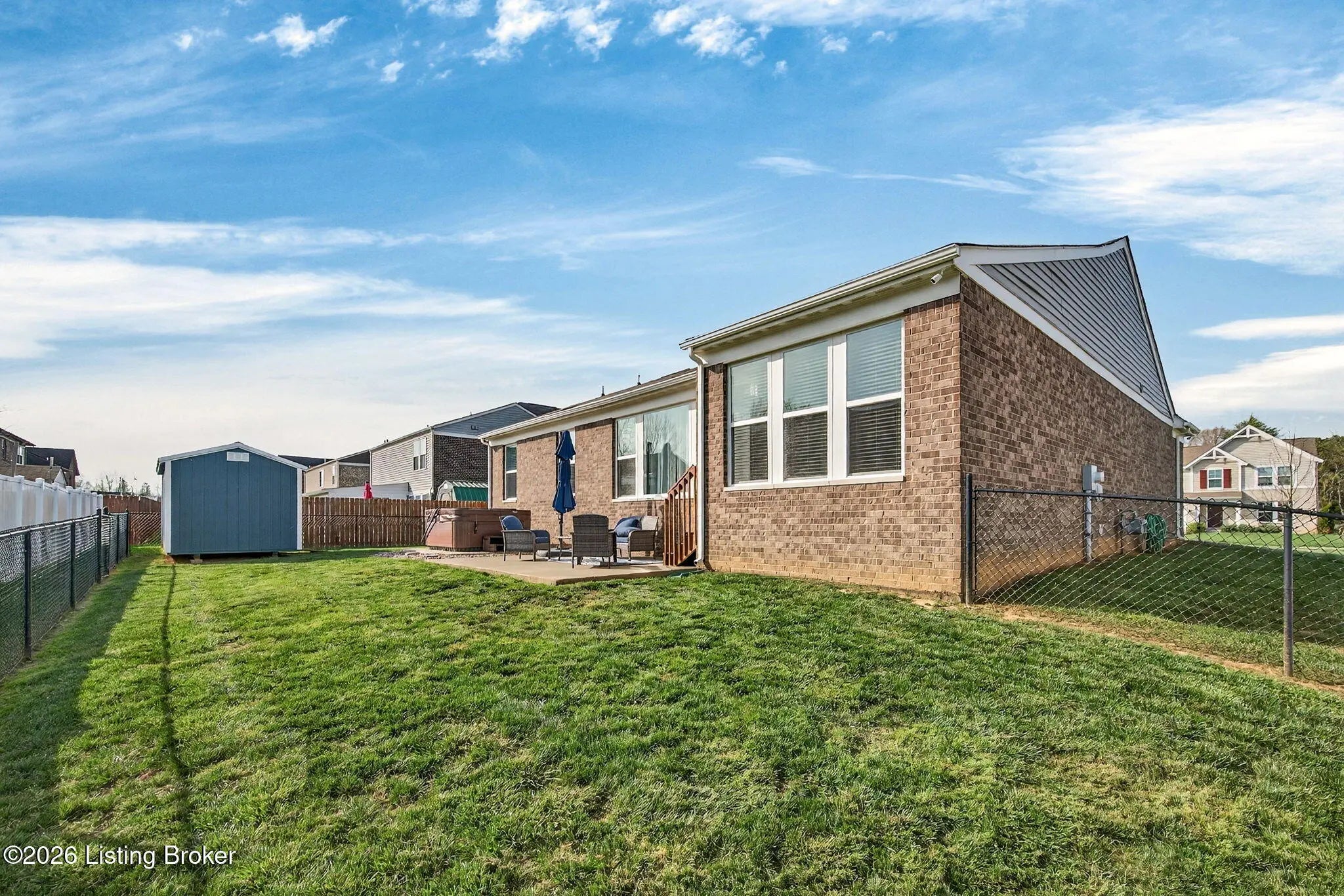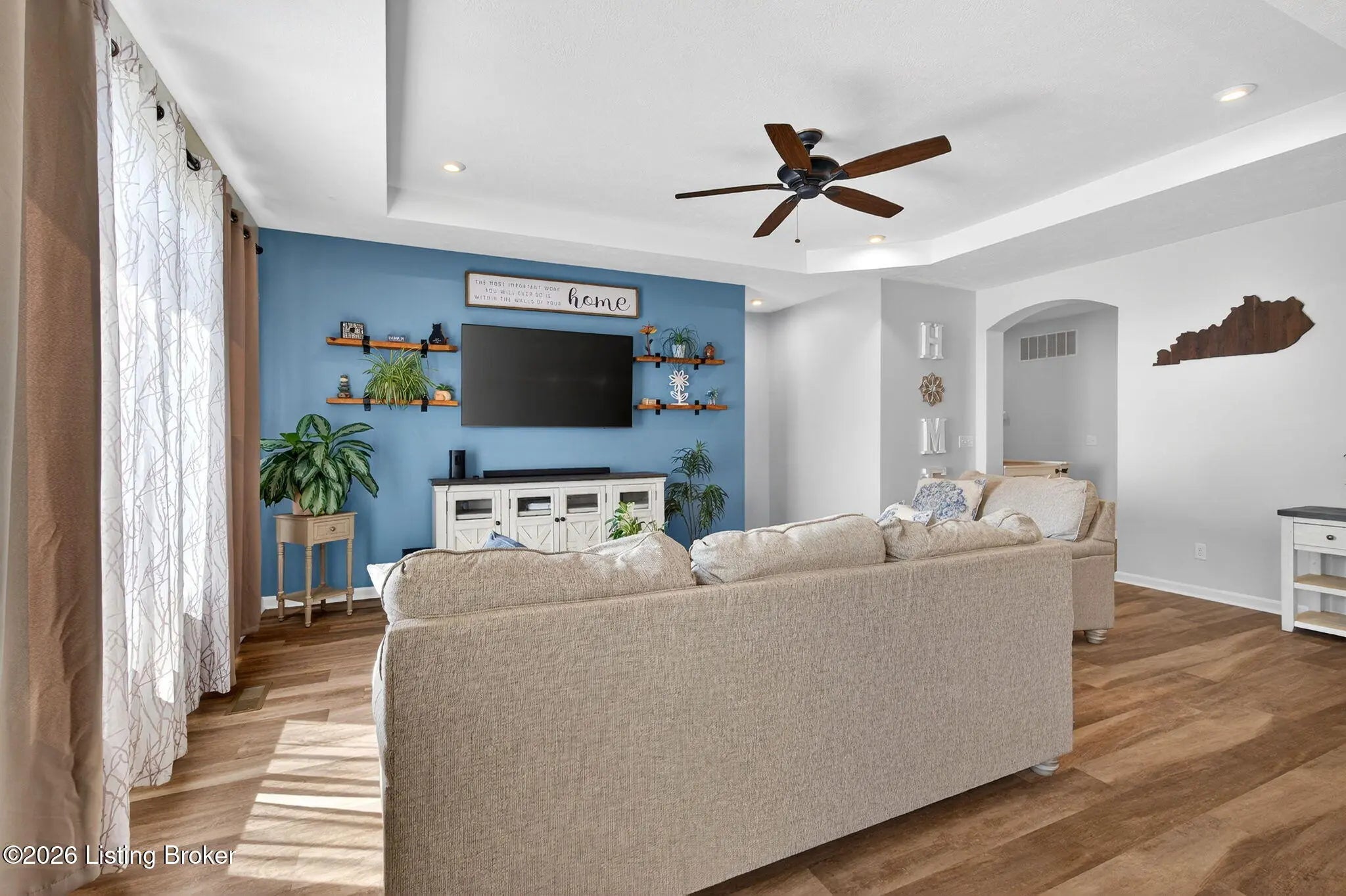 Move right in to this well-maintained, turn-key ranch in Oakwood, offering a functional layout and thoughtful finishes throughout. From the covered front porch, LVP flooring welcomes you into the foyer and flows through the main living areas. Arched openings lead into the open-concept living space, ideal for both everyday living and entertaining. The spacious living room features a tray ceiling and direct access to the patio, and opens seamlessly to the kitchen and dining area. The kitchen is well-appointed with granite countertops, tile backsplash, stainless appliances, and shaker-style cabinetry, complemented by a warm wood perimeter and contrasting white center island with breakfast bar seating. Just off the garage entry, you'll find a convenient walk-in pantry and laundry room. The primary suite is privately positioned apart from the secondary bedrooms and includes a walk-in closet and en suite bath with double vanity, walk-in shower, and water closet. Two additional bedrooms and a full bath complete the main level. The finished lower level expands your living space with a large family room, wet bar, game area, full bath, and a flexible bonus room. Enjoy the outdoors from the patio overlooking the fully fenced backyard with a storage shed. Two-car garage. Conveniently located with easy access to local shopping, dining, and I-65, this home offers a comfortable lifestyle just minutes from the heart of Shepherdsville and a straightforward commute to Louisville.