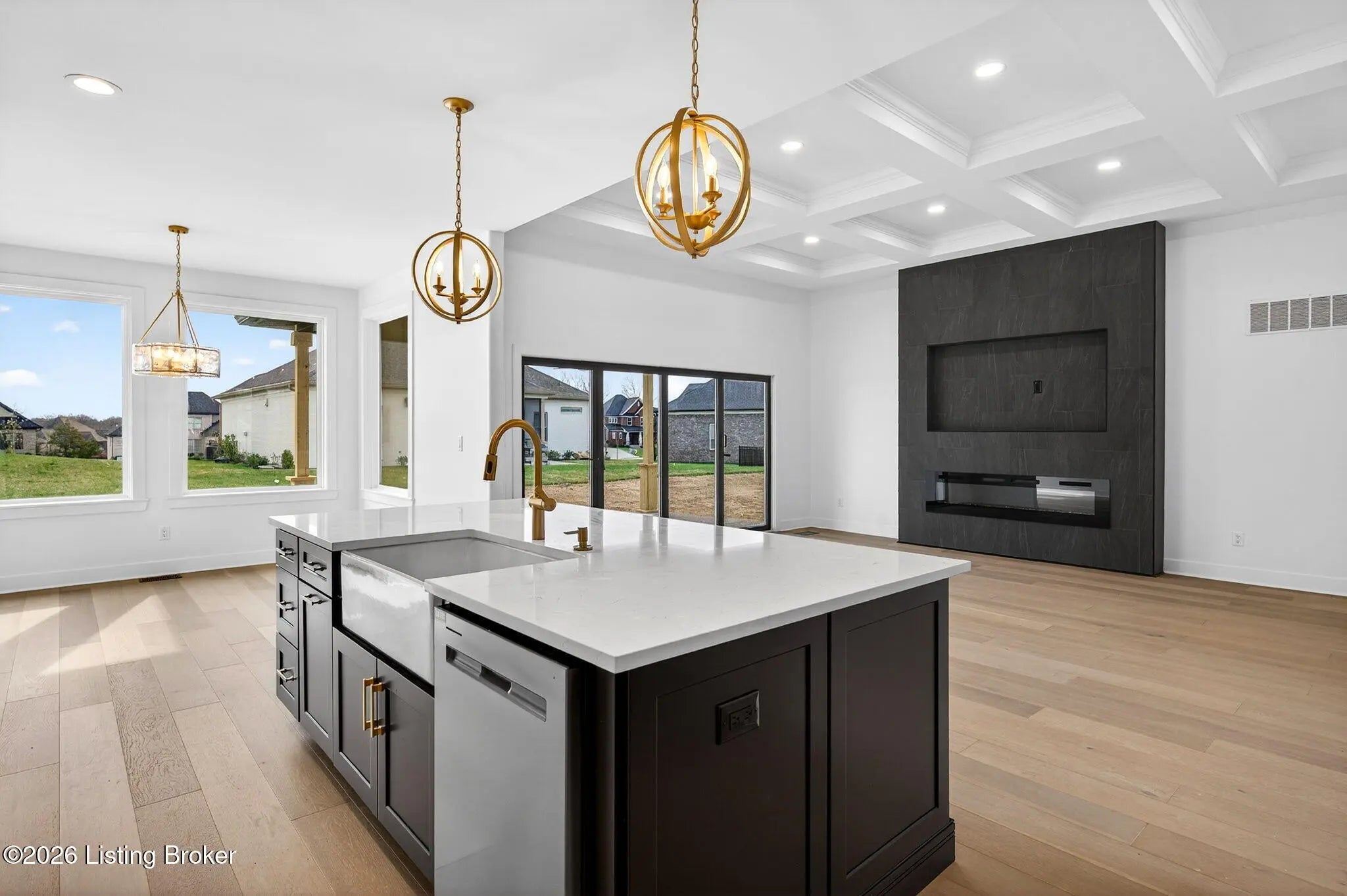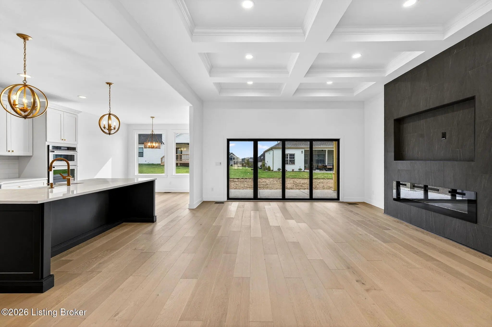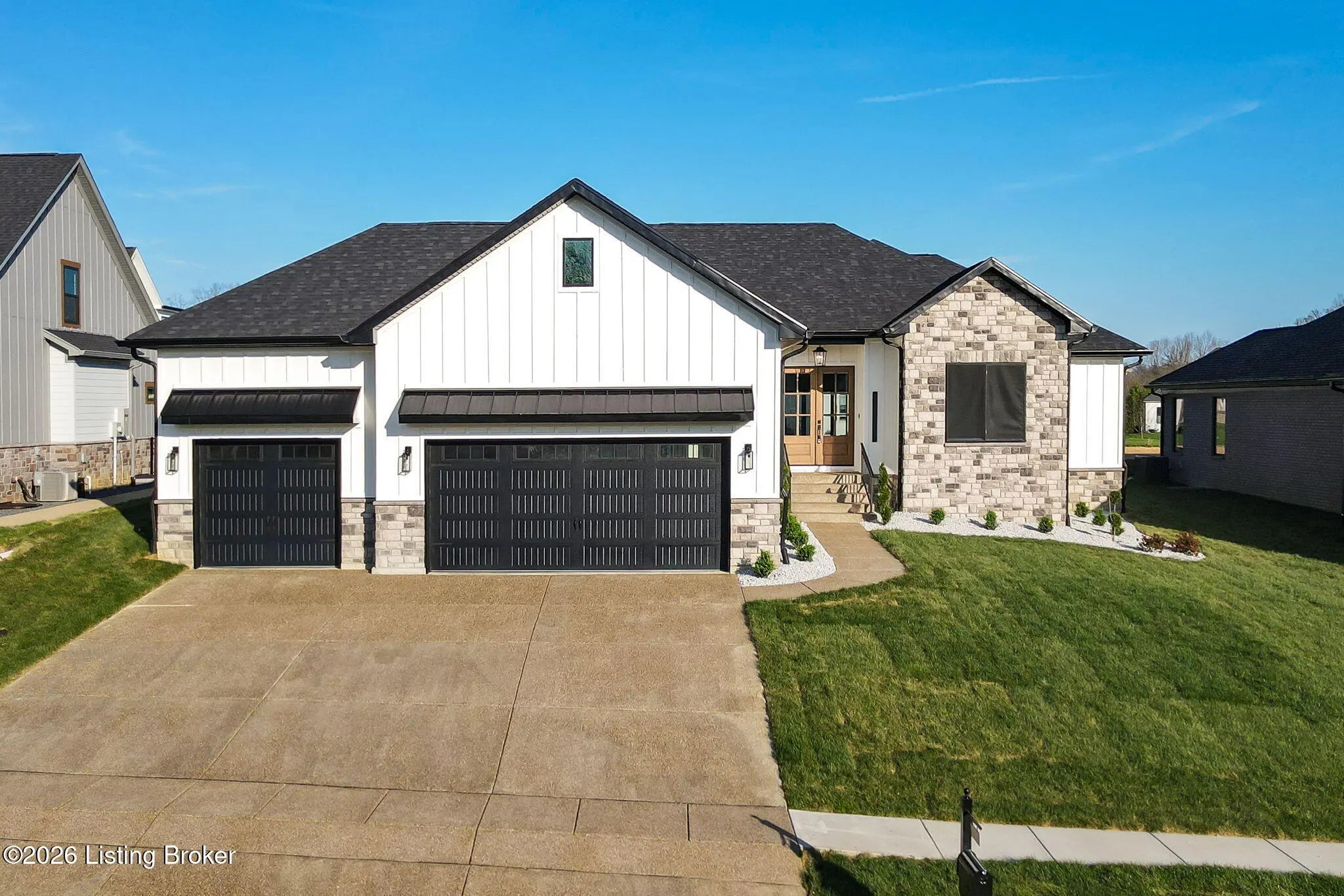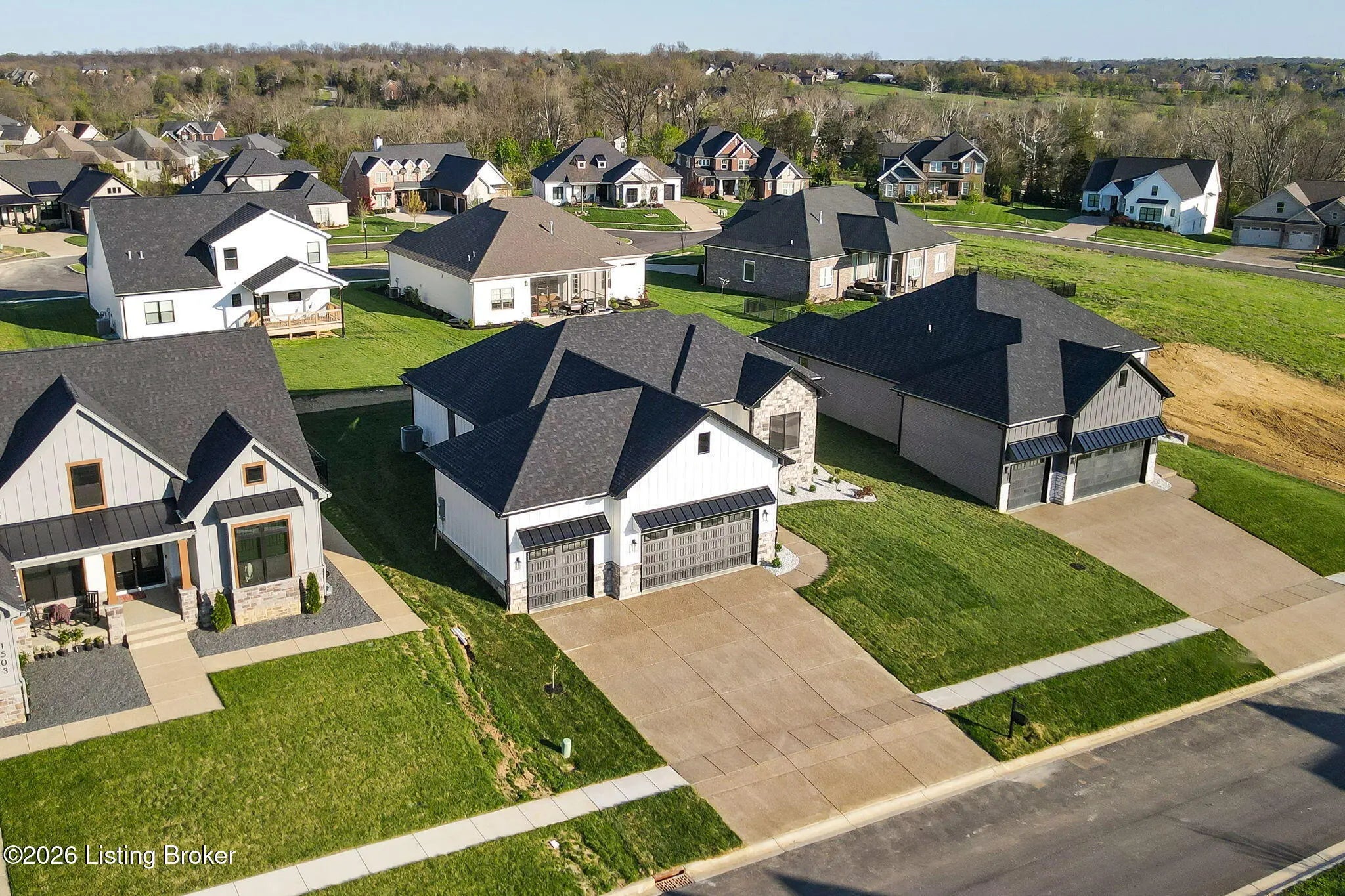 Welcome to 1505 Lincoln Hill Way — an impressive new construction ranch nestled in the highly sought-after Meremont community of east Louisville, where upscale living meets everyday convenience. Situated off Long Run Road in east Jefferson County, this quiet neighborhood is close to Middletown restaurants, shopping, and schools, with The Parklands and Long Run Park just minutes away. With close proximity to major highways, commuting to work or exploring the surrounding area is effortless, while the peaceful, well-maintained neighborhood with parks, walking trails, and playgrounds gives you the suburban retreat you deserve. From the covered front porch, a double-door entry welcomes you into a gracious foyer featuring engineered hardwood flooring and soaring 9-ft ceilings that carry throughout this thoughtfully designed open floor plan. The spacious living room impresses with coffered ceiling detail and a modern inset gas fireplace, while patio doors fully retract to blur the line between indoor and outdoor living. The chef-inspired eat-in kitchen is finished in timeless black and white with shaker cabinetry, a center island with breakfast bar, apron-front farmhouse sink, subway tile backsplash, bold black range hood, stainless appliances including a double wall oven and gas range, and a sun-drenched dining area perfect for everyday meals and entertaining alike. A powder room and laundry room are conveniently tucked just off the kitchen. Retreat to the primary suite, where a double tray ceiling sets an elegant tone. The stunning en suite features hex tile flooring, a marble-topped double vanity, floor-to-ceiling tile accent walls, a large walk-in shower with built-in bench seating and frameless glass enclosure, a private water closet, and a walk-in closet with custom built-ins. Also in this wing is a connected bedroom — ideal as a nursery — along with three additional bedrooms and a full bath that complete the main level. The unfinished lower level offers an additional 2,241 sq ft of potential, with 9-ft ceilings and rough-ins for a fifth bedroom with egress window and a full bath — contact agent for finishing costs. Outdoors, enjoy a fully covered patio, irrigation system, and an oversized 3-car garage with bays accommodating full-size trucks. Added peace of mind comes with a one-year builder's warranty included with the purchase of this exceptional home.