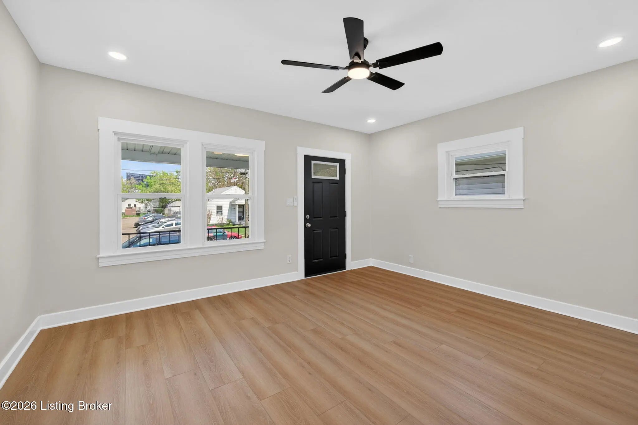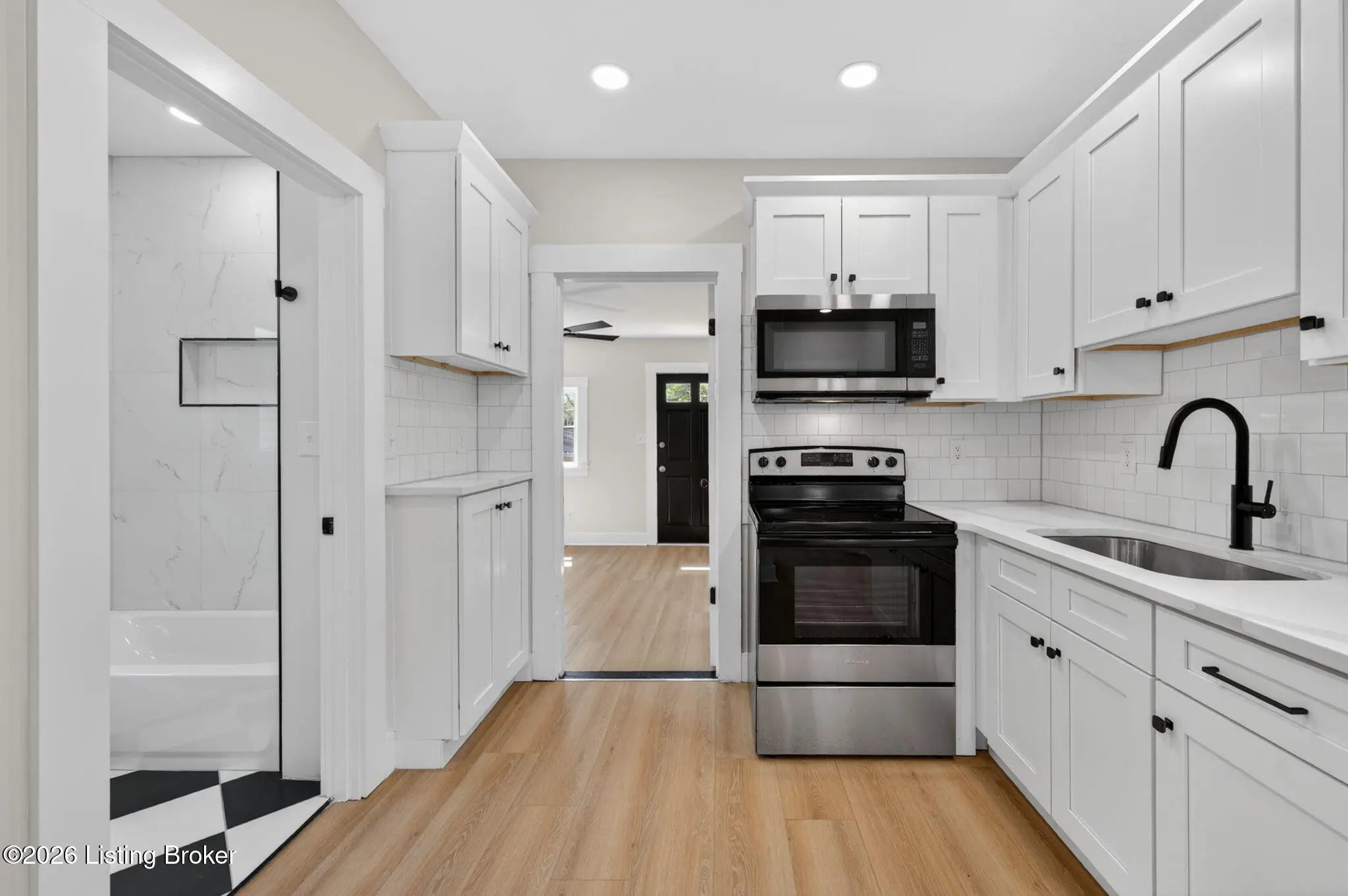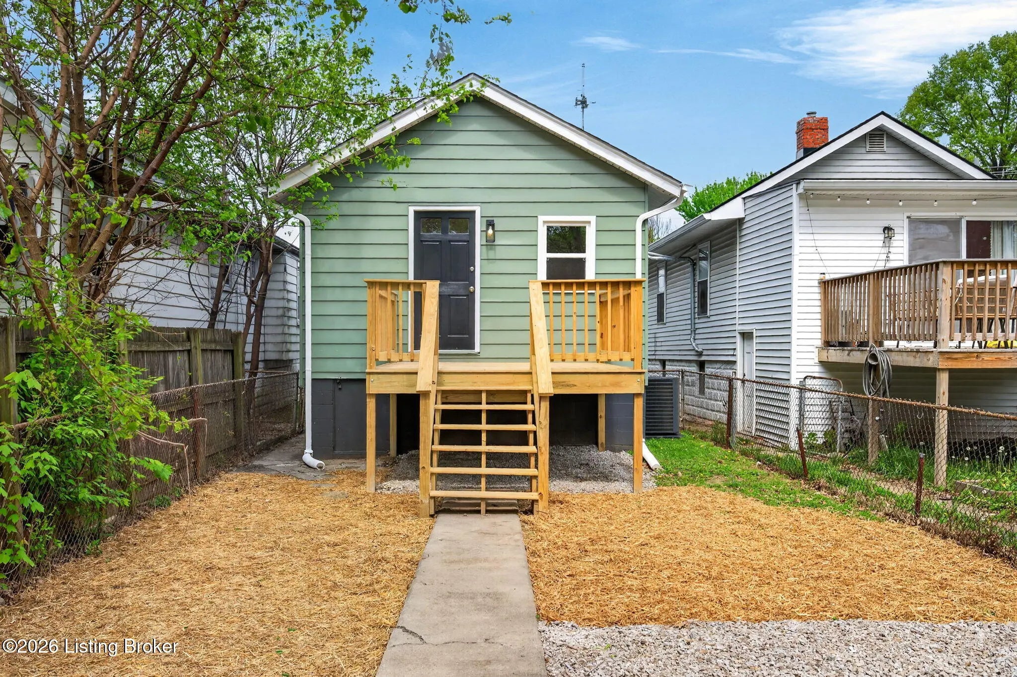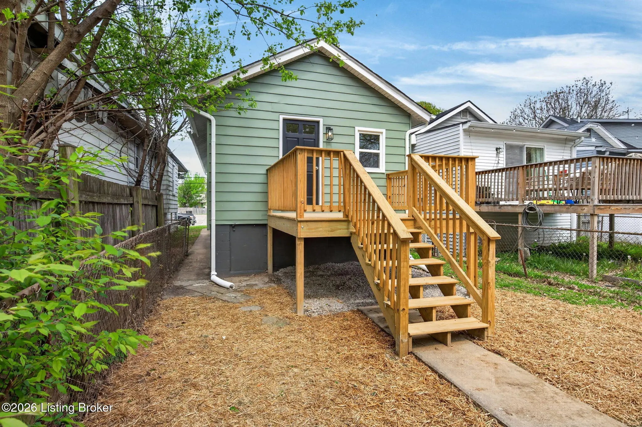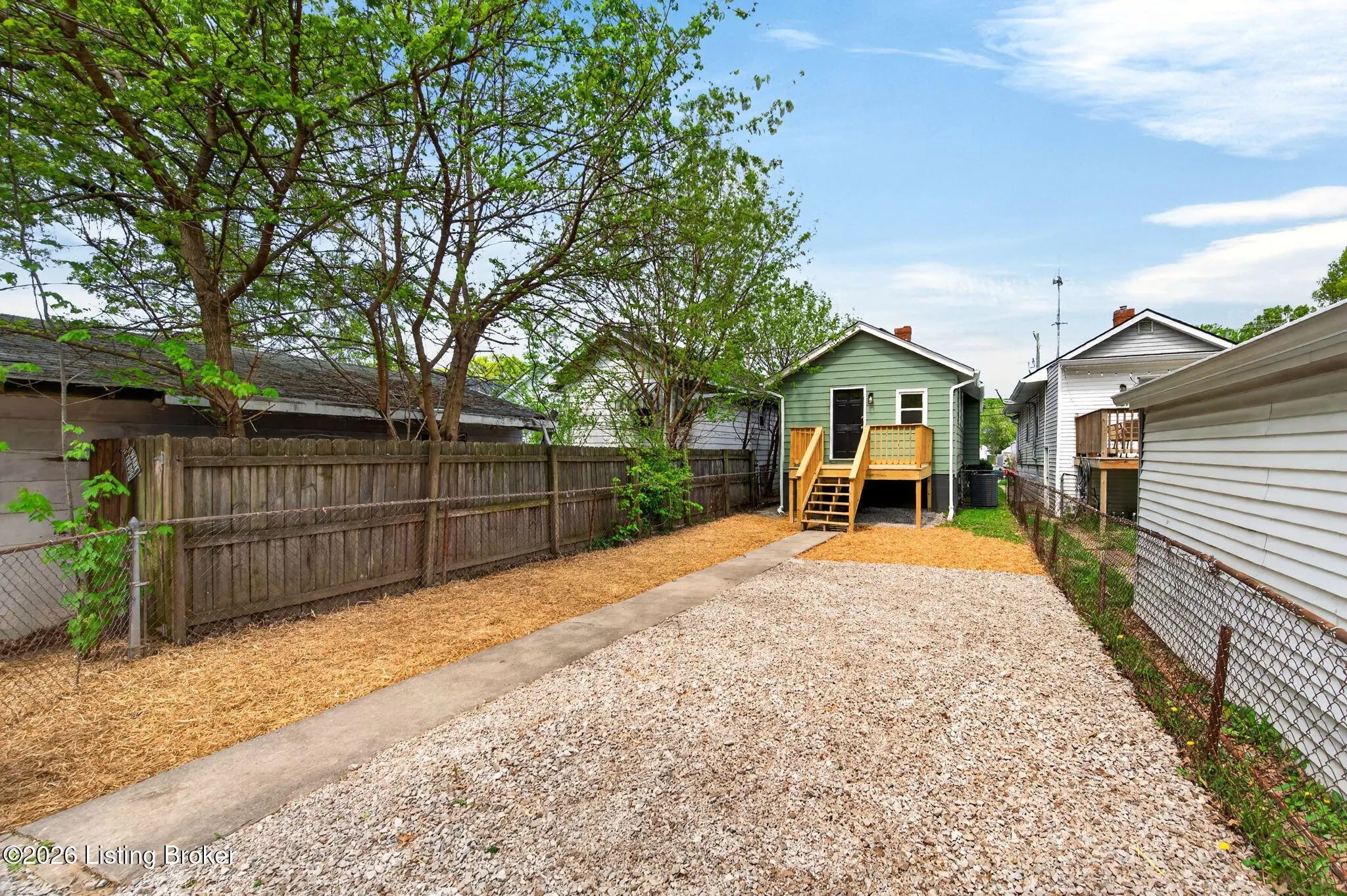 Welcome to this completely renovated shotgun-style gem in Louisville's historic Oakdale neighborhood — truly move-in ready from day one. Step onto the charming covered front porch and into the living room where durable LVP flooring flows seamlessly throughout the home. The updated kitchen impresses with classic white shaker cabinetry, a tile backsplash, quartz countertops, and stainless appliances. The home offers two comfortable bedrooms, including one with its own private entry — ideal for guests, a home office, or rental flexibility — and a second bedroom featuring a generous walk-in closet. The full bath is finished in a timeless checkerboard tile flooring and a marble-tiled shower stall. The unfinished basement provides laundry access along with abundant storage space or the potential for future finished living area. Outside, enjoy the newly added deck overlooking a partially fenced yard, complete with a gravel parking pad. Oakdale sits adjacent to Churchill Downs and the Taylor Boulevard commercial corridor, with easy connectivity to the University of Louisville, downtown Louisville, and major employment centers. Residents also enjoy walkable access to Wyandotte Park and the broader Olmsted Park System. Whether you're a first-time buyer, investor, or downsizer, this one checks every box.