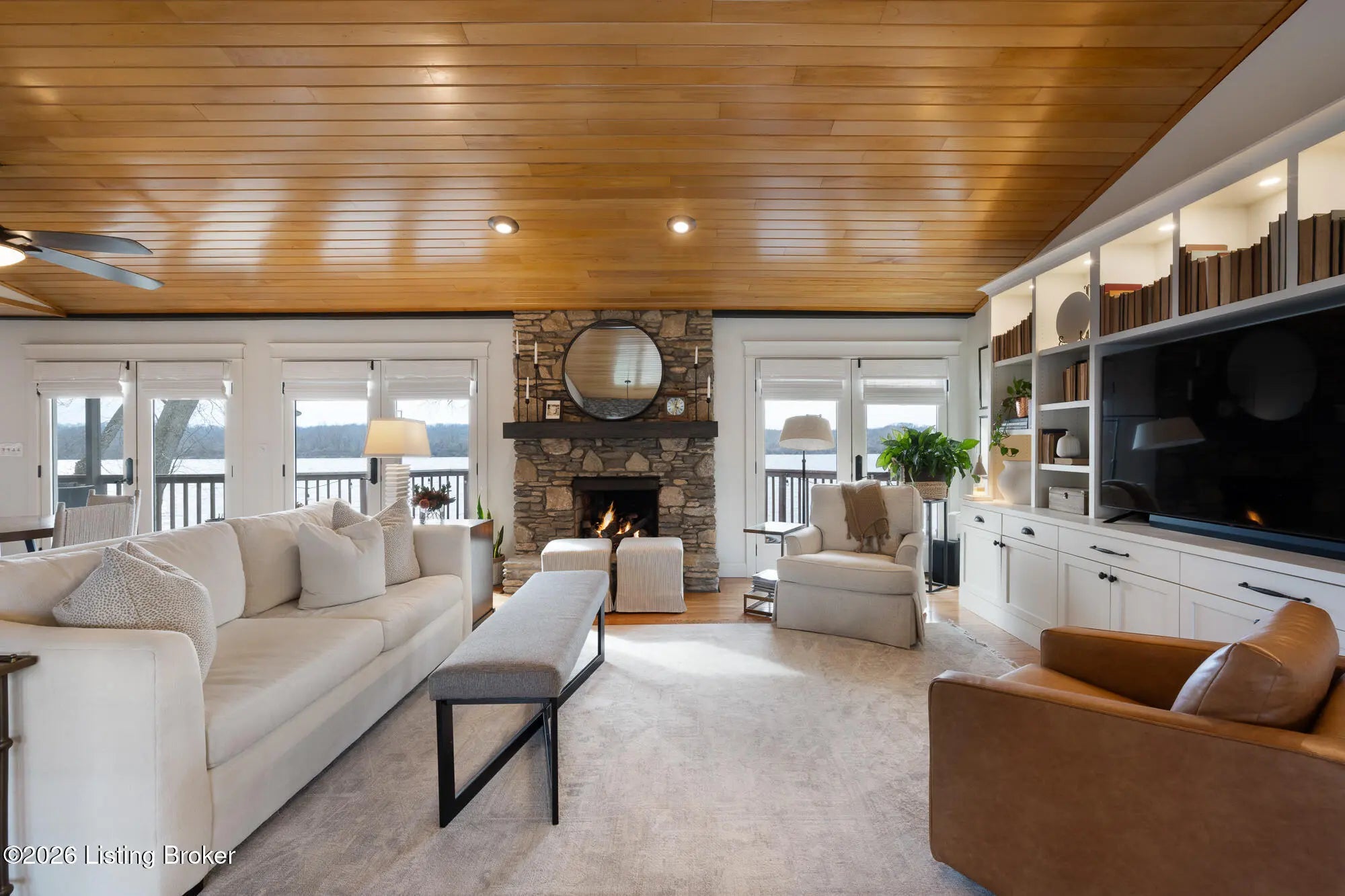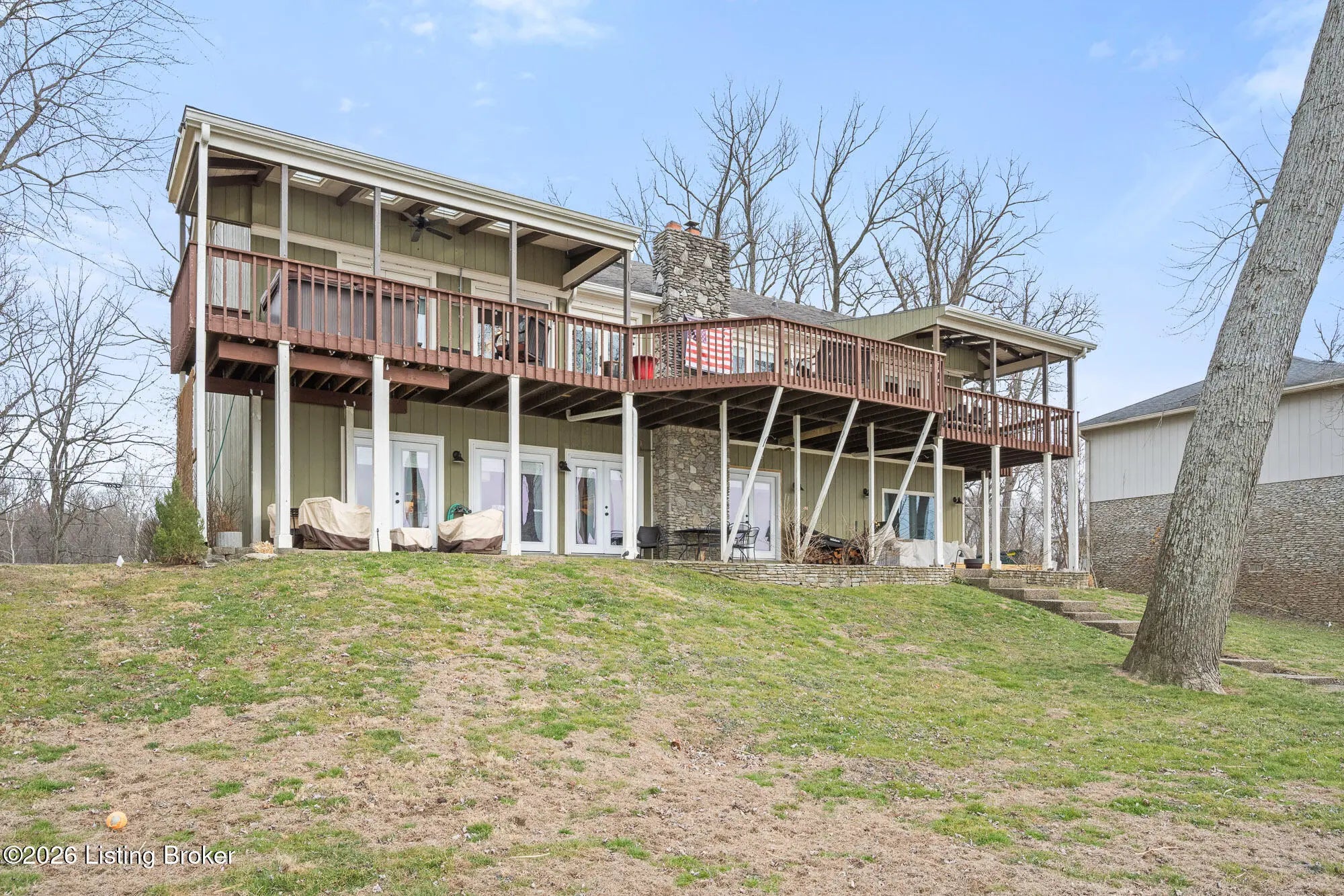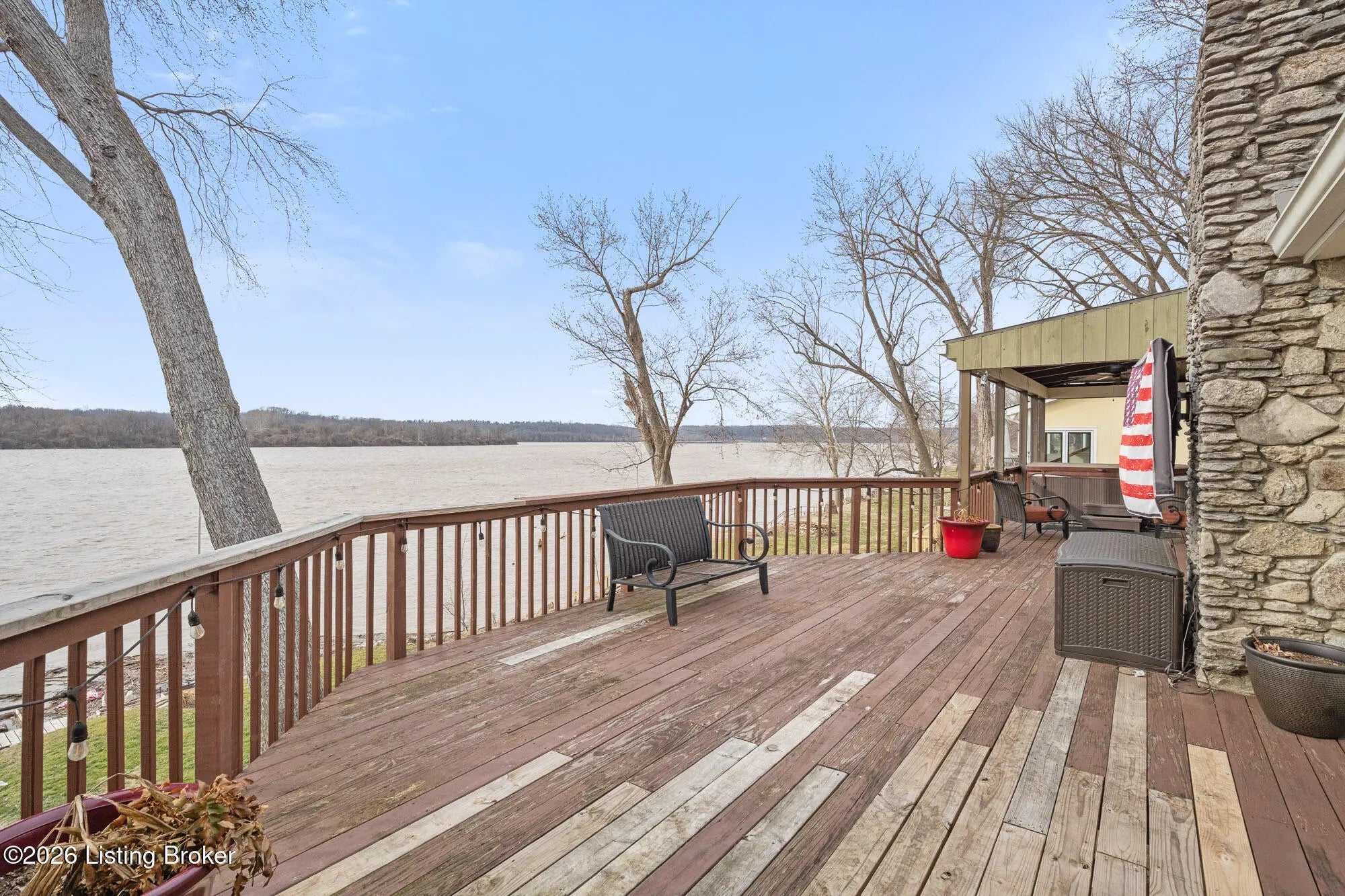 An exceptional opportunity to own premier Ohio River frontage in the highly desirable Belknap Beach Estates—uniquely positioned on elevated terrain offering both breathtaking views and added peace of mind. This thoughtfully refreshed residence offers approximately 3,400 square feet of finished living space and delivers the ultimate Prospect waterfront lifestyle, complete with multiple private docks providing direct access for boating, entertaining, and everyday enjoyment on the river. Designed to maximize natural light and panoramic water views, the main living level features a second-floor kitchen with beautifully preserved original cabinetry and hardware—timeless craftsmanship seamlessly paired with updated lighting and fresh finishes. The layout flows effortlessly into inviting living and entertaining spaces, creating a warm yet refined atmosphere. A first-floor kitchenette enhances the home's versatility, while the flexible floor plan includes a main-level bedroom and two additional bedrooms upstairs—ideal for private guest accommodations, work-from-home needs, or multi-functional living with comfortable separation of space. The primary bath has been tastefully refreshed, offering a serene retreat with opportunity for future customization. Riverfront properties with this combination of elevation, multiple docks, and established community setting are increasingly rare. Enjoy space, flexibility, and direct waterfront access—just minutes from the conveniences and charm of Prospect.