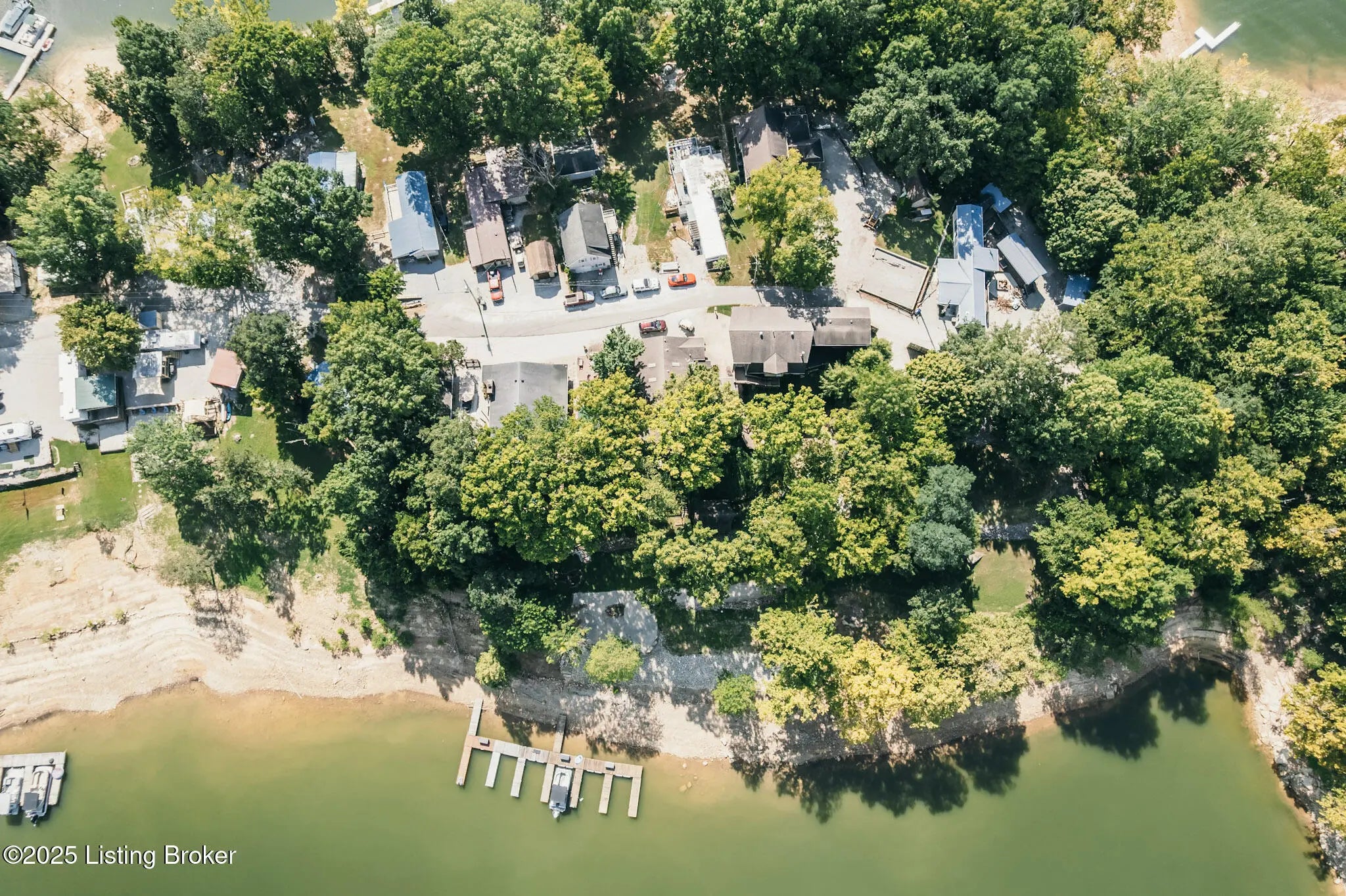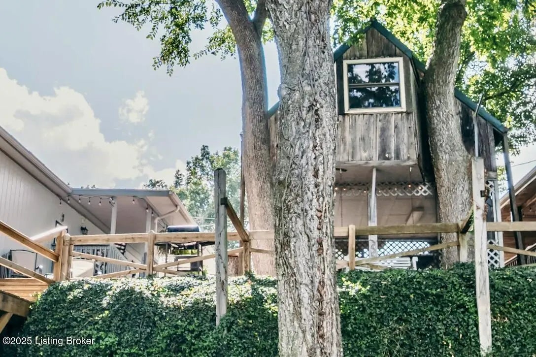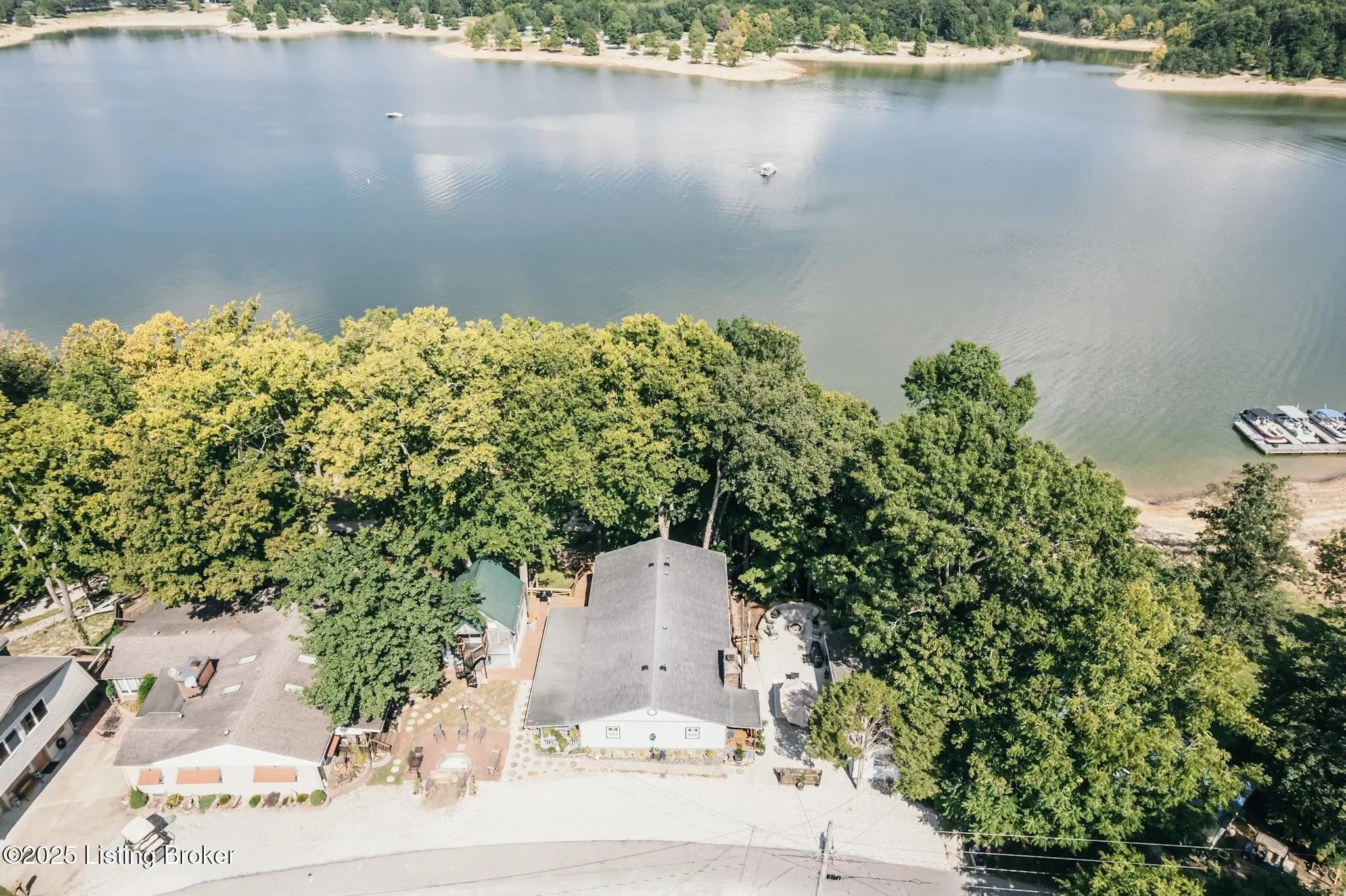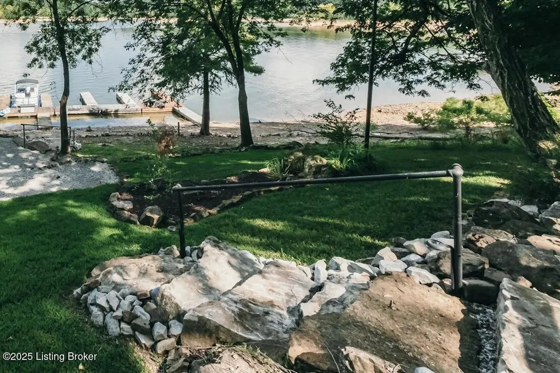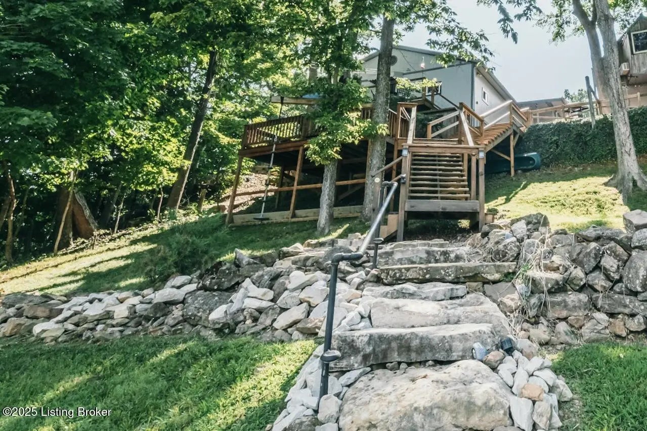 Generations have gathered here sharing laughter, stories & countless fond memories of days & nights spent on this special stretch of Rough River Lake. These 2 waterfront lots are situated on a peninsula at the end of the road with a lakeside home having 4 bedrooms, 2 full baths & a separate laundry room that doubles for extra sleeping arrangements. The property is surrounded by mature shade trees & amazing lake views that overlook the bay toward Axtel Campgrounds where spring, summer & fall nights offer you the mesmerizing glow of campfires shimmering on the lake. Inside, a touch of lakehouse charm can be found most everywhere. The spacious shared bath features a custom vanity & sink...both bathrooms have a subtle touch of rustic character & charm. Eleven closets mean there is a place for most everything while newer LVP flooring runs throughout the entire home. A brick, wood-burning fireplace invites warmth to the cooler evenings while the covered front porch calls for easy afternoons in the shade. The outdoor living spaces are where lots of lake memories are made with a fire pit in front of the tree house, another fire pit & gravel patio space between the home & shed plus a shady lakeside viewing deck that has easy access to the home's hallway. The outdoor shower with hot & cold running water is an experience all on it's on whether in the morning before a day on the lake or after. Newly built, Amish-crafted steps make it an easy stroll to the shoreline for both the young & old alike. A whimsical spiral staircase leads to an extra sleeping or hangout space in the tree house which has electricity & yet another beautiful view of the lake. The screened-in porch below it is perfect for outdoor dining, card games & most any celebration with friends & family. Modern day amenities are well covered...electric, public water & a septic system are connected to the property with rare high-speed fiber optic internet being available. The large shed with electric is ideal as a workshop or storage needs for your gardening tools & lake toys. Plentiful off-street parking means you can invite many of your favorite people for visits to your lake house. A dock on the string just below the property will transfer with COE approval. By land or water, you're minutes from Nick's Boat Dock & Marina with shopping & dining close by in McDaniels, Hardinsburg & Leitchfield. Easy travel to & from Louisville, Elizabethtown, Owensboro & more. This is more than just a lake house, it's a place where summers are meant to be spent, autumns & winters are cozy and new memories are waiting to be made with you & yours. Be sure to view the walk-through video tour and schedule your showing appointment soon! This is a special lake home & property with one of a kind lake views & easy dock access so don't let the opportunity pass you by!