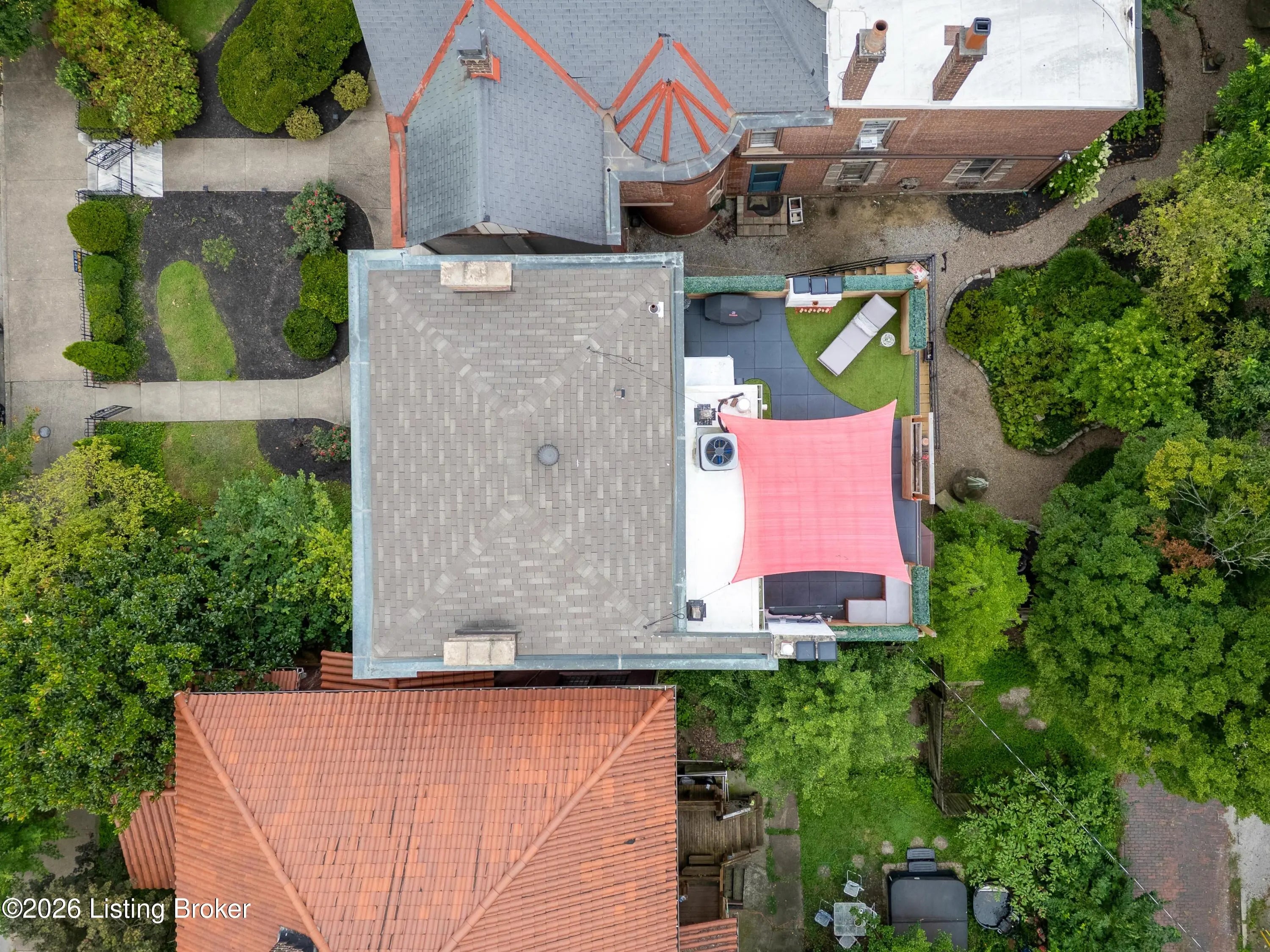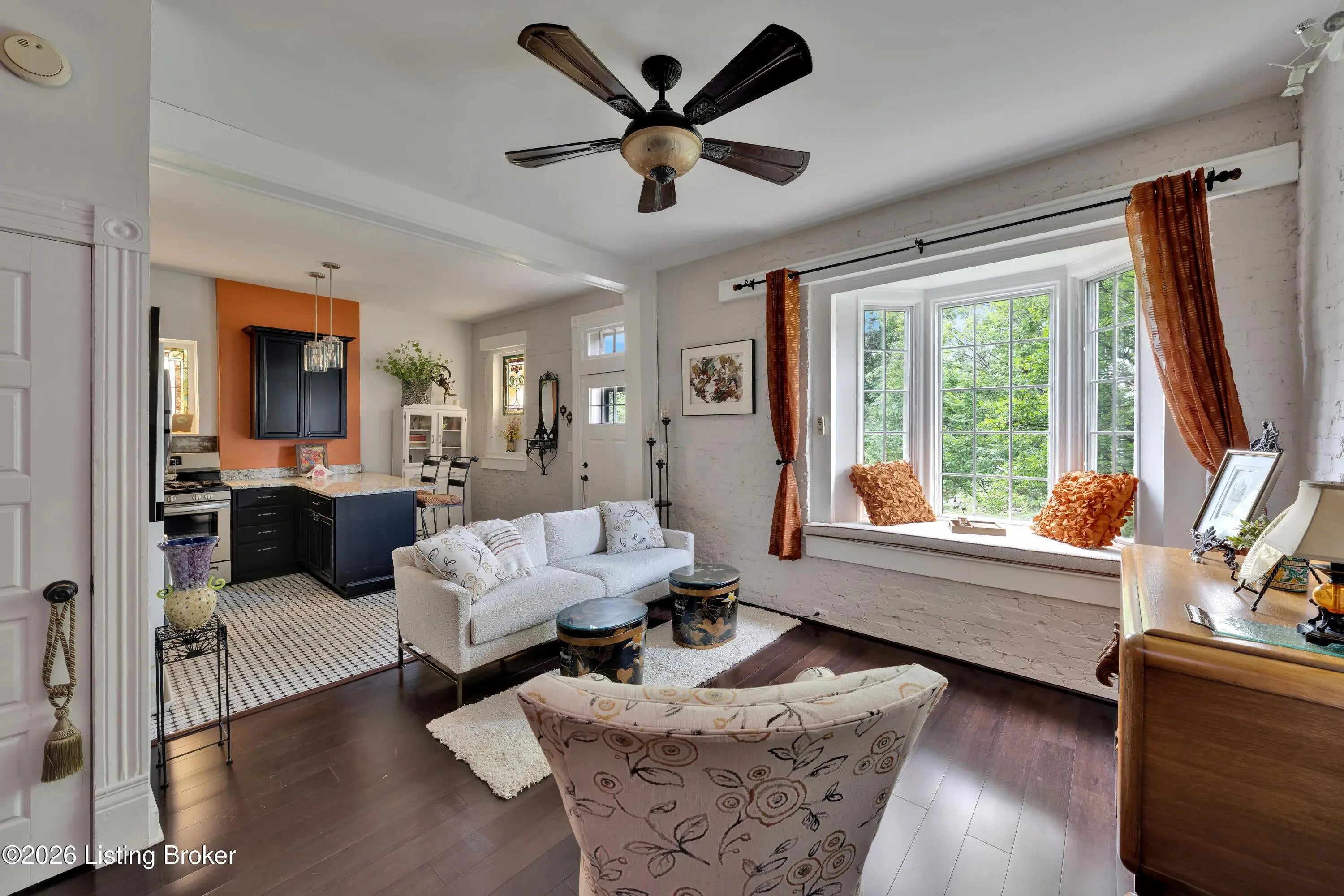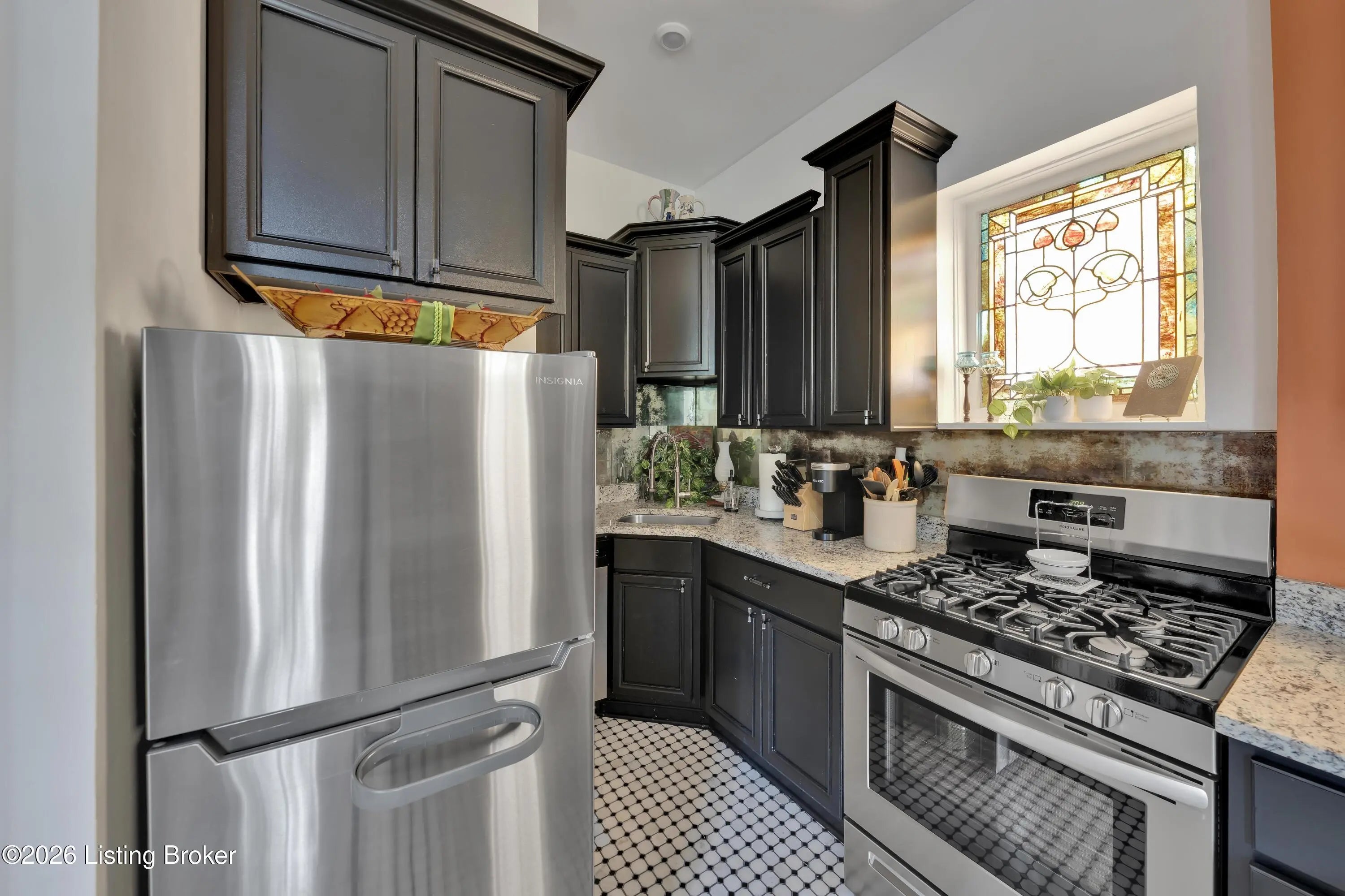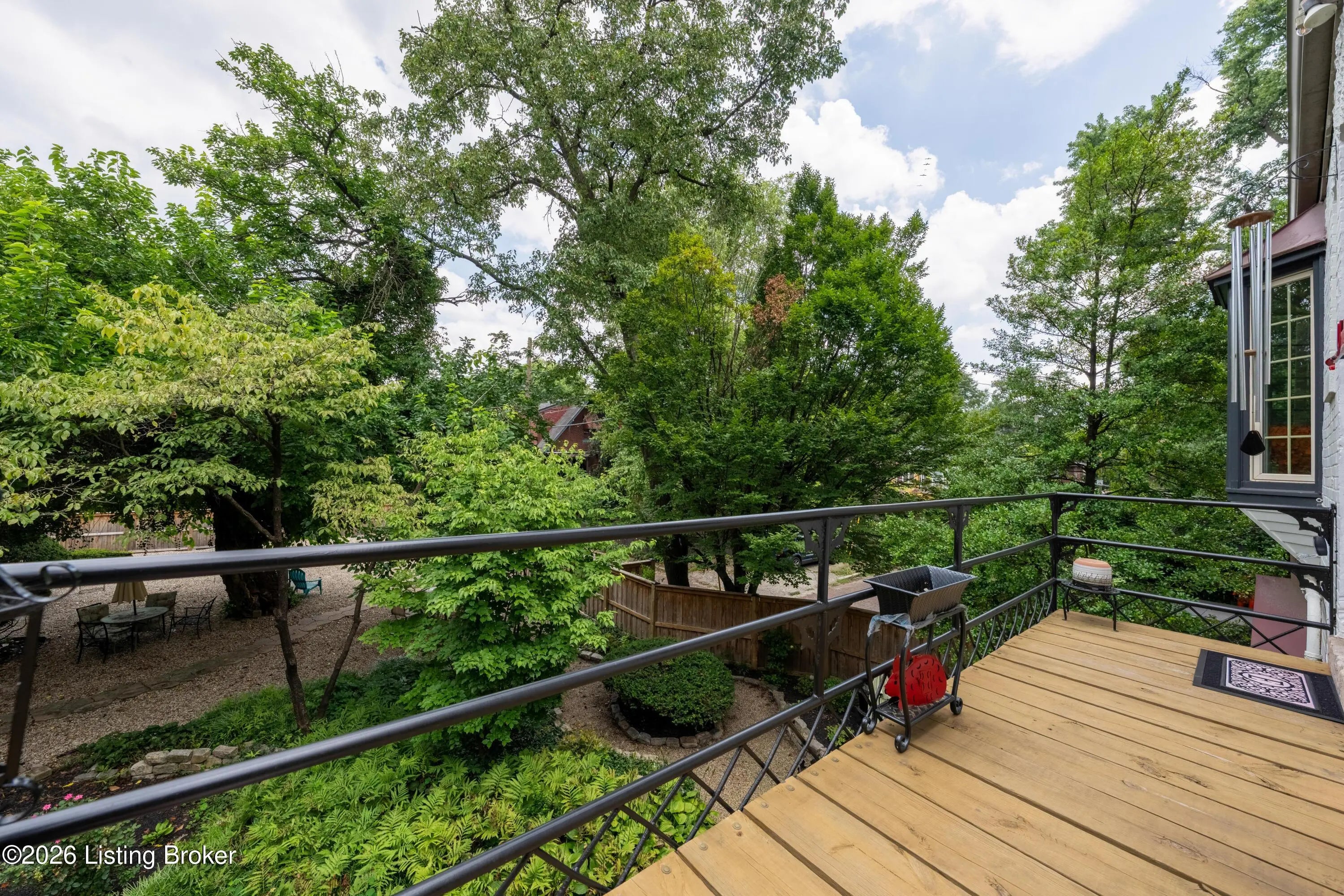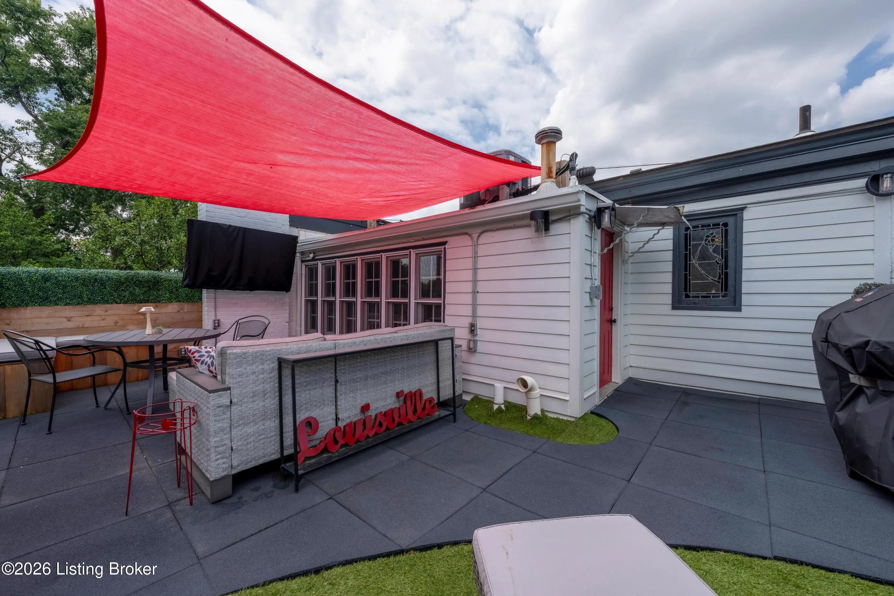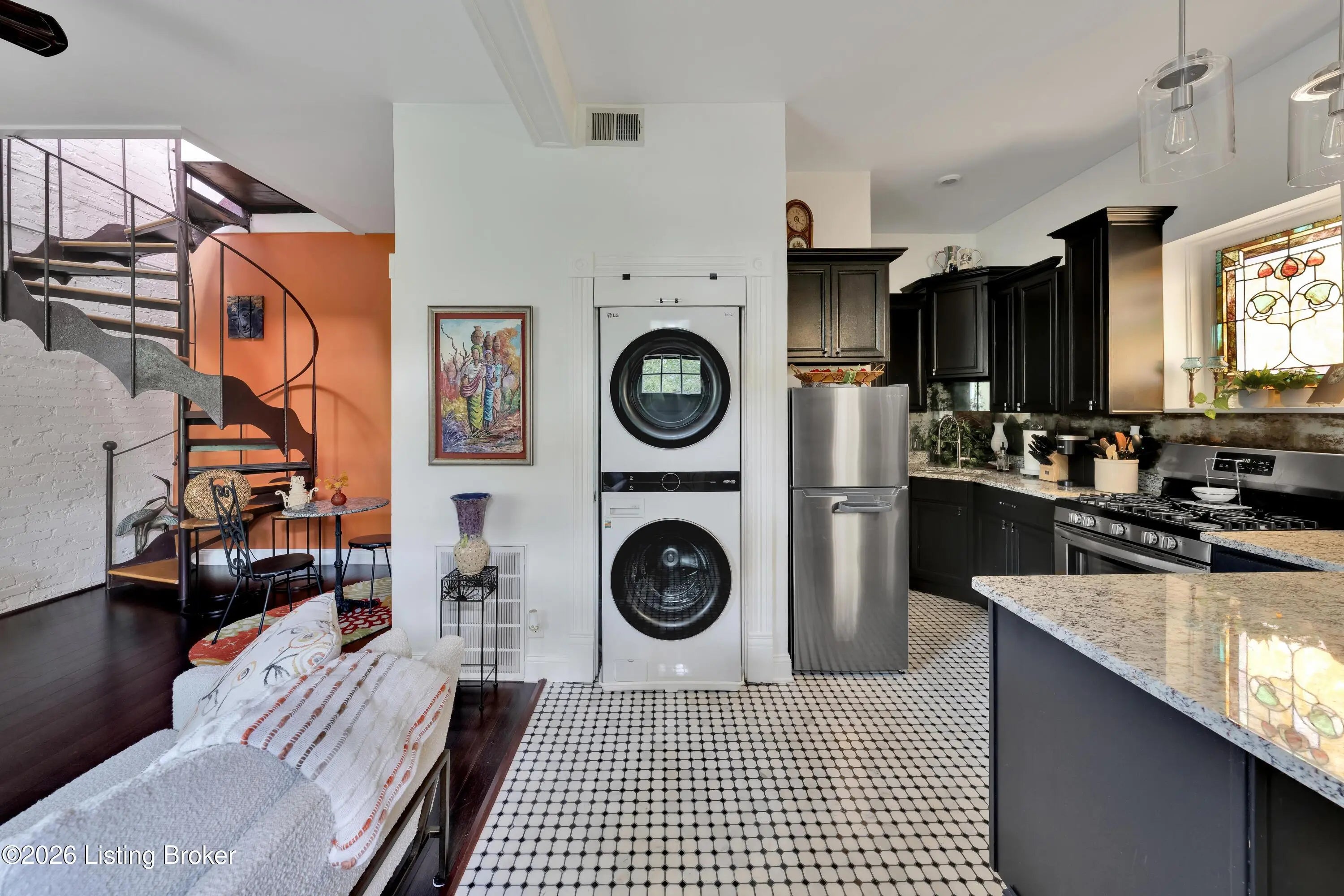 Welcome to Old Louisville's beautiful Victoria Gardens. The owners affectionately call their second home "Louisville Charm", and when you step in, you'll see why. The sellers have put a lot of love into the improvements over the last three years, including new, period-appropriate floor tile in the kitchen, new appliances upgrading to gas, updated cabinets, and granite countertops. The adjoining living room with Bay window makes for a cozy space to entertain or just relax with a good book and your favorite beverage on the custom-made window cushion. And, don't despair—they also added an in-unit washer and dryer with all the bells and whistles. Upstairs, you'll find two nicely sized bedrooms and the completely remodeled remodeled bathroom. The architect- designed private roof top patio boasts custom planter boxes, sleek rails, floating floor, a custom storage bench, installed electric for work-from home access, custom lighting, lounger sofa, and a 65" outdoor TV.
