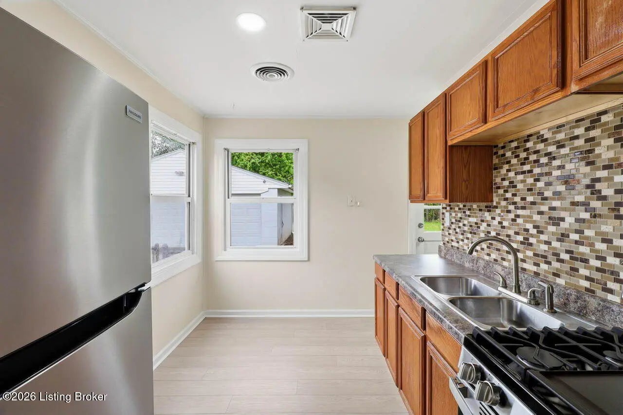 One of the largest lots in Fredrick Acres combined with huge 2 car garage, BRAND NEW PARKING PAD and beautifully remodeled home - make it a must see! PLUS 5 yrs NEW HVAC AND WATER HEATER AND 4 yrs NEW ROOF! Front door welcomes you to a bright and cheerful Living Room with large window and wood laminate flooring! Eat in Kitchen is well lit, has corner windows, double sink, backsplash and features BRAND NEW flooring, gas stove and refrigerator! Spacious Laundry/Utility Room provides extra storage. The entire interior has been freshly painted in warm neutral colors and exterior - pressure washed and freshly painted as well! Both Bedrooms are well lit and have good closet space. Large ceramic Bath offers new Vanity and Shower/Tub Combo. You'll love this chain linked large Backyard - it can accommodate any ball game, all your grilling needs with summer around the corner, and family and friends gatherings! Large back Patio, Enormous 2 car garage with long driveway and new parking pad and outbuilding for all your garden tools complete the outside of this cozy home! This adorable home is ready for new homeowners and quick possession available!