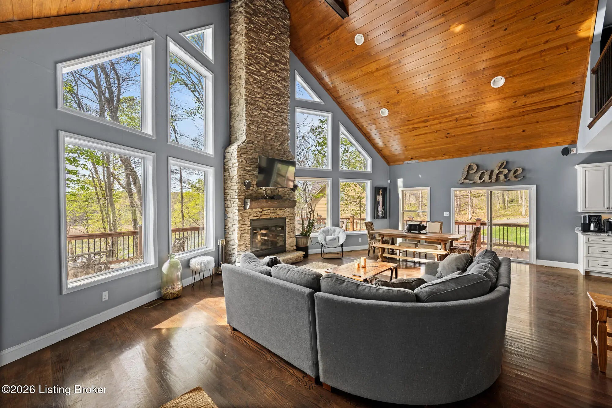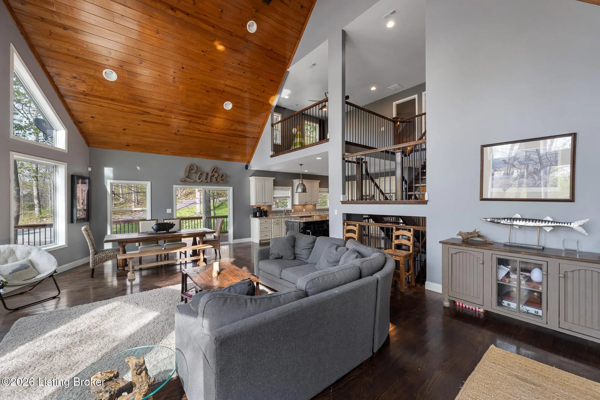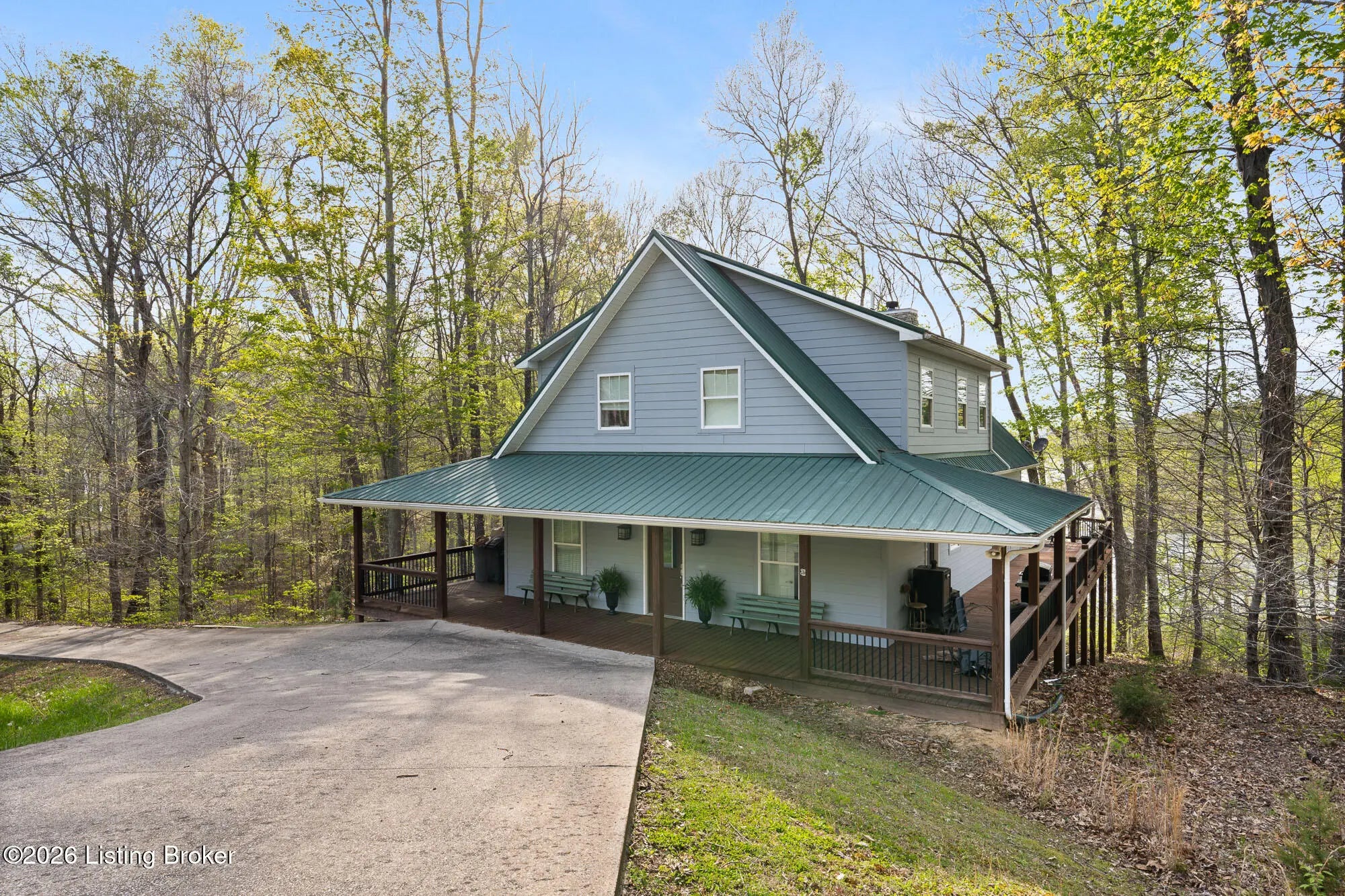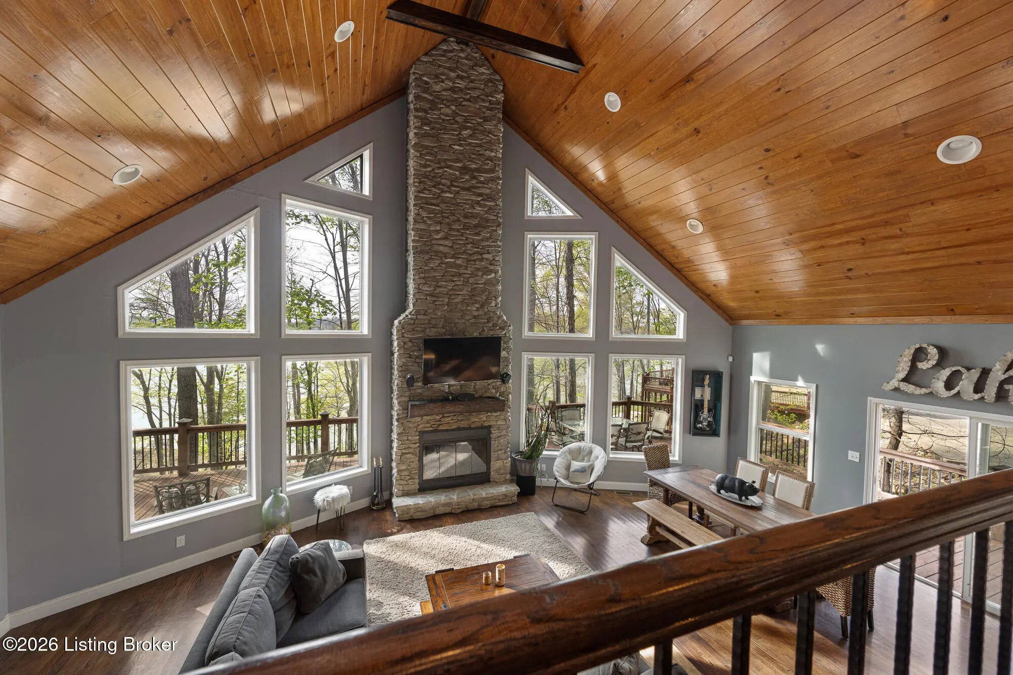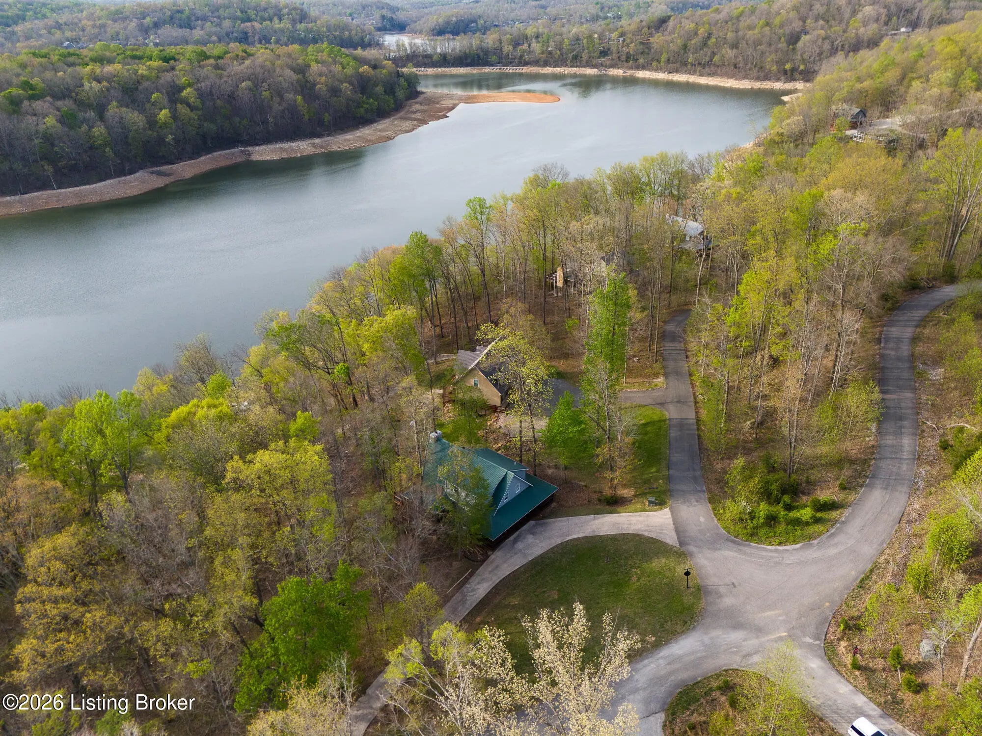 Lakefront views and timeless craftsmanship define this Amish-built retreat in the highly desirable gated, deed-restricted community of The Point at Nolin. Thoughtfully designed for both relaxation and entertaining, the home features expansive decks and a screened porch overlooking a , protected cove with neighborhood docks—perfect for soaking in breathtaking sunset views. Inside, soaring ceilings and a stunning stone fireplace anchor the great room, creating a warm and inviting gathering space. The open-concept layout flows seamlessly into the fully equipped kitchen, complete with granite countertops, a large island with seating, and a beverage refrigerator—truly the heart of the home. The main level offers a private primary suite with dual vanities and dual closets, along with a convenient laundry room with sink and abundant cabinetry, a dining area, and a half bath. Upstairs, two additional bedrooms and a full bath are connected by solid slab staircases, while a loft provides flexible overflow space. The finished walkout lower level is a true highlight, featuring a full bath and expansive areas ideal for additional sleeping quarters, recreation, or relaxation—perfect for hosting family and friends. An unfinished mechanical room provides excellent storage options. Outdoor enthusiasts will appreciate access to community boat docks via a neighborhood path (UTV or foot access), as well as on-site boat storage (based on availability, for a fee). Adjacent Nolin State Park offers easy access to hiking and biking trails, enhancing the appeal of this exceptional location. Whether you're seeking a full-time residence or a weekend escape, this property delivers the very best of Nolin Lake living—a place where lasting memories are made.