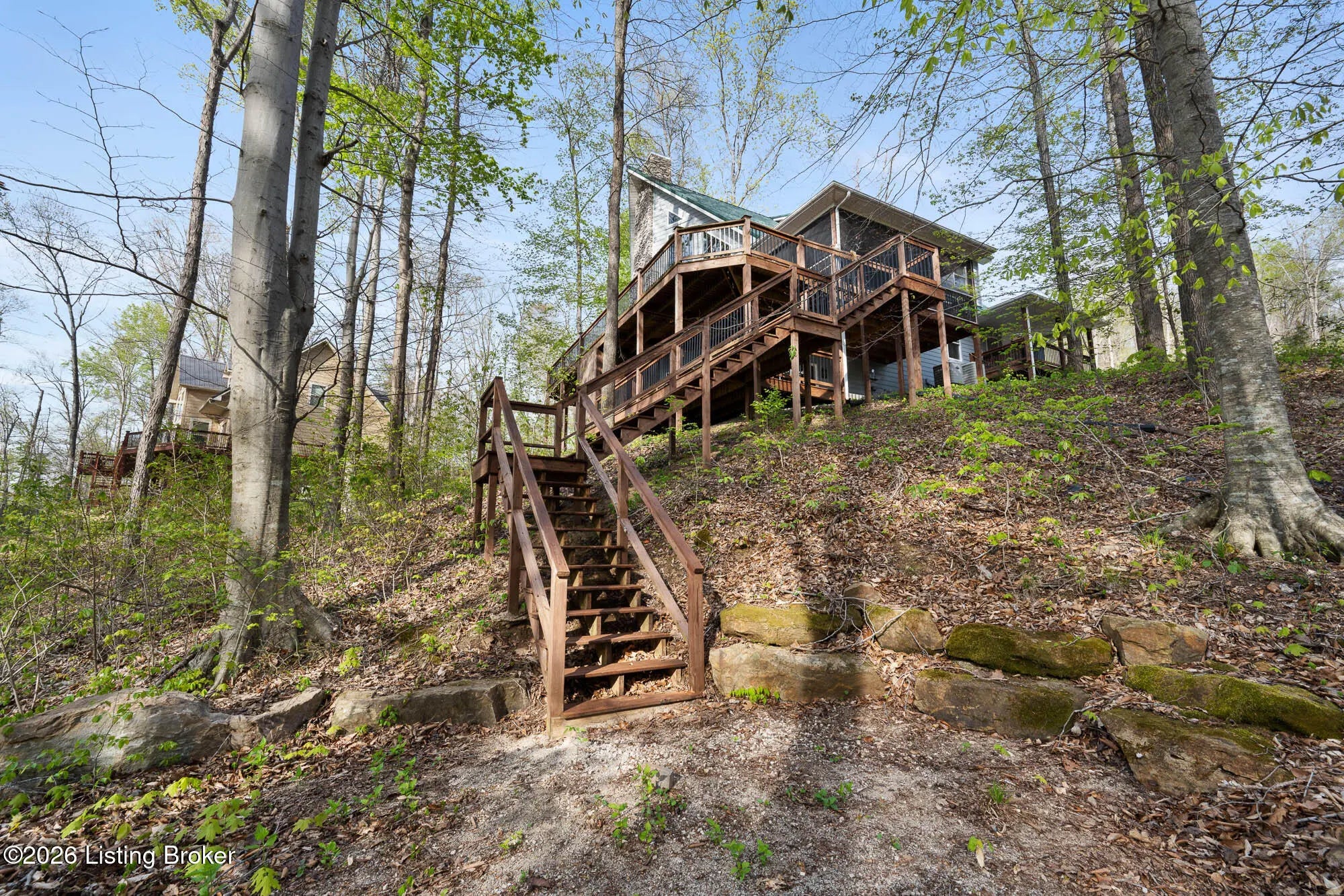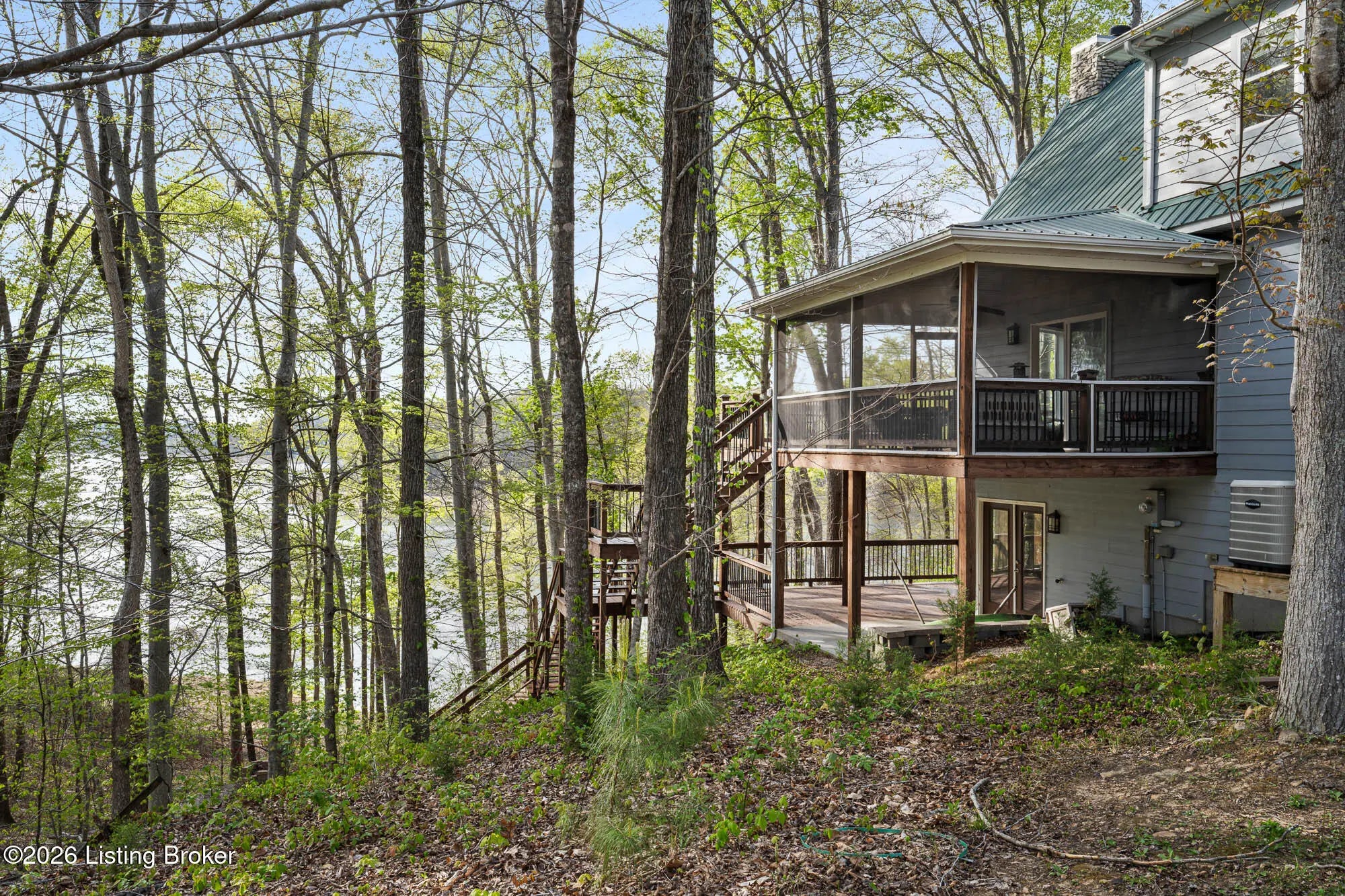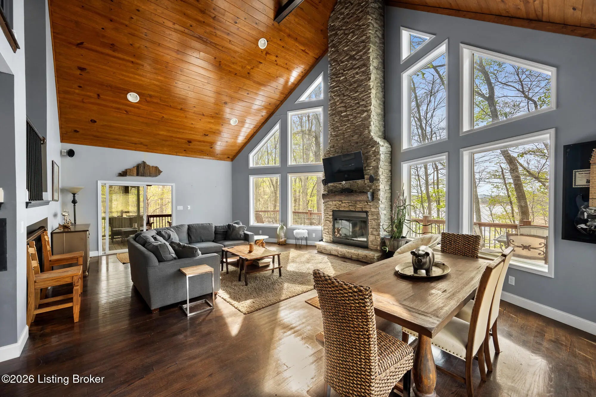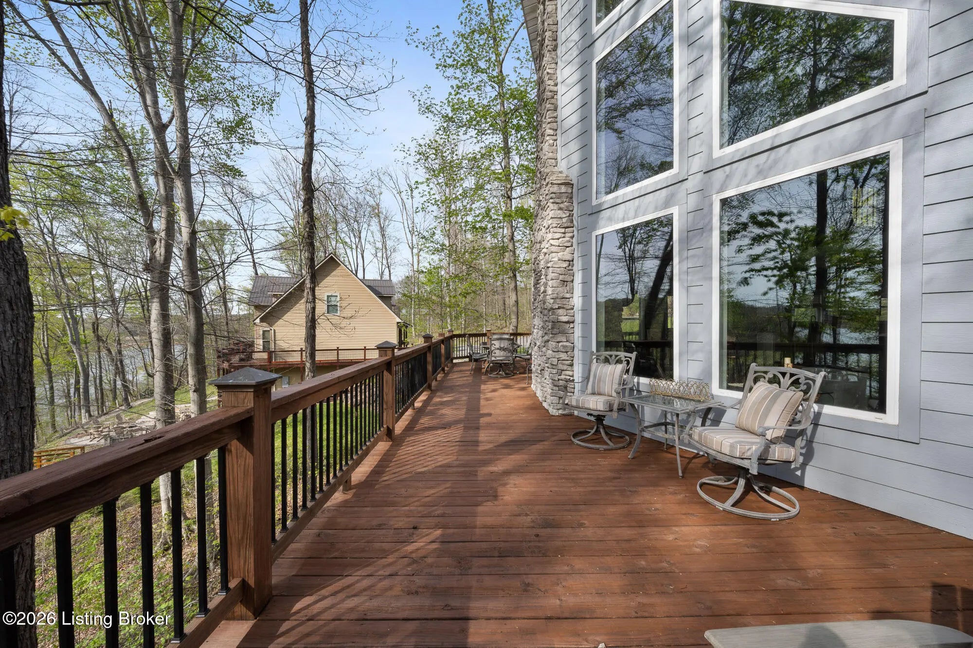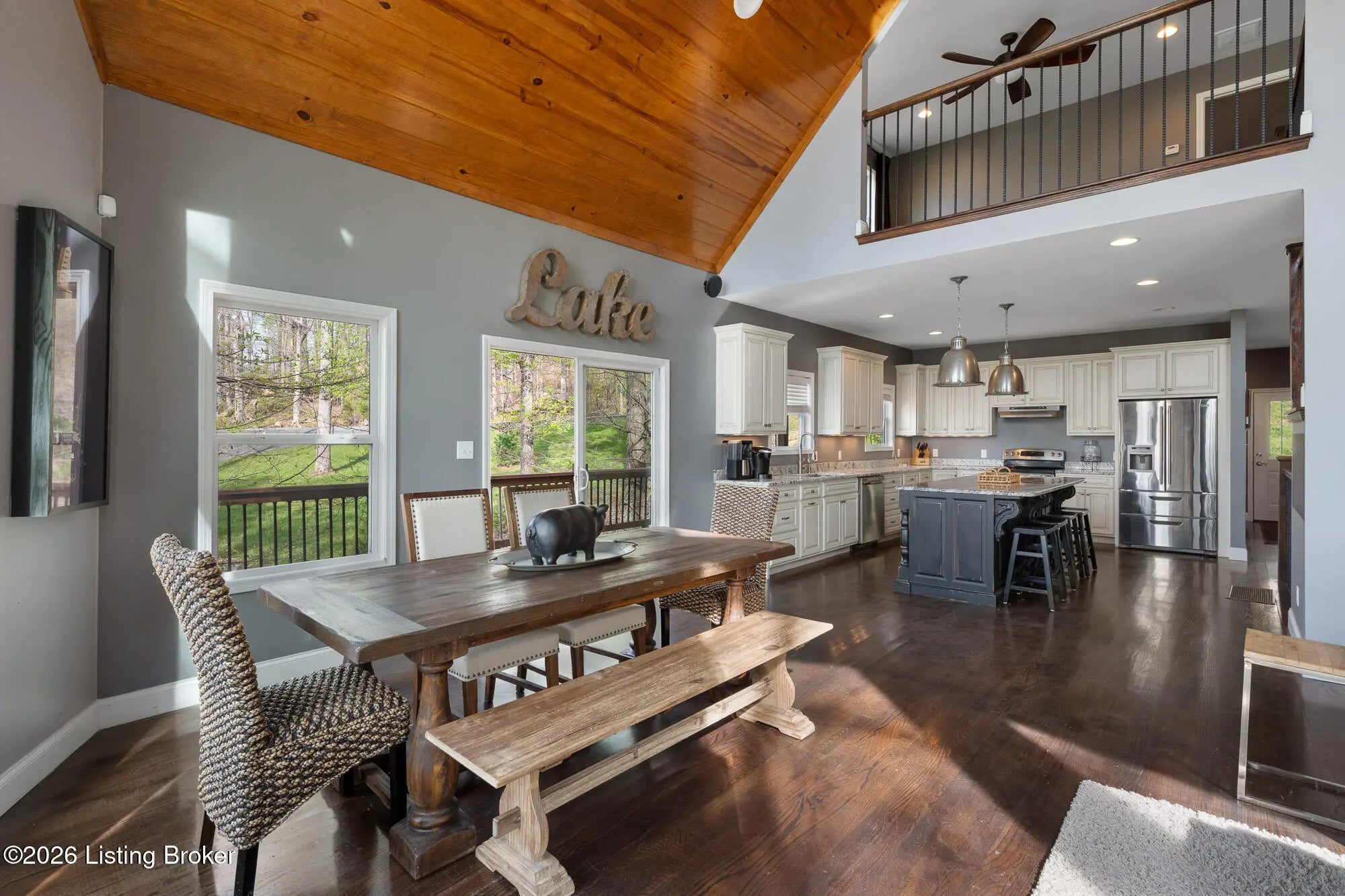 Lakefront views and timeless craftsmanship define this Amish-built retreat in the highly desirable gated, deed-restricted community of The Point at Nolin. Thoughtfully designed for both relaxation and entertaining, the home features expansive decks and a screened porch overlooking a , protected cove with neighborhood docks—perfect for soaking in breathtaking sunset views. Inside, soaring ceilings and a stunning stone fireplace anchor the great room, creating a warm and inviting gathering space. The open-concept layout flows seamlessly into the fully equipped kitchen, complete with granite countertops, a large island with seating, and a beverage refrigerator—truly the heart of the home. The main level offers a private primary suite with dual vanities and dual closets, along with a convenient laundry room with sink and abundant cabinetry, a dining area, and a half bath. Upstairs, two additional bedrooms and a full bath are connected by solid slab staircases, while a loft provides flexible overflow space. The finished walkout lower level is a true highlight, featuring a full bath and expansive areas ideal for additional sleeping quarters, recreation, or relaxation—perfect for hosting family and friends. An unfinished mechanical room provides excellent storage options. Outdoor enthusiasts will appreciate access to community boat docks via a neighborhood path (UTV or foot access), as well as on-site boat storage (based on availability, for a fee). Adjacent Nolin State Park offers easy access to hiking and biking trails, enhancing the appeal of this exceptional location. Whether you're seeking a full-time residence or a weekend escape, this property delivers the very best of Nolin Lake living—a place where lasting memories are made.