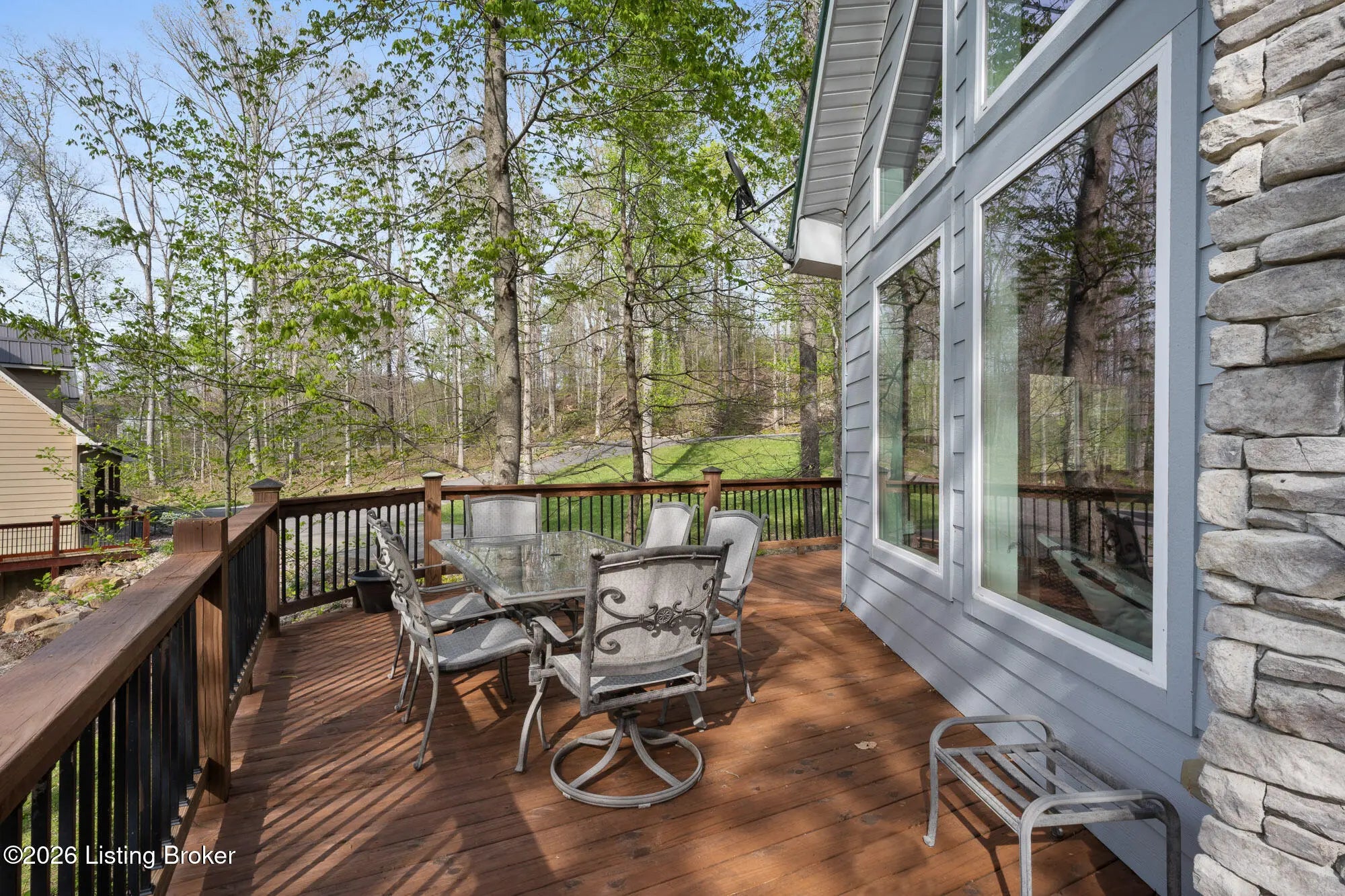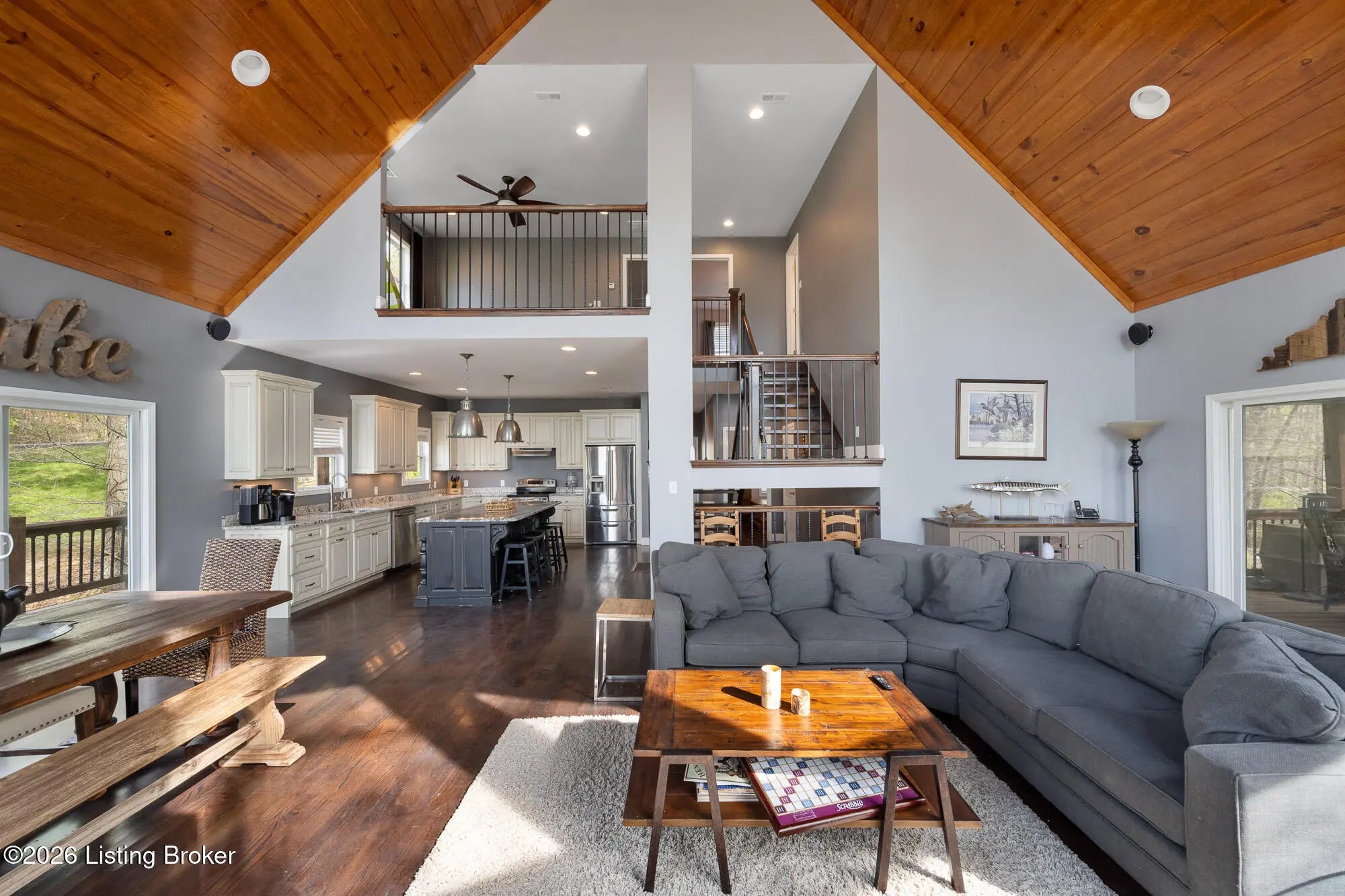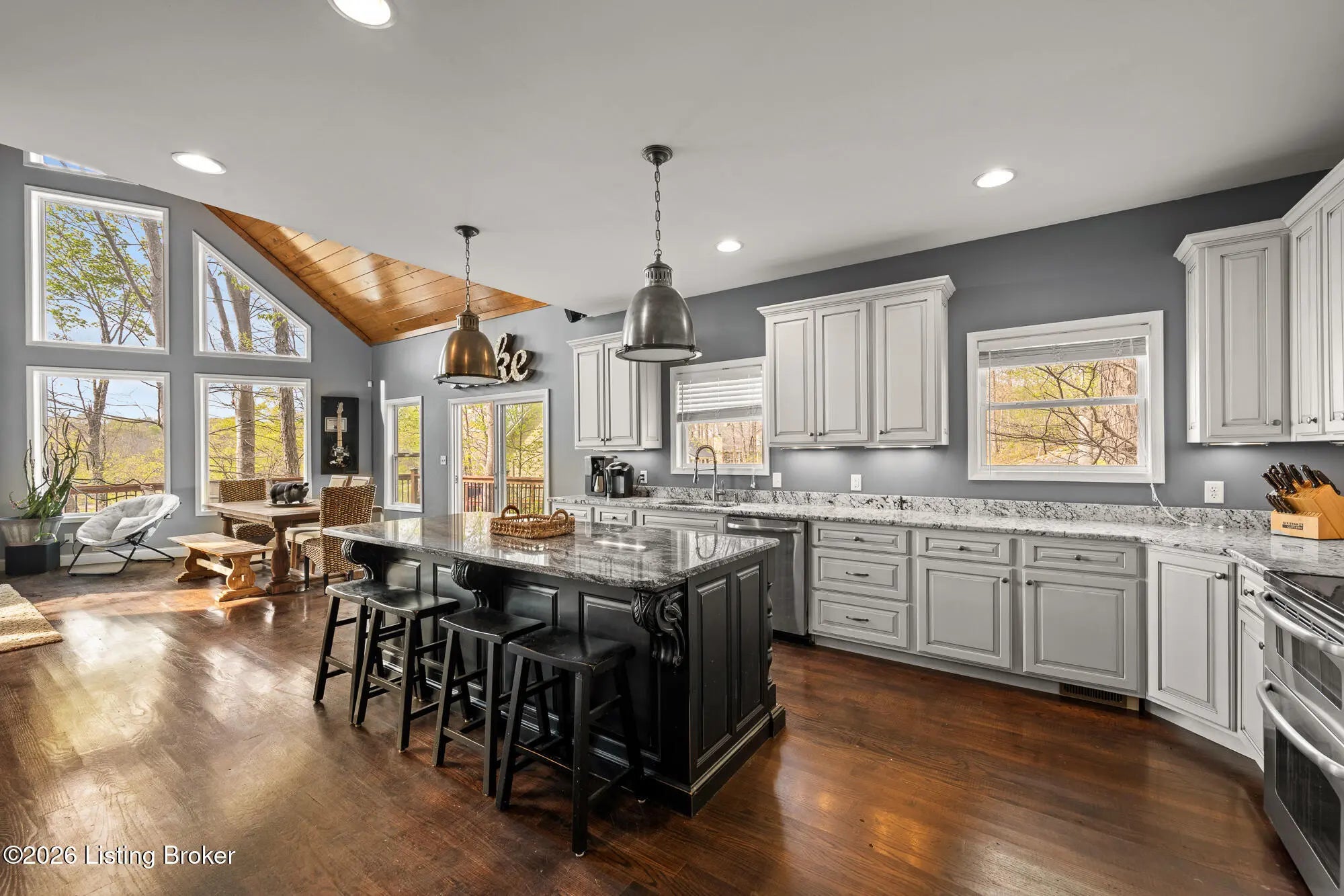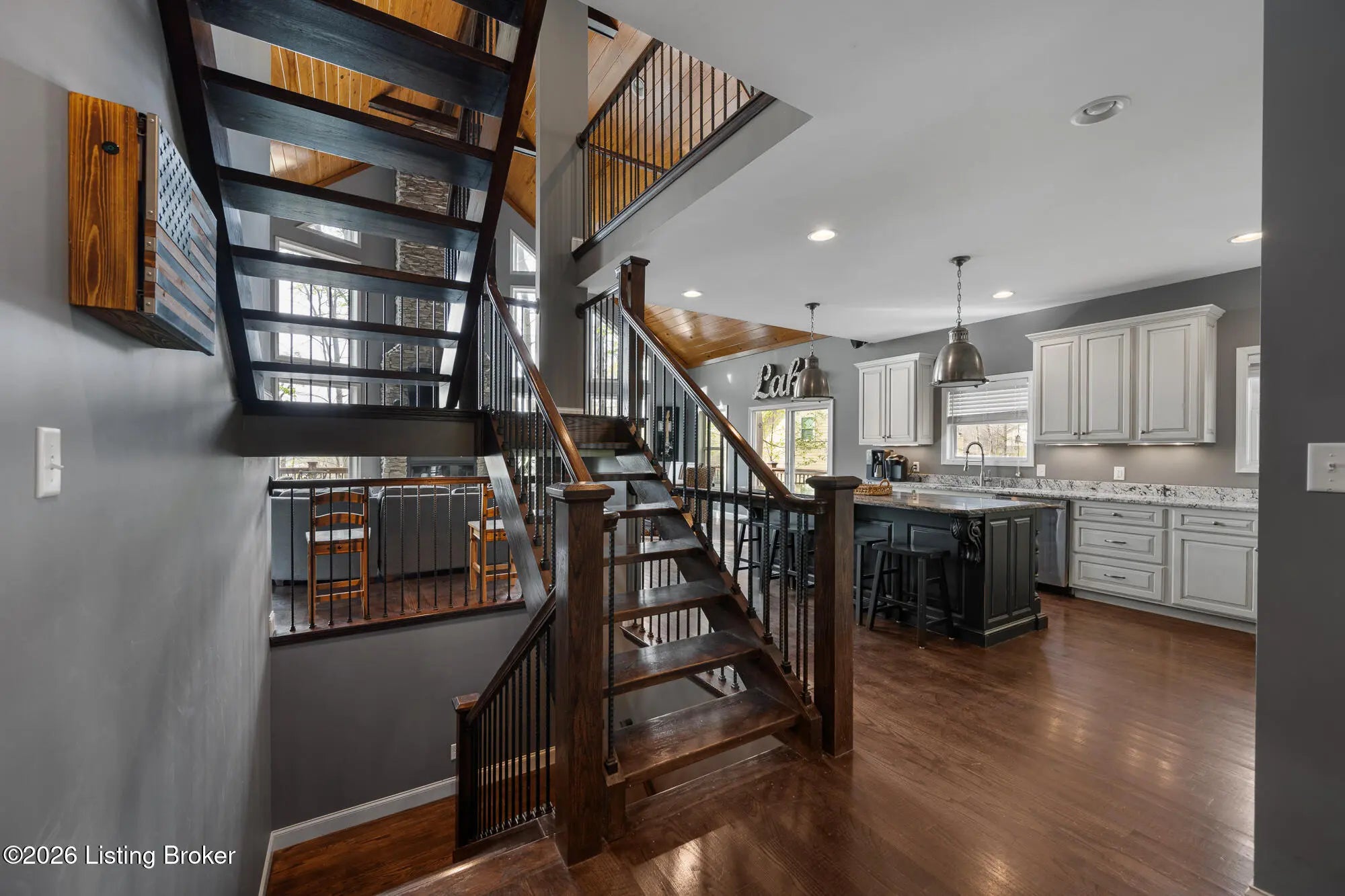 Lakefront views and timeless craftsmanship define this Amish-built retreat in the highly desirable gated, deed-restricted community of The Point at Nolin. Thoughtfully designed for both relaxation and entertaining, the home features expansive decks and a screened porch overlooking a , protected cove with neighborhood docks—perfect for soaking in breathtaking sunset views. Inside, soaring ceilings and a stunning stone fireplace anchor the great room, creating a warm and inviting gathering space. The open-concept layout flows seamlessly into the fully equipped kitchen, complete with granite countertops, a large island with seating, and a beverage refrigerator—truly the heart of the home. The main level offers a private primary suite with dual vanities and dual closets, along with a convenient laundry room with sink and abundant cabinetry, a dining area, and a half bath. Upstairs, two additional bedrooms and a full bath are connected by solid slab staircases, while a loft provides flexible overflow space. The finished walkout lower level is a true highlight, featuring a full bath and expansive areas ideal for additional sleeping quarters, recreation, or relaxation—perfect for hosting family and friends. An unfinished mechanical room provides excellent storage options. Outdoor enthusiasts will appreciate access to community boat docks via a neighborhood path (UTV or foot access), as well as on-site boat storage (based on availability, for a fee). Adjacent Nolin State Park offers easy access to hiking and biking trails, enhancing the appeal of this exceptional location. Whether you're seeking a full-time residence or a weekend escape, this property delivers the very best of Nolin Lake living—a place where lasting memories are made.