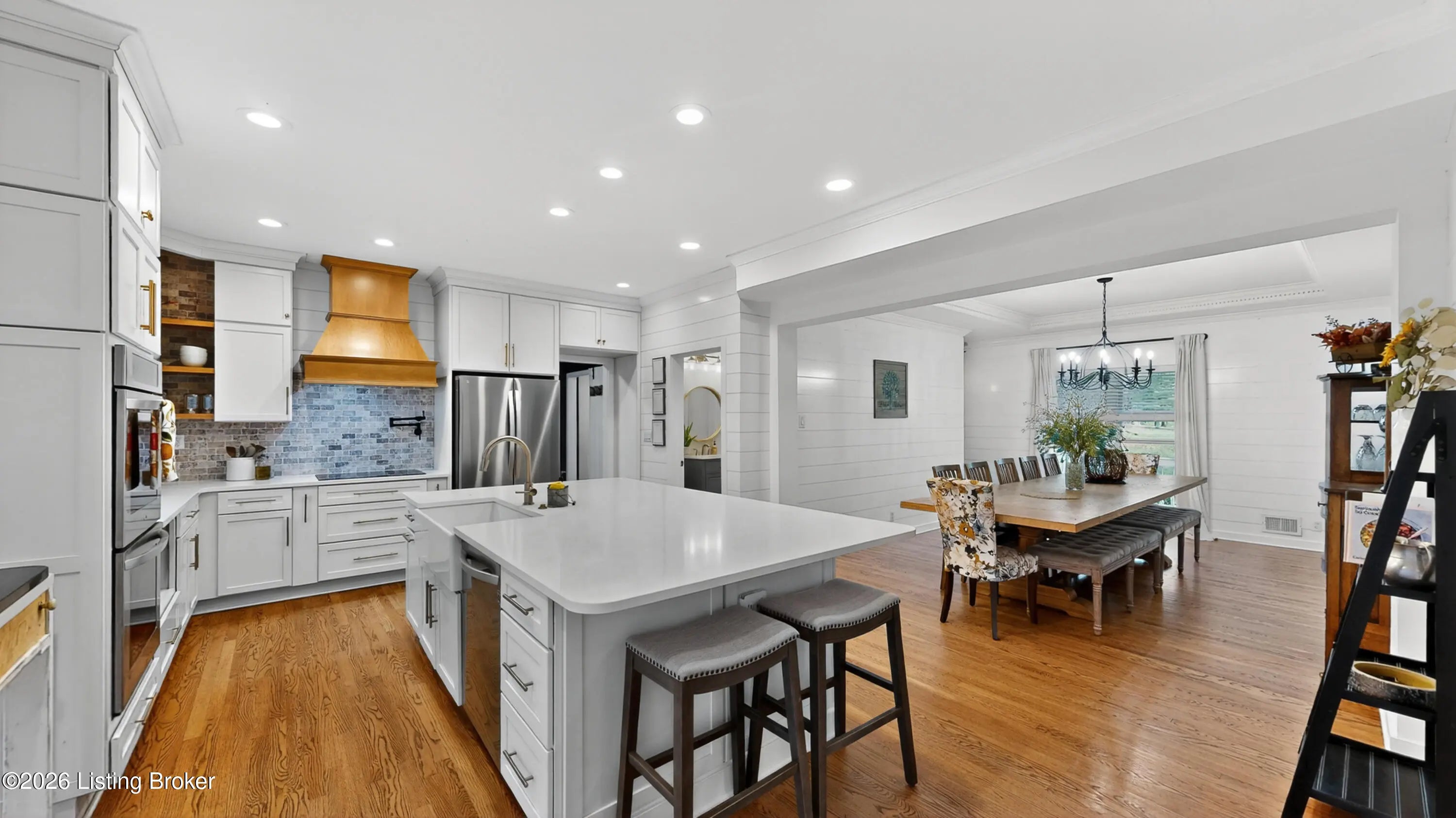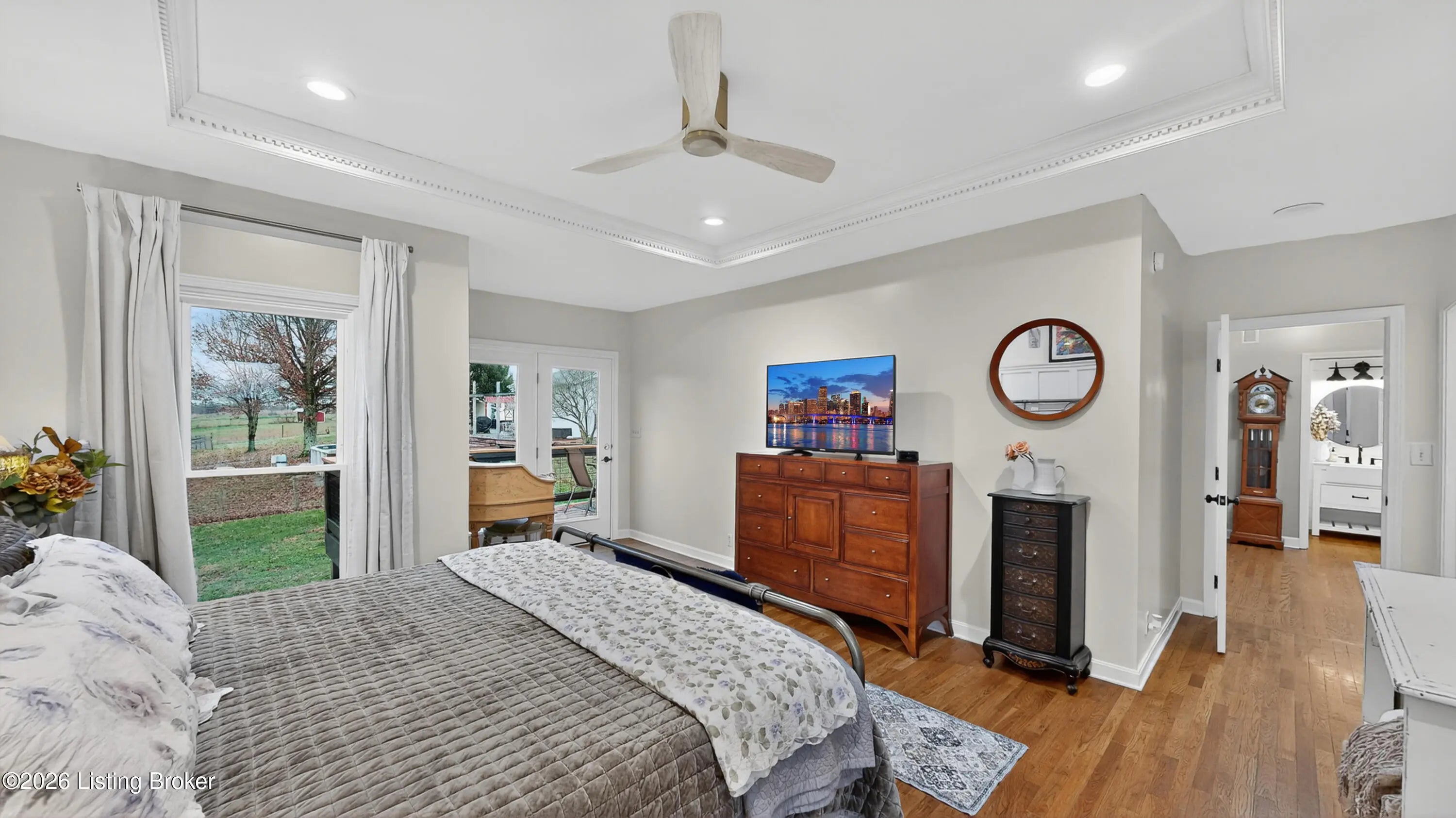 Tucked behind a gated, tree-lined drive off Kings Highway, this 2002 farmhouse sits on 14.92 rolling acres bordered by working farms on every side. The stocked pond greets you at the front of the property. The covered wrap-around porch is the place you will drink your coffee from April through October. Inside, the vaulted great room opens to a fully renovated kitchen built for people who actually cook and entertain. Quartz counters, a custom wood range hood, double wall ovens, a farmhouse sink, butler's pantry/scullery, and a center island with seating for four anchor the space. The adjacent dining area holds a table for fourteen, and the gas log fireplace in the living room throws warmth clear across the open plan. The main floor primary suite opens to the rear deck & includes an updated bath with double vanities, walk-in tile shower, and a cedar-lined walk-in closet. The second suite, converted from the attached garage, adds a private bath and its own entrance through a generous mudroom and would make an excellent In-law suite, guest quarters, home office, or accommodations for in-home carer or nanny. Upstairs, three more bedrooms and a full bath share a loft that overlooks the great room. The walkout basement adds a family room, game room, full bath, and a finished office currently used as a fifth bedroom. The unfinished mechanical room could be finished into a full apartment. Perfect for multi-generational living. Outside, the saltwater pool sits beside a 24x28 detached garage with a full-length deck. A 24x24 barn and fenced pasture handle horses or livestock. The wooded creek corridor at the rear has produced deer every season. The front five acres yield hay each year. Shelbyville and Frankfort are 12 minutes in either direction. Louisville is 35. Lexington is 45. Feel the peace of country living with quick access to any shopping/commuting needs.