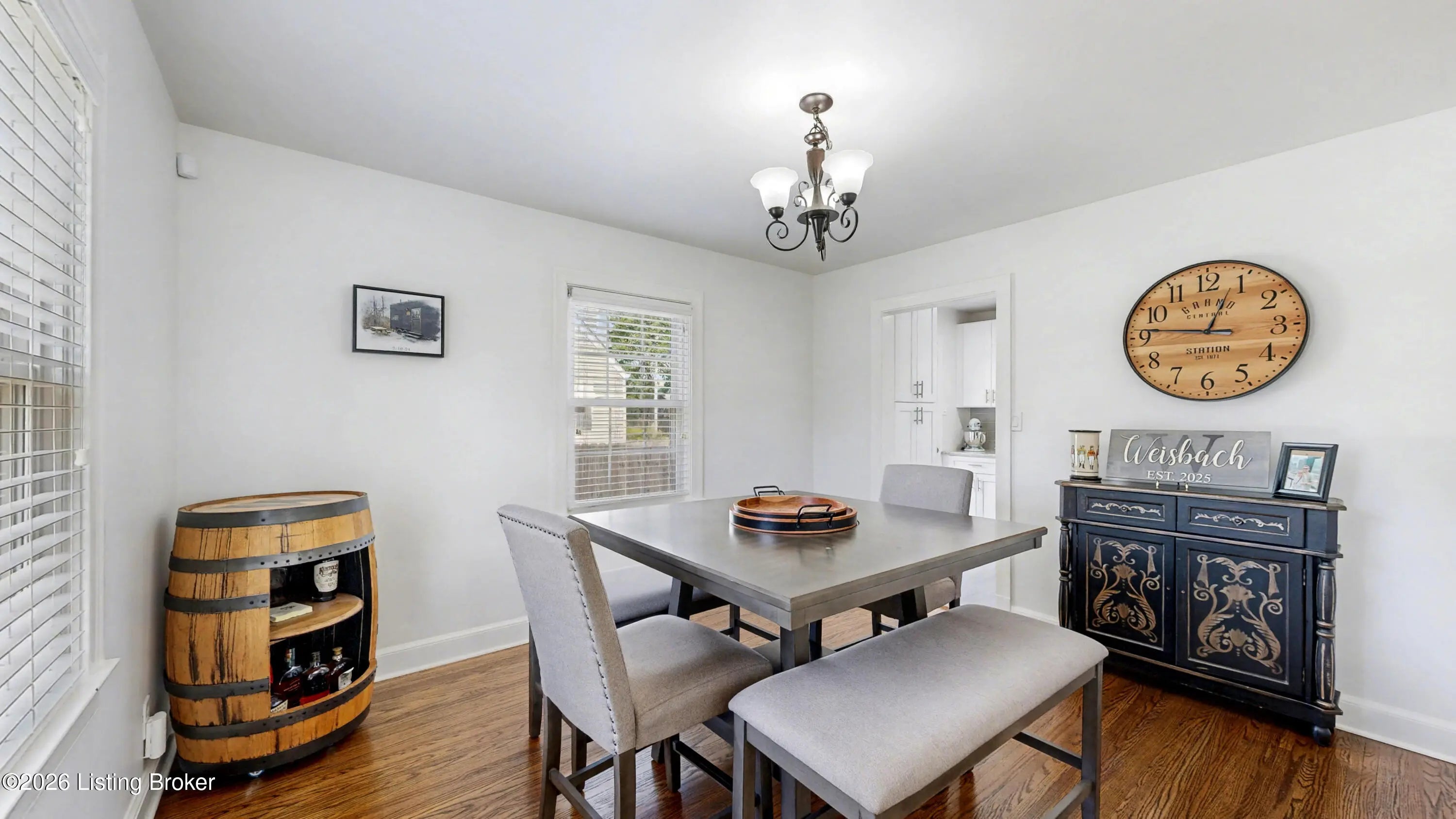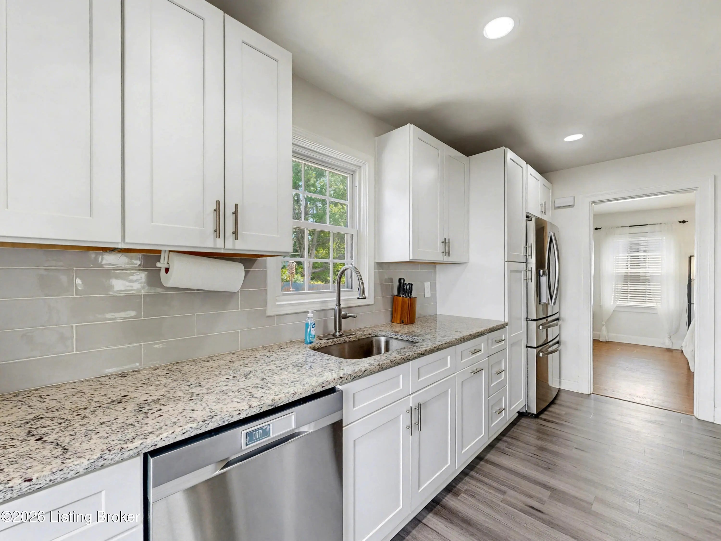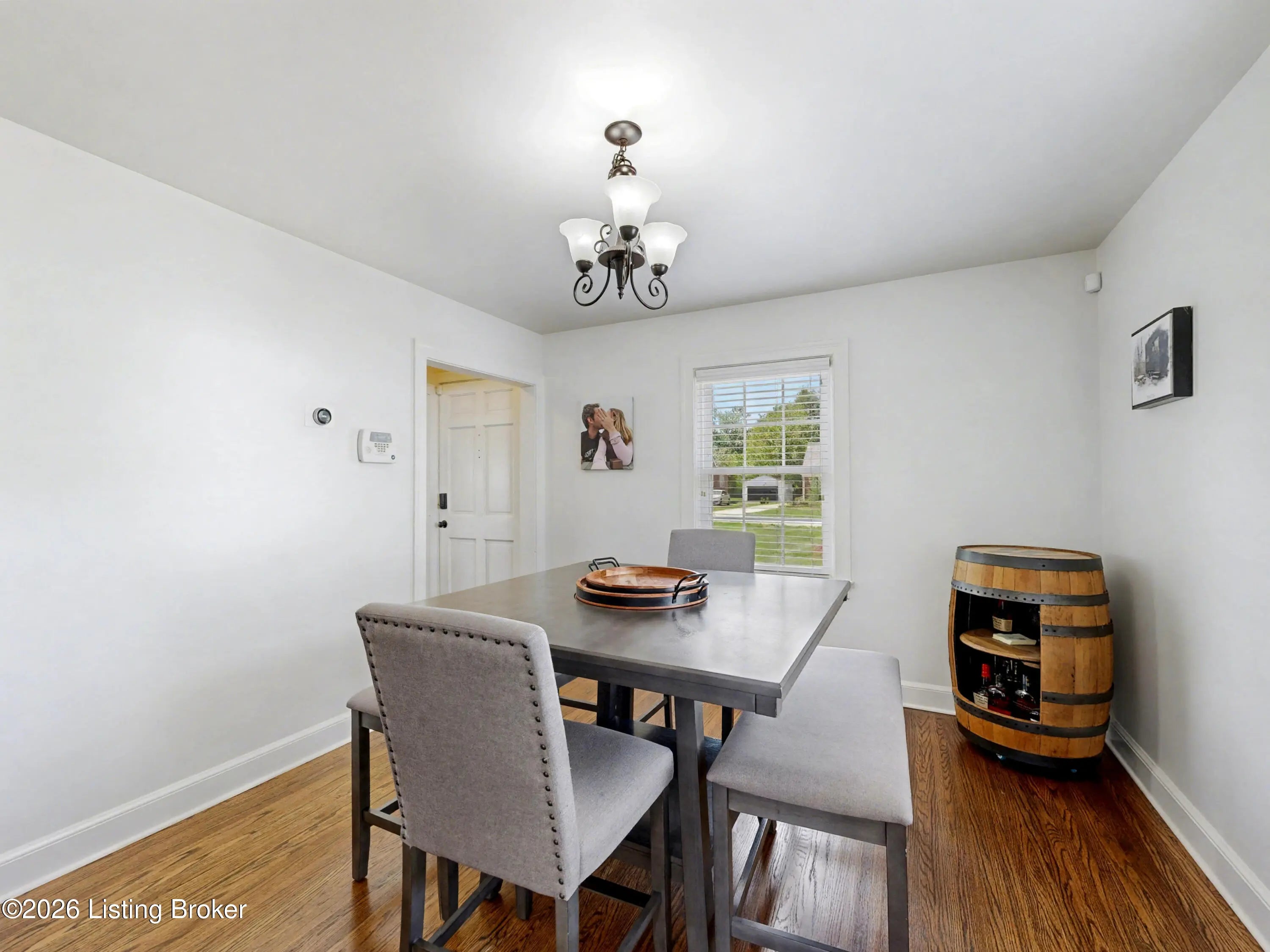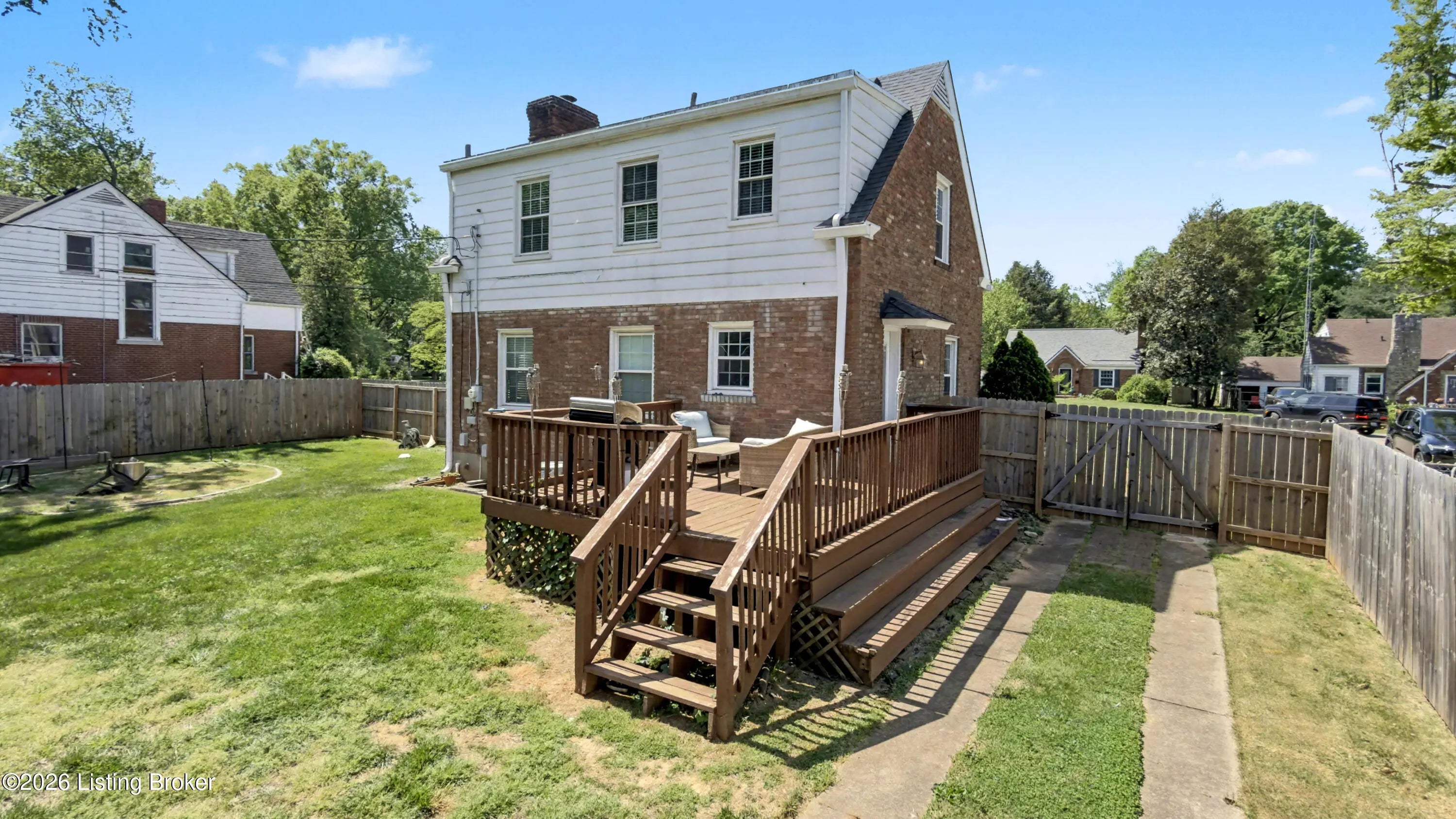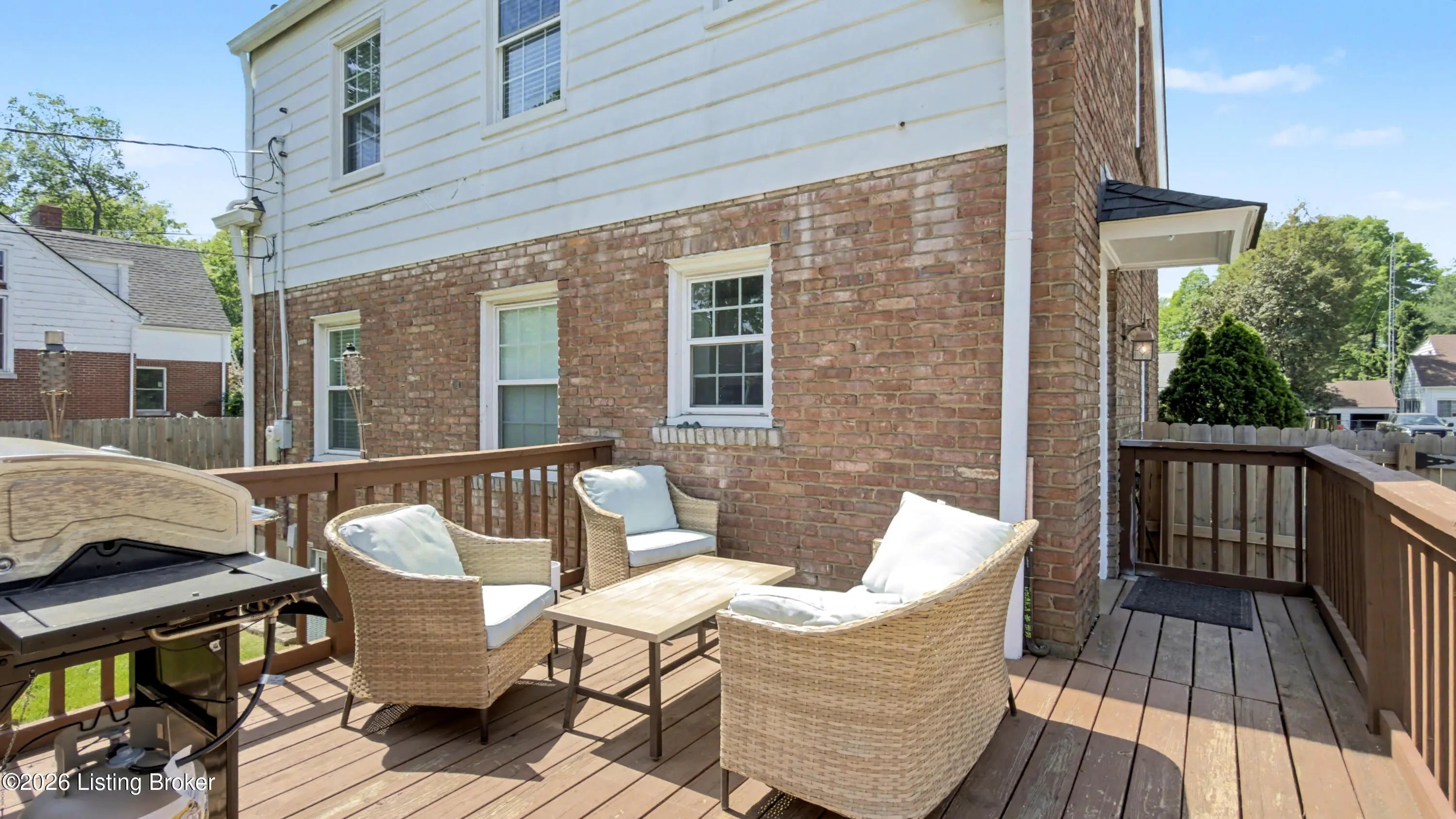 All-Brick Cape Cod on a Dead-End Street in Avondale Tucked into the Avondale pocket of Hikes Point, this all-brick Cape Cod sits back from a quiet dead-end street on one of the section's larger homesites. The curb appeal is the real thing: classic dormers, a brick chimney, mature landscaping, and a red front door that tells you exactly what kind of home this is. Inside, the living room anchors on an original white mantel with a marble-tiled firebox and herringbone hearth, flanked by windows that pull light across the hardwood floors. The remodeled kitchen is the showpiece: white shaker cabinetry, granite counters, a gray subway tile backsplash, stainless appliances including a Samsung French-door refrigerator, and a rear door that opens straight to the deck. The dining room sits just off the kitchen with its original hardwoods intact. Upstairs, two bedrooms stretch the full length of the home under dormered ceilings, both with hardwood floors and ceiling fans. The second-floor full bath preserves its period black-and-white tile, a detail you cannot reproduce. The finished basement adds real square footage: a rec room with a shiplap accent wall and barn door, a built-in wet bar with a wine fridge, plus a half bath. Out back, the grilling deck overlooks a yard enclosed by a new $25,000 privacy fence. A one-car detached garage adds covered parking and storage. Recent mechanicals are handled: furnace installed February 2026.