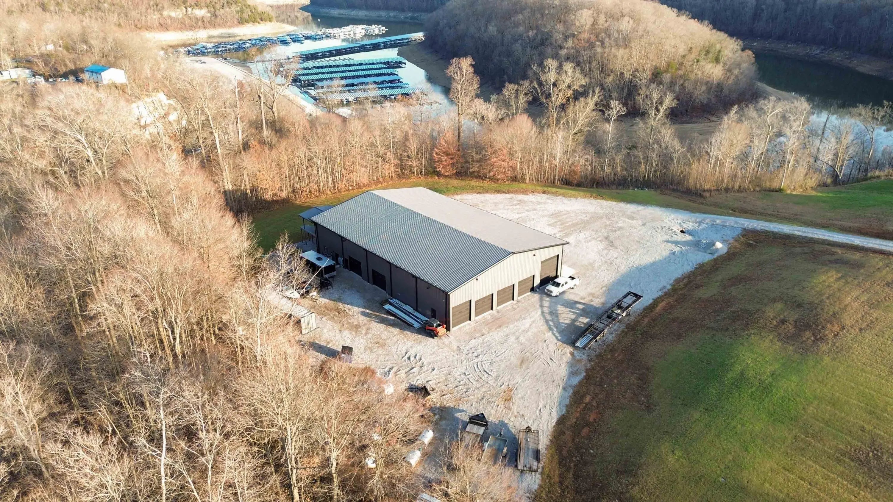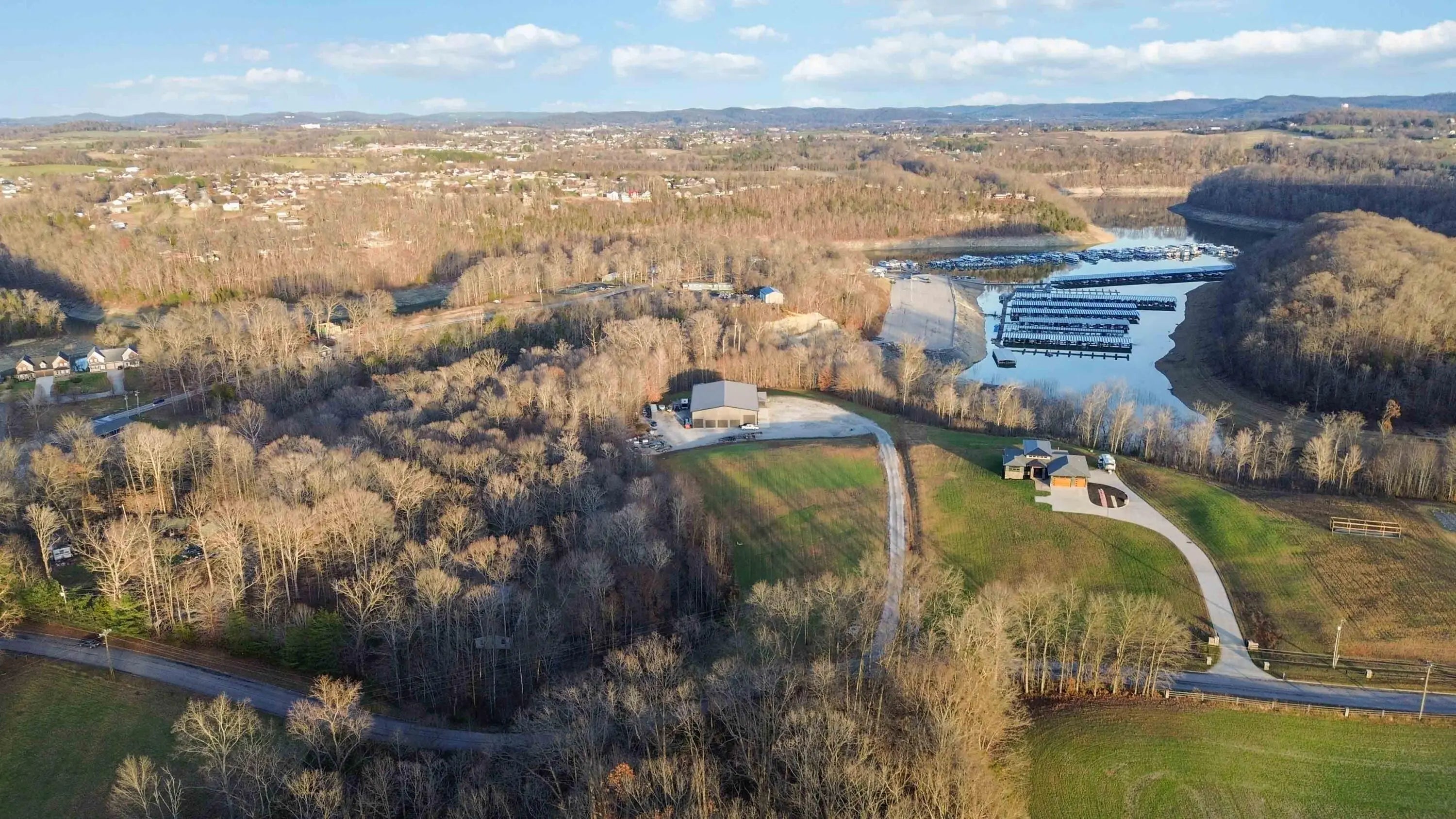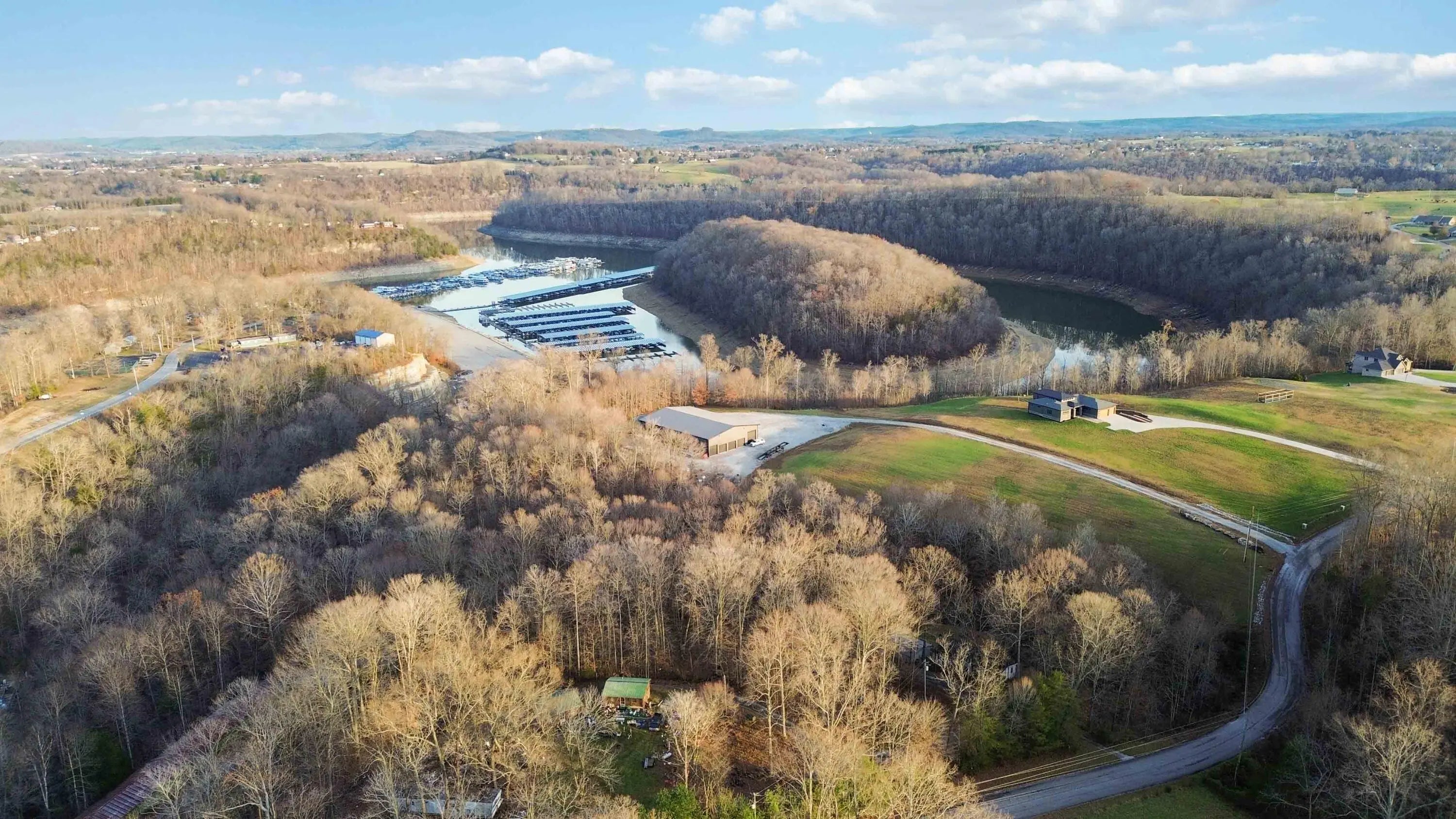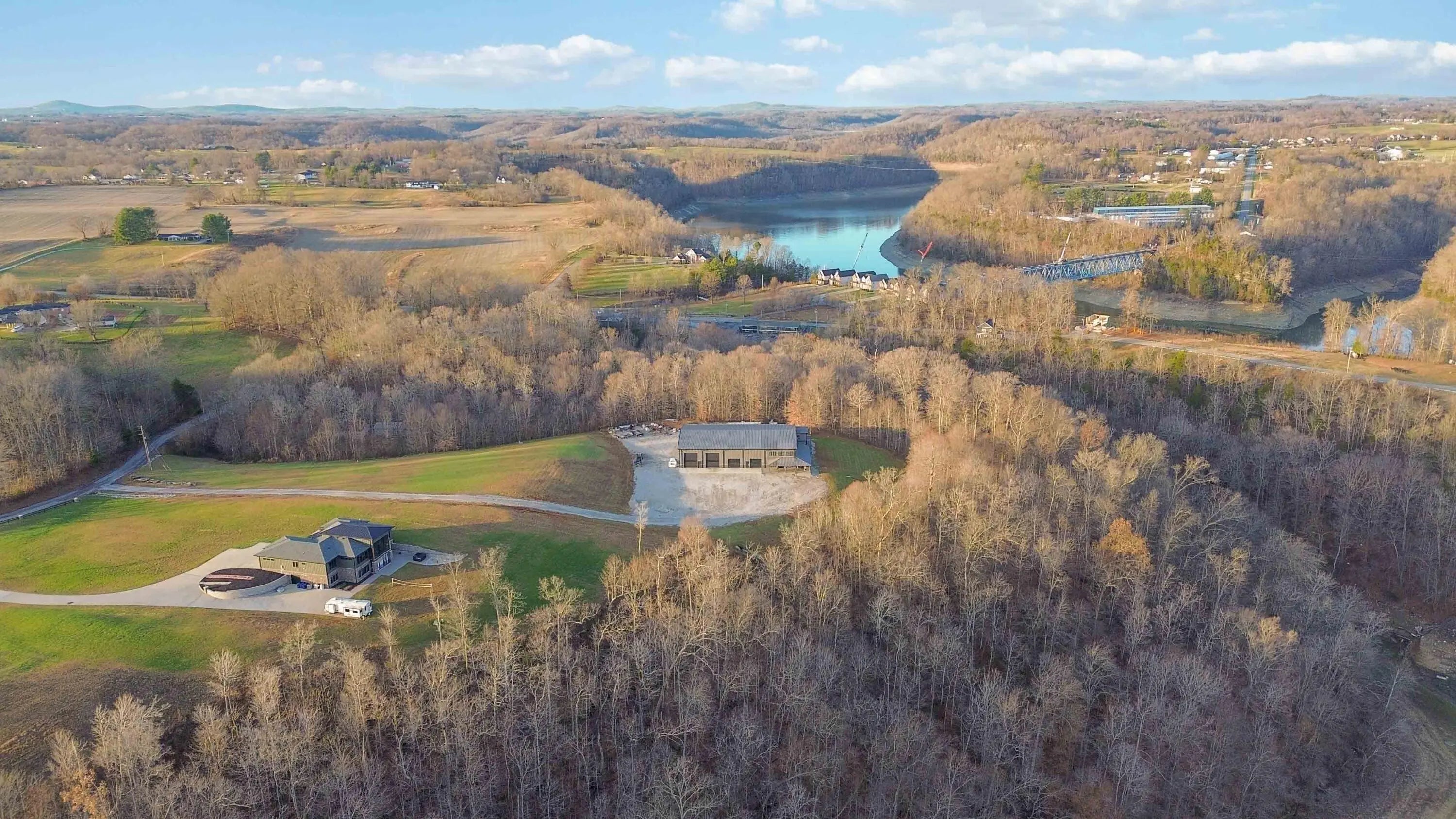 Escape to paradise, with this stunning barn dominium on 5+ serene acres. Surrounded by a creek on one side & convenience to Lake Cumberland on the other. Built in 2020, this 4bed, 3.5bath home features 22ft ceilings upon entry, imported marble floors throughout, a grand stone fireplace, dream kitchen with solid marble countertops, custom cabinetry, double oven, hideaway fridge, & induction cooktop. The app-controlled surround stereo system fills the home with your favorite music. Upstairs offers 9 ft ceilings & heated floors. The massive primary suite open to a 20x30 composite deck, spa-like bath with double rain-tree showers, double vanities, a soaking tub, plus a massive walk-in closet with additional washer and dryer. The 7,000 sq ft garage is a masterpiece of its own, perfect for cars,boats and other recreational vehichicles with 11 garage door for easy access. It's also insulated and heated with sealed concrete floors and custom shelving. Convenient golf cart access to Lee's Ford Marina offers a perfect day on the lake. This property is designed for those who appreciate luxury, functionality, lots of wildlife in a tranquill setting. Additional lots available for purchase