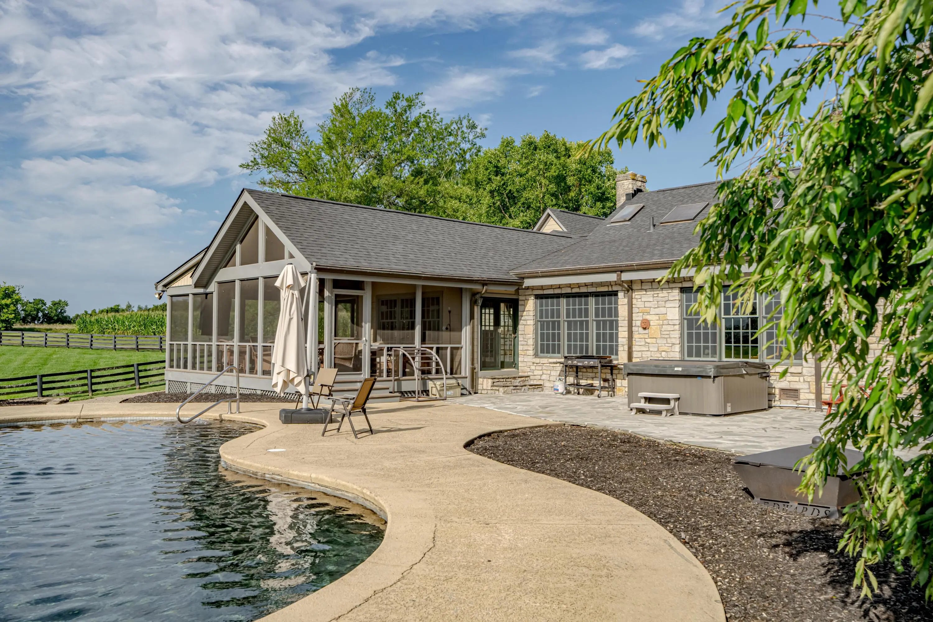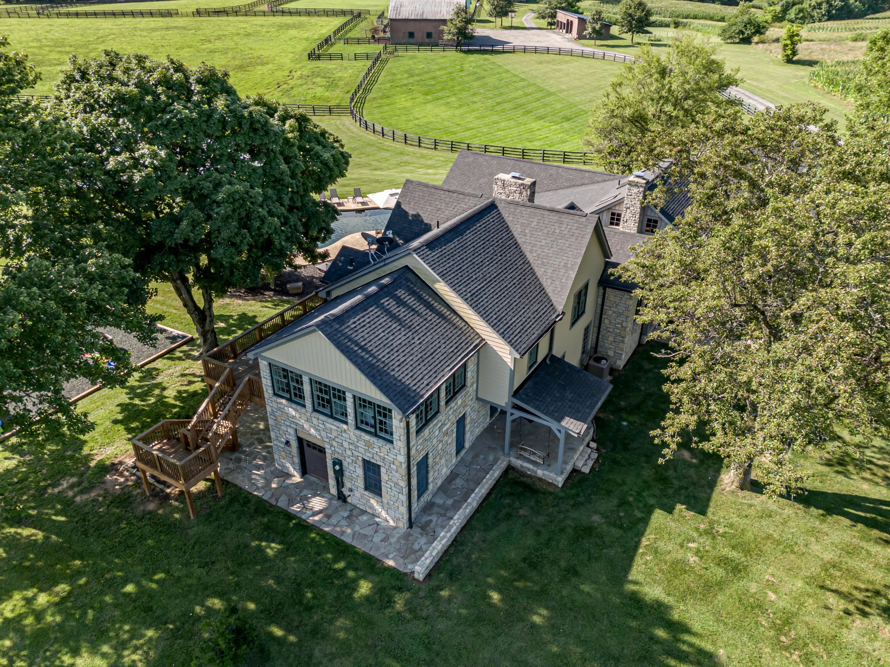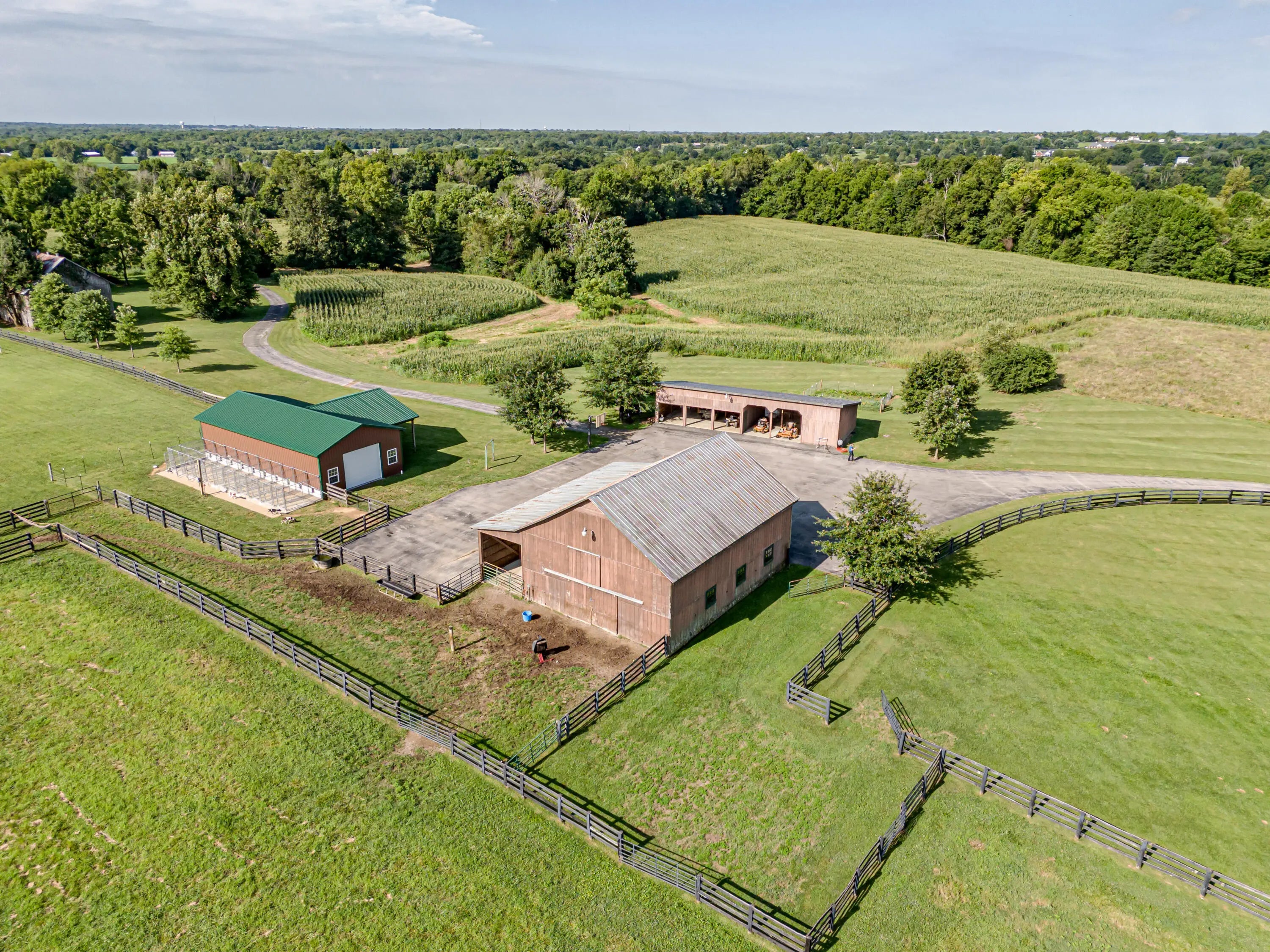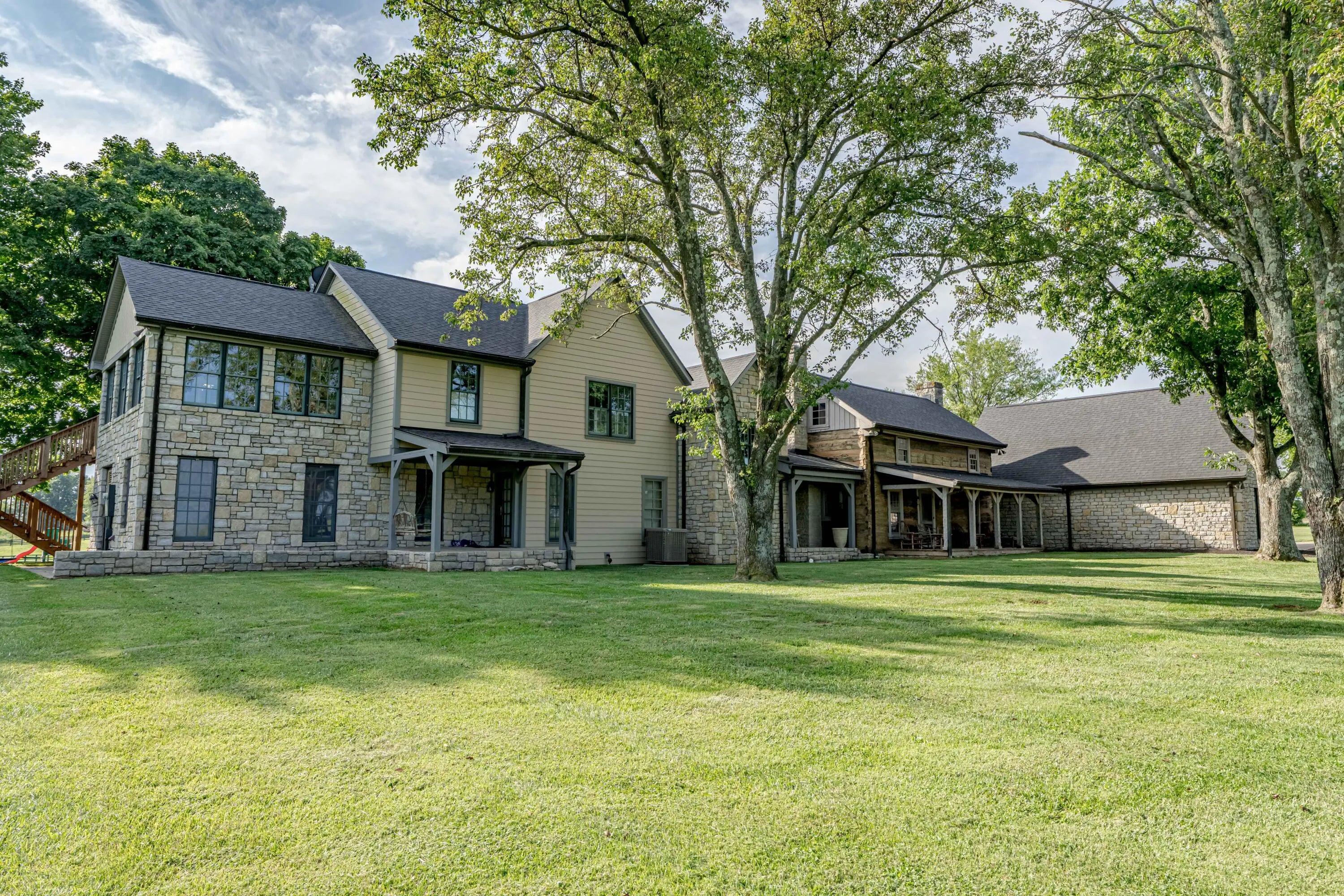 Cabin Chase Farm. One of the well known farms in Shelby County. This property is absolutely stunning, from the long paved driveway back to the 1800's log cabin and the addition around that history with 5 bedrooms and 7 baths. The open floor plan has large vaulted ceilings, a kitchen straight out of a magazine, large windows that look out onto the farm, the inground pool and lake. A first level enclosed patio area is perfect for relaxing with the family after a swim. The primary suite is huge with walk in closet most people dream of and walk in shower in the primary bath. Large bedrooms upstairs and another sunroom office area that over looks the farm. Horse barn with 7 stalls, paddocks and 6 car garage. All on 60 +/- acres. Even an elevator if you don't like the steps . WOW