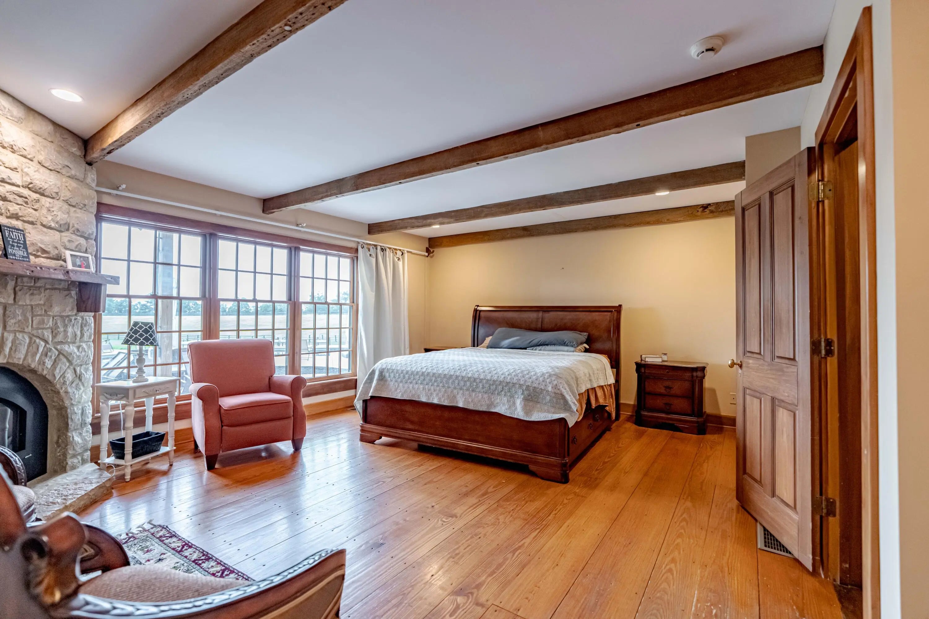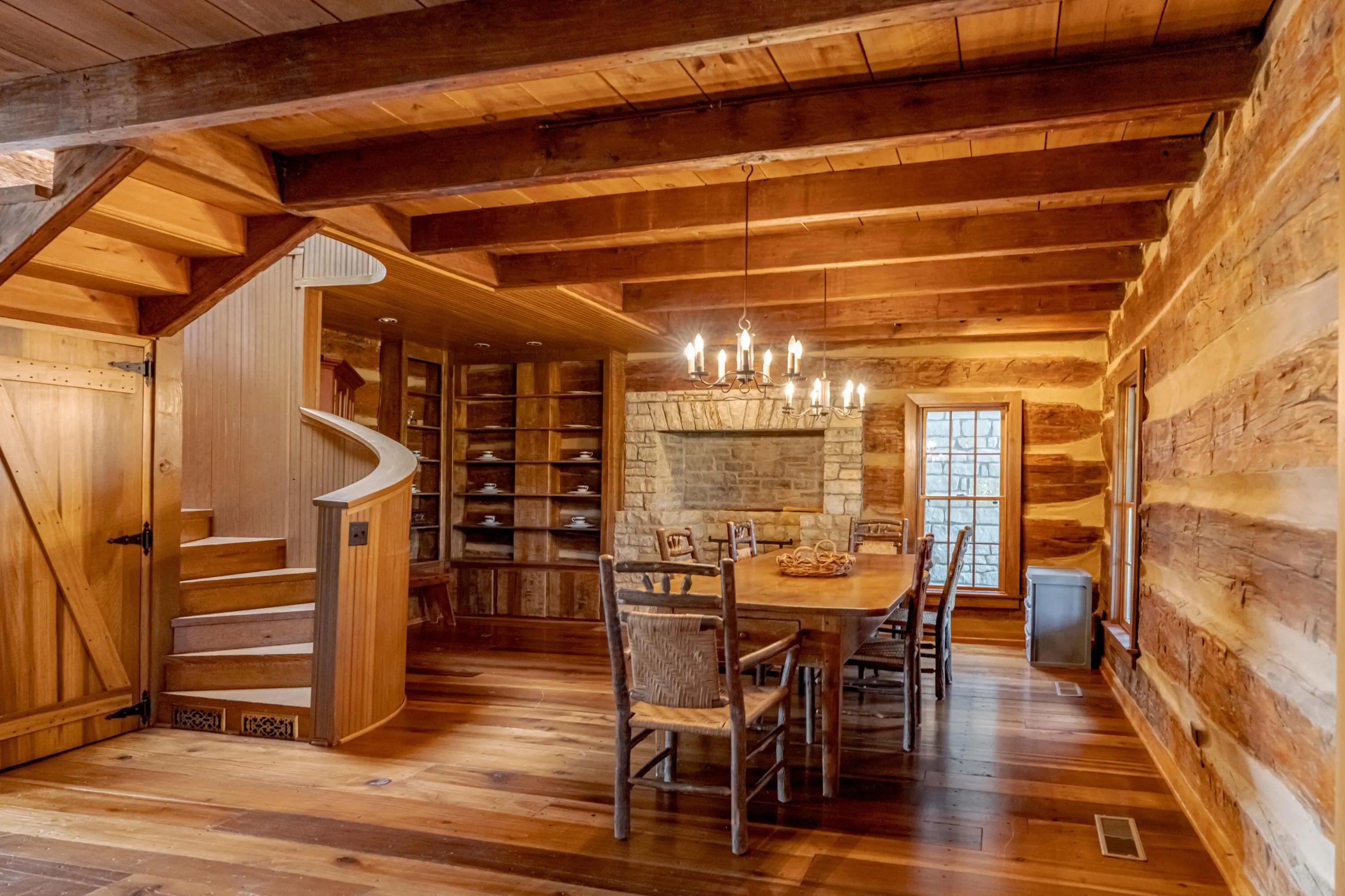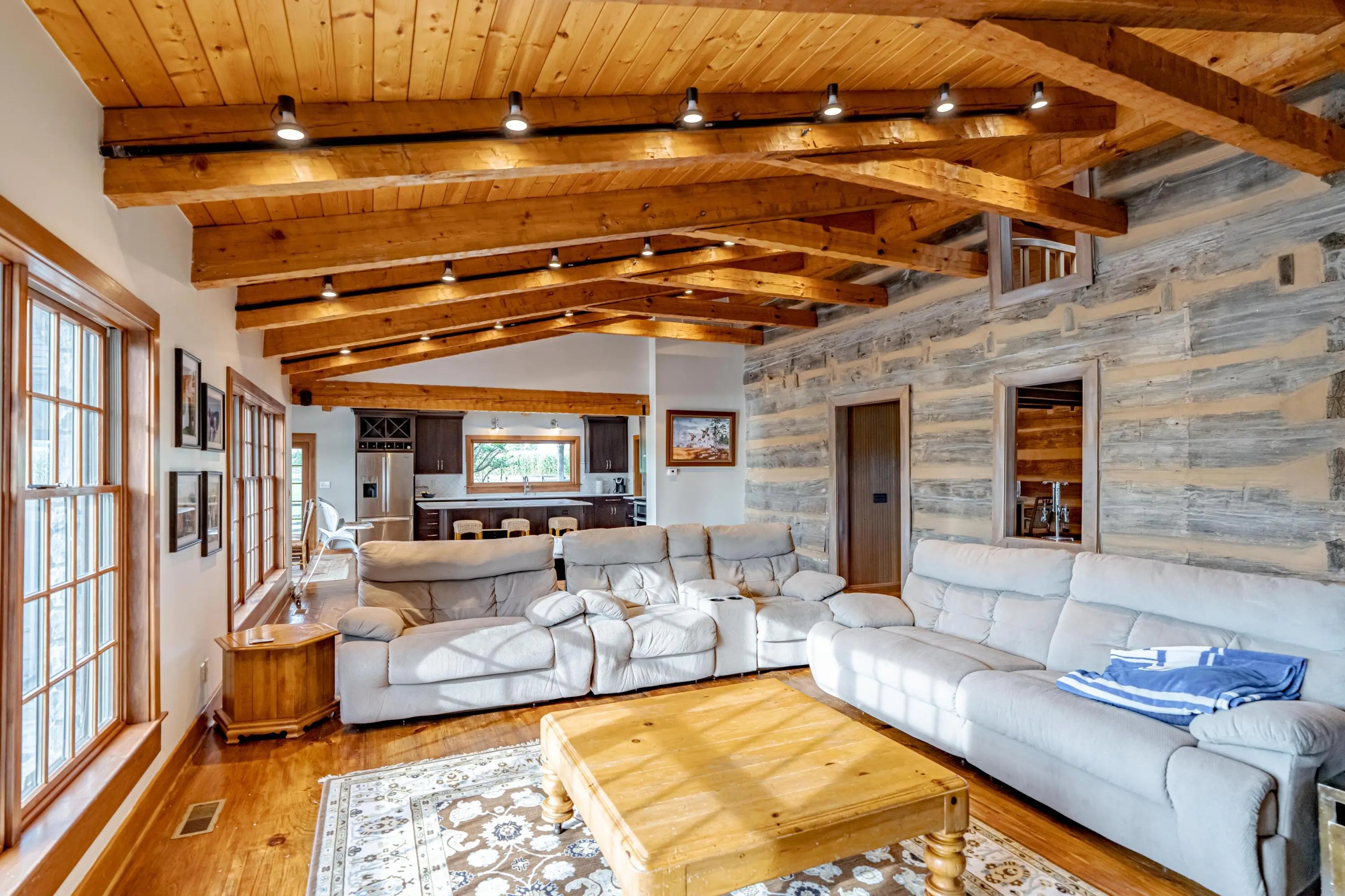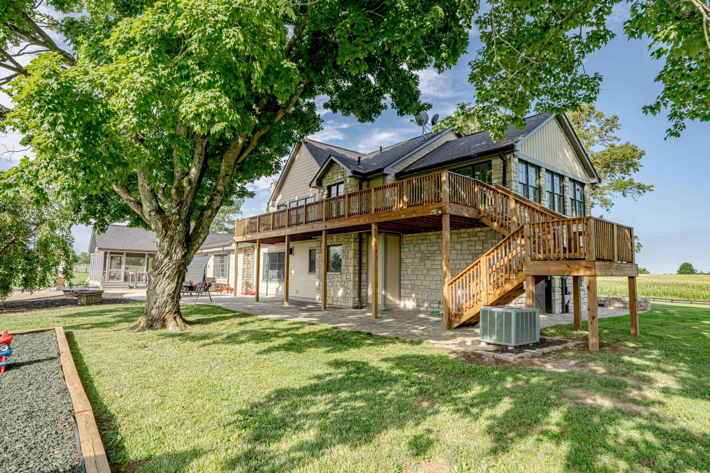 Cabin Chase Farm. One of the well known farms in Shelby County. This property is absolutely stunning, from the long paved driveway back to the 1800's log cabin and the addition around that history with 5 bedrooms and 7 baths. The open floor plan has large vaulted ceilings, a kitchen straight out of a magazine, large windows that look out onto the farm, the inground pool and lake. A first level enclosed patio area is perfect for relaxing with the family after a swim. The primary suite is huge with walk in closet most people dream of and walk in shower in the primary bath. Large bedrooms upstairs and another sunroom office area that over looks the farm. Horse barn with 7 stalls, paddocks and 6 car garage. All on 60 +/- acres. Even an elevator if you don't like the steps . WOW