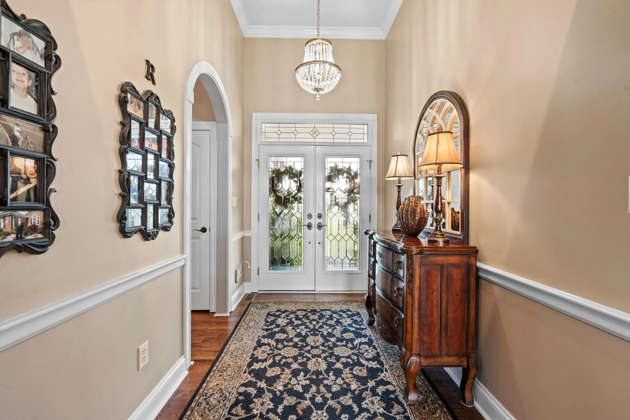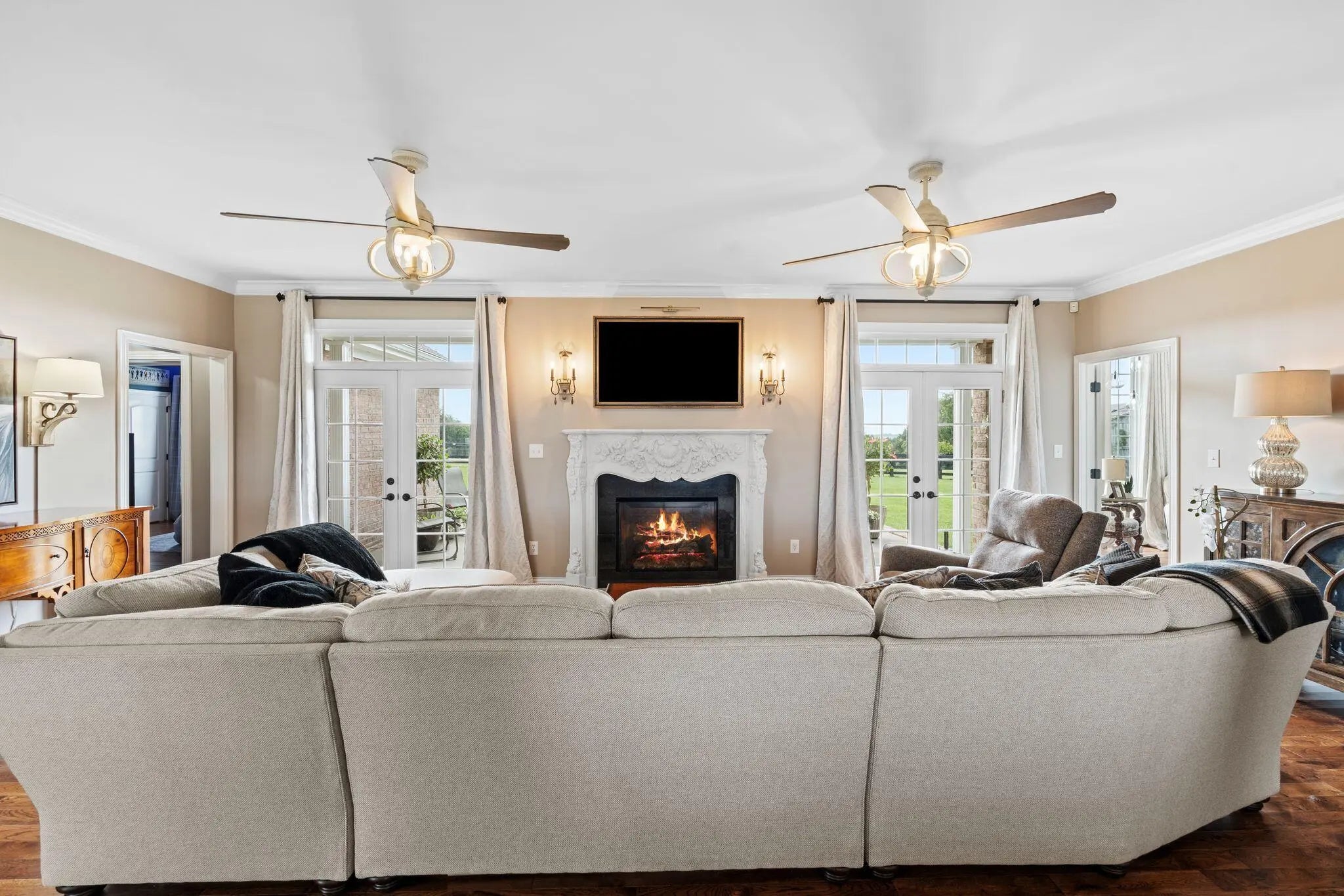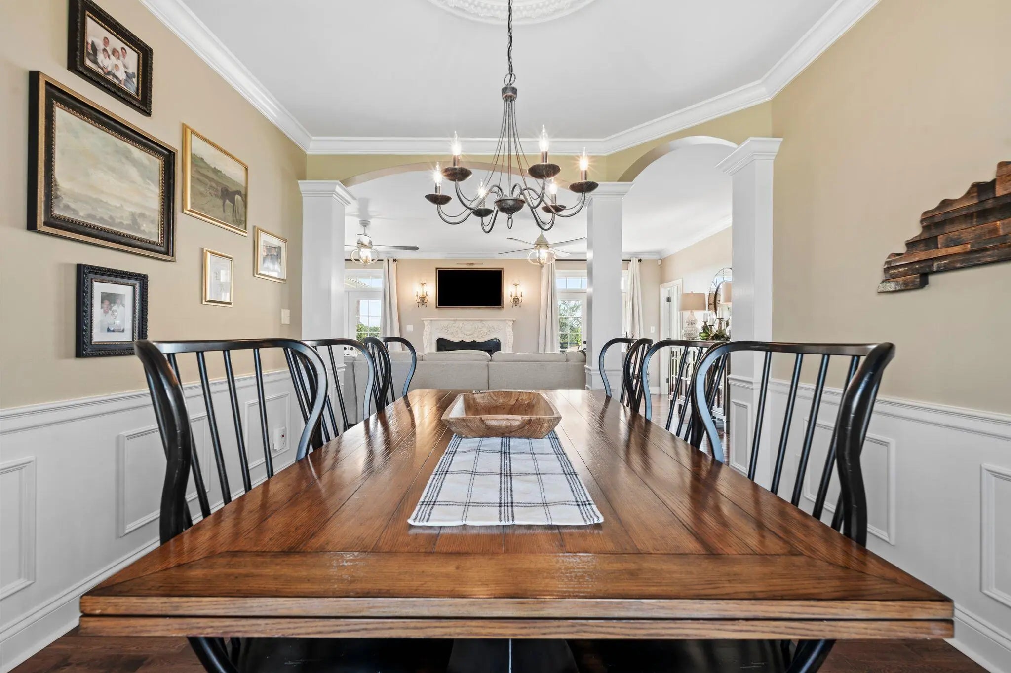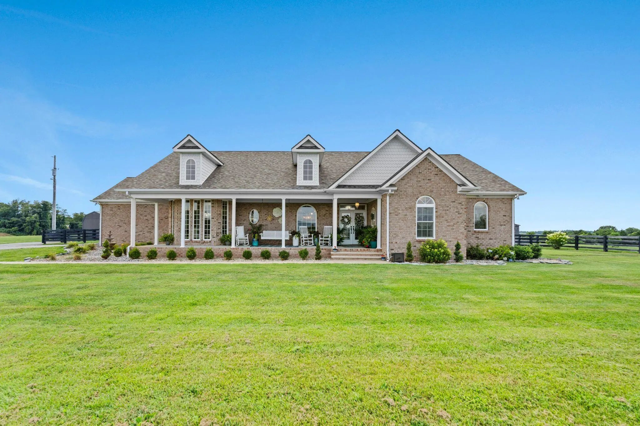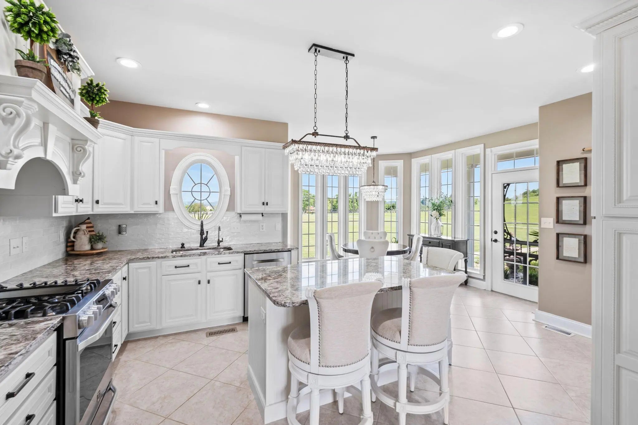 Experience refined country living in this elegant 3-bedroom, 3-bath ranch nestled in peaceful surroundings just minutes from town. The gourmet kitchen boasts granite countertops, a large island, tile backsplash and flooring, stainless steel appliances, a gas range, and abundant cabinetry. Enjoy morning coffee in the sunlit breakfast nook with direct access to the covered back porch. The spacious living room centers around a marble gas fireplace and opens seamlessly to the outdoors. A dedicated office/den with built-in cabinetry provides the perfect remote work space. Entertain in style in the formal dining room, complete with crown molding, wainscoting, and a ceiling medallion. The luxurious primary suite features a spa-inspired bath with double vanities, soaking tub, walk-in shower, and a generous walk-in closet. A secondary suite with its own private bath offers comfort for guests or multi-generational living. This home blends luxury and tranquility—your perfect country retreat.