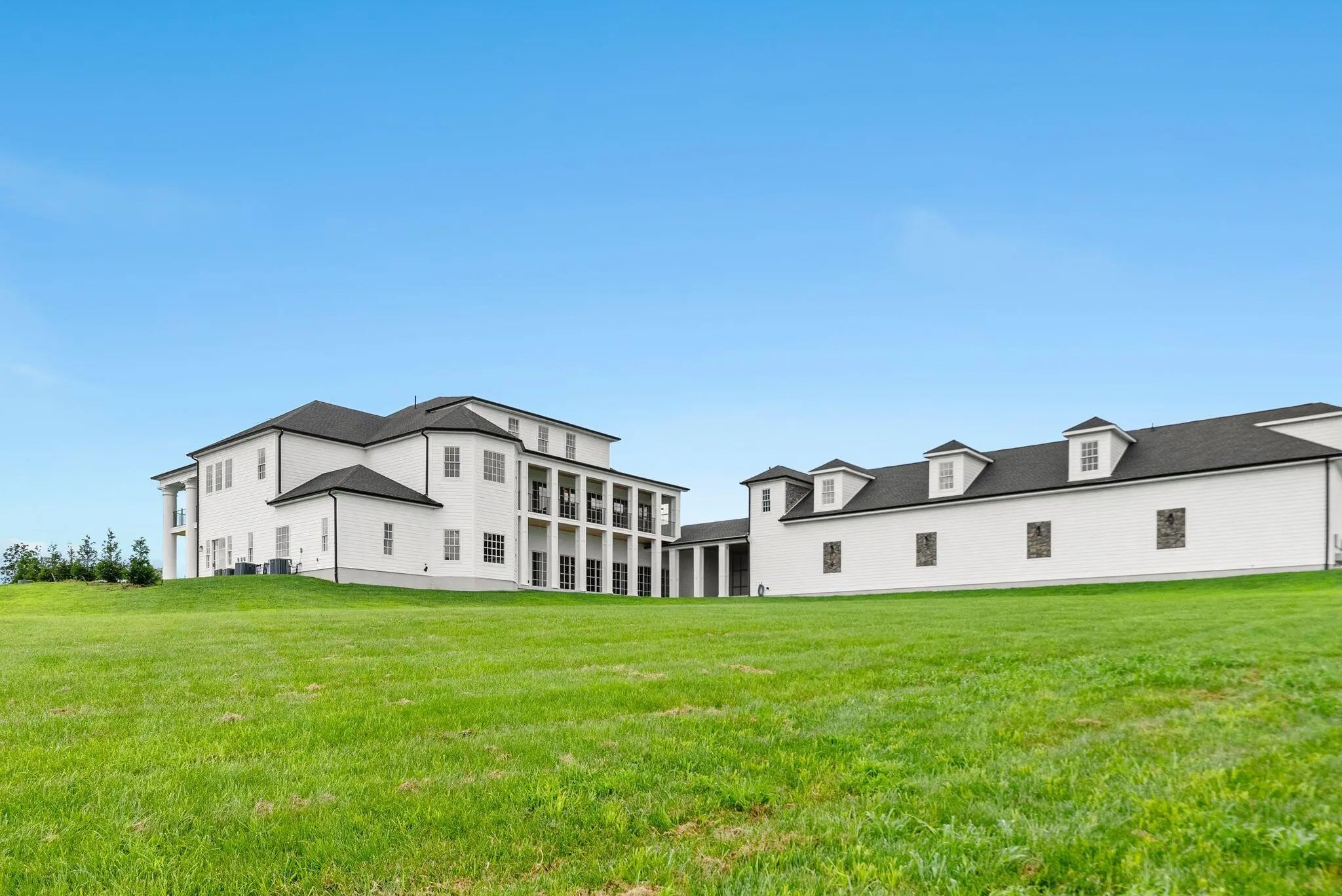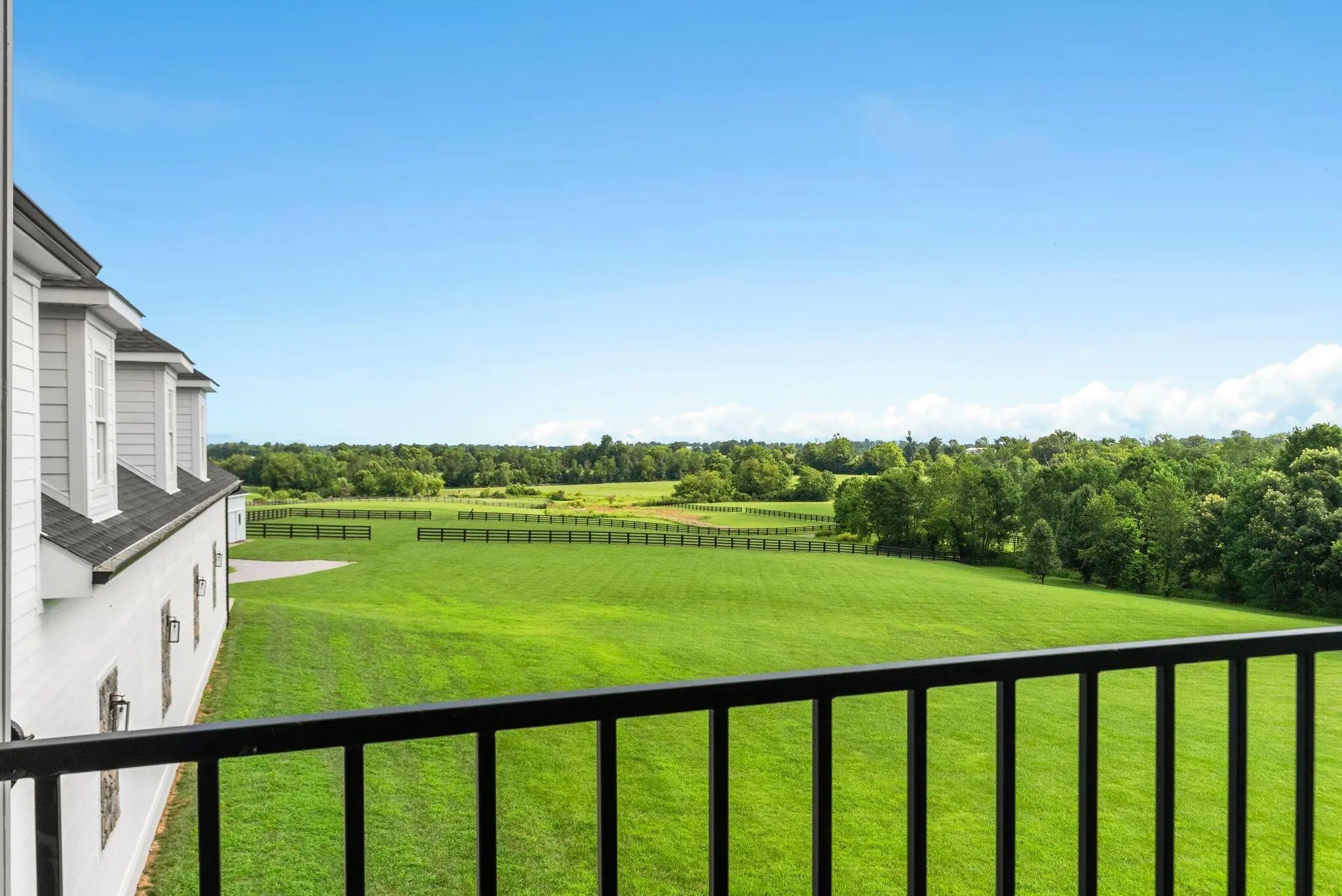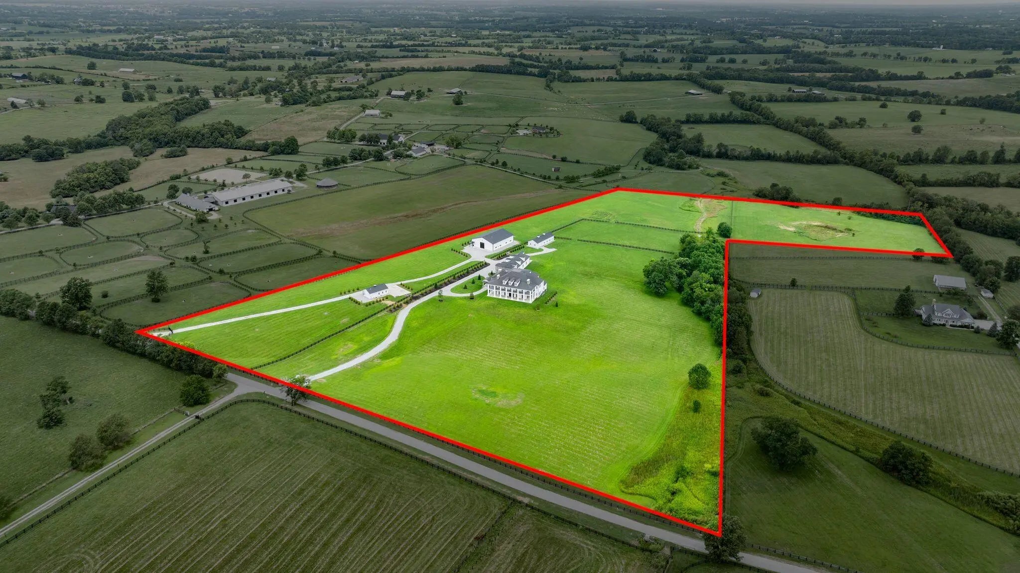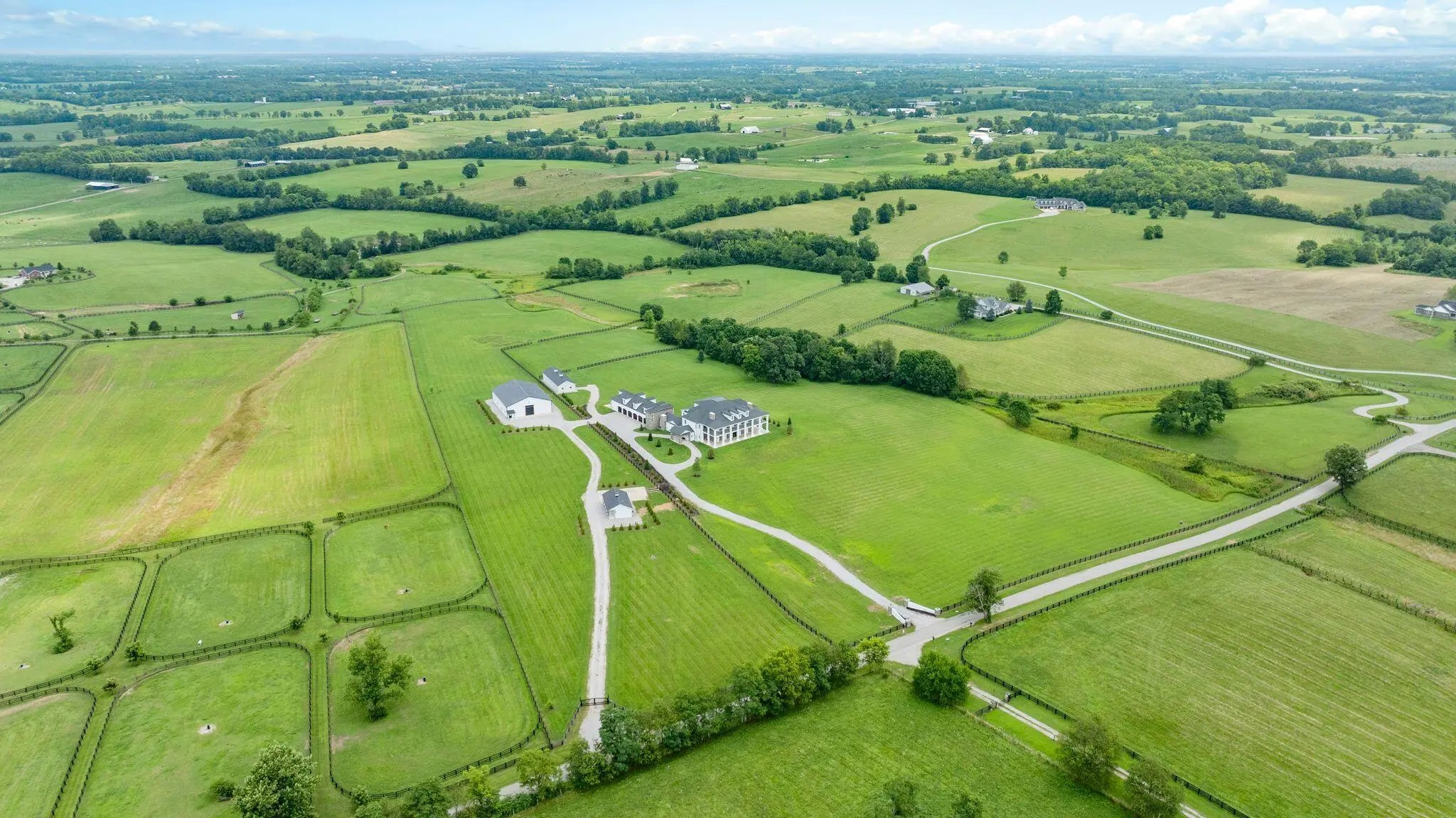 Experience the best of Kentucky living at La Vista Estate, a striking brand-new custom colonial set on over 27 rolling acres along the coveted Iron Works Road, in the heart of Bourbon County horse country. Designed to impress, this newly constructed home pairs timeless architectural details with modern amenities, all surrounded by panoramic views of the Bluegrass countryside. A floating spiral staircase under a domed ceiling welcomes you into a grand interior featuring wide plank French oak floors, soaring coffered ceilings, and extensive custom millwork. The chef's kitchen is outfitted with Wolf, Sub-Zero, and Cove appliances, Calcutta Izaro quartz countertops, a large island, and a spacious butler's pantry. Step outside to enjoy the covered outdoor kitchen with granite counters and a stacked stone fireplace, along with multiple verandas designed for relaxing and taking in the views. The main level also includes a stately study, formal dining room, grand great room with wet bar, expansive living room, laundry room, and four fireplaces. The main-level primary suite offers a spa-like ensuite bath, a makeup room, and dual walk-in closets. Upstairs, a second primary suite, four additional bedrooms, a spacious den (living room aka helm) with a fireplace, and four bathrooms provide generous space and flexibility. The third level features a truss-beamed theatre room, a bonus room, and a half bath. The home is elevator-ready with a built-in shaft in place and wired for a whole-house generator. Perched above the oversized garage, featuring six doors and space for up to 12 vehicles, the guest house includes two bedrooms, two full baths, a den, and a full kitchen. With over 950 feet of road frontage, the property also includes a 4-stall insulated barn with a tractor bay, a 60' x 80' barn with two 16' garage doors, a fully fenced perimeter, and a 673-square-foot tenant house with an RV hookup. Located just 15 minutes from Lexington, Paris, and Winchester, this estate offers high-speed internet, public water, and integrated Google Smart Home systems. EVADI Horse Farm borders the property and offers training and convenient boarding. An additional 150-acre tract, situated just two miles down the road, is also available for purchase.