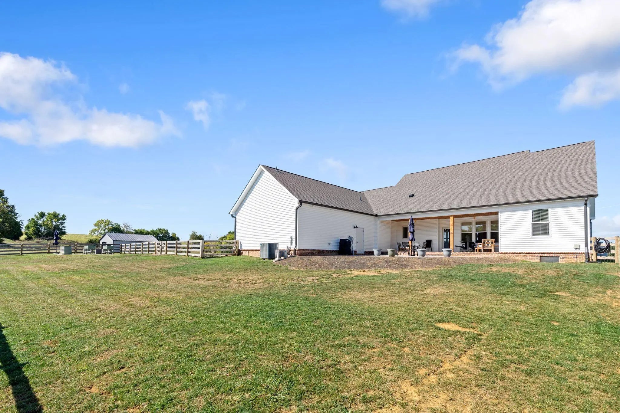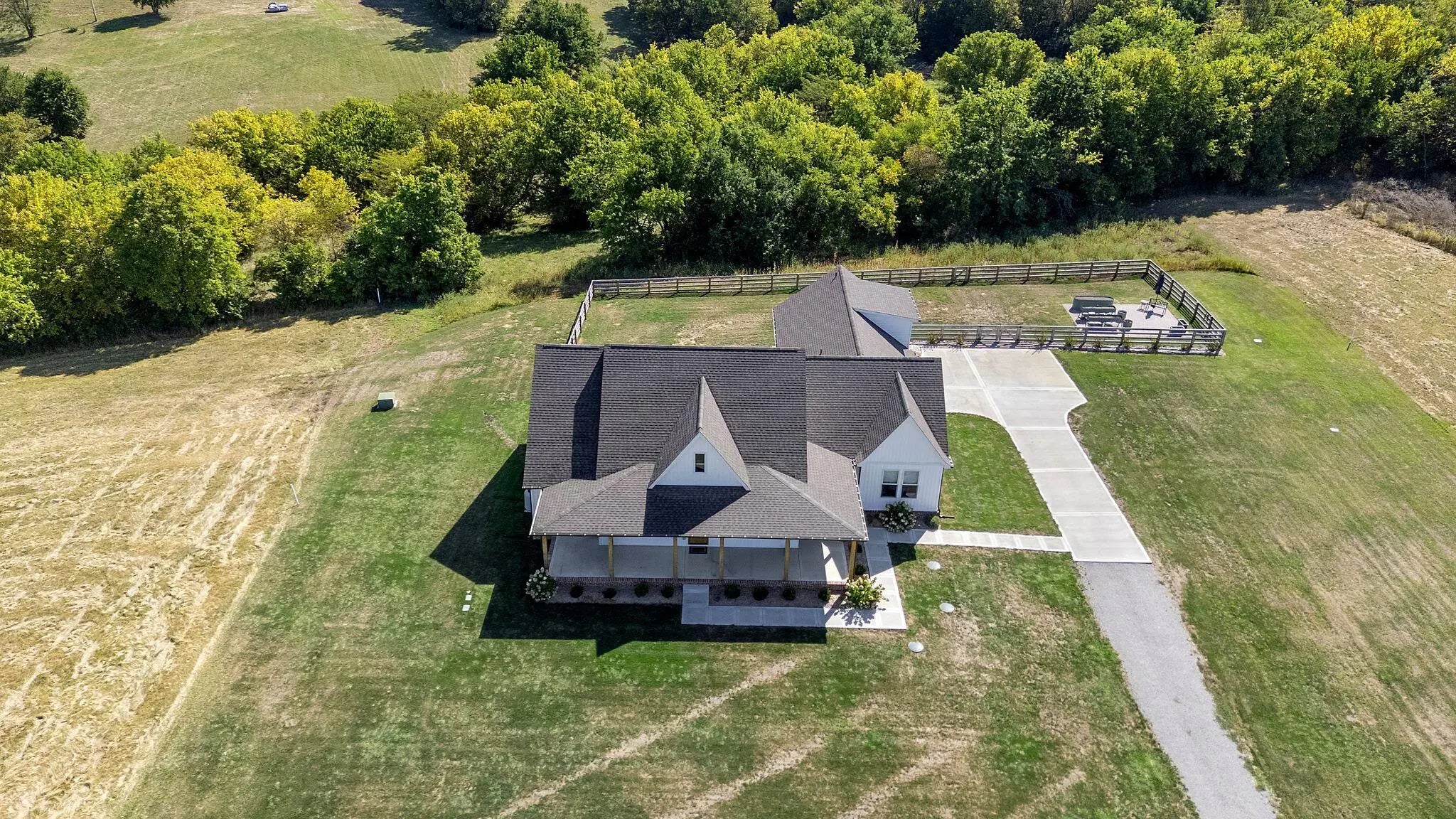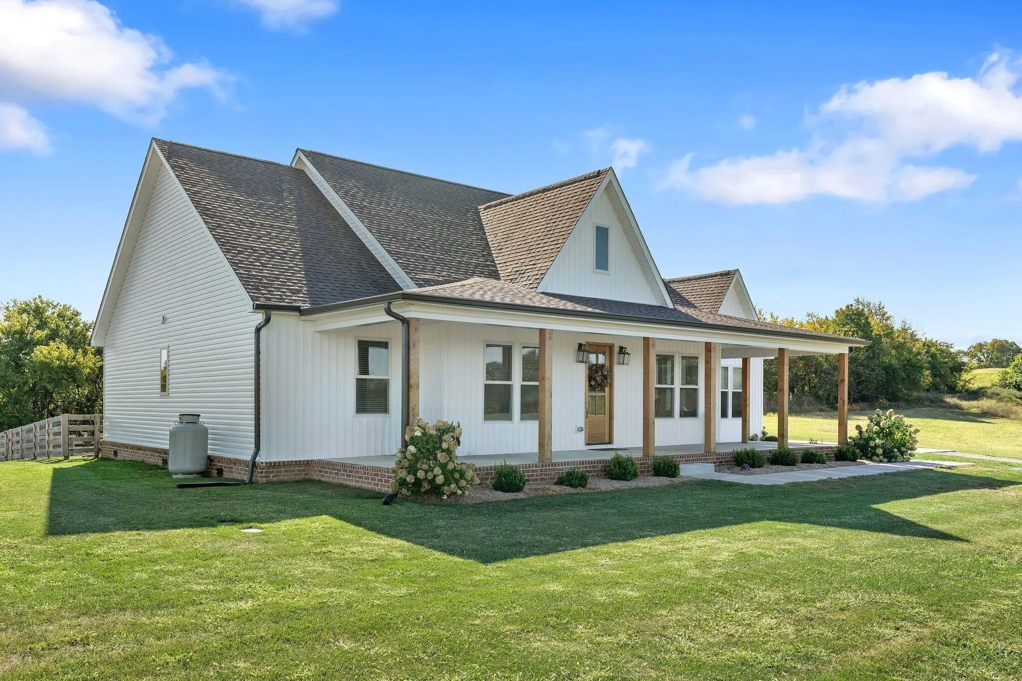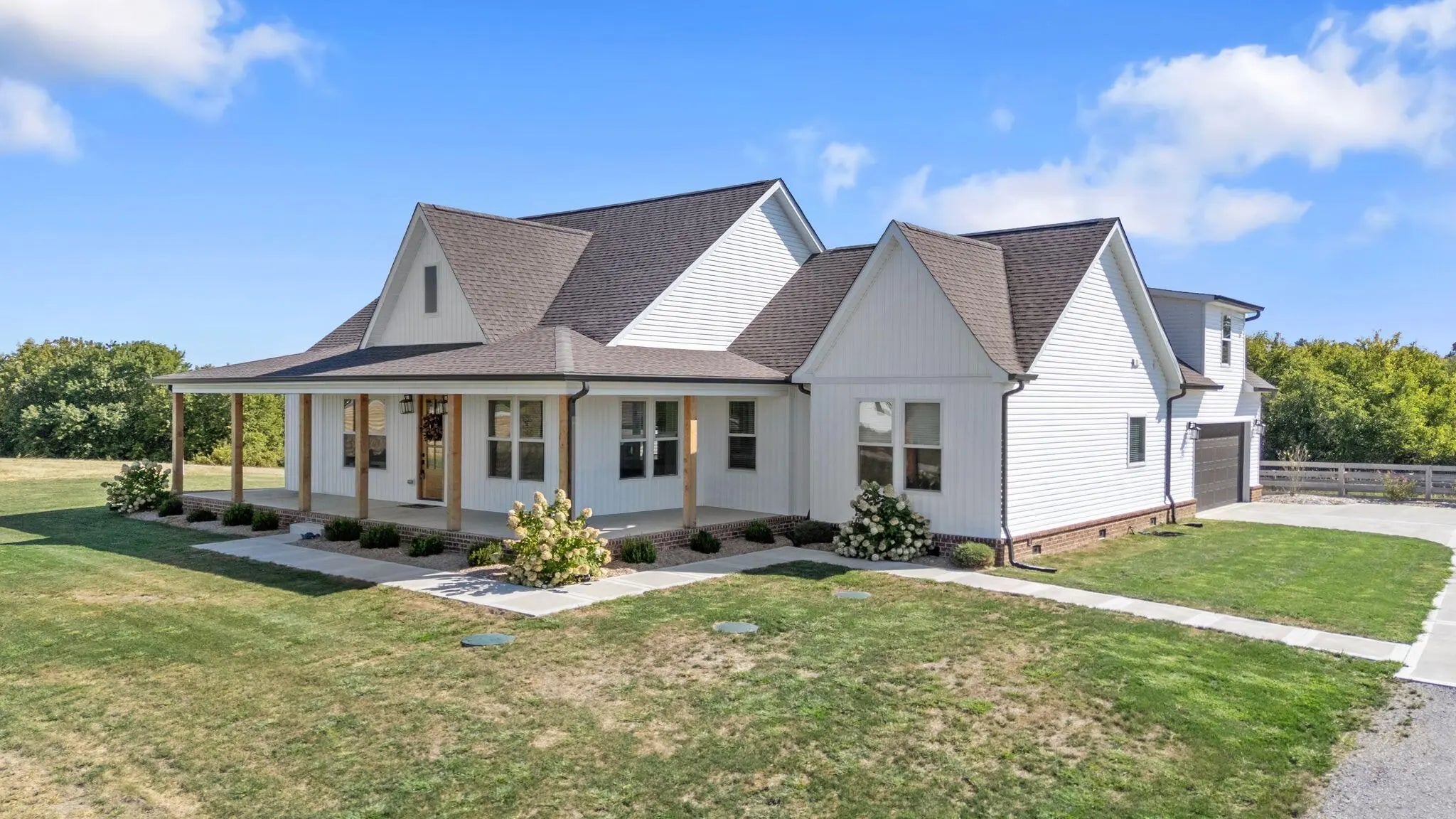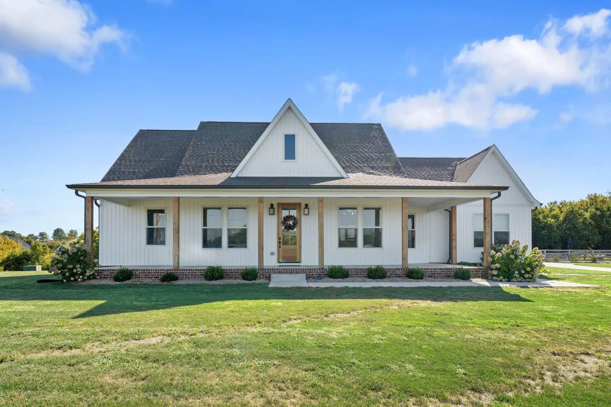 Built in 2023, this stunning modern farmhouse sits on just over 5 acres with new landscaping, horse plank fencing, and wildflowers that brighten the land each spring. A wrap-around covered front porch frames peaceful views of farmland and trees, offering a quiet retreat with timeless curb appeal. Step inside to the great room, where detailed ceilings, an impressive ventless gas fireplace, and custom built-ins create a welcoming centerpiece for the home. The open floor plan flows seamlessly into the gourmet kitchen, featuring custom wood cabinetry, quartz countertops, a tiled backsplash, a huge island, and a spacious dining area. A gas cooktop range with vent hood completes this chef's dream space. The first floor primary suite is a private haven with a luxurious ensuite bath offering spacious double vanities, a freestanding soaking tub, a large walk-in tile shower, and a massive walk-in closet with custom wood shelving. Two additional bedrooms, a full bath, a home office, and a hallway half bath are also located on the main level. Upstairs, a fourth bedroom or flexible bonus room includes its own full ensuite bathroom. The HOA takes care of a tranquil community pond and pavilion. This home is the perfect blend of modern comfort and peaceful country living.