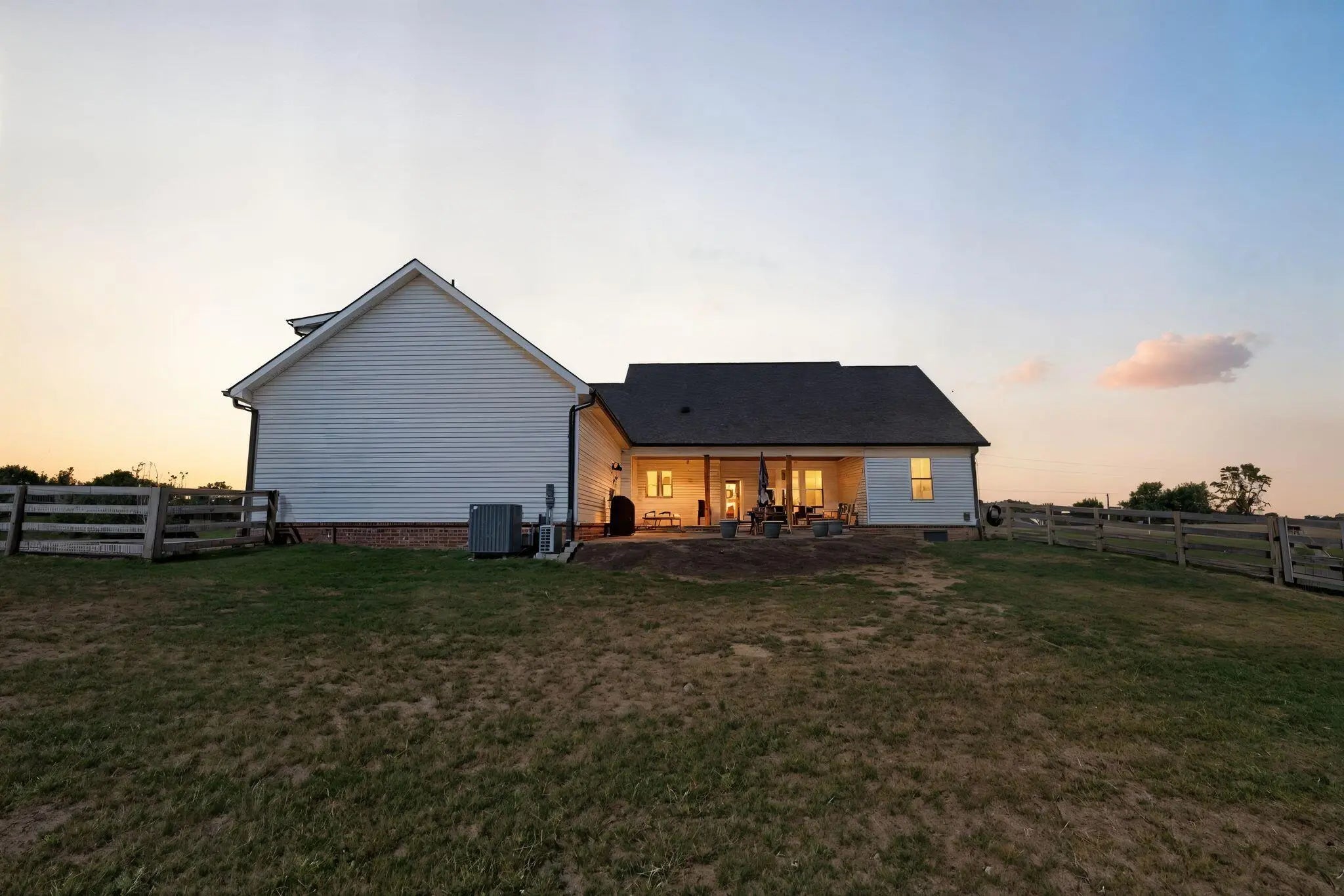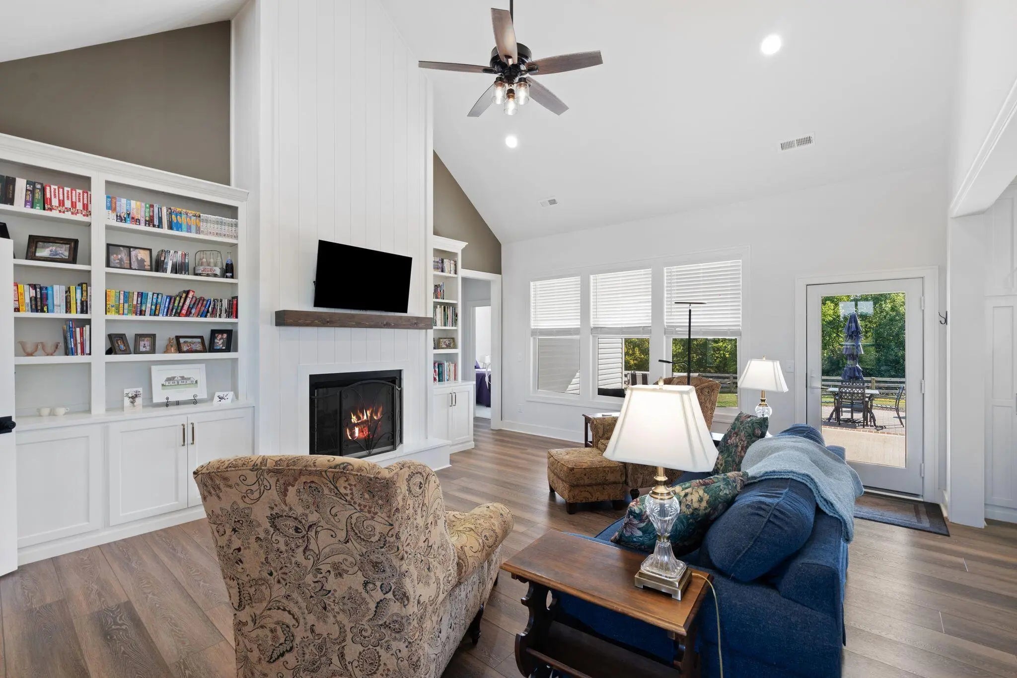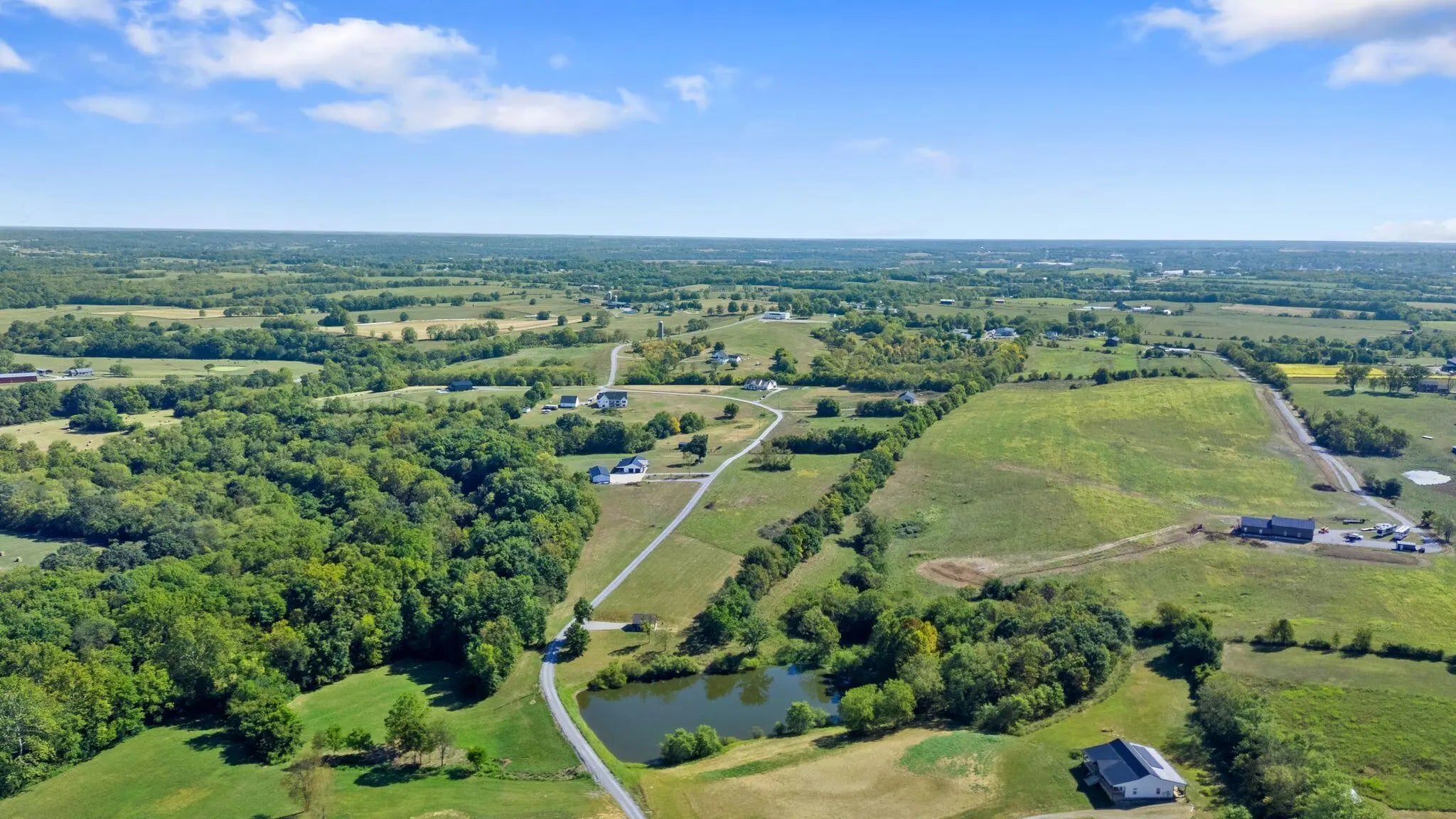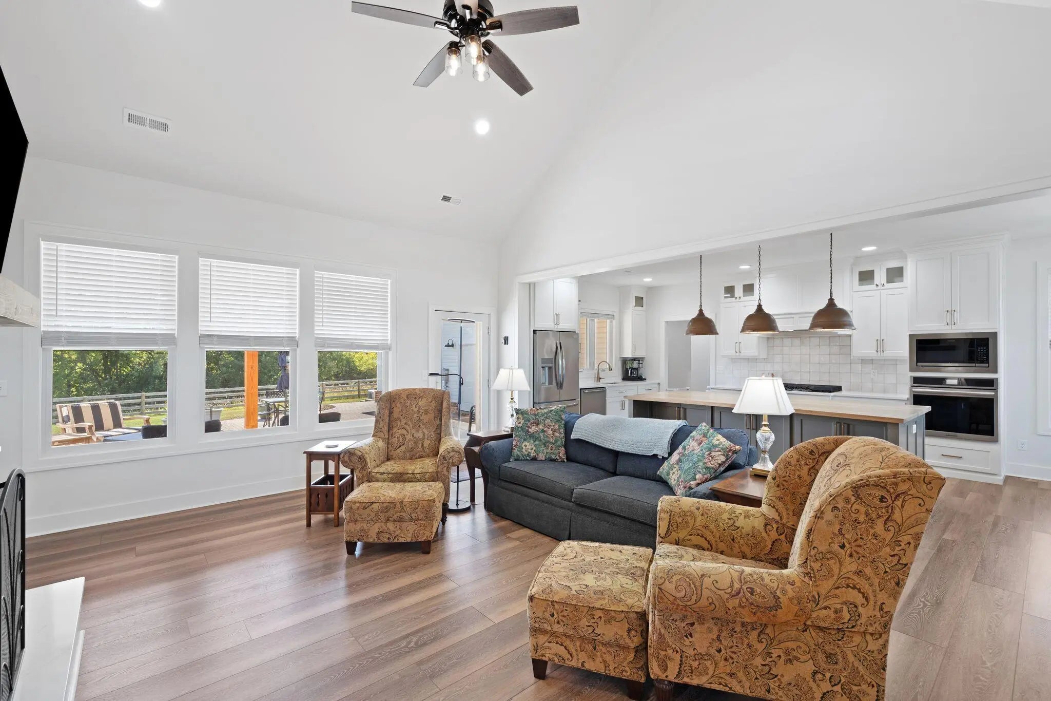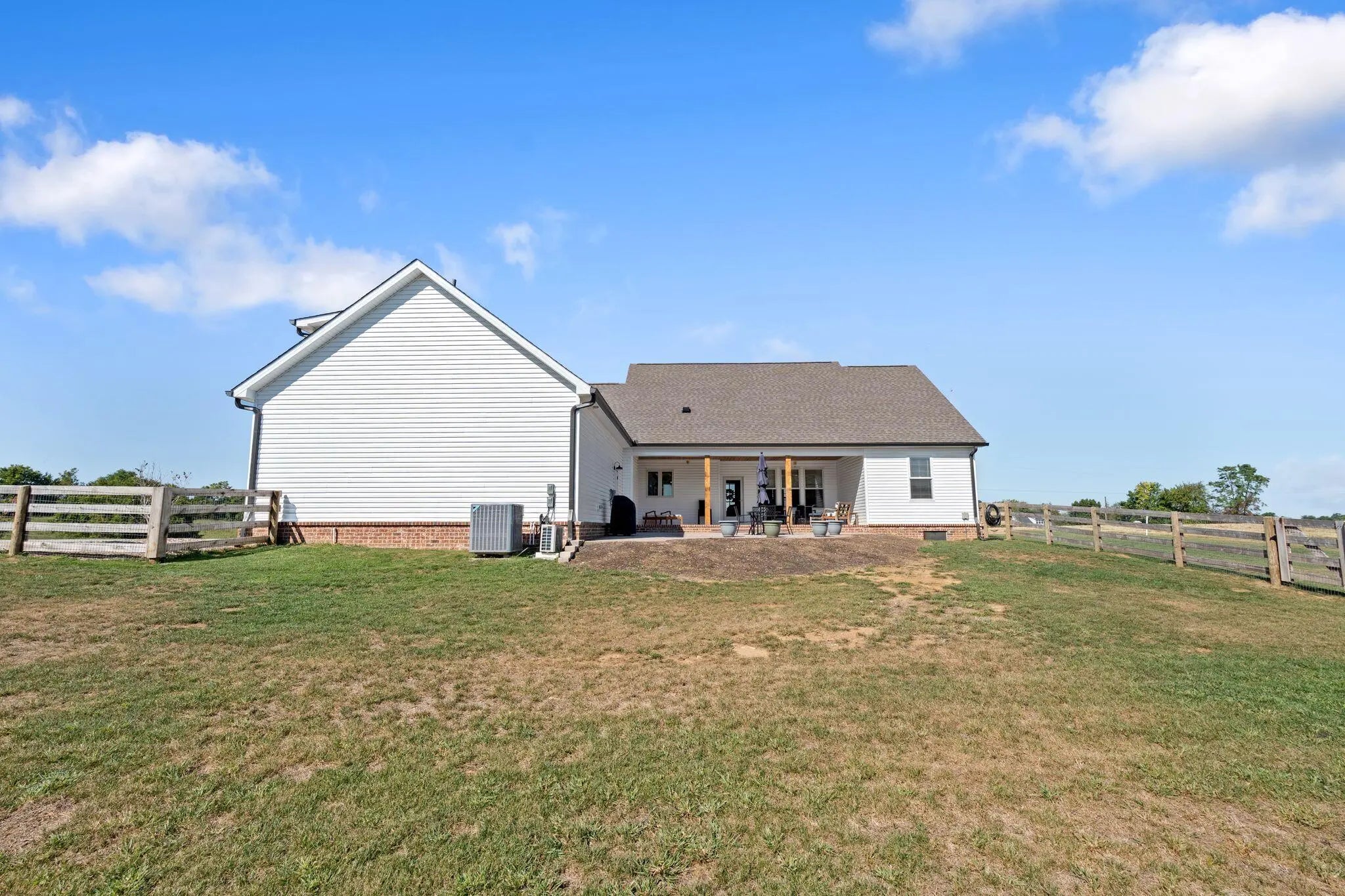 Built in 2023, this stunning modern farmhouse sits on just over 5 acres with new landscaping, horse plank fencing, and wildflowers that brighten the land each spring. A wrap-around covered front porch frames peaceful views of farmland and trees, offering a quiet retreat with timeless curb appeal. Step inside to the great room, where detailed ceilings, an impressive ventless gas fireplace, and custom built-ins create a welcoming centerpiece for the home. The open floor plan flows seamlessly into the gourmet kitchen, featuring custom wood cabinetry, quartz countertops, a tiled backsplash, a huge island, and a spacious dining area. A gas cooktop range with vent hood completes this chef's dream space. The first floor primary suite is a private haven with a luxurious ensuite bath offering spacious double vanities, a freestanding soaking tub, a large walk-in tile shower, and a massive walk-in closet with custom wood shelving. Two additional bedrooms, a full bath, a home office, and a hallway half bath are also located on the main level. Upstairs, a fourth bedroom or flexible bonus room includes its own full ensuite bathroom. The HOA takes care of a tranquil community pond and pavilion. This home is the perfect blend of modern comfort and peaceful country living.