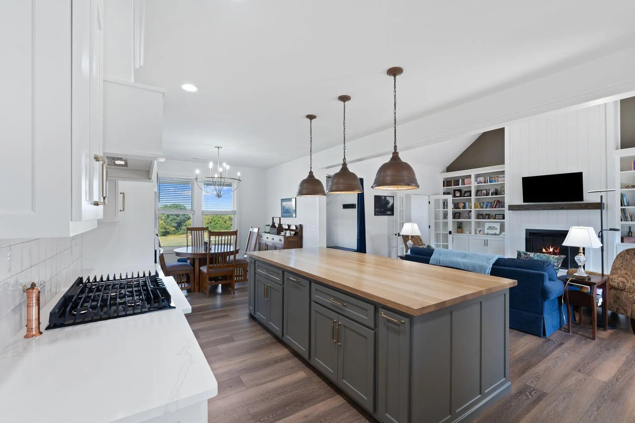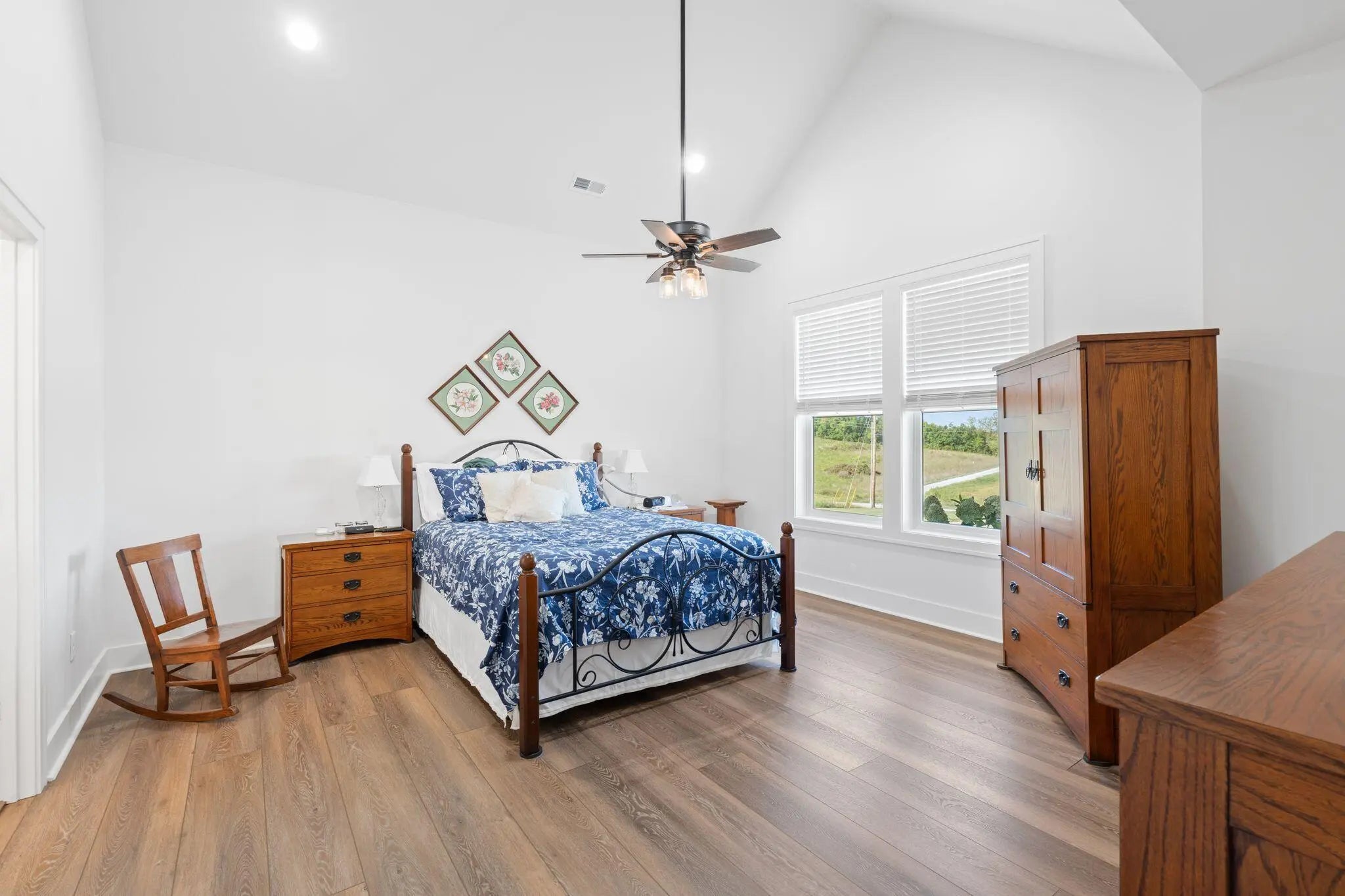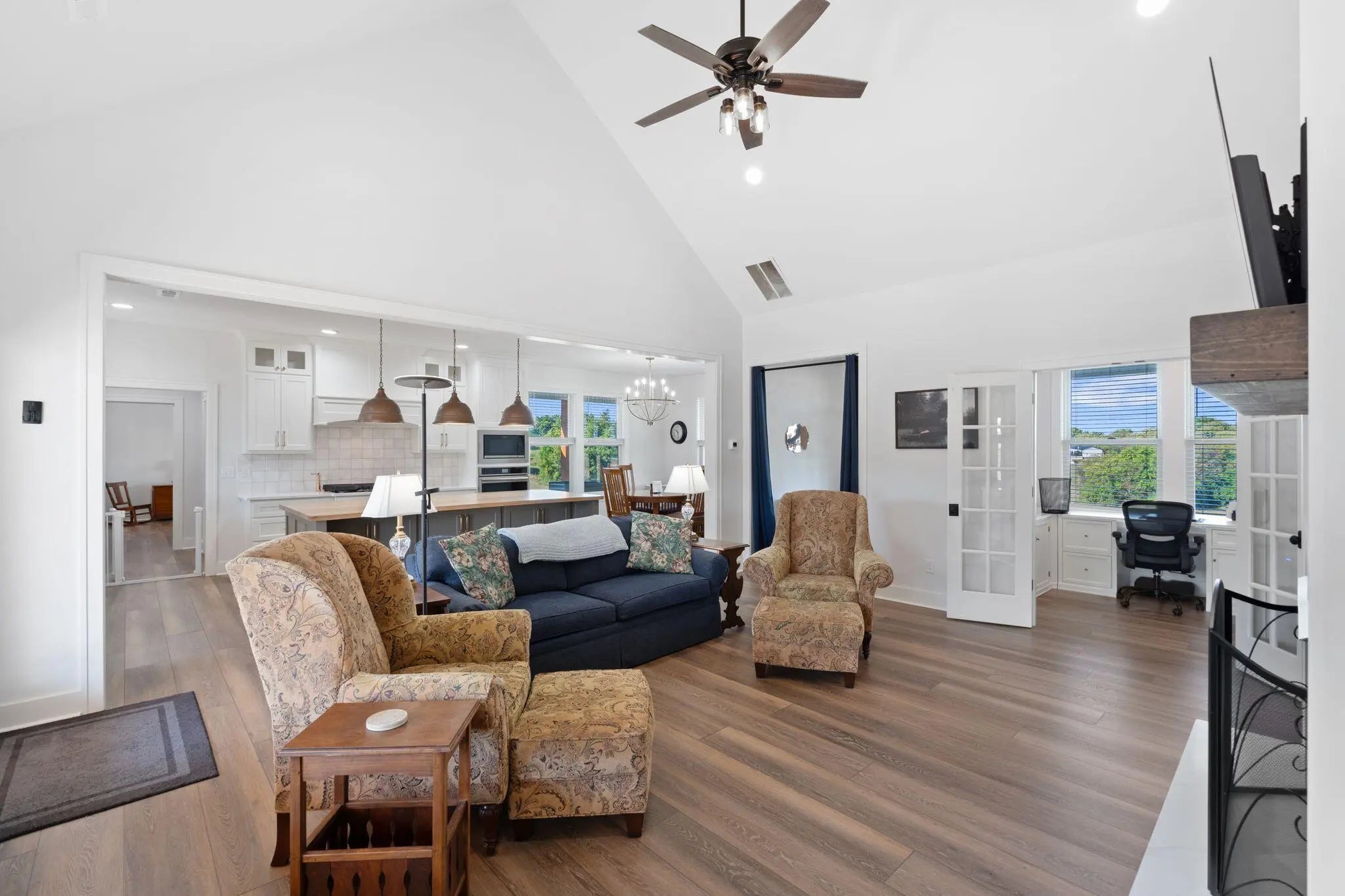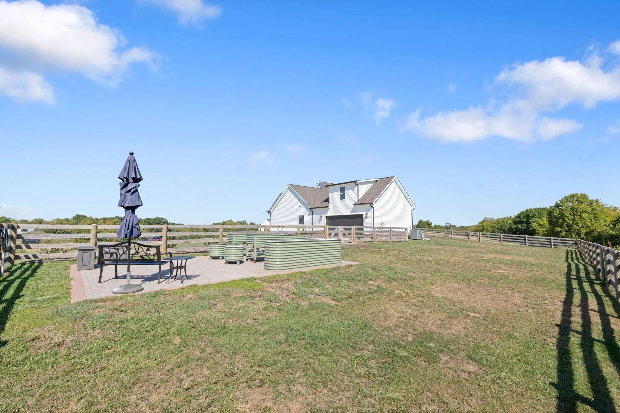 Built in 2023, this stunning modern farmhouse sits on just over 5 acres with new landscaping, horse plank fencing, and wildflowers that brighten the land each spring. A wrap-around covered front porch frames peaceful views of farmland and trees, offering a quiet retreat with timeless curb appeal. Step inside to the great room, where detailed ceilings, an impressive ventless gas fireplace, and custom built-ins create a welcoming centerpiece for the home. The open floor plan flows seamlessly into the gourmet kitchen, featuring custom wood cabinetry, quartz countertops, a tiled backsplash, a huge island, and a spacious dining area. A gas cooktop range with vent hood completes this chef's dream space. The first floor primary suite is a private haven with a luxurious ensuite bath offering spacious double vanities, a freestanding soaking tub, a large walk-in tile shower, and a massive walk-in closet with custom wood shelving. Two additional bedrooms, a full bath, a home office, and a hallway half bath are also located on the main level. Upstairs, a fourth bedroom or flexible bonus room includes its own full ensuite bathroom. The HOA takes care of a tranquil community pond and pavilion. This home is the perfect blend of modern comfort and peaceful country living.