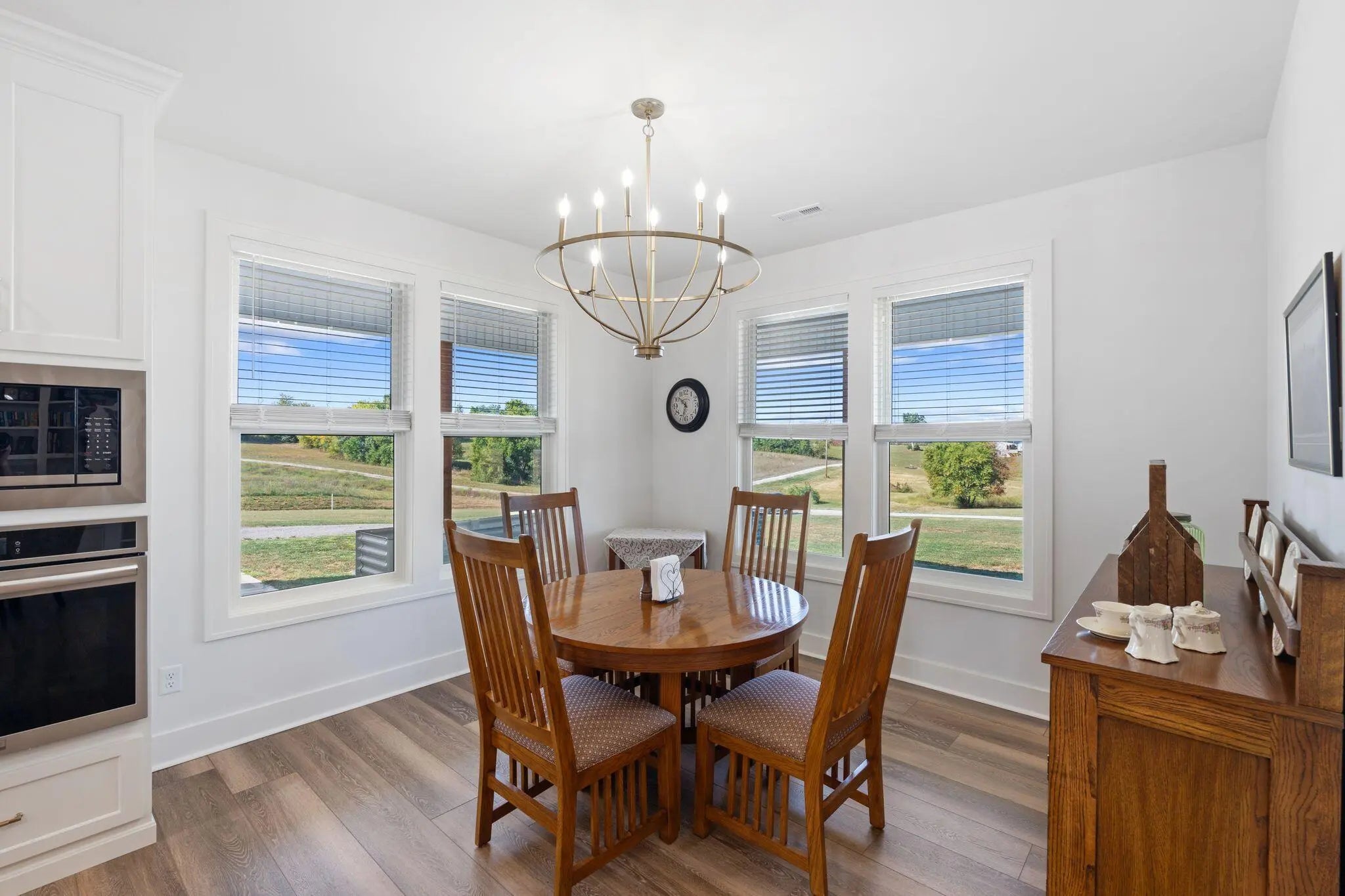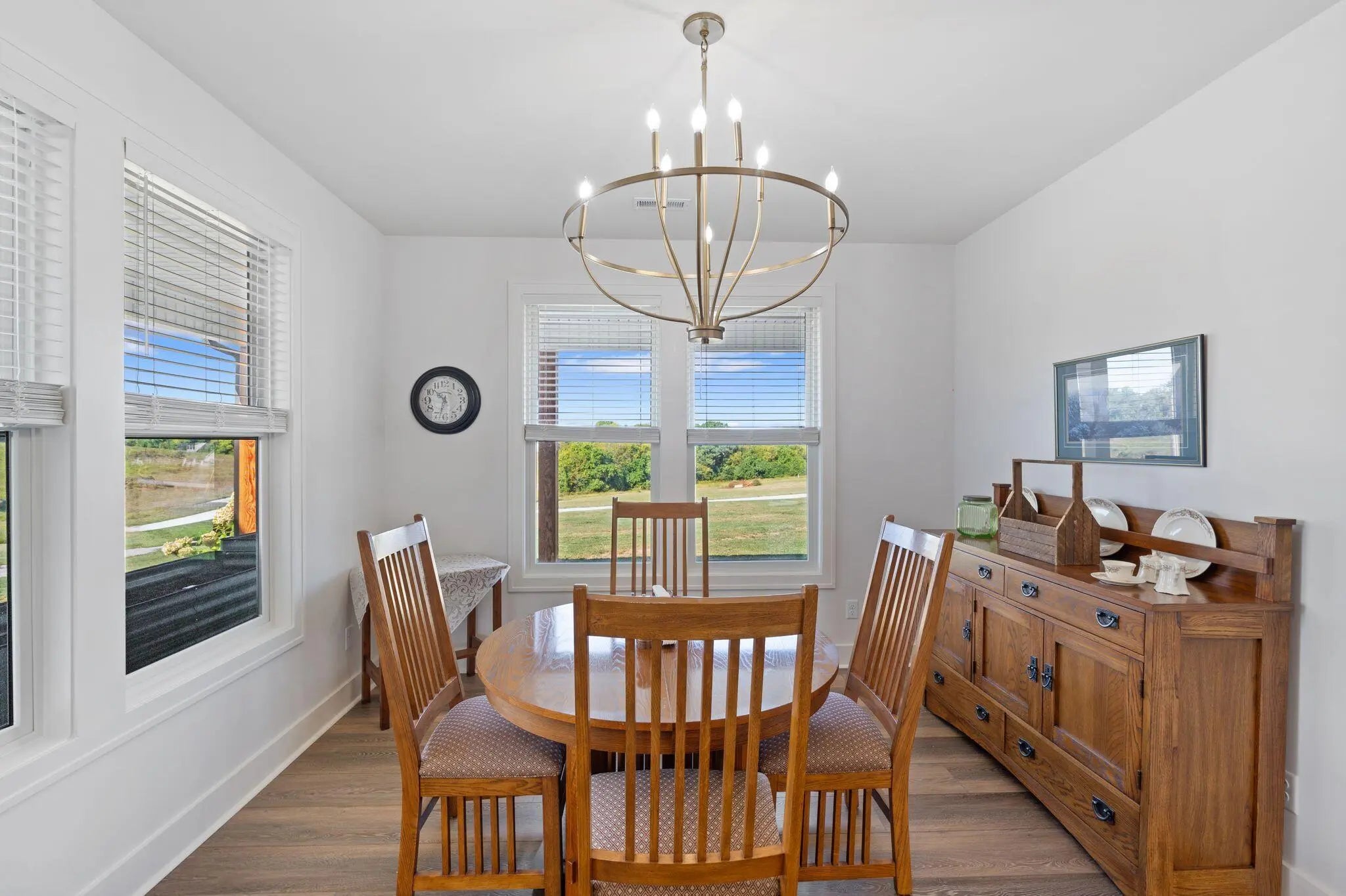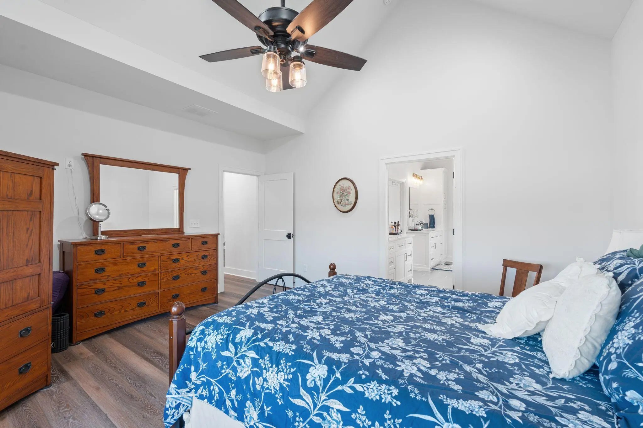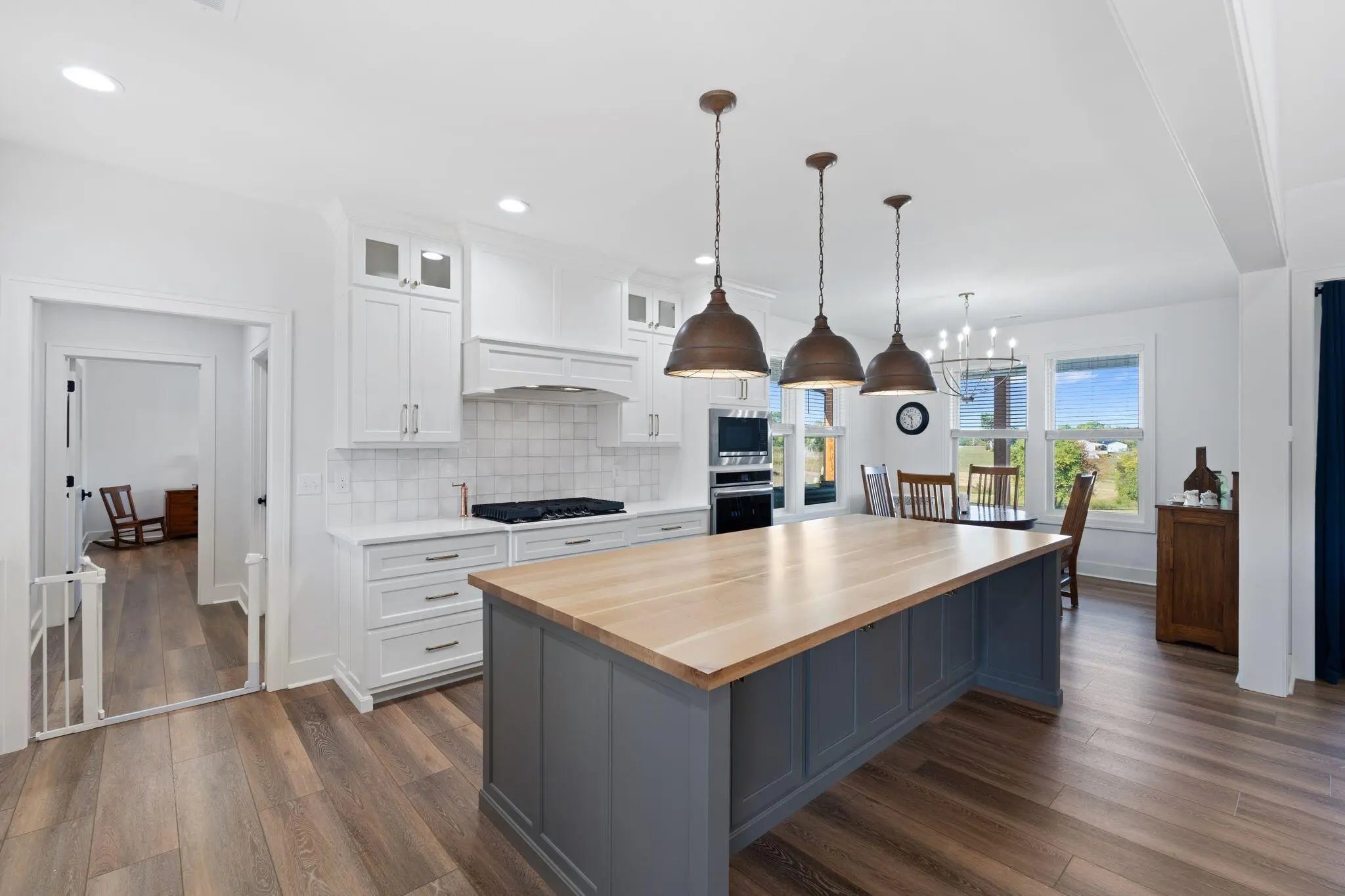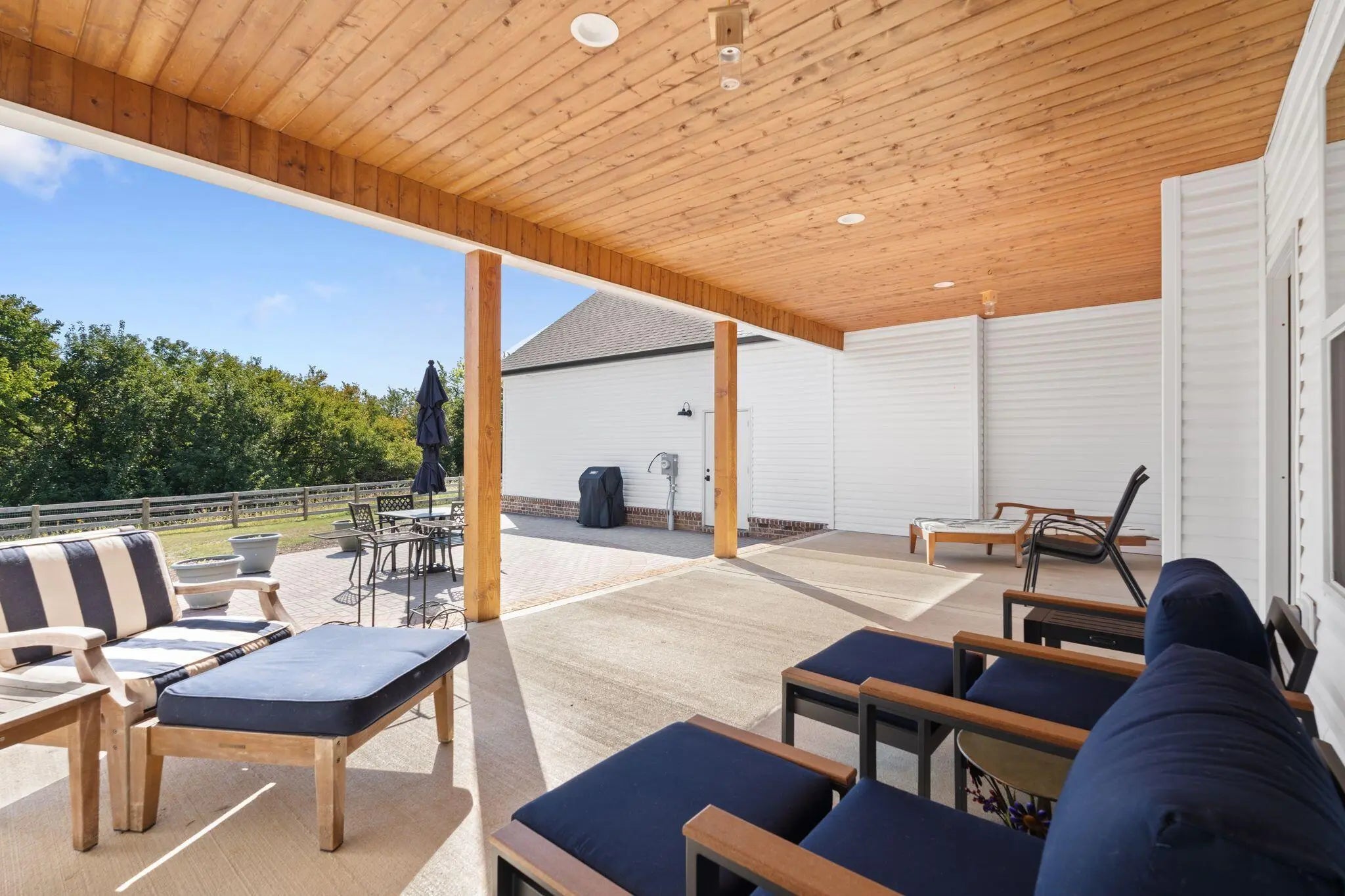 Built in 2023, this stunning modern farmhouse sits on just over 5 acres with new landscaping, horse plank fencing, and wildflowers that brighten the land each spring. A wrap-around covered front porch frames peaceful views of farmland and trees, offering a quiet retreat with timeless curb appeal. Step inside to the great room, where detailed ceilings, an impressive ventless gas fireplace, and custom built-ins create a welcoming centerpiece for the home. The open floor plan flows seamlessly into the gourmet kitchen, featuring custom wood cabinetry, quartz countertops, a tiled backsplash, a huge island, and a spacious dining area. A gas cooktop range with vent hood completes this chef's dream space. The first floor primary suite is a private haven with a luxurious ensuite bath offering spacious double vanities, a freestanding soaking tub, a large walk-in tile shower, and a massive walk-in closet with custom wood shelving. Two additional bedrooms, a full bath, a home office, and a hallway half bath are also located on the main level. Upstairs, a fourth bedroom or flexible bonus room includes its own full ensuite bathroom. The HOA takes care of a tranquil community pond and pavilion. This home is the perfect blend of modern comfort and peaceful country living.
