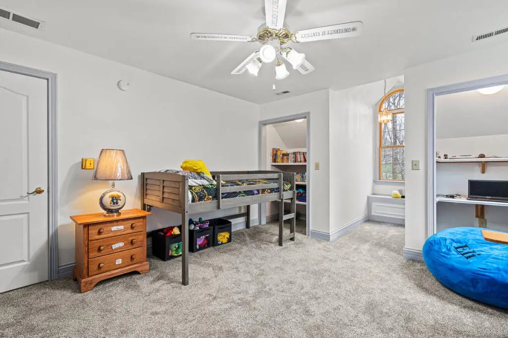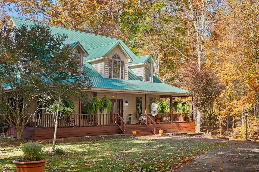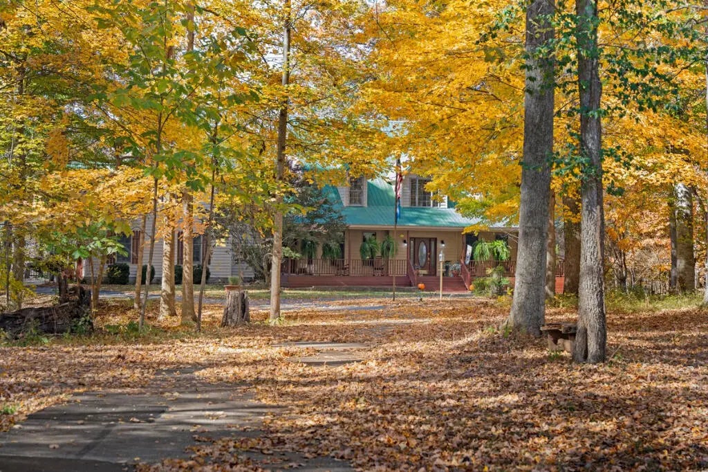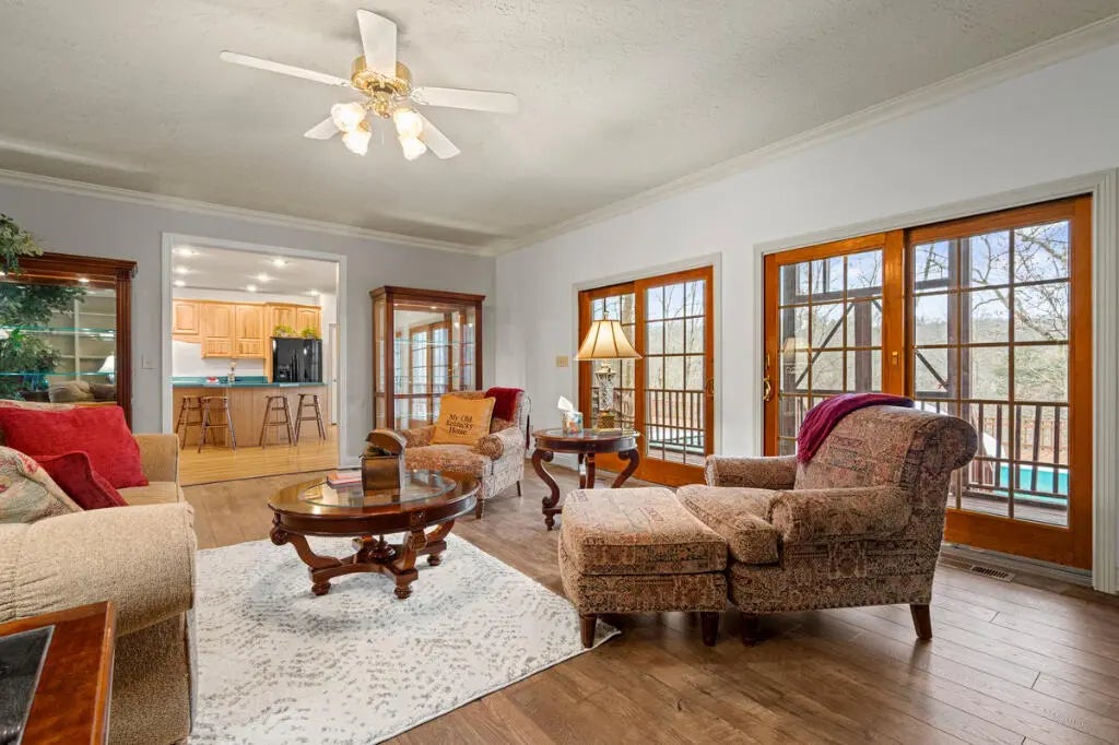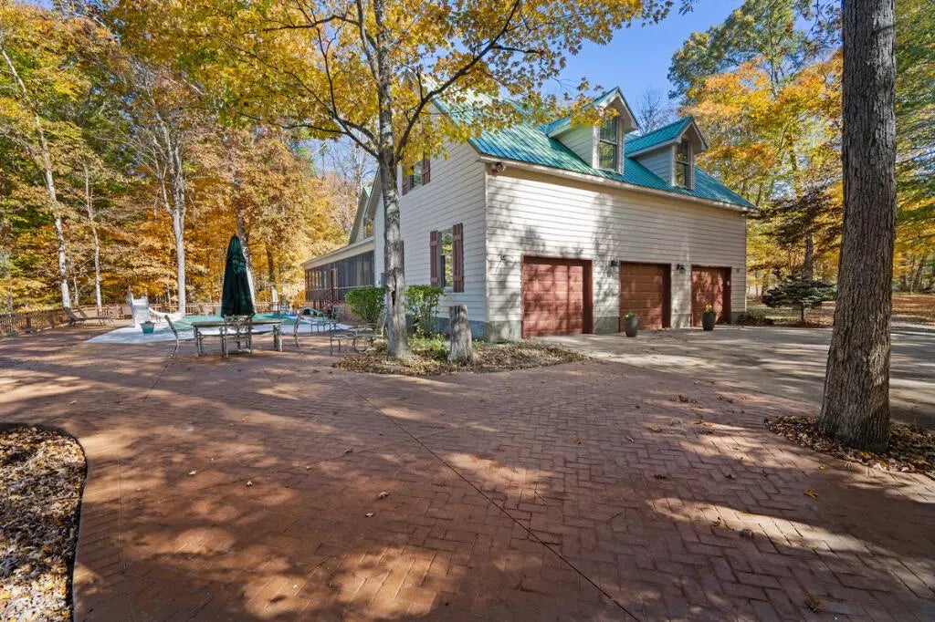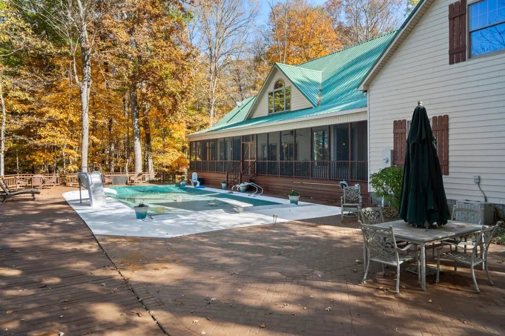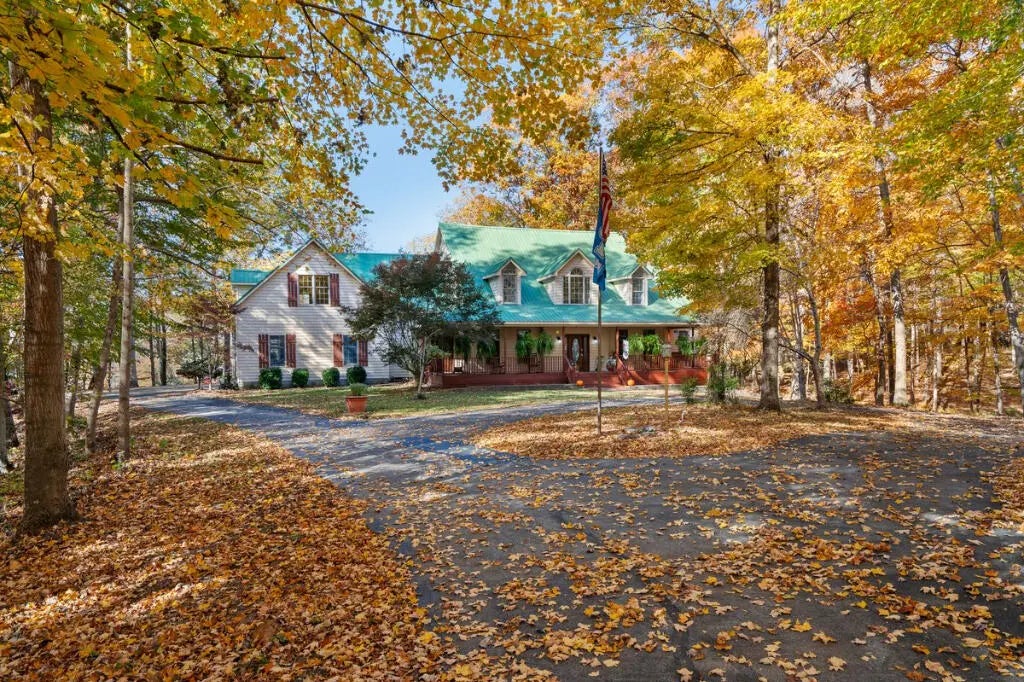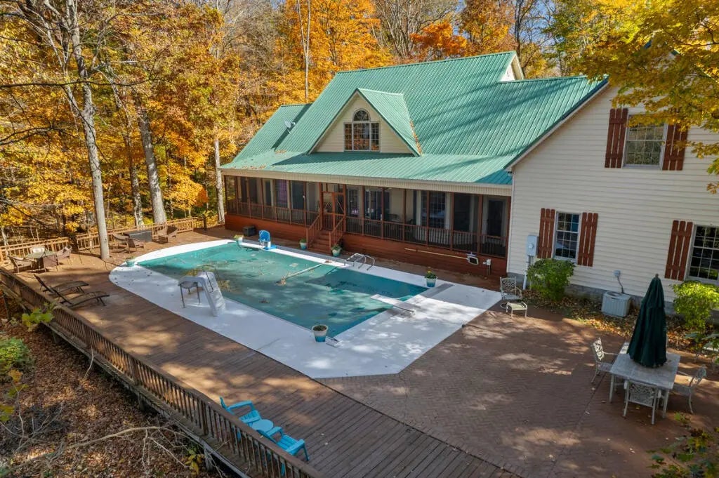 Country Estate living 15 minutes from Lexington on 7.5 wooded acres in the gated Boone's Trace community on the Kentucky river. Relax on the front porch swing and watch the deer or enjoy the screened back porch overlooking the heated in-ground pool with automatic pool cover, perfect for year-round use. With 4000 sq ft of outdoor entertainment space including the pool, deck, and patio this property offers privacy and natural beauty at every turn. The luxurious primary suite features a bay window setting area, spa tub by the fireplace, double vanities, a makup station and an oversized walk-in closet. The spacious kitchen has rich cabinetry, a center island, and a bright bay window breakfast nook. The living room boasts built-in shelving and a rock fireplace, with sliding doors opening to the porch. Upstairs you'll find a triple vaulted grand entertainment room with bar, media lounge and room for a piano. The upper level also offers a 1000 sq ft multipurpose room--ideal for a retreat, game room, gym, crafting studio, or theater. The 3 door garage fits 3 cars plus tool area, shelving and extra storage. Your private retreat awaits. Photos #47 and #54 are virtually staged.