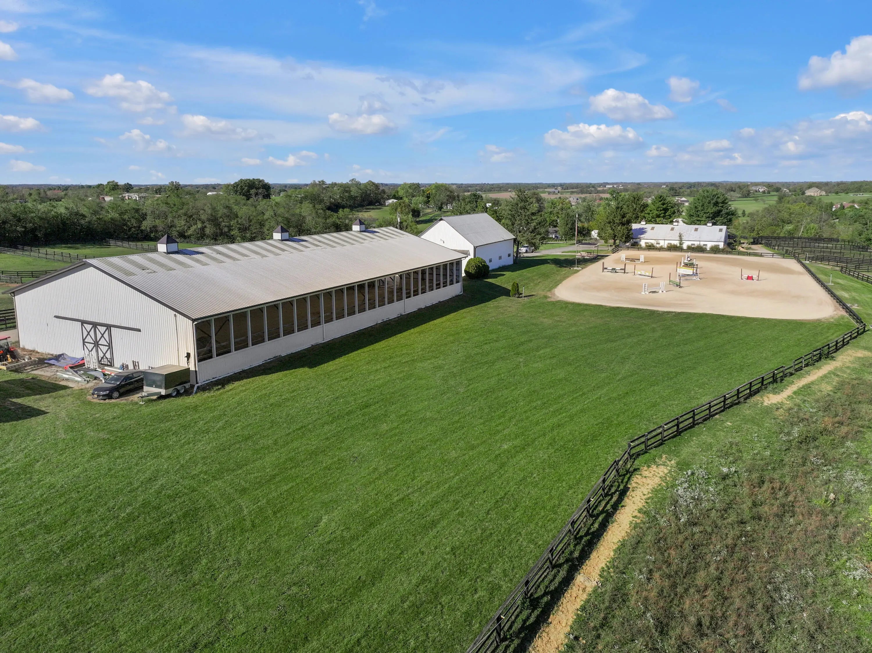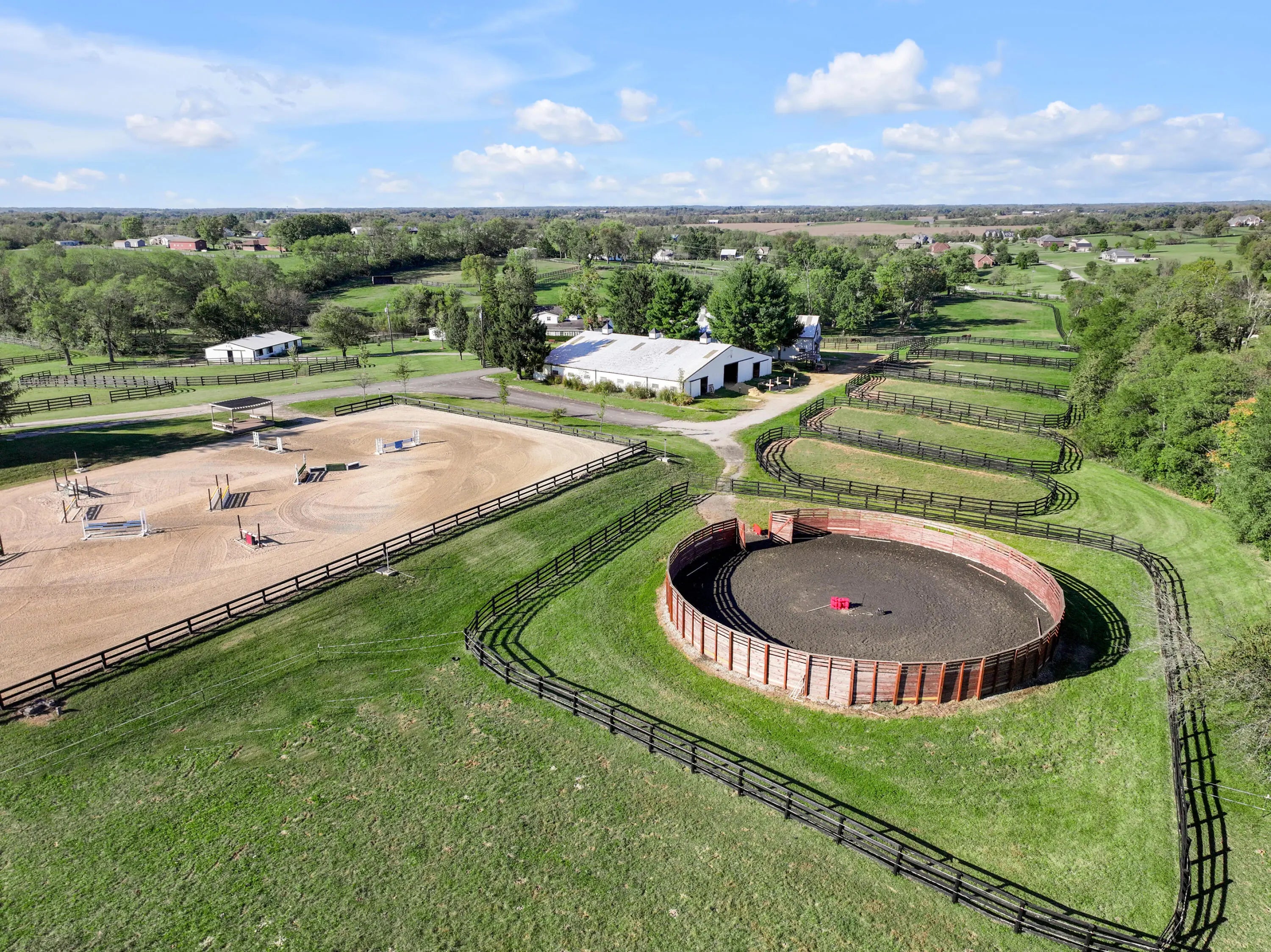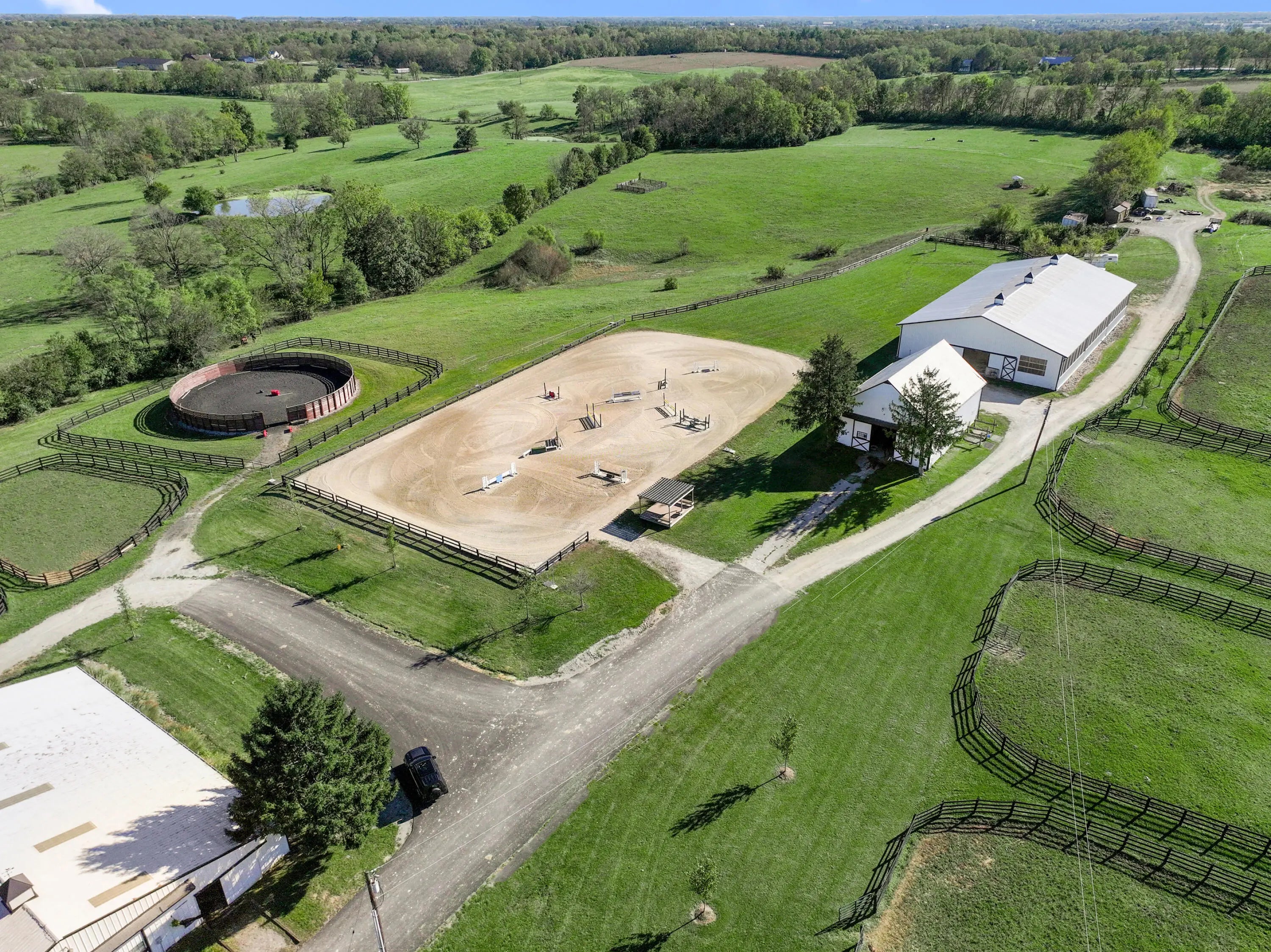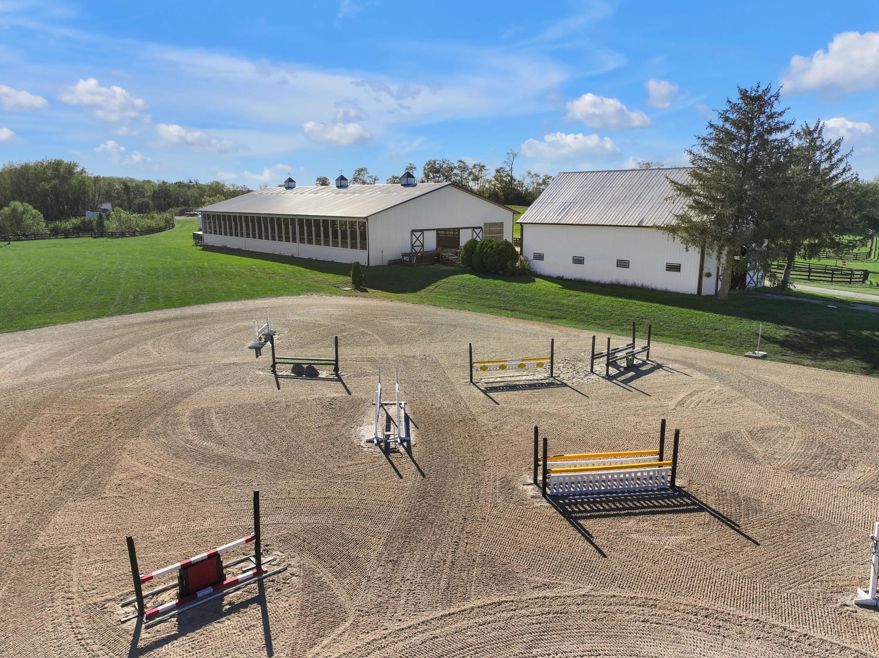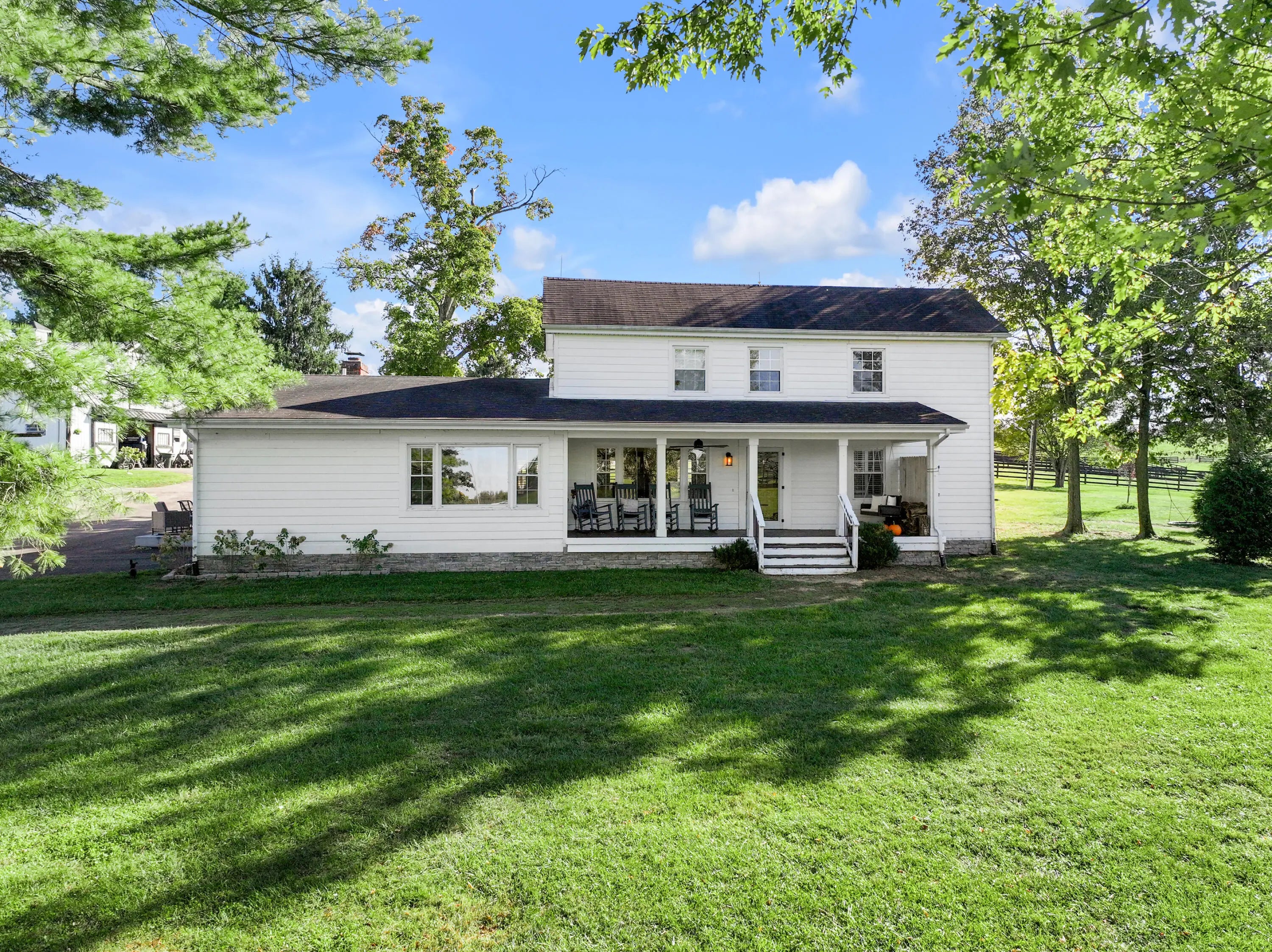 Discover this exceptional equestrian estate! Featuring four barns with a total of 49 stalls and spanning 46.45 acres, this property is ideal for professional horse enthusiasts. It offers a spacious 250'x125' outdoor arena and a 140'x72' indoor arena, both equipped with GGT footing. These arenas are irrigated using two water reclamation ponds. The two primary barns have been recently updated with new roofs, siding, and electrical systems. Additionally, there is an 80-foot round pen with Poly-Track footing. The property includes 11 grass paddocks and three large fields, perfect for retired horses and riding activities. The main residence, a 4-bedroom, 3-bathroom house, underwent a complete renovation in 2017, featuring beautiful oak wood flooring throughout and a chef's kitchen with high-quality stainless steel appliances, quartz countertops, and a tiled backsplash. The bathrooms are fitted with designer vanities, tiles, and fixtures. There are also one additional residences on the property: a 2-bedroom, 2-bathroom home, ideal for farm management or as guest accommodations.