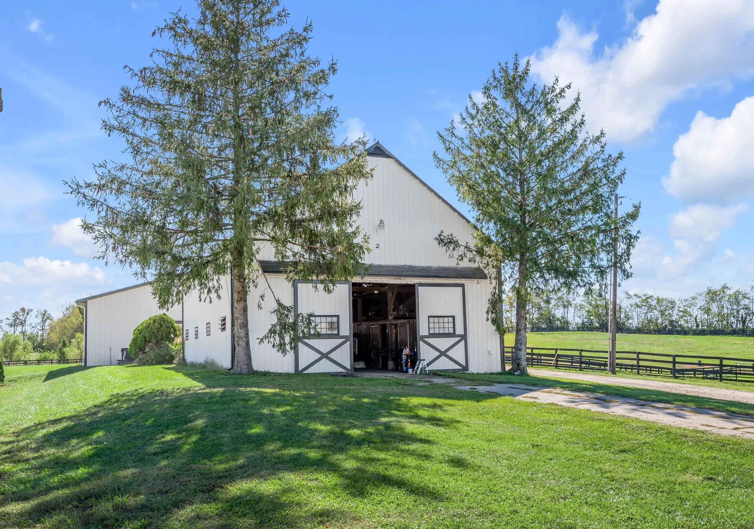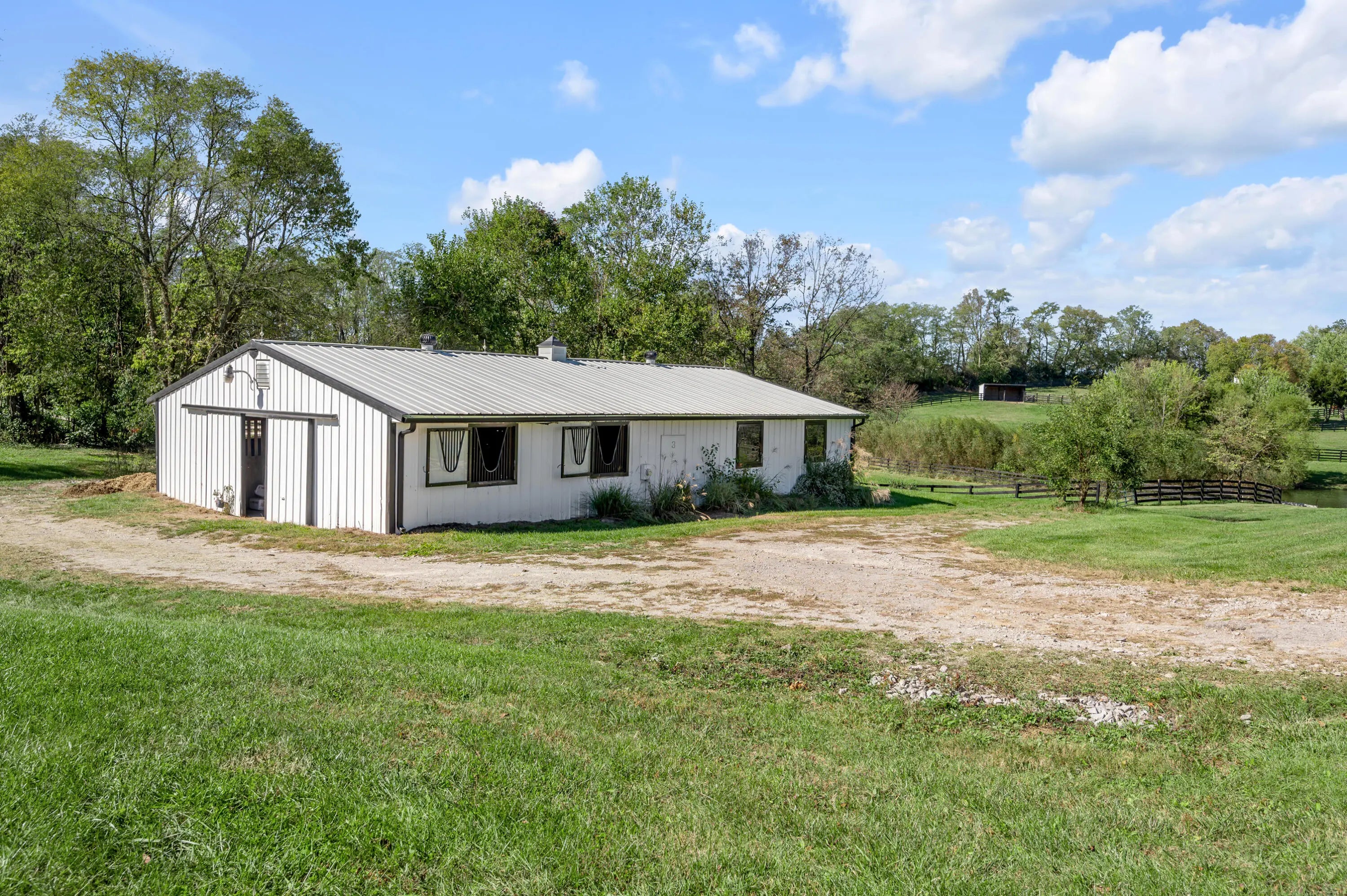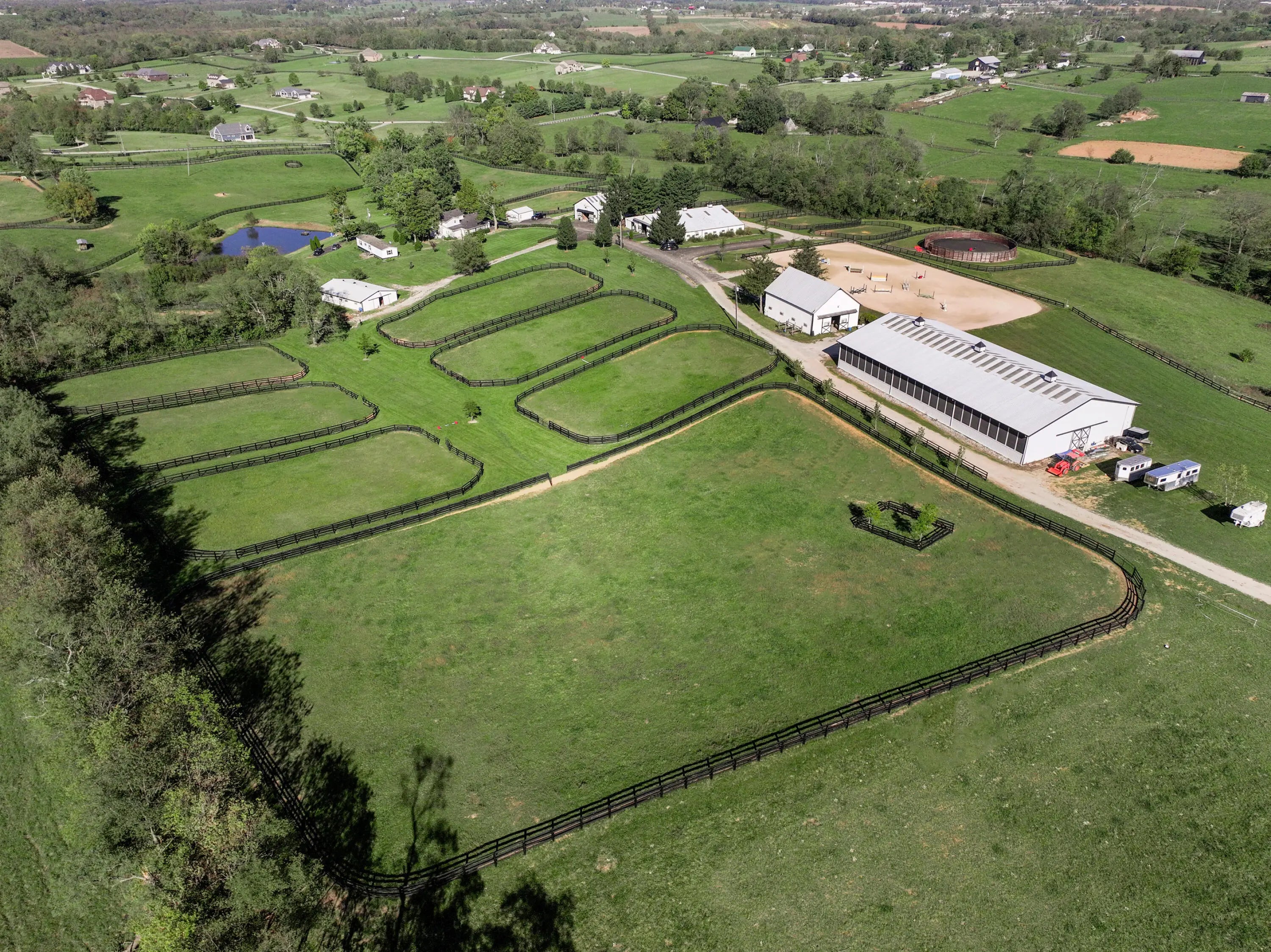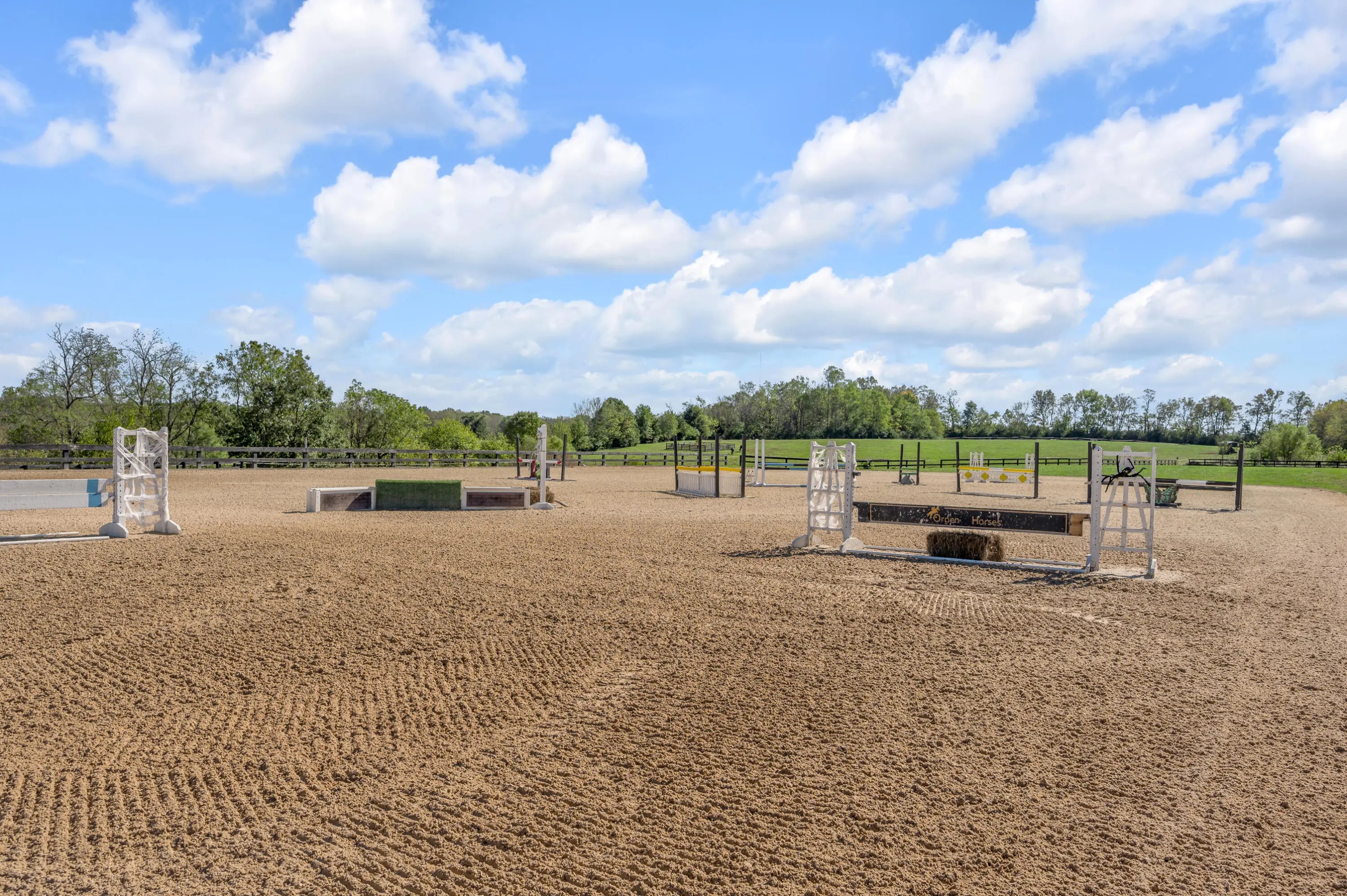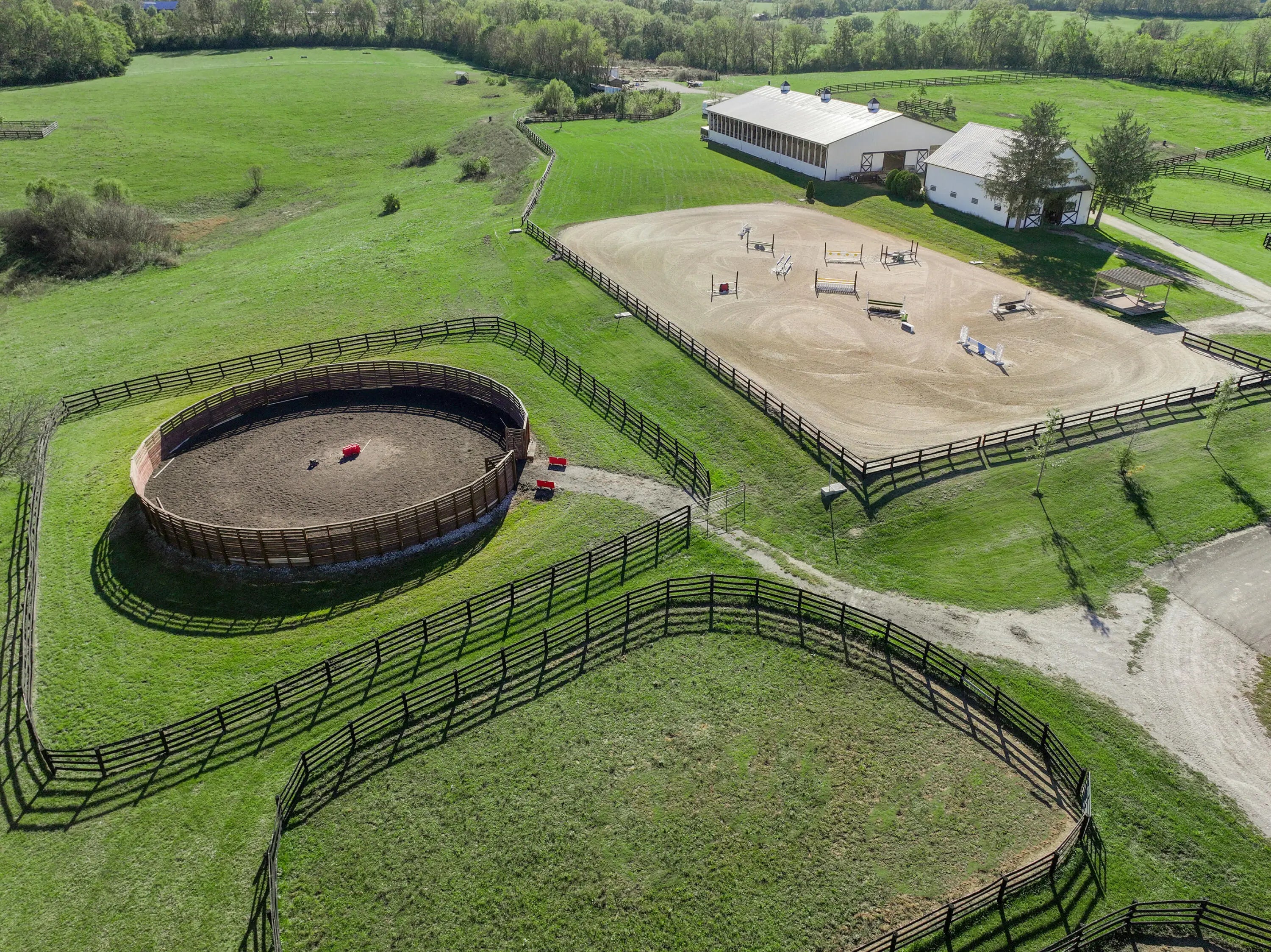 Discover this exceptional equestrian estate! Featuring four barns with a total of 49 stalls and spanning 46.45 acres, this property is ideal for professional horse enthusiasts. It offers a spacious 250'x125' outdoor arena and a 140'x72' indoor arena, both equipped with GGT footing. These arenas are irrigated using two water reclamation ponds. The two primary barns have been recently updated with new roofs, siding, and electrical systems. Additionally, there is an 80-foot round pen with Poly-Track footing. The property includes 11 grass paddocks and three large fields, perfect for retired horses and riding activities. The main residence, a 4-bedroom, 3-bathroom house, underwent a complete renovation in 2017, featuring beautiful oak wood flooring throughout and a chef's kitchen with high-quality stainless steel appliances, quartz countertops, and a tiled backsplash. The bathrooms are fitted with designer vanities, tiles, and fixtures. There are also one additional residences on the property: a 2-bedroom, 2-bathroom home, ideal for farm management or as guest accommodations.