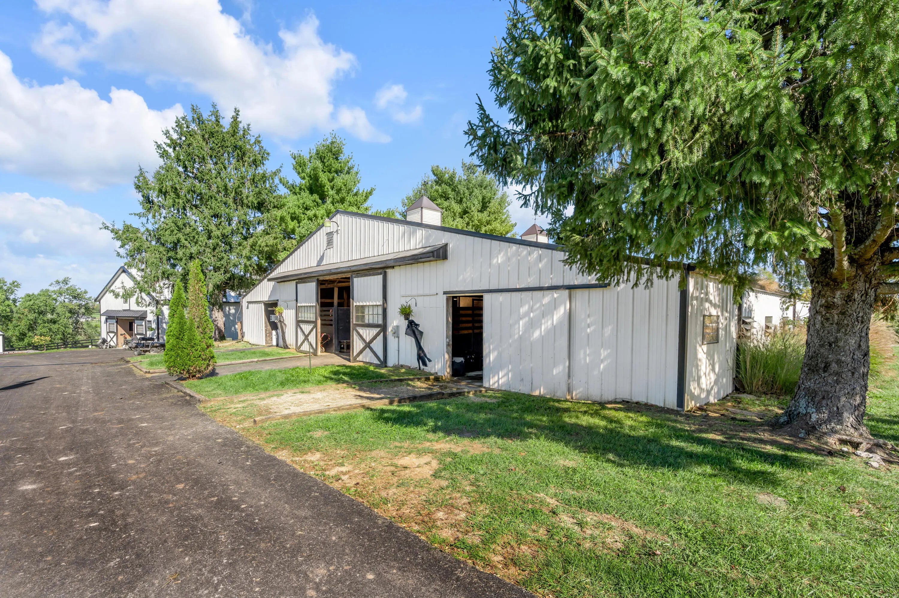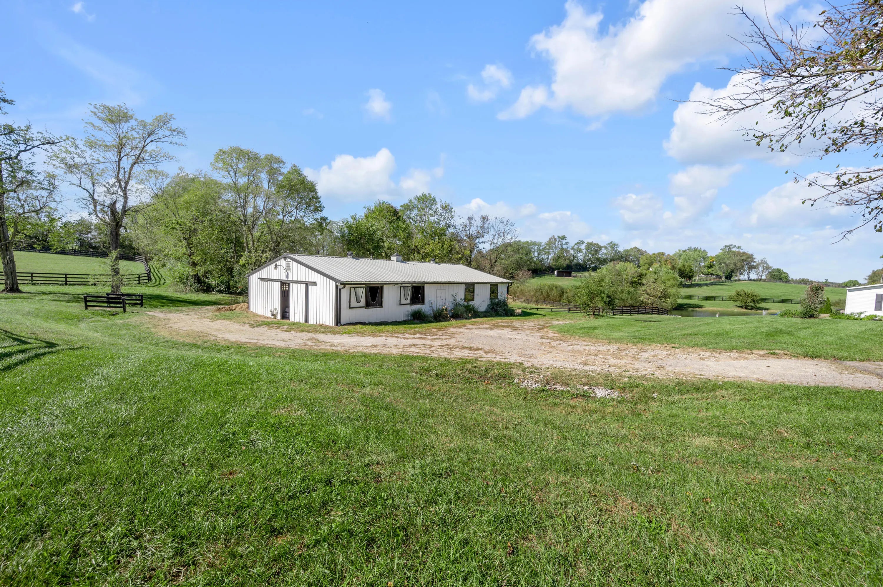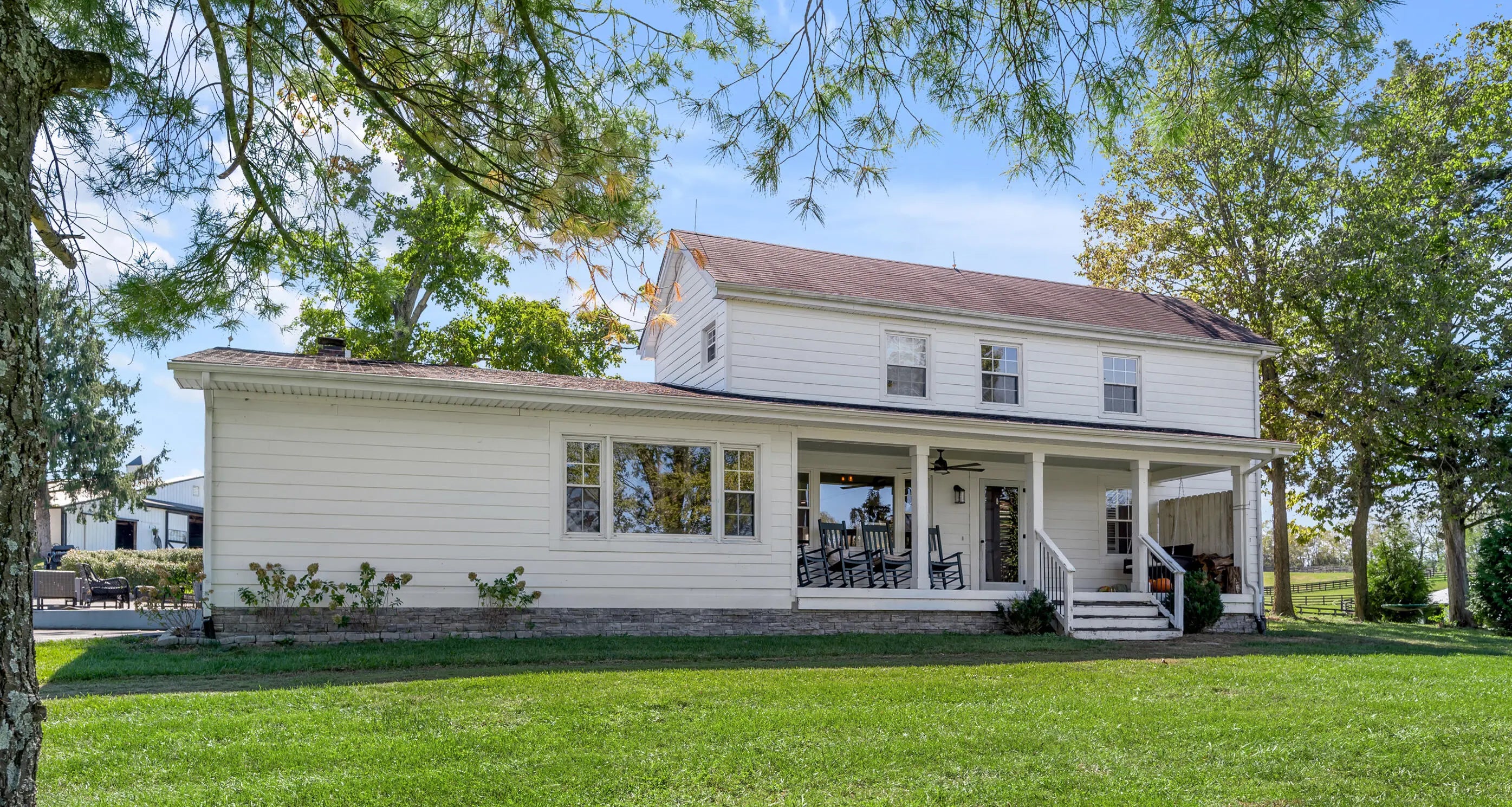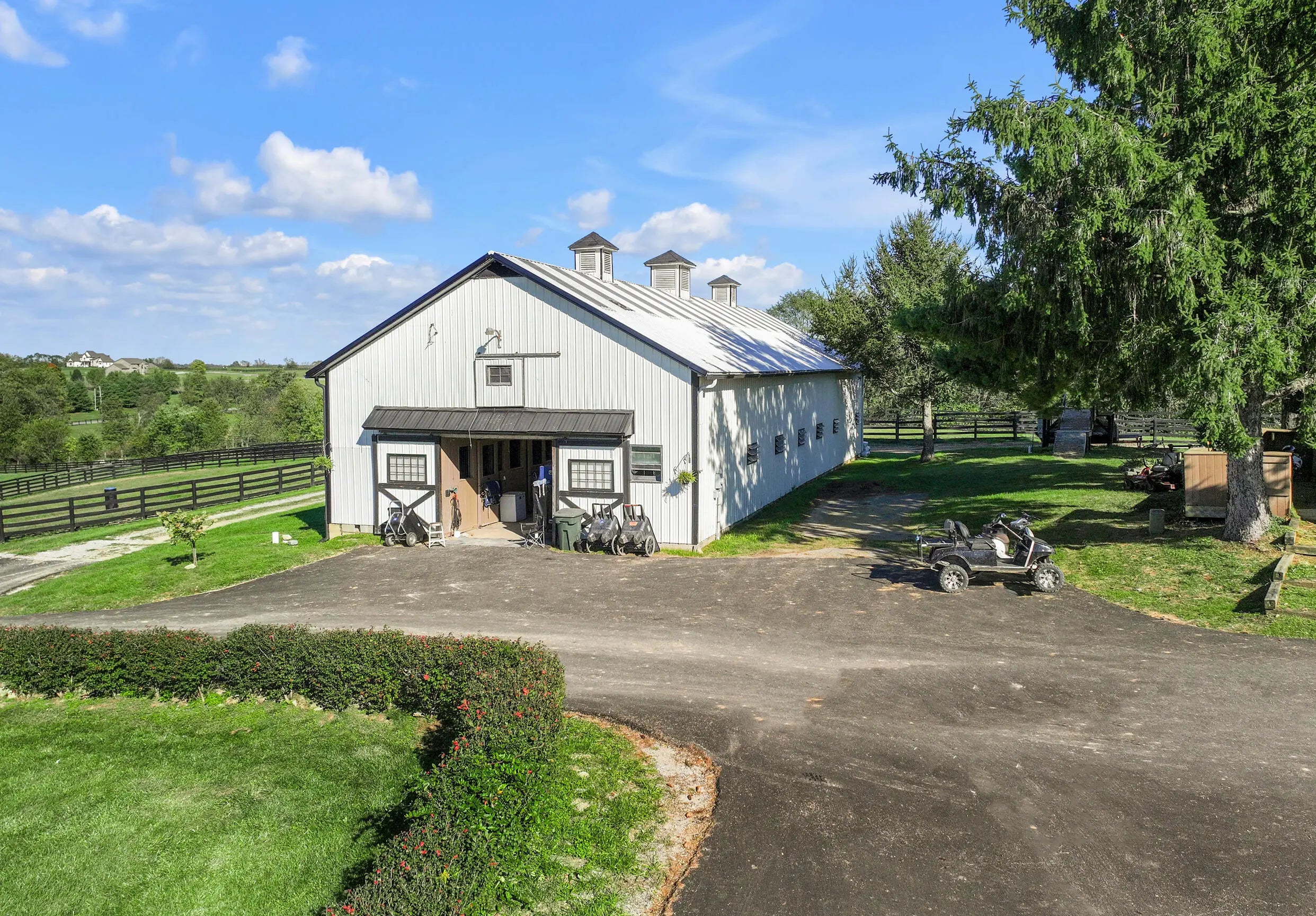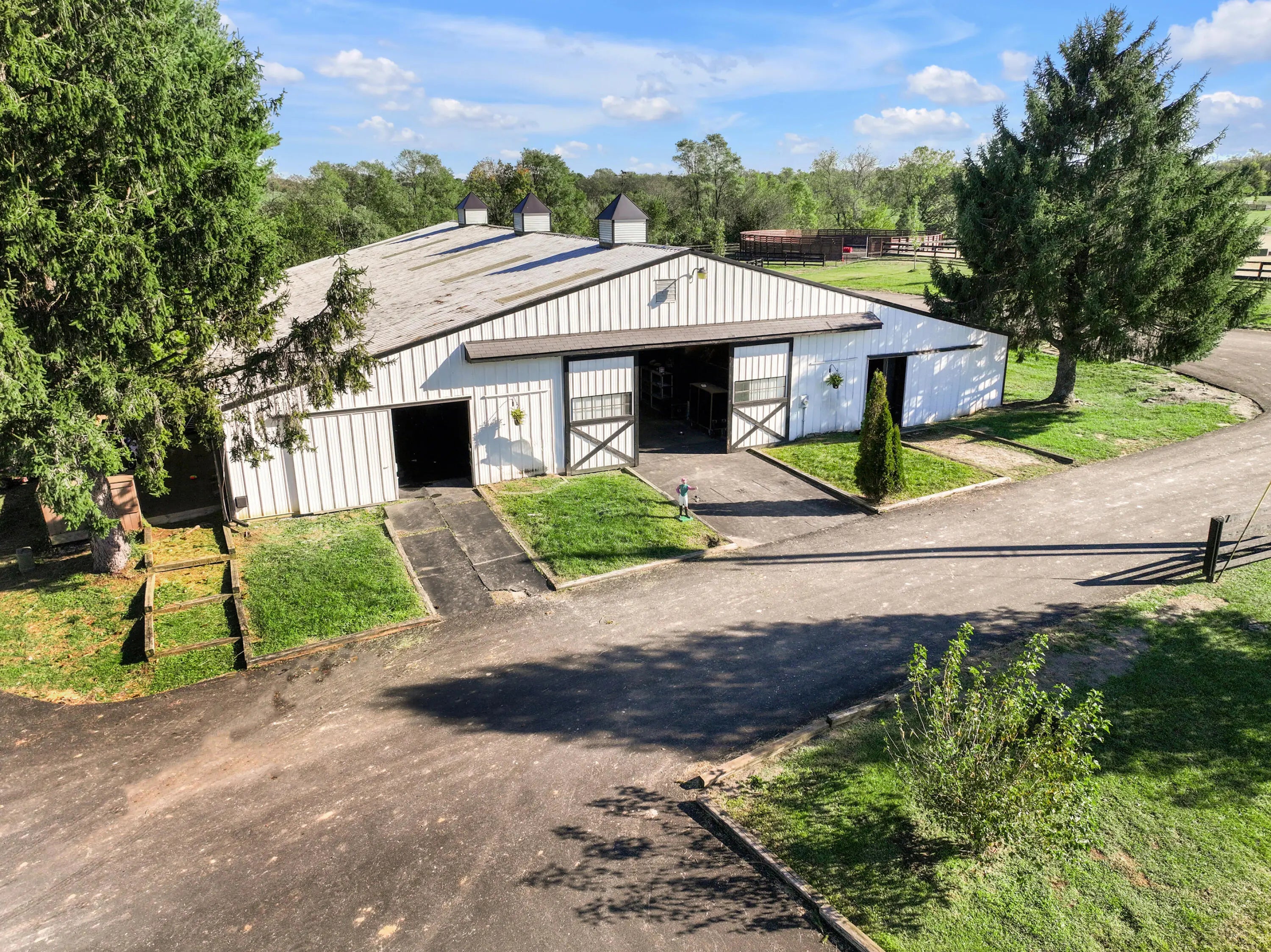 Discover this exceptional equestrian estate! Featuring four barns with a total of 49 stalls and spanning 46.45 acres, this property is ideal for professional horse enthusiasts. It offers a spacious 250'x125' outdoor arena and a 140'x72' indoor arena, both equipped with GGT footing. These arenas are irrigated using two water reclamation ponds. The two primary barns have been recently updated with new roofs, siding, and electrical systems. Additionally, there is an 80-foot round pen with Poly-Track footing. The property includes 11 grass paddocks and three large fields, perfect for retired horses and riding activities. The main residence, a 4-bedroom, 3-bathroom house, underwent a complete renovation in 2017, featuring beautiful oak wood flooring throughout and a chef's kitchen with high-quality stainless steel appliances, quartz countertops, and a tiled backsplash. The bathrooms are fitted with designer vanities, tiles, and fixtures. There are also one additional residences on the property: a 2-bedroom, 2-bathroom home, ideal for farm management or as guest accommodations.