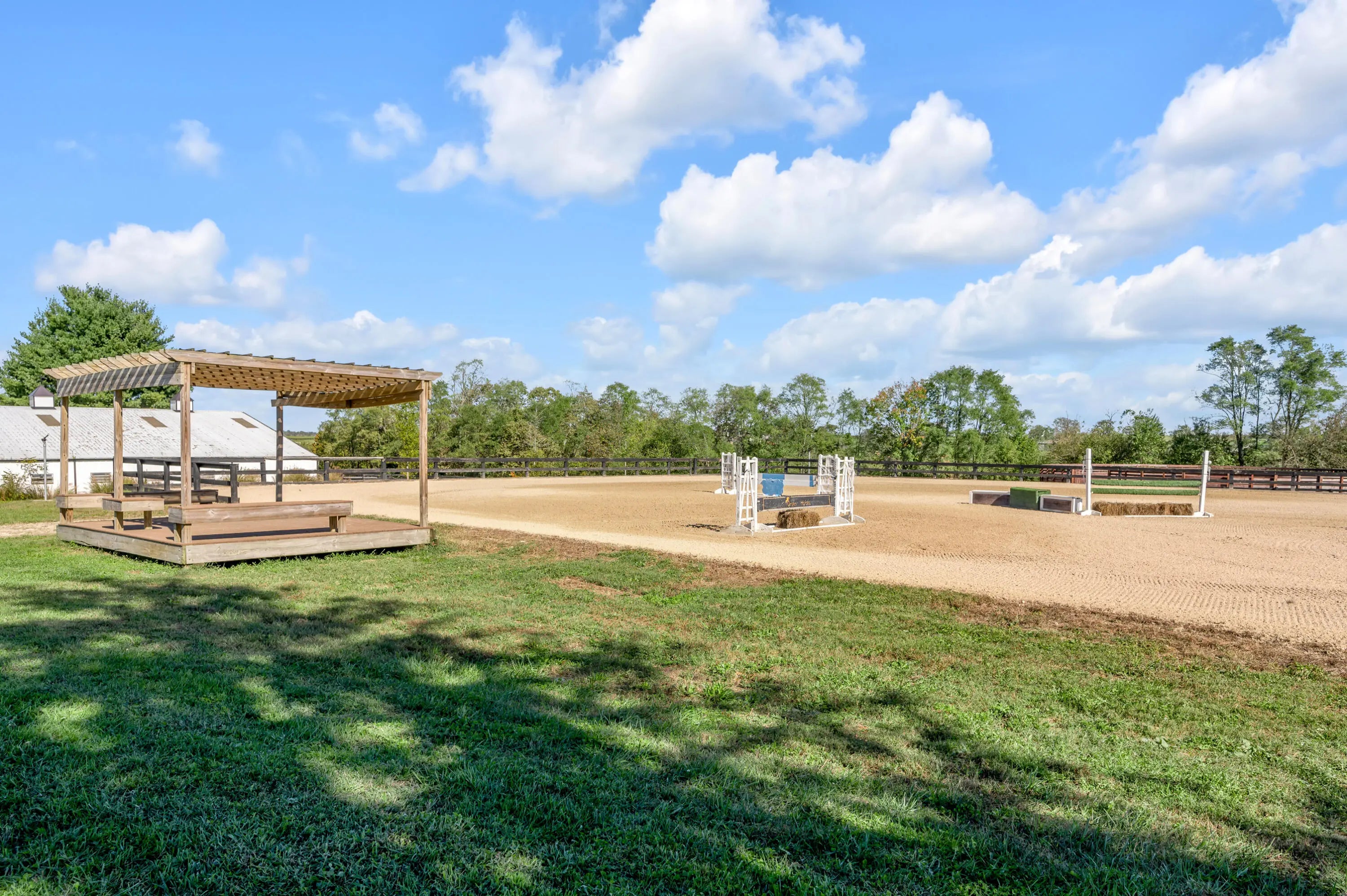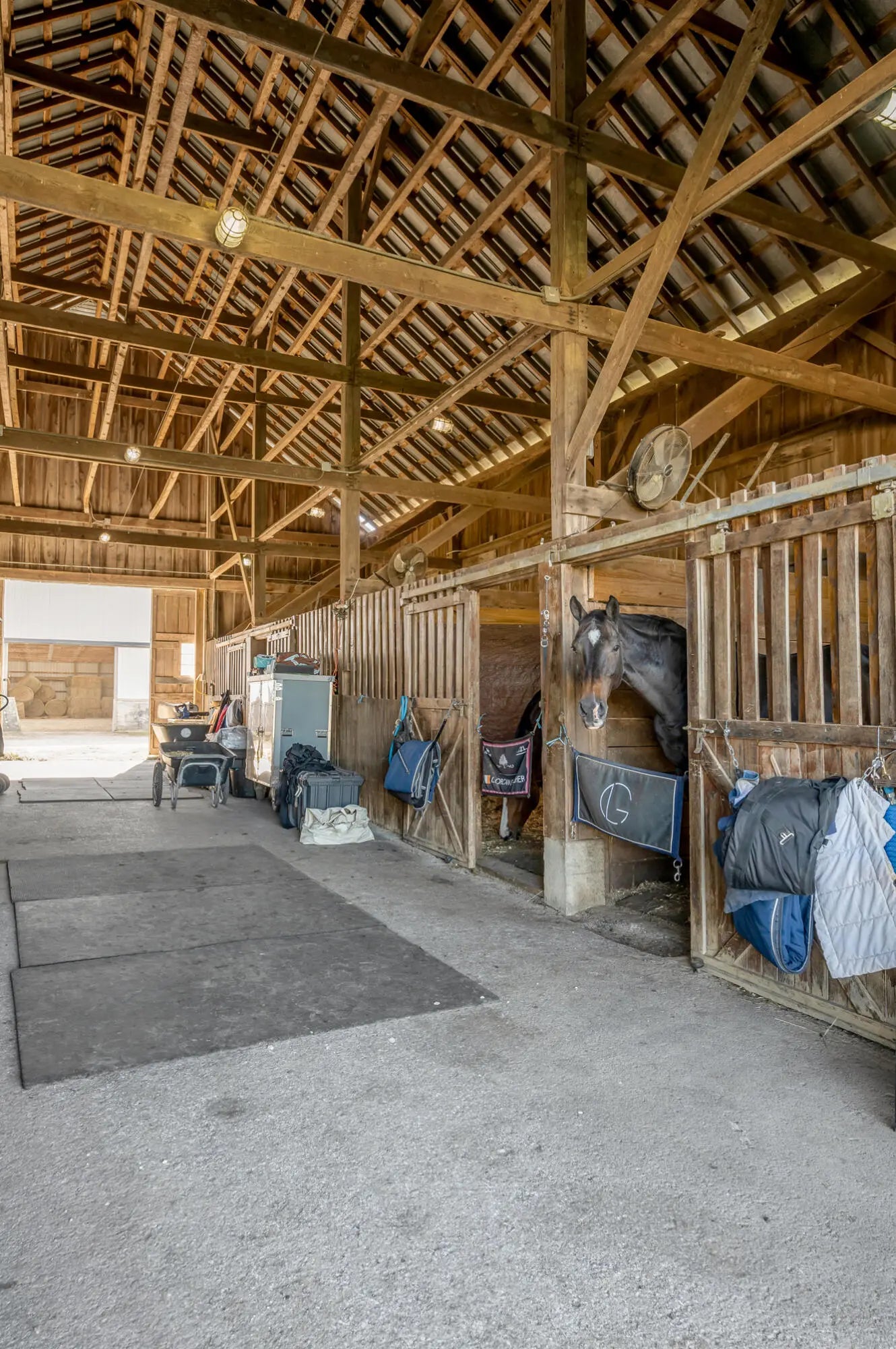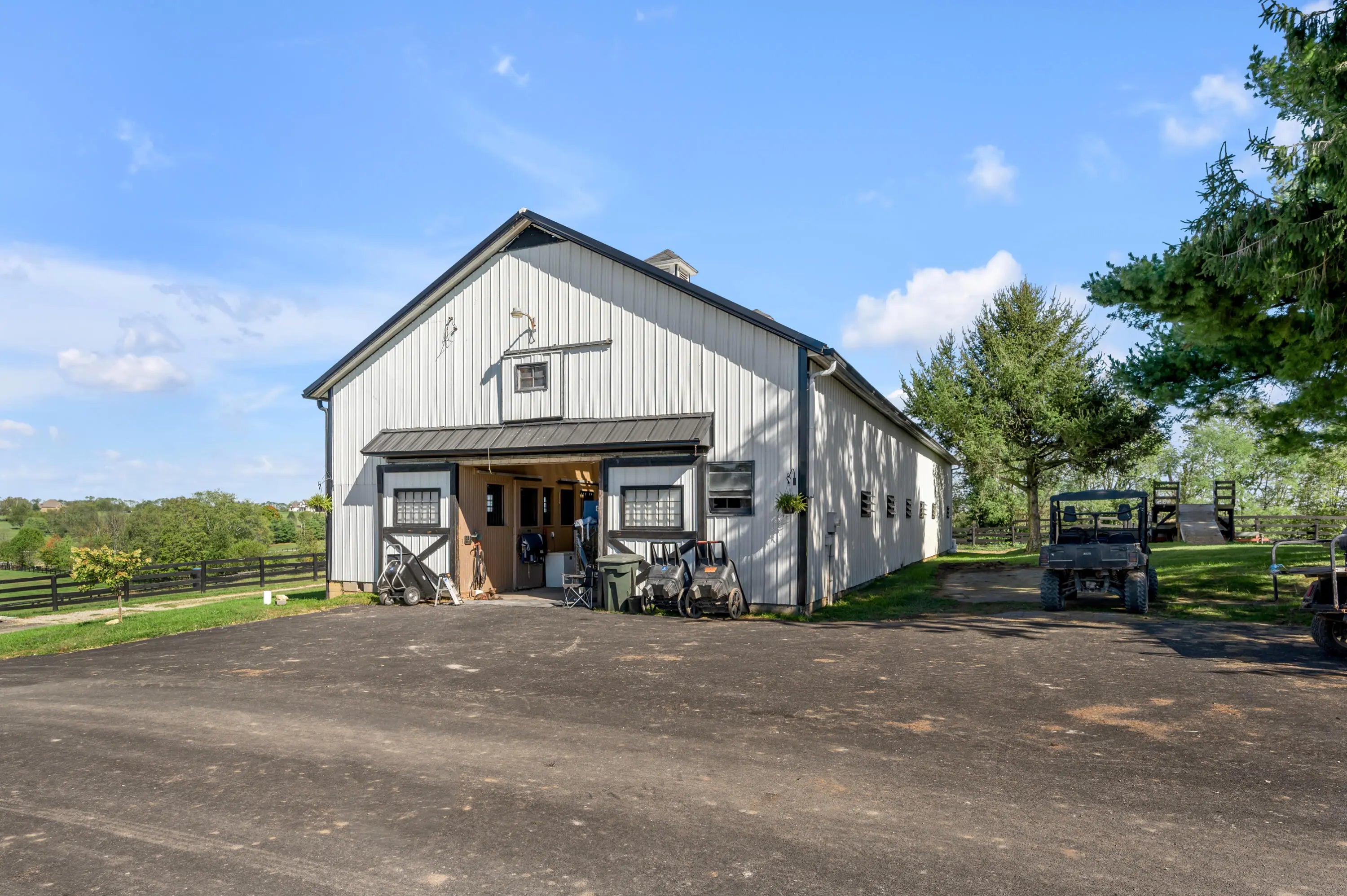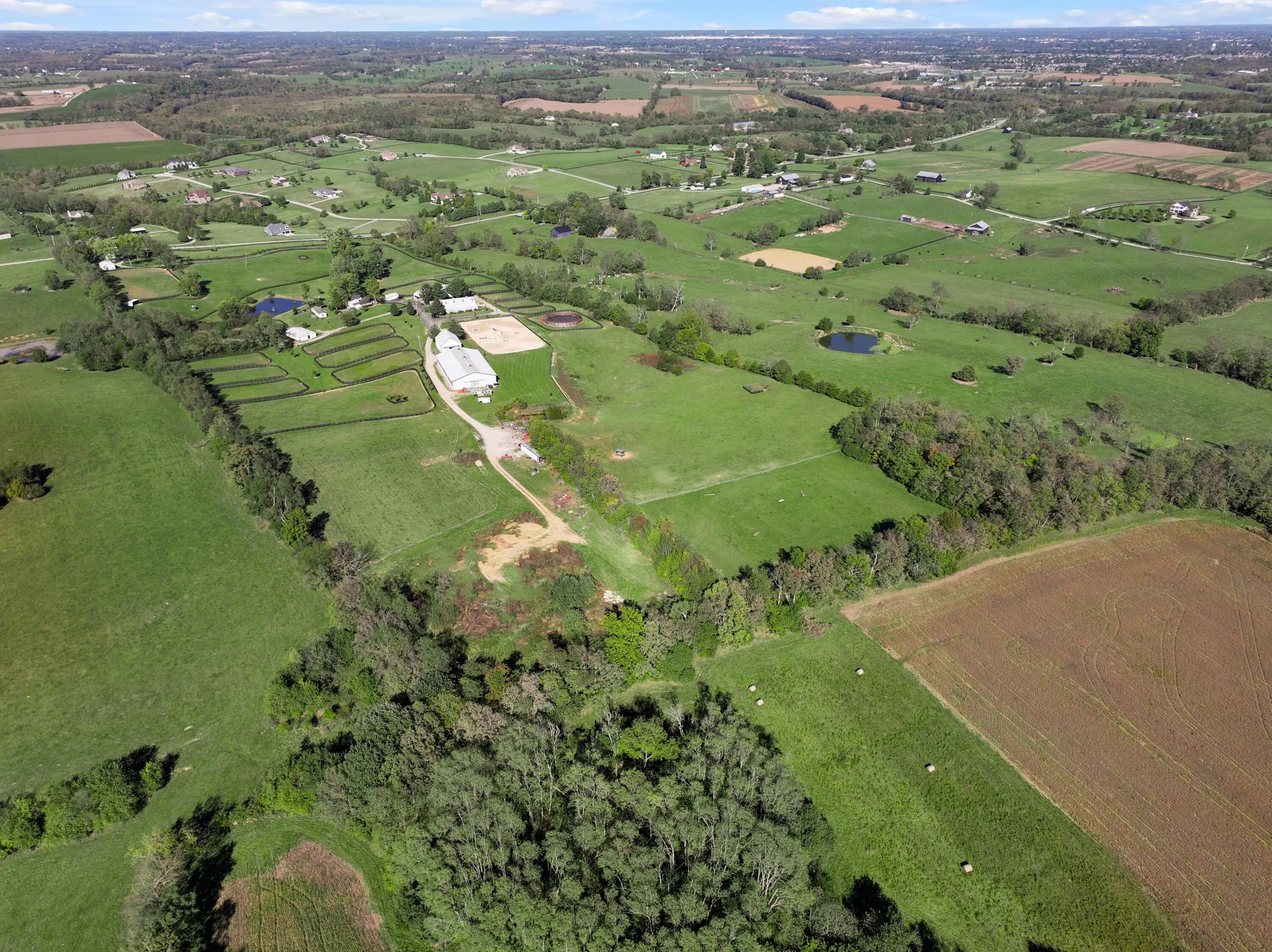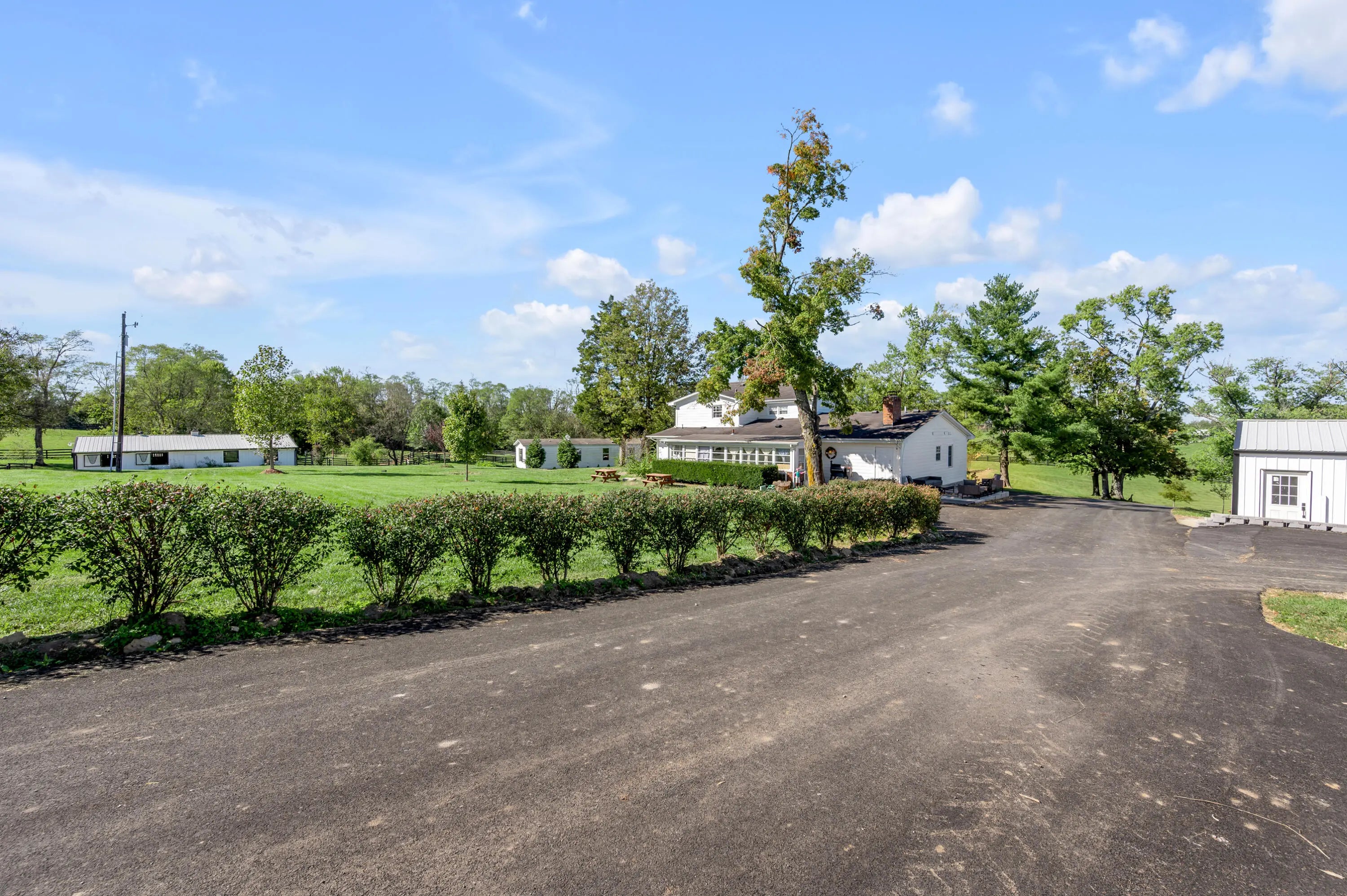 Discover this exceptional equestrian estate! Featuring four barns with a total of 49 stalls and spanning 46.45 acres, this property is ideal for professional horse enthusiasts. It offers a spacious 250'x125' outdoor arena and a 140'x72' indoor arena, both equipped with GGT footing. These arenas are irrigated using two water reclamation ponds. The two primary barns have been recently updated with new roofs, siding, and electrical systems. Additionally, there is an 80-foot round pen with Poly-Track footing. The property includes 11 grass paddocks and three large fields, perfect for retired horses and riding activities. The main residence, a 4-bedroom, 3-bathroom house, underwent a complete renovation in 2017, featuring beautiful oak wood flooring throughout and a chef's kitchen with high-quality stainless steel appliances, quartz countertops, and a tiled backsplash. The bathrooms are fitted with designer vanities, tiles, and fixtures. There are also one additional residences on the property: a 2-bedroom, 2-bathroom home, ideal for farm management or as guest accommodations.