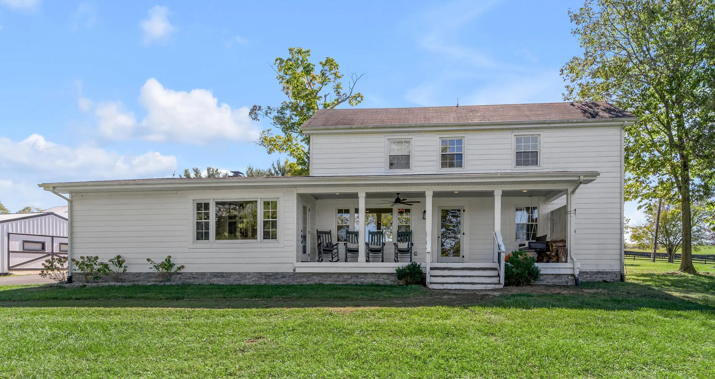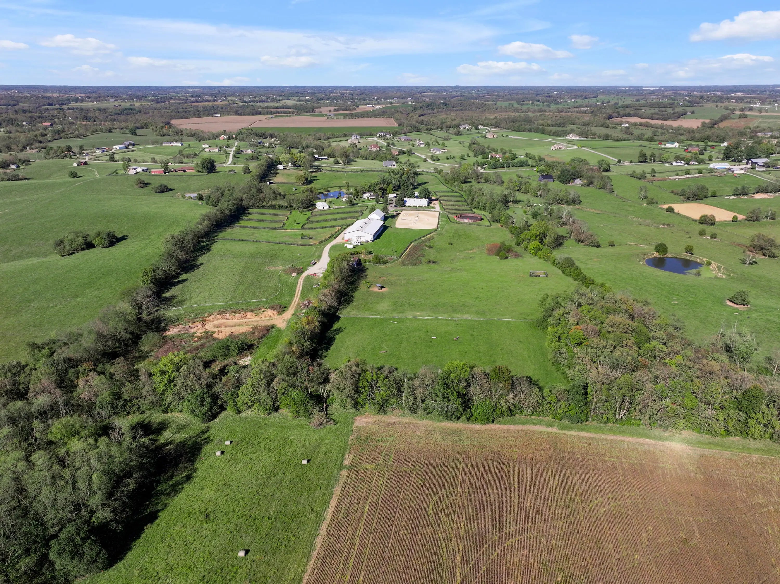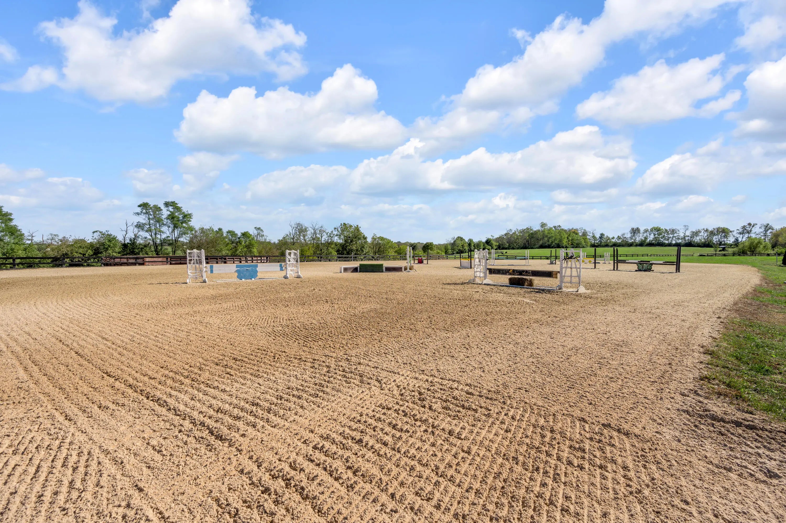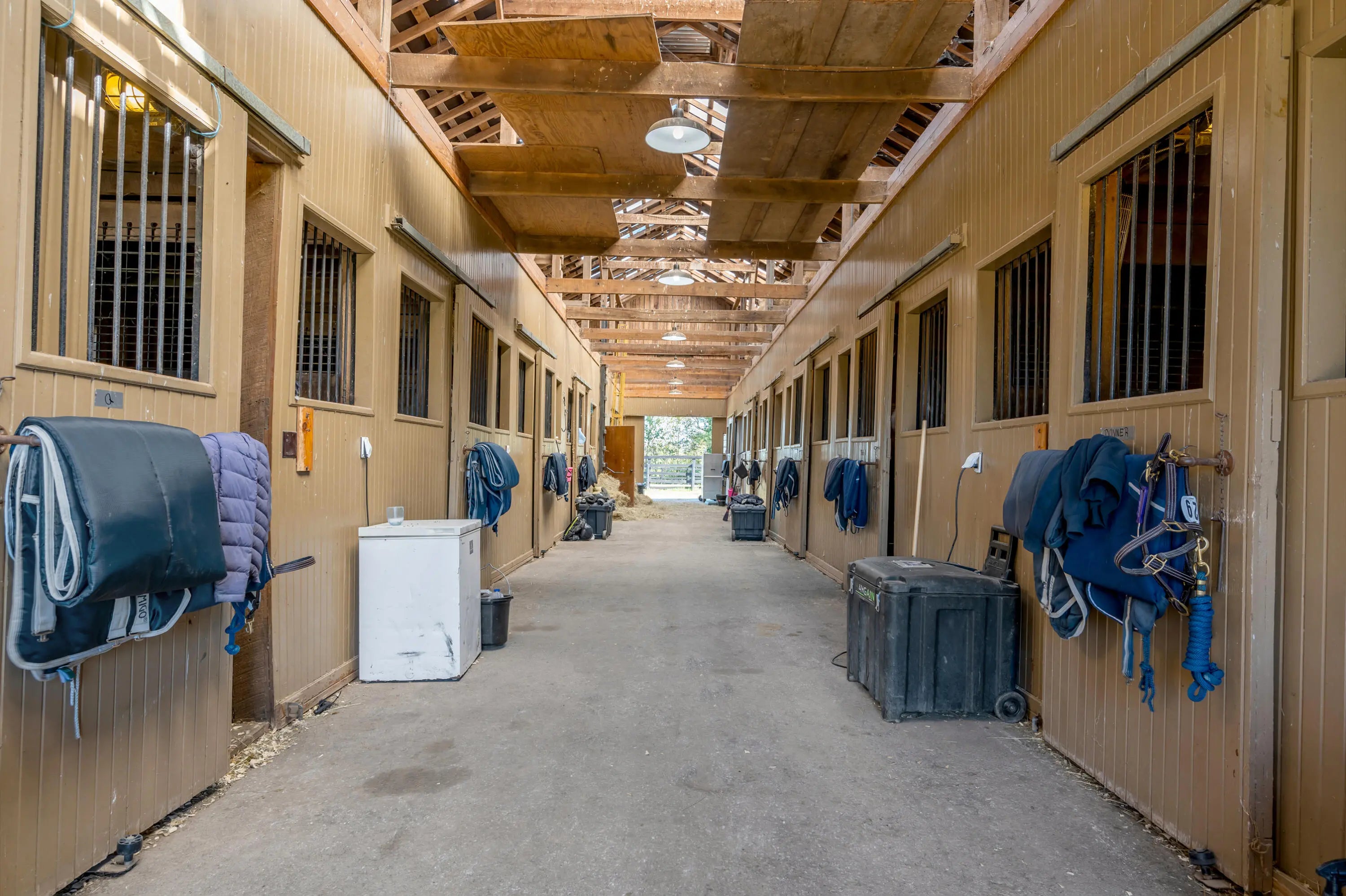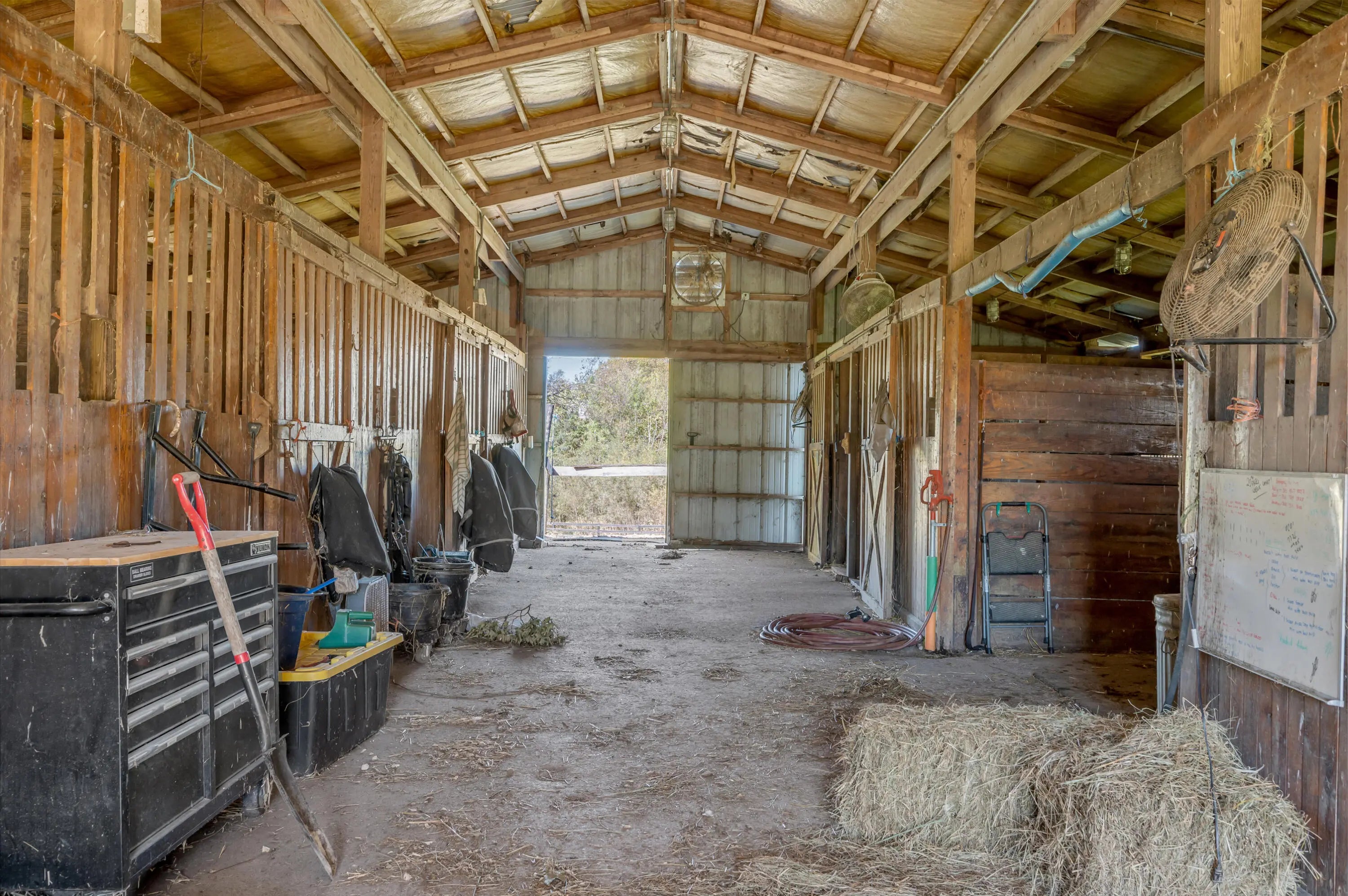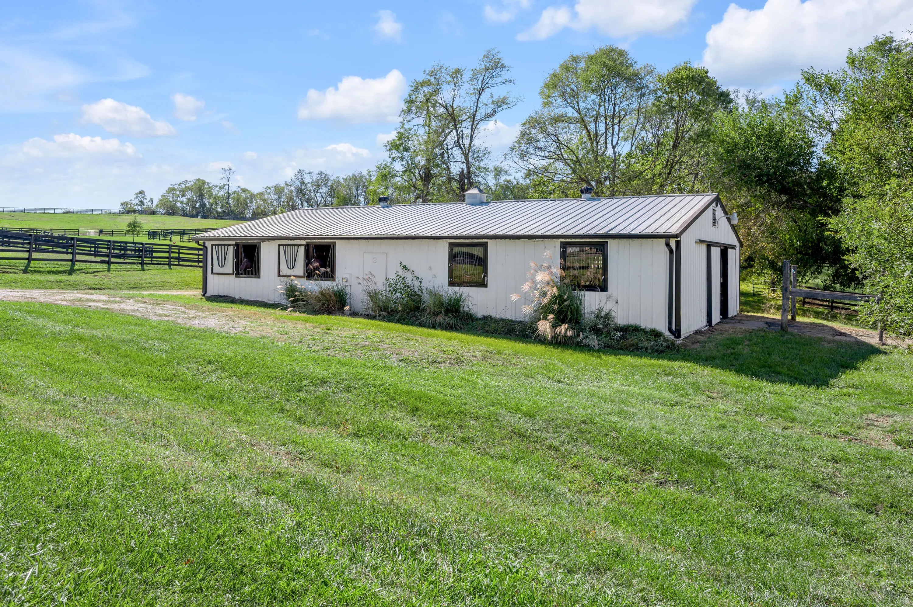 Discover this exceptional equestrian estate! Featuring four barns with a total of 49 stalls and spanning 46.45 acres, this property is ideal for professional horse enthusiasts. It offers a spacious 250'x125' outdoor arena and a 140'x72' indoor arena, both equipped with GGT footing. These arenas are irrigated using two water reclamation ponds. The two primary barns have been recently updated with new roofs, siding, and electrical systems. Additionally, there is an 80-foot round pen with Poly-Track footing. The property includes 11 grass paddocks and three large fields, perfect for retired horses and riding activities. The main residence, a 4-bedroom, 3-bathroom house, underwent a complete renovation in 2017, featuring beautiful oak wood flooring throughout and a chef's kitchen with high-quality stainless steel appliances, quartz countertops, and a tiled backsplash. The bathrooms are fitted with designer vanities, tiles, and fixtures. There are also one additional residences on the property: a 2-bedroom, 2-bathroom home, ideal for farm management or as guest accommodations.