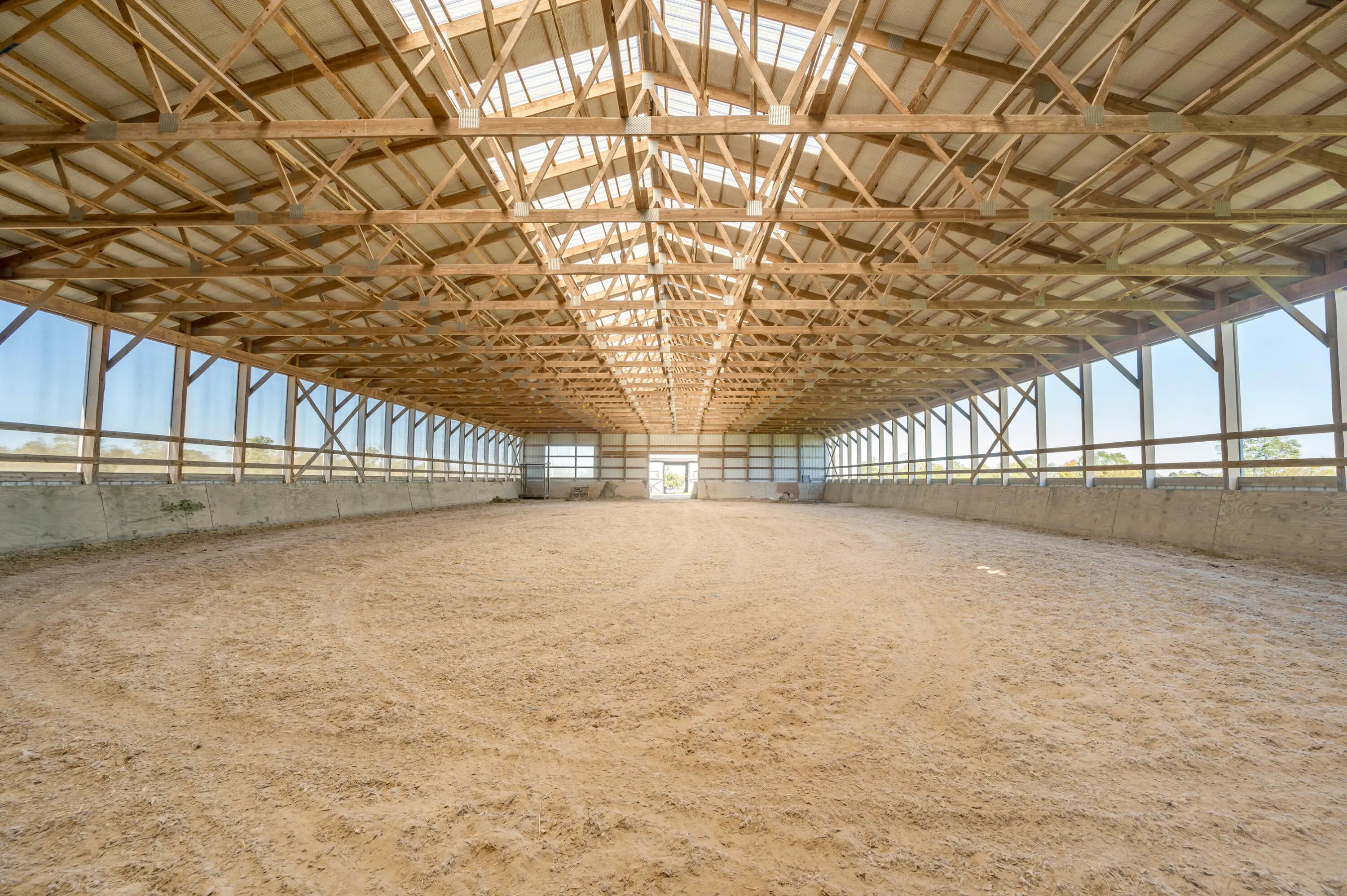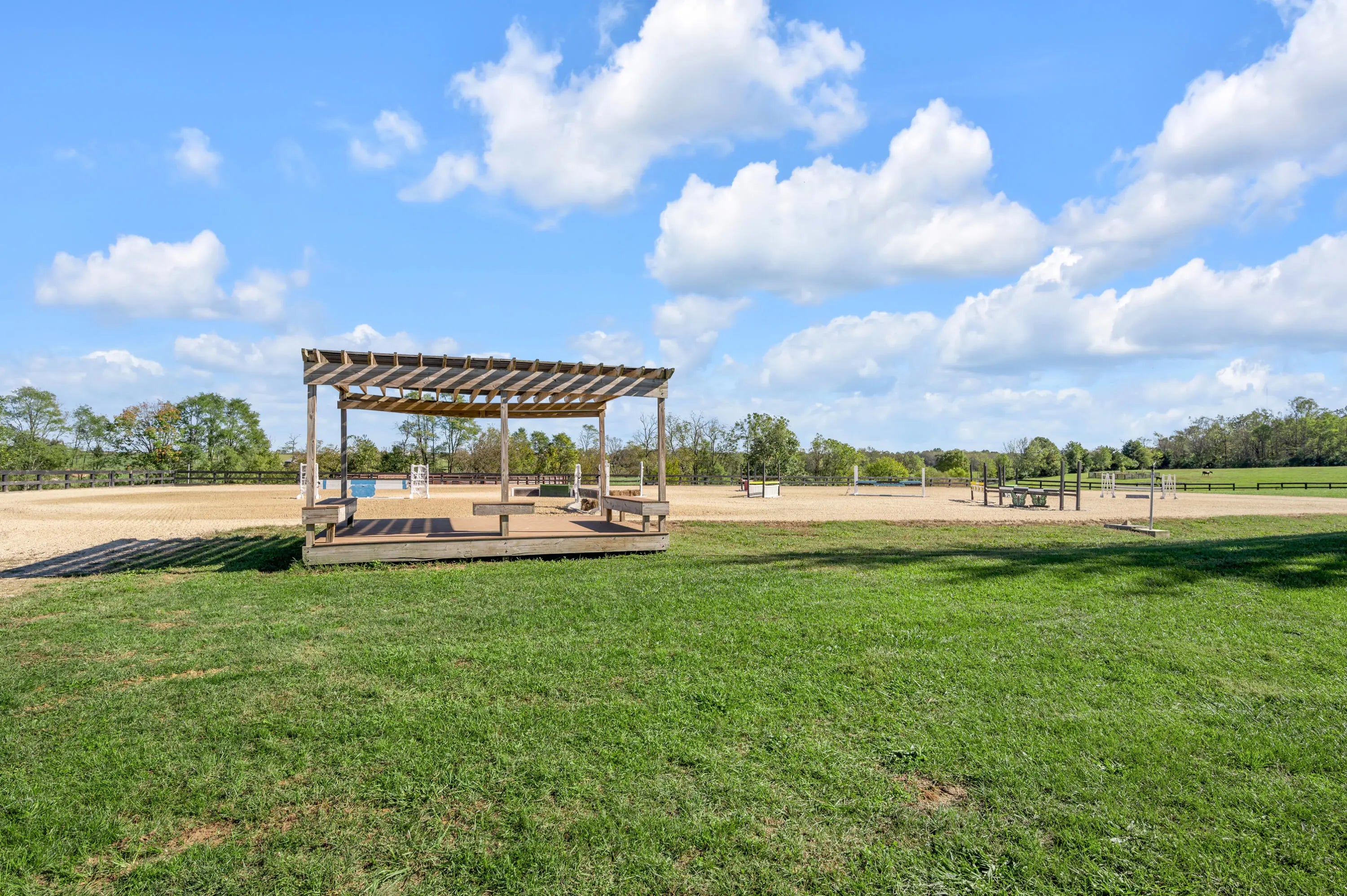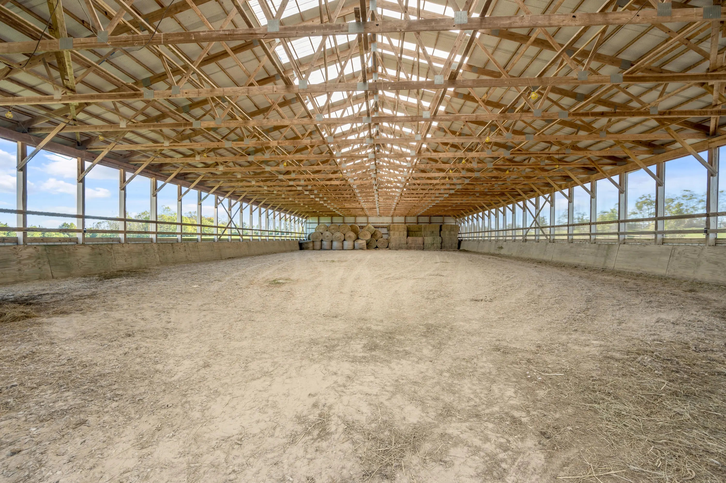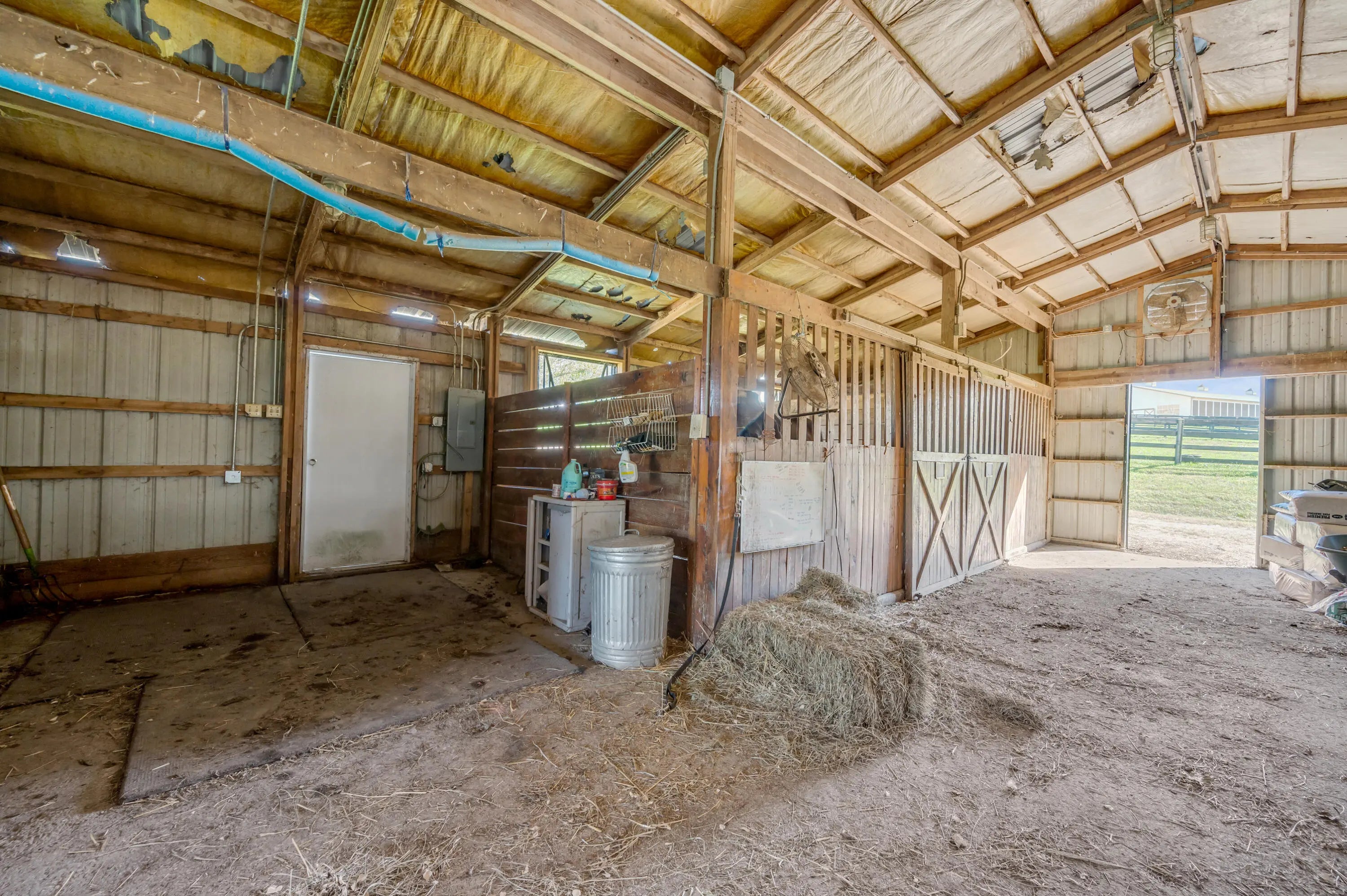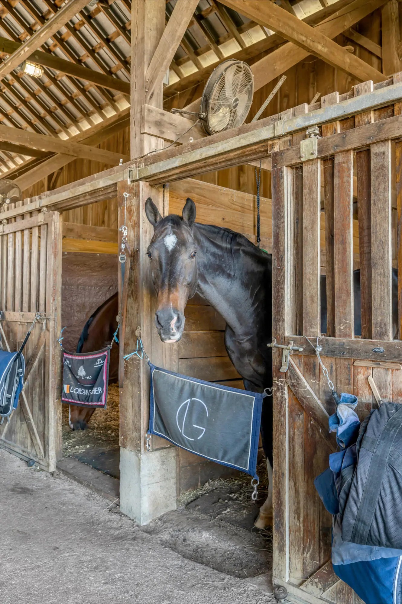 Discover this exceptional equestrian estate! Featuring four barns with a total of 49 stalls and spanning 46.45 acres, this property is ideal for professional horse enthusiasts. It offers a spacious 250'x125' outdoor arena and a 140'x72' indoor arena, both equipped with GGT footing. These arenas are irrigated using two water reclamation ponds. The two primary barns have been recently updated with new roofs, siding, and electrical systems. Additionally, there is an 80-foot round pen with Poly-Track footing. The property includes 11 grass paddocks and three large fields, perfect for retired horses and riding activities. The main residence, a 4-bedroom, 3-bathroom house, underwent a complete renovation in 2017, featuring beautiful oak wood flooring throughout and a chef's kitchen with high-quality stainless steel appliances, quartz countertops, and a tiled backsplash. The bathrooms are fitted with designer vanities, tiles, and fixtures. There are also one additional residences on the property: a 2-bedroom, 2-bathroom home, ideal for farm management or as guest accommodations.