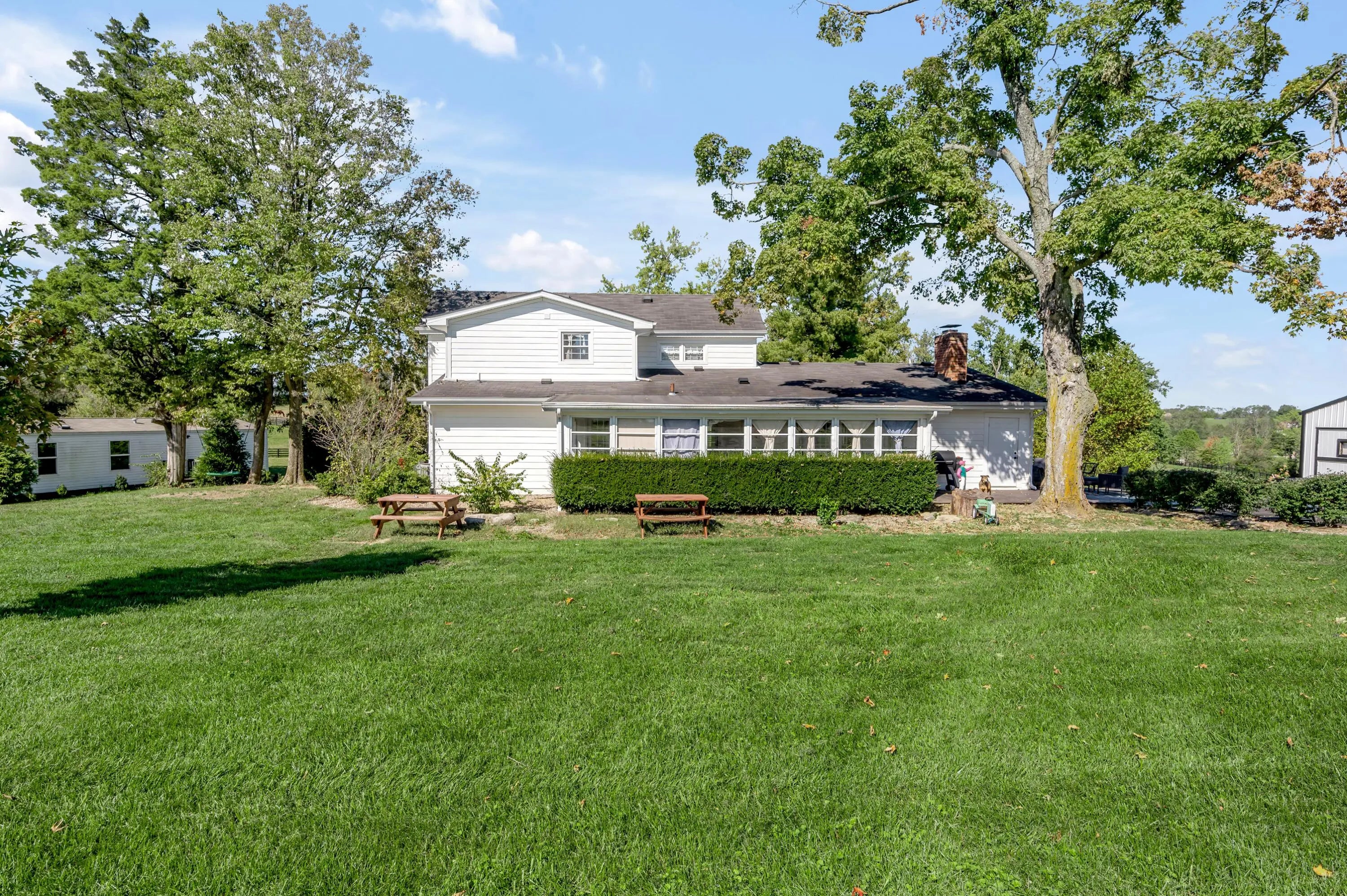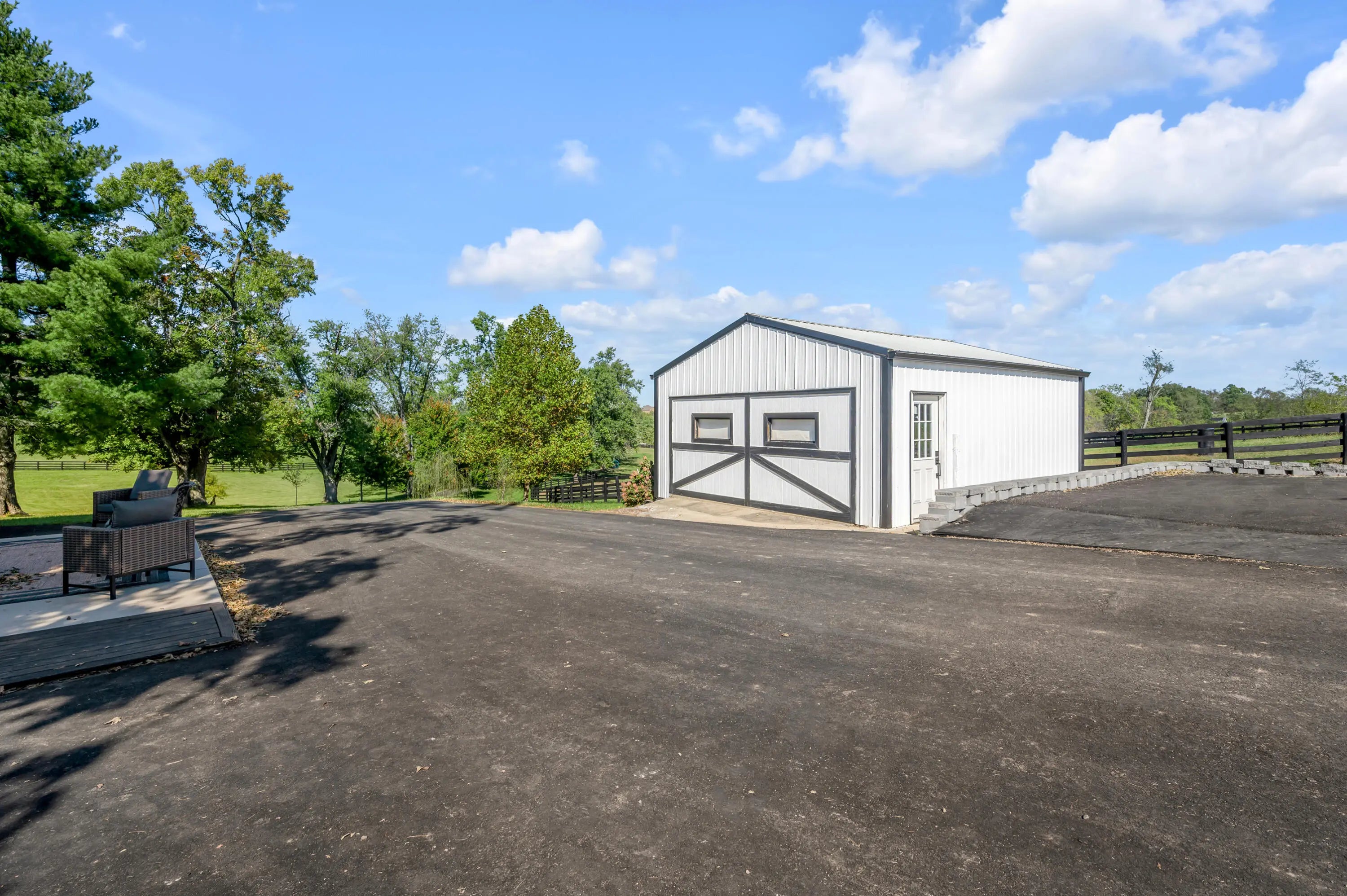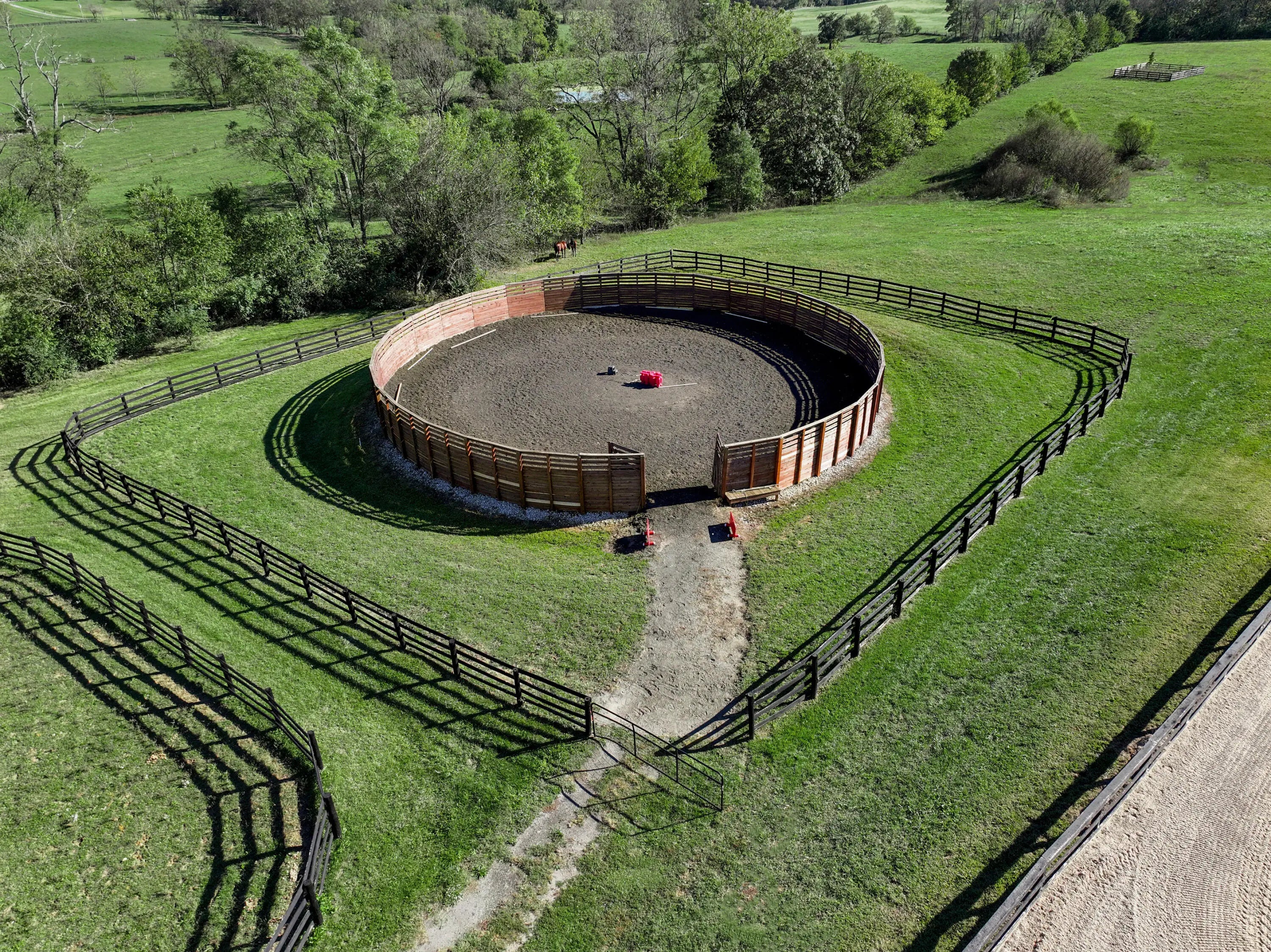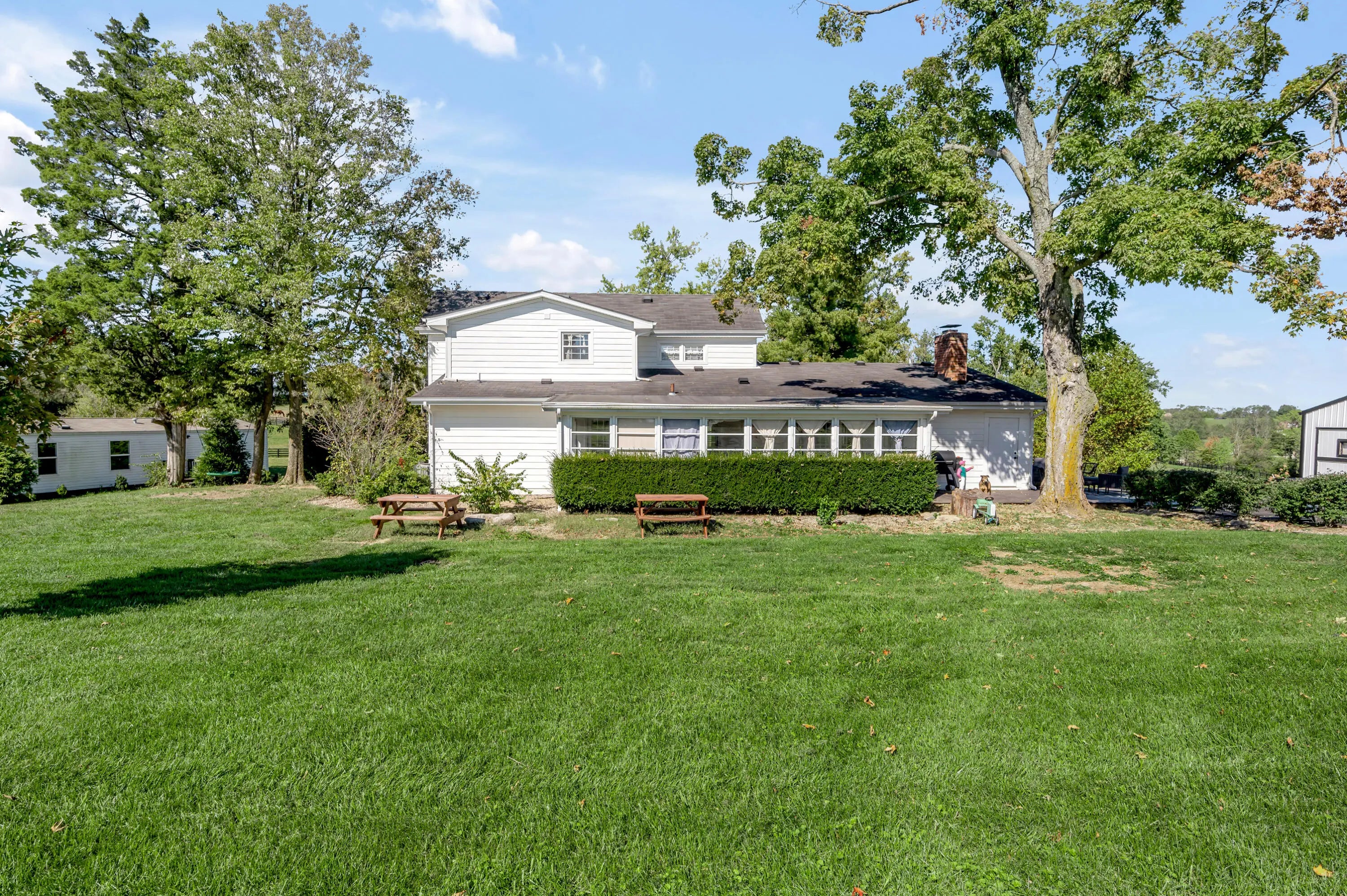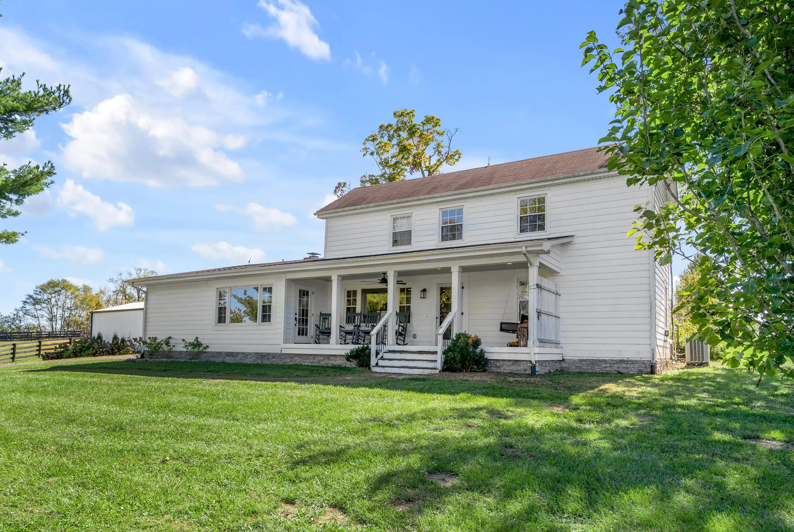 Discover this exceptional equestrian estate! Featuring four barns with a total of 49 stalls and spanning 46.45 acres, this property is ideal for professional horse enthusiasts. It offers a spacious 250'x125' outdoor arena and a 140'x72' indoor arena, both equipped with GGT footing. These arenas are irrigated using two water reclamation ponds. The two primary barns have been recently updated with new roofs, siding, and electrical systems. Additionally, there is an 80-foot round pen with Poly-Track footing. The property includes 11 grass paddocks and three large fields, perfect for retired horses and riding activities. The main residence, a 4-bedroom, 3-bathroom house, underwent a complete renovation in 2017, featuring beautiful oak wood flooring throughout and a chef's kitchen with high-quality stainless steel appliances, quartz countertops, and a tiled backsplash. The bathrooms are fitted with designer vanities, tiles, and fixtures. There are also one additional residences on the property: a 2-bedroom, 2-bathroom home, ideal for farm management or as guest accommodations.