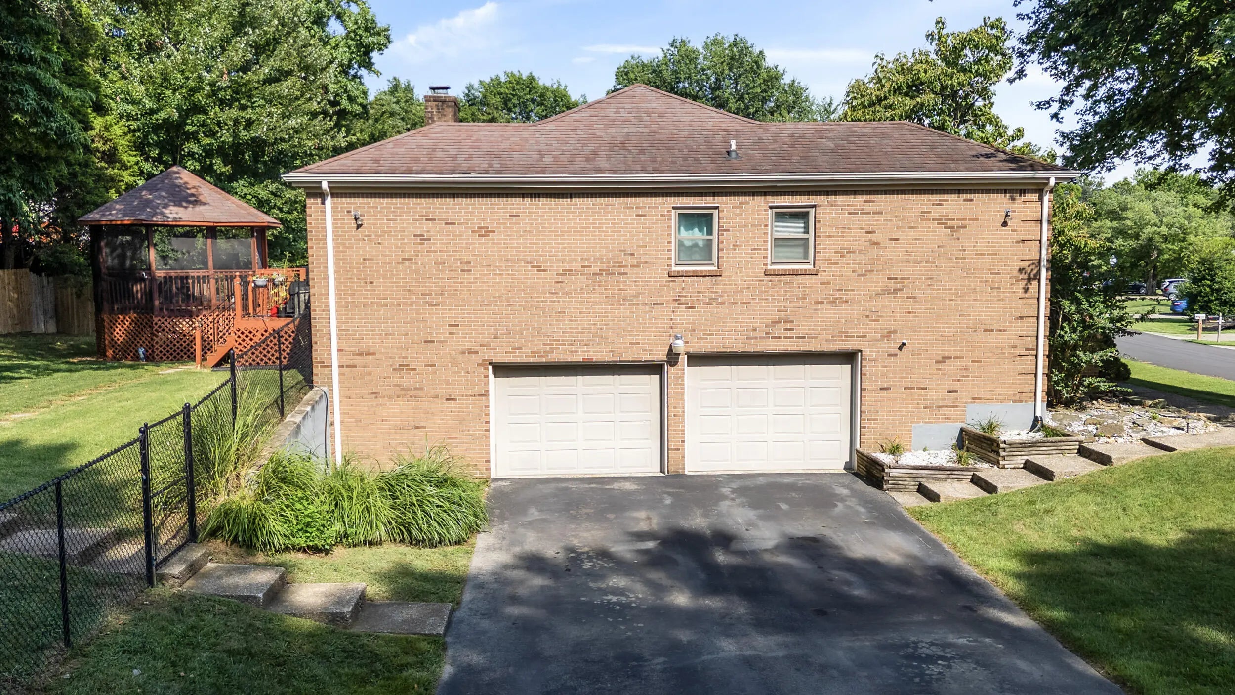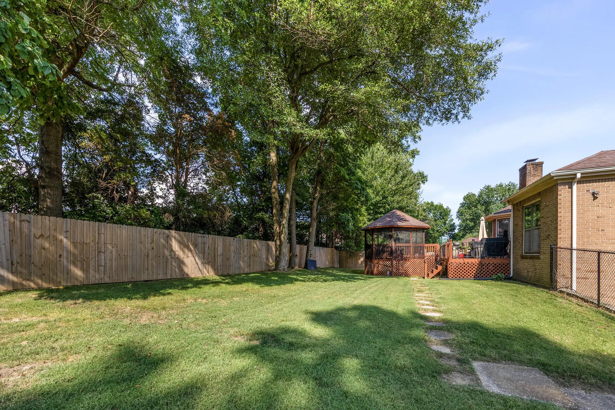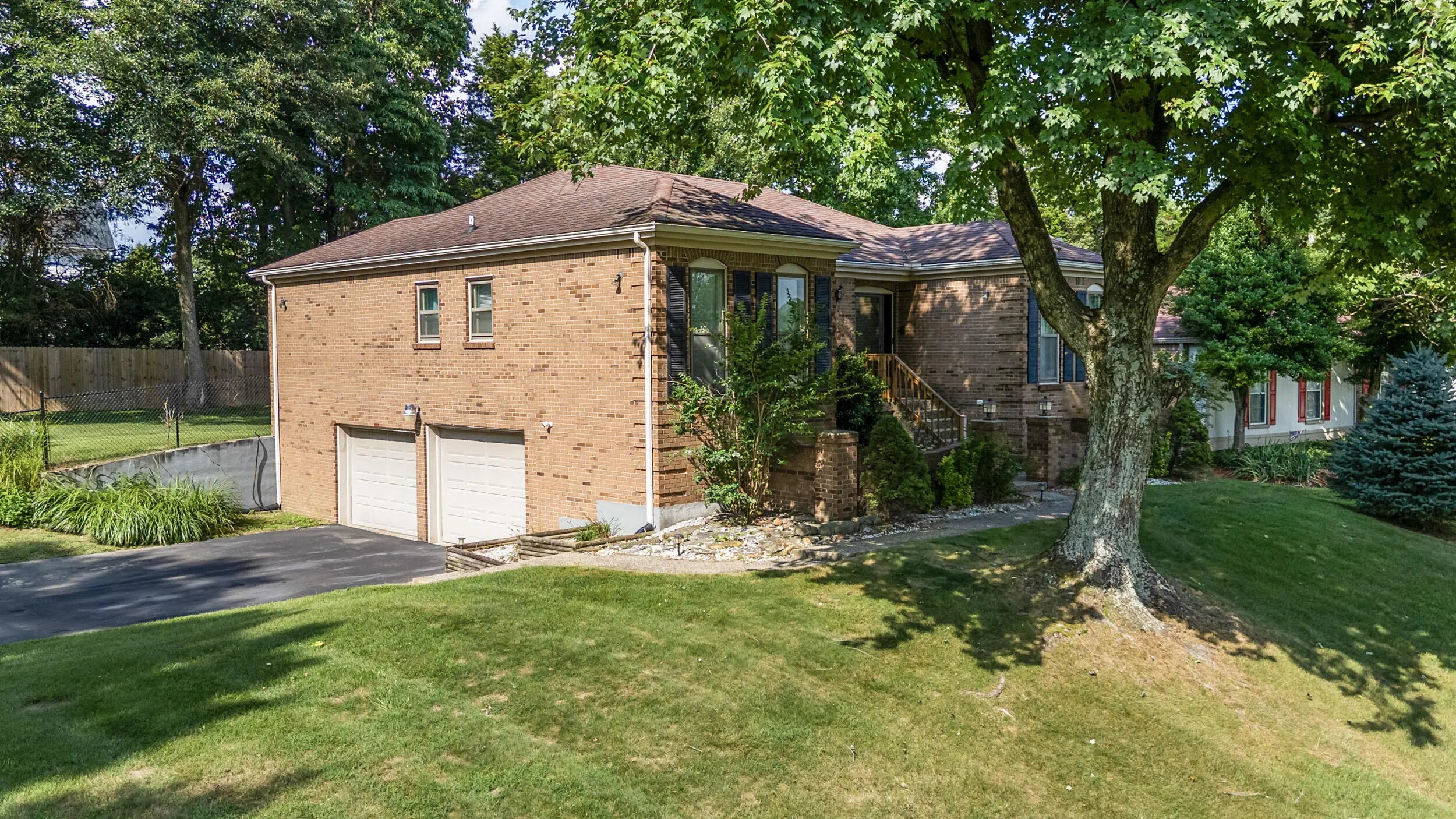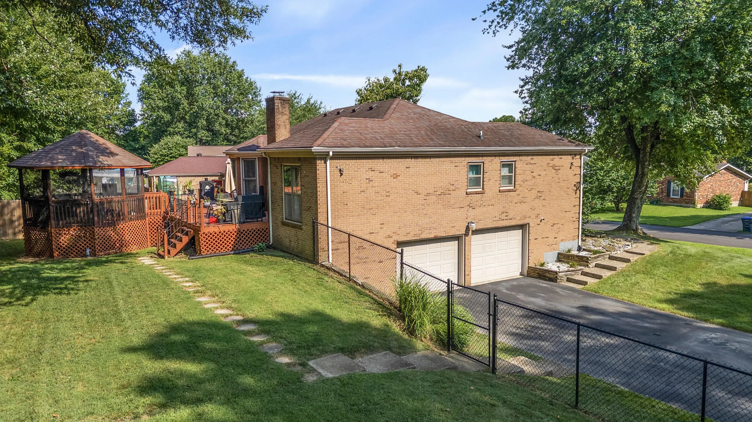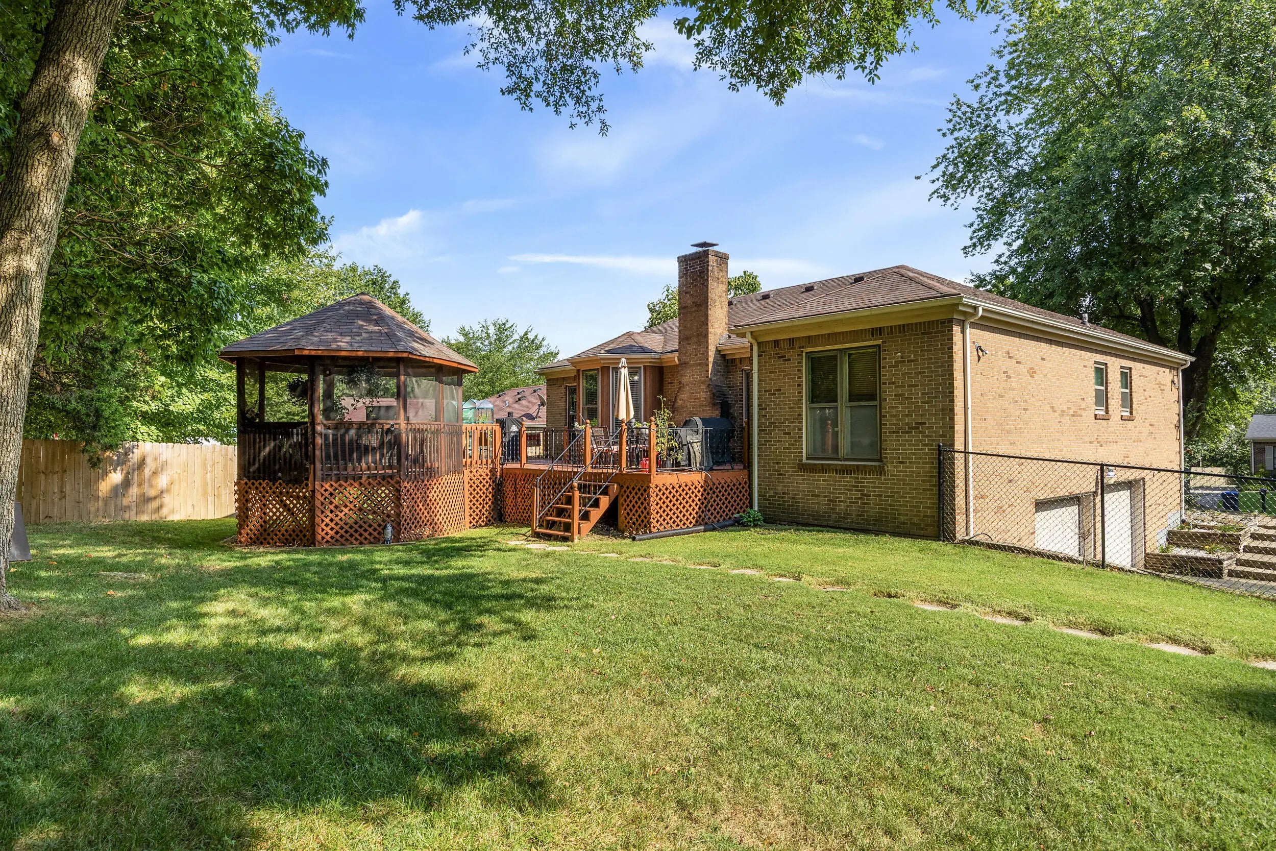 Charming all brick ranch offering 3 bedrooms, bonus room, 2 full bathrooms, attached 2 car garage and a finished basement! Desired location walking distance to Highview park, large corner lot, backyard fenced, no HOAs, under $320k! Step inside to find a warm and inviting layout. The living room features bold accent walls and opens into a formal dining area with crown molding and hardwood floors, ideal for hosting gatherings. A spacious family room boasts vaulted ceilings with wood beams, a striking brick fireplace, built-in shelving and French doors leading to the expansive private deck. The kitchen offers stainless steel appliances, and a cozy breakfast nook surrounded by windows for natural light and another walk out to the deck and gazebo! The main level includes 3 large bedrooms, including a primary suite with an updated double-sink vanity and walk in shower. The finished basement adds even more living space, featuring a versatile rec room, additional storage, and access to the 2-car garage. Outside, enjoy the fenced backyard with a large deck and a screened-in gazebo—ideal for entertaining, dining, or simply enjoying your morning coffee in peace. Perennial landscaping & mature trees provide shade and privacy, enhancing the home's curb appeal. Schedule your showing today!