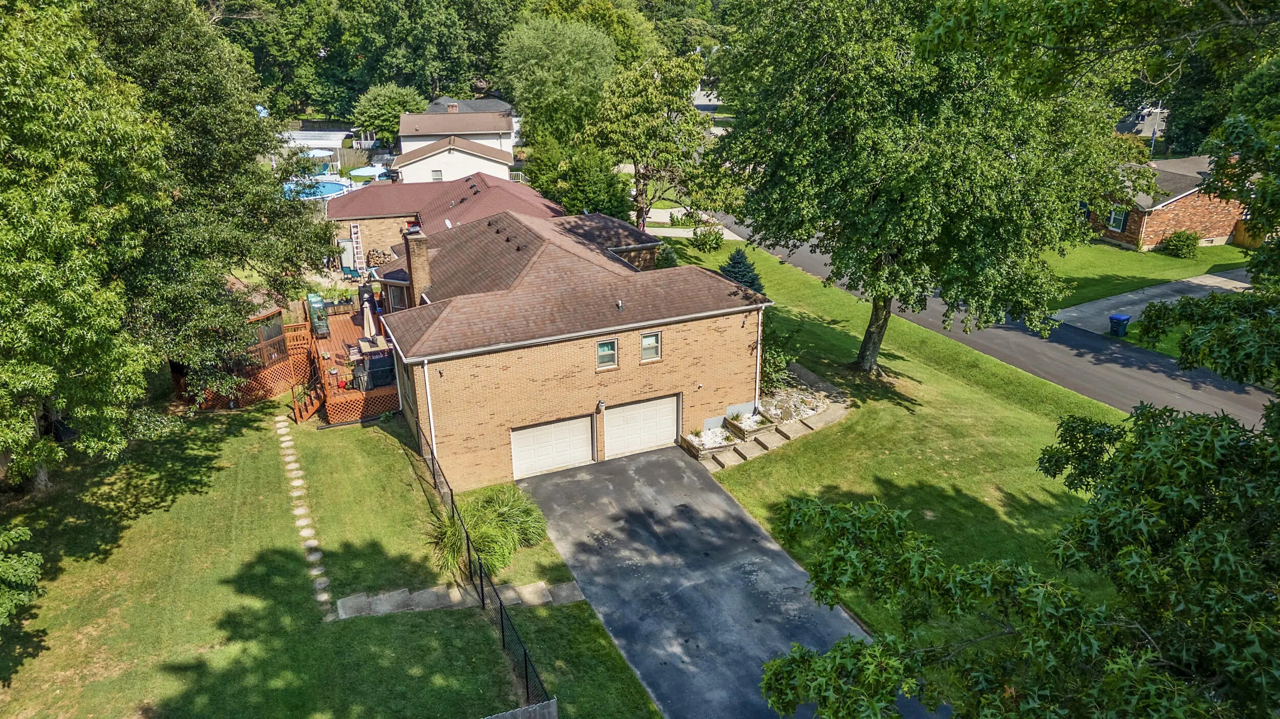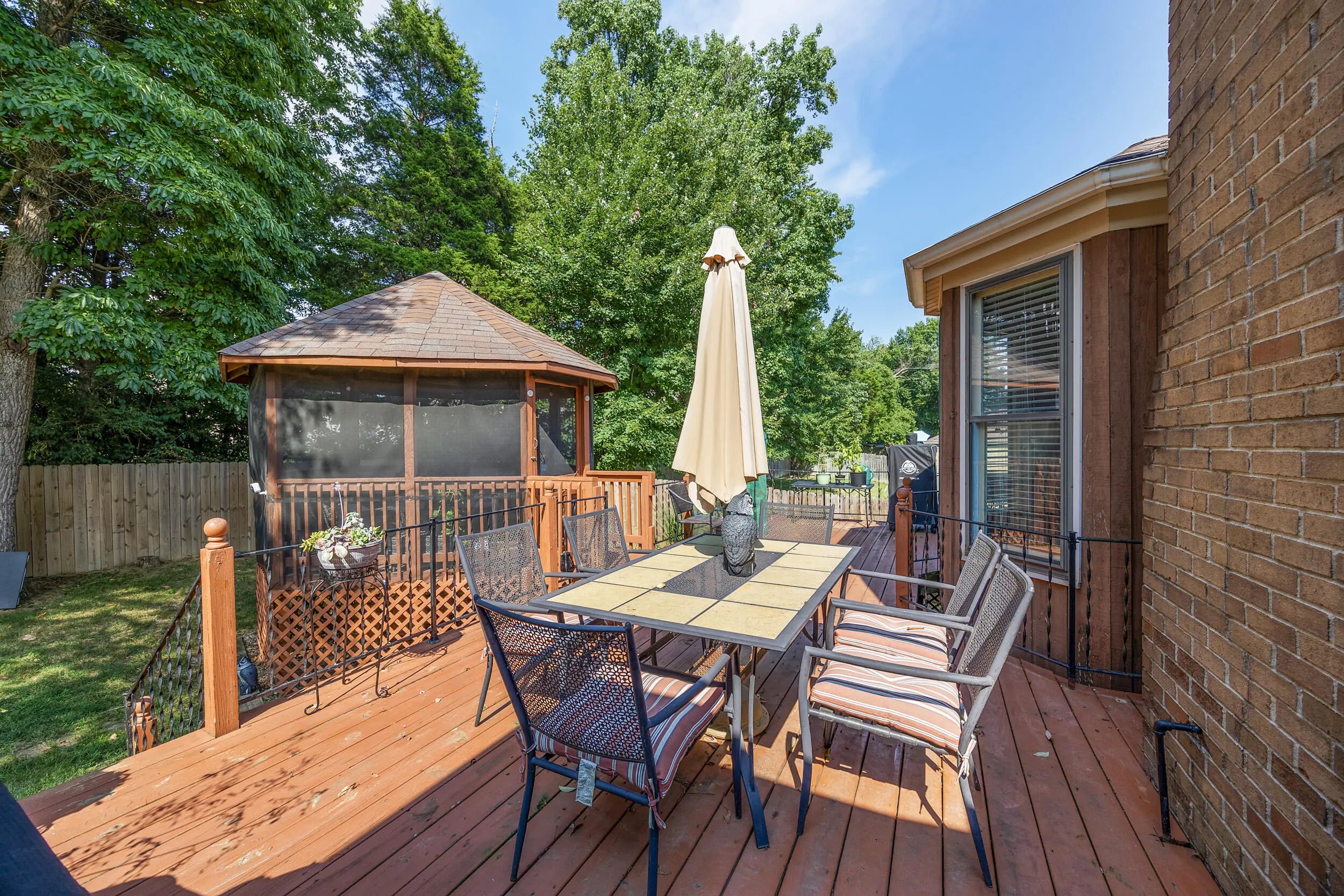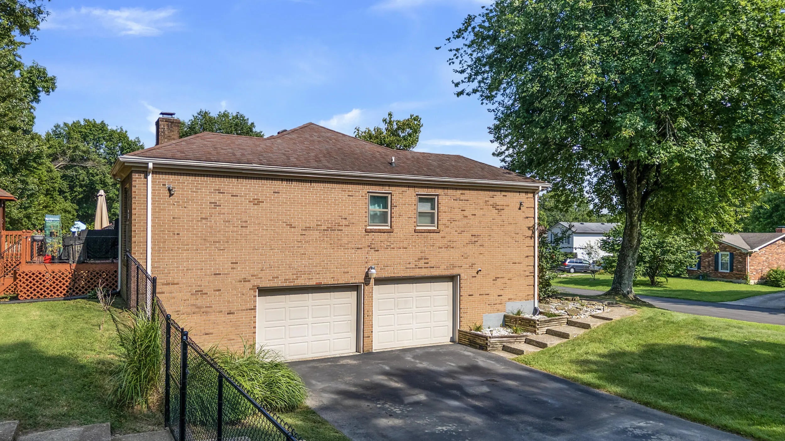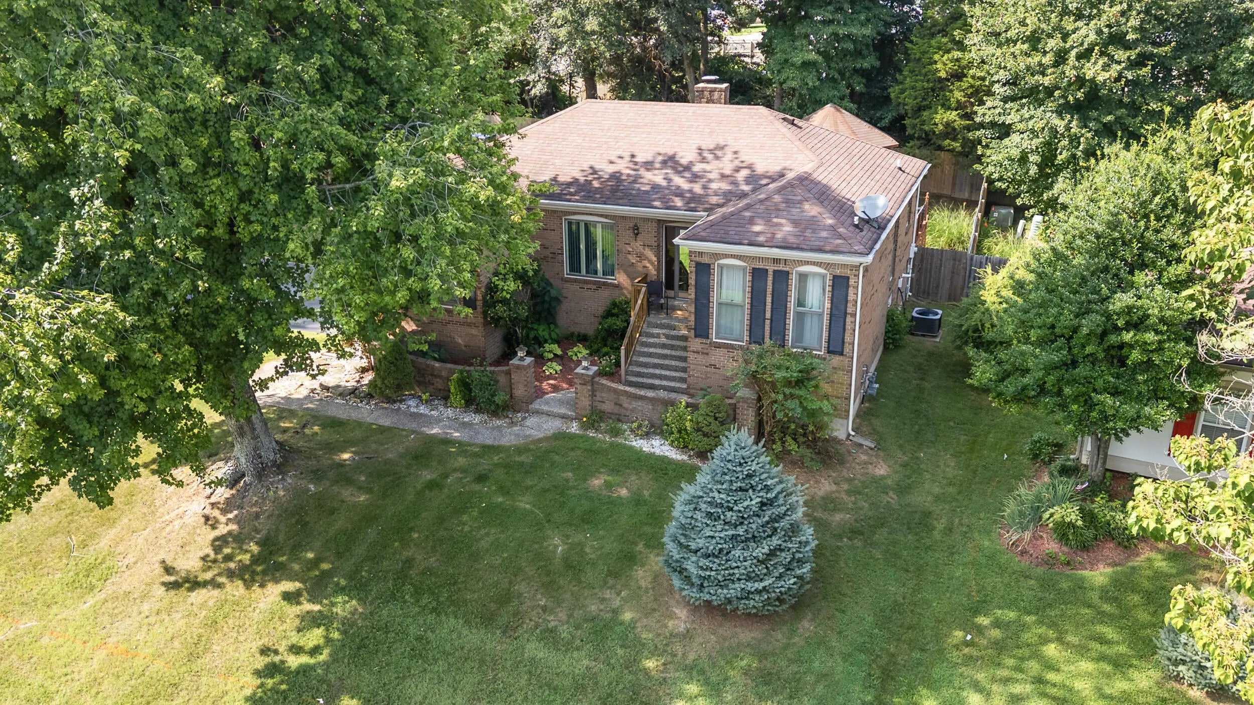 Charming all brick ranch offering 3 bedrooms, bonus room, 2 full bathrooms, attached 2 car garage and a finished basement! Desired location walking distance to Highview park, large corner lot, backyard fenced, no HOAs, under $320k! Step inside to find a warm and inviting layout. The living room features bold accent walls and opens into a formal dining area with crown molding and hardwood floors, ideal for hosting gatherings. A spacious family room boasts vaulted ceilings with wood beams, a striking brick fireplace, built-in shelving and French doors leading to the expansive private deck. The kitchen offers stainless steel appliances, and a cozy breakfast nook surrounded by windows for natural light and another walk out to the deck and gazebo! The main level includes 3 large bedrooms, including a primary suite with an updated double-sink vanity and walk in shower. The finished basement adds even more living space, featuring a versatile rec room, additional storage, and access to the 2-car garage. Outside, enjoy the fenced backyard with a large deck and a screened-in gazebo—ideal for entertaining, dining, or simply enjoying your morning coffee in peace. Perennial landscaping & mature trees provide shade and privacy, enhancing the home's curb appeal. Schedule your showing today!