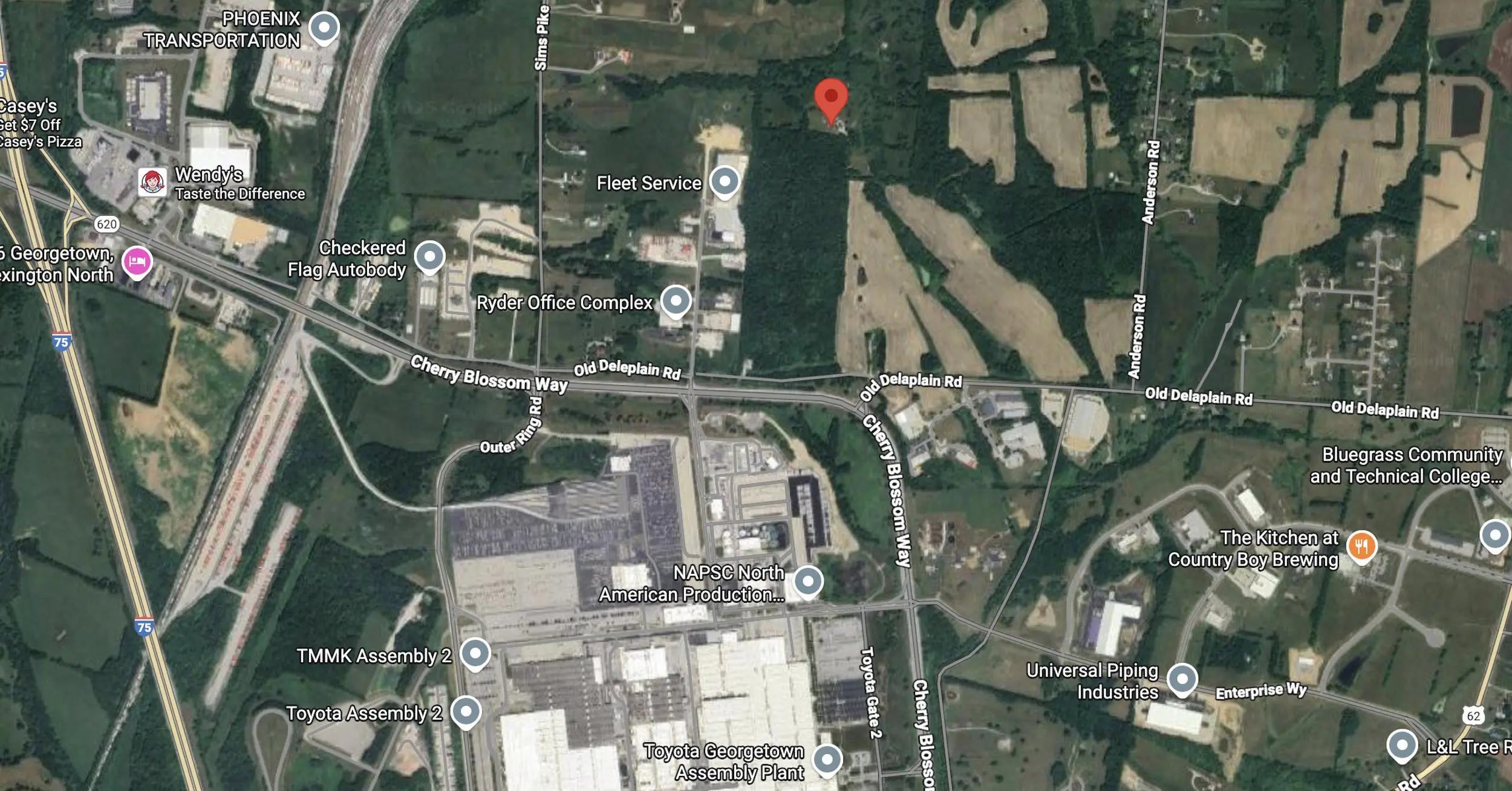 A noteworthy opportunity for investors and developers for over 40 acres of land situated near Toyota Motor Manufacturing and I-75 in Georgetown. The property is currently zoned A-1, with 13 acres within the Georgetown-Scott County Comprehensive Plan FLU, indicating a potential zone change for Industrial Use. The properties situated to the south and west are designated as I-1 and are incorporated within the Georgetown municipal boundaries. Prime real estate in a prime location, offering endless possibilities, and conveniently located off Cherry Blossom Way, just 1.5 miles from 1-75. Nearby businesses include Toyota Motor Manufacturing (currently employing over 9,500), Aichi Forge, ORBIS, and Lanes Run Business Park. Consistently recognized as one of Kentucky's fastest-growing markets, Georgetown continues to experience ongoing expansion across all sectors. This property's strategic location is conducive to growth and business success. Its prime position facilitates convenient access to essential services, transportation networks, and valuable business resources, thereby fostering an environment in which enterprises can flourish.