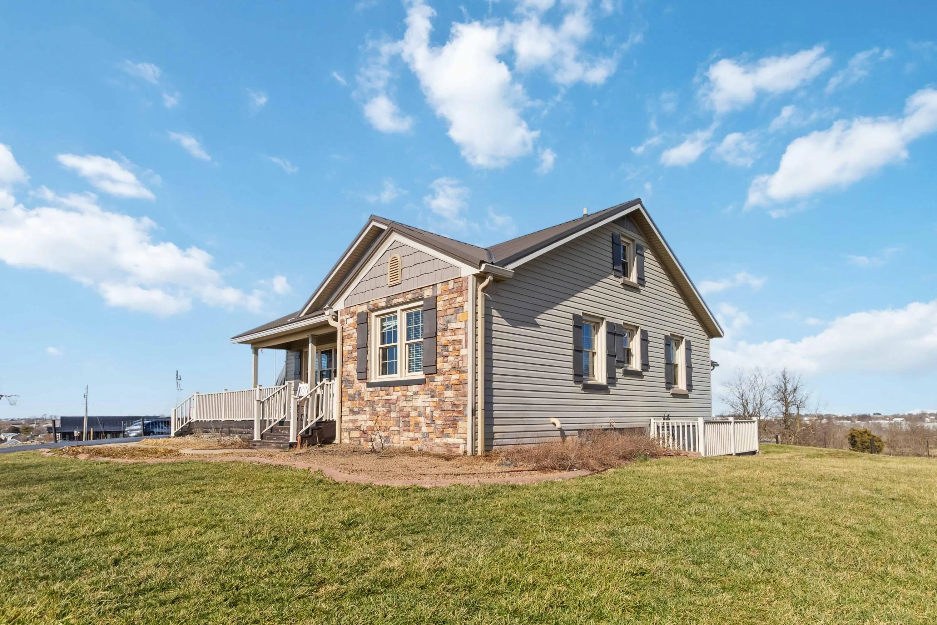 Nestled on 9 picturesque acres in Harrodsburg, this beautifully maintained property offers privacy, versatility, and exceptional amenities. The main residence features 3 bedrooms, 2 full bathrooms, plus a spacious loft ideal for a fourth bedroom, home office, or hobby space. Inside, take note of the stunning stone gas fireplace, custom built-ins, and premier luxury vinyl plank flooring throughout. The inviting eat-in kitchen boasts stainless steel appliances, granite countertops, and bar seating, perfect for everyday living or entertaining. The primary suite includes a walk-in closet and an updated en-suite bathroom. An unfinished walk-up basement provides abundant storage and is already equipped with a shower and drain, offering excellent potential to finish the space to suit your needs. Outdoor living truly shines with a wrap-around deck, tiki bar, and patio, ideal for relaxing or hosting gatherings while enjoying the peaceful surroundings. The impressive 40x30 detached garage features 9-foot doors, water, 220V electric, and a concrete floor. A guest apartment has been added to the garage, making it perfect for visiting family and friends or as an income-producing rental. Currently utilized as a body shop, the garage offers endless possibilities, including conversion to horse stables or other hobby or business uses. This one-of-a-kind property seamlessly blends comfort, function, and opportunity—an exceptional find with room to live, work, and grow.