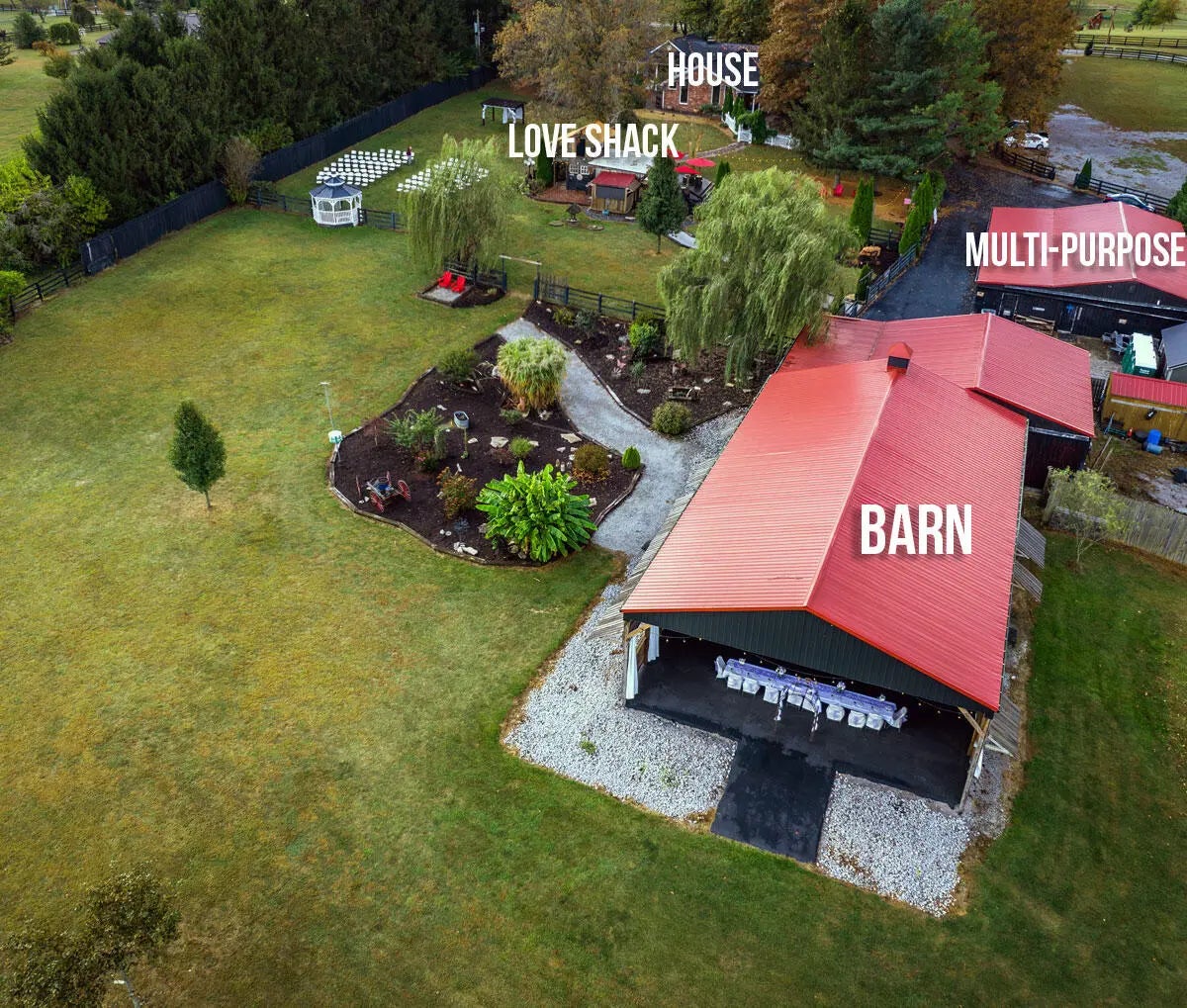 Where life's best moments unfold. Imagine owning a place where memories are made. This exceptional farm offers the perfect blend of charm, versatility, and opportunity — ideal as a wedding venue, event destination, equestrian property, or your own private piece of paradise. Picture elegant ceremonies beneath open skies, lively receptions in a dedicated event space, and unforgettable family reunions where generations gather and celebrate together. At the heart of the property sits a beautifully designed ranch-style brick home, combining comfort with timeless style. Featuring wood plank vaulted ceilings and an open, inviting floor plan, the home offers a spacious family room perfect for entertaining and everyday living. The kitchen showcases granite countertops and generous gathering space, complemented by three large bedrooms, three full baths, and both gas and wood-burning fireplaces that create warmth and character throughout. Step outside to enjoy an expansive patio and covered wrap-around porch, where peaceful countryside views provide the perfect backdrop for quiet mornings or sunset evenings. A two-car garage adds convenience and functionality to this thoughtfully designed residence. Beyond the home lies an extraordinary event-ready setting. The fully equipped event barn creates an ideal space for weddings and celebrations, while an outdoor bar with its own restroom enhances the guest experience. A versatile multi-purpose building expands the possibilities, featuring a welcoming foyer, two offices, bathroom, changing room, bridal suite, man cave, wood shop, and ample storage — making the property equally suited for business, hobbies, or creative pursuits. Fully fenced with a dedicated parking paddock, this rare offering combines privacy, beauty, and income potential into a turn-key opportunity to live, work, and celebrate in one remarkable location. Conveniently located just 1 mile from Tates Creek Road in Lexington and 3 miles from Lexington Road in Nicholasville, tucked behind Brannon Crossing, this property provides peaceful country living with easy access to city amenities.