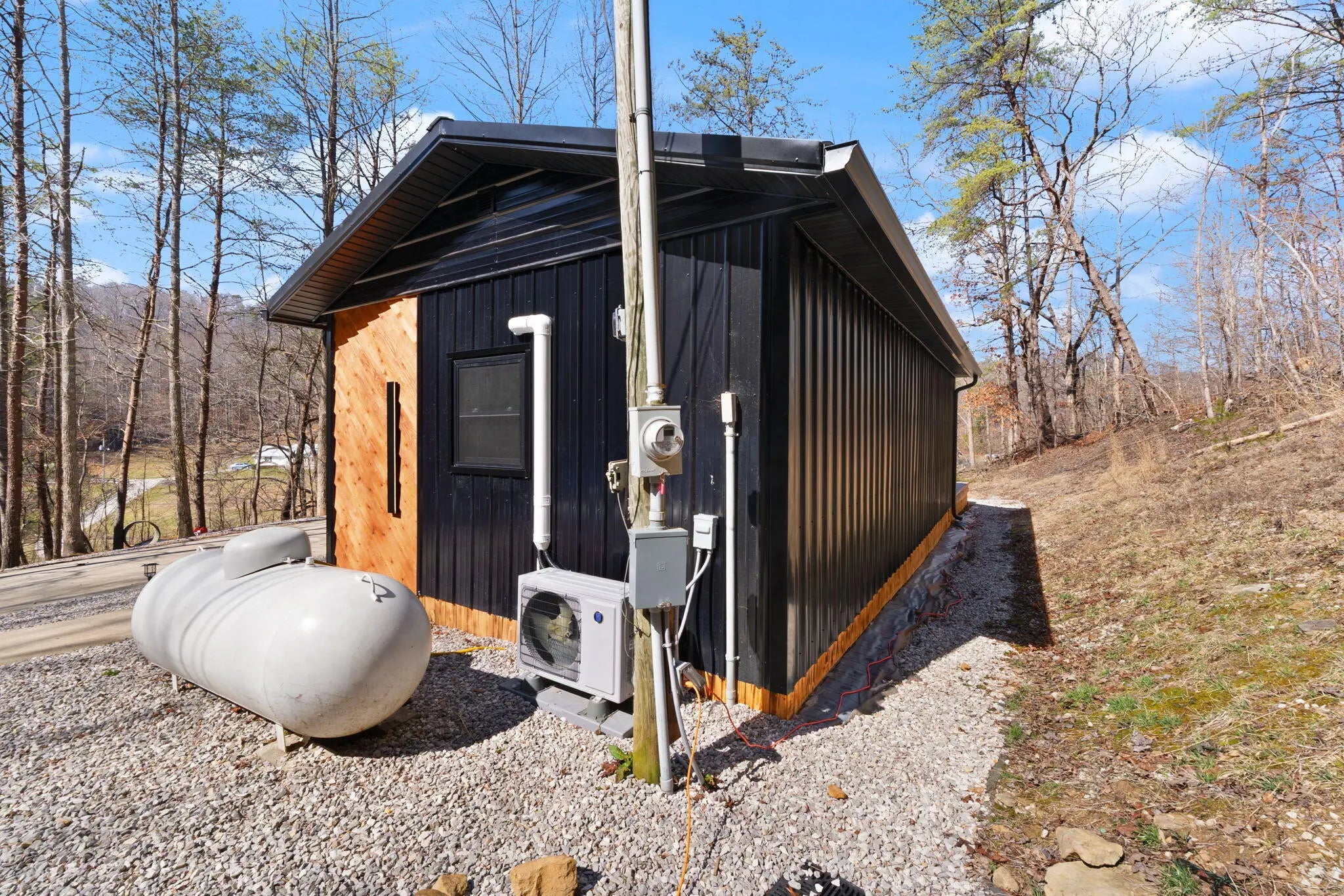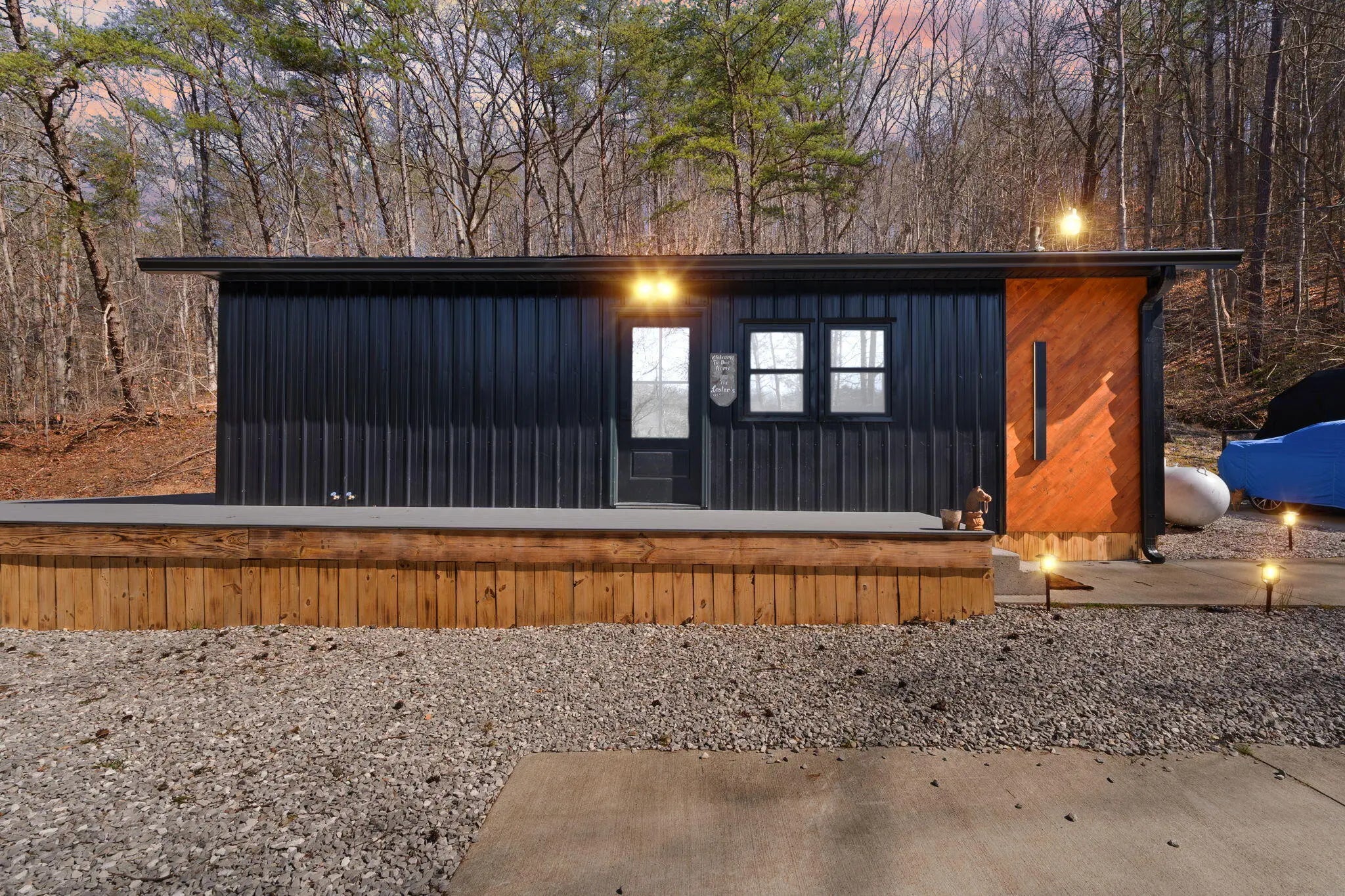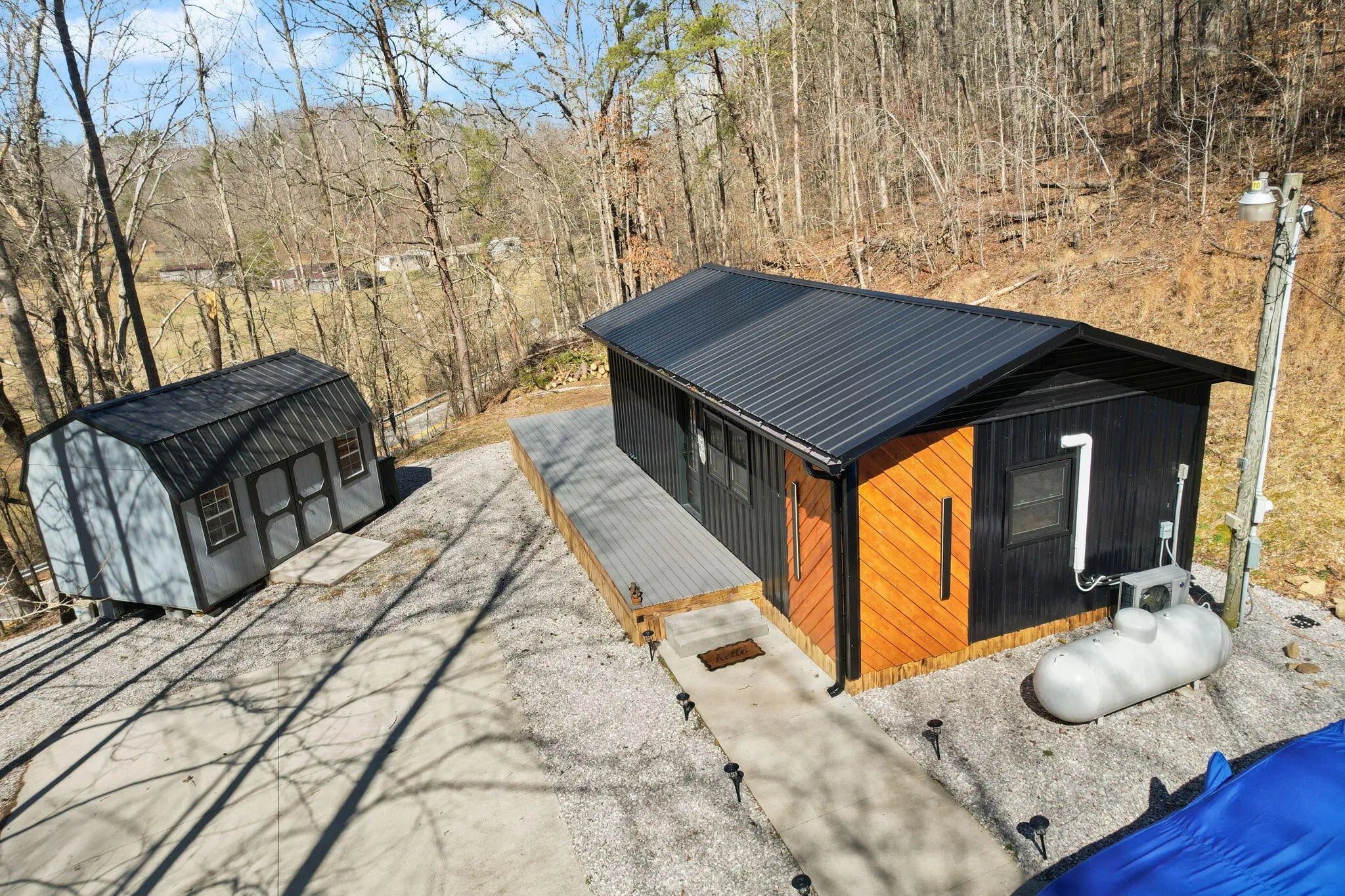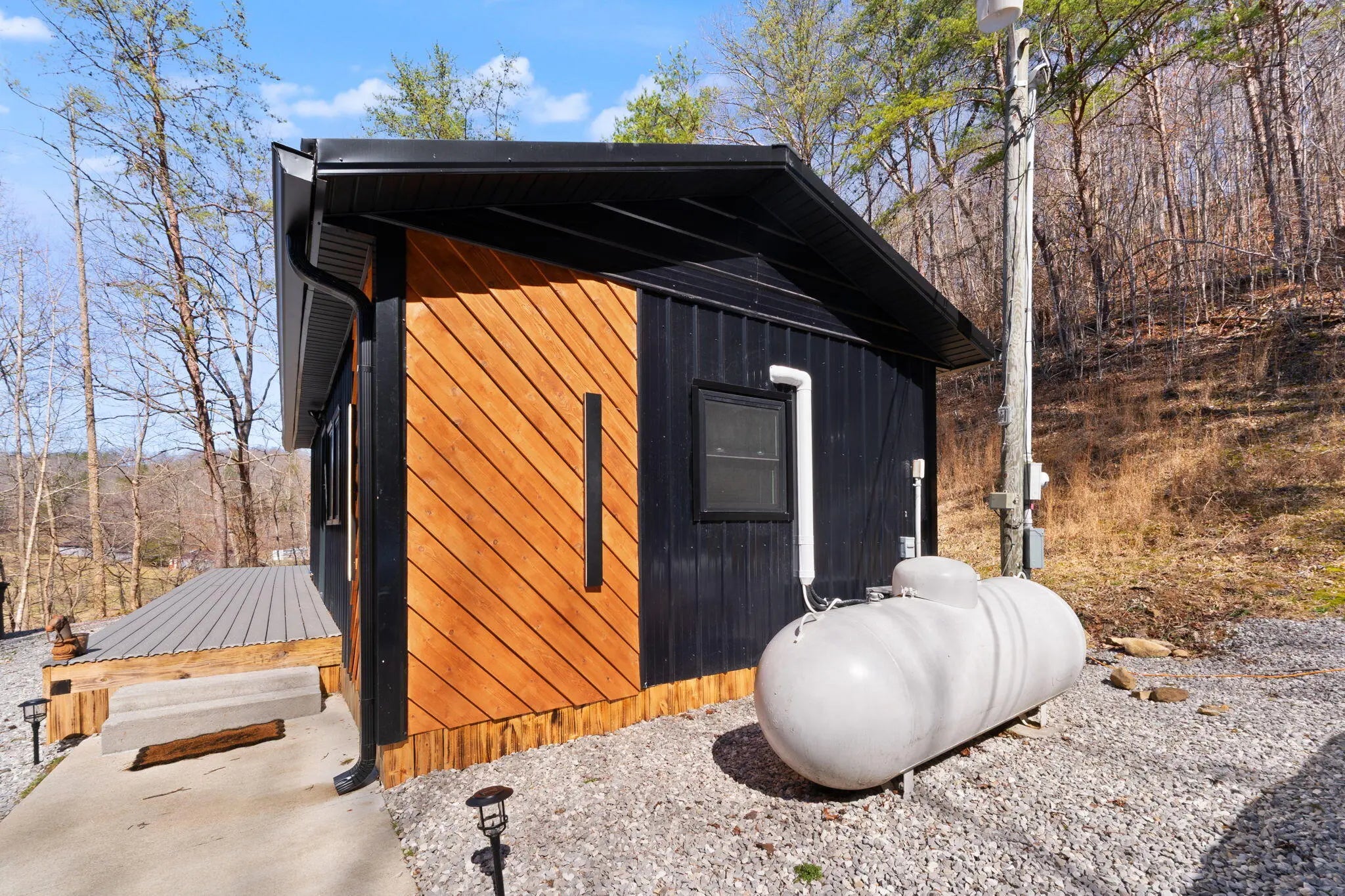 Tucked behind a private gate and set against the hillside on 9.02 surveyed acres, this fully reimagined modern cabin retreat delivers luxury tiny living without sacrificing comfort, style, or convenience. If you've been waiting for something different, something intentional, something unforgettable, this is it. Completely gutted and rebuilt, this 515 sq ft custom home was designed to live big. The open concept layout flows effortlessly, anchored by a stunning custom kitchen featuring a gas range, modern cabinetry, and a functional island that doubles as a backup propane heating source. Every detail was thought through. From the hardwood floors throughout to the tile bath, this home feels like a boutique hotel suite tucked into the woods. The queen-size Murphy bed transforms the living space in seconds, allowing you to maximize every square foot. A full-size washer and dryer are thoughtfully positioned for true everyday livability. The living area is finished with a wall-mounted TV setup and LED accent lighting surrounding the mantle for a sleek, modern feel. Ceiling fans and a split unit provide efficient heating and cooling year-round, while the owned propane tank offers peace of mind in colder months. The bathroom is next-level for a home this size, complete with a stand-up shower, smart toilet, and smart mirror. It is modern, clean, and elevated. Outside, the charm continues. Board and batten siding paired with metal accents and a metal roof give this home a refined cabin-top aesthetic. A wraparound deck invites you to sit, breathe, and listen to nothing but the woods. When it rains, a natural runoff creates a waterfall effect along the small cliffs and caves scattered across the property. It is peaceful. It is private. It feels like your own hidden retreat. The land itself offers opportunity. There is a small trail system already in place and an additional cleared area where a manufactured home once sat, giving potential for expansion or another dwelling. A nice storage building adds extra functionality. The concrete driveway provides ample parking for multiple vehicles, boats, or side-by-sides. Located just 20 minutes to Corbin and approximately 15 minutes to both London and Barbourville, you get seclusion without isolation. Hospitals, shopping, restaurants, and everyday necessities are all within easy reach. Electric, city water, and septic are already in place. This property is ideal for the minimalist who refuses to compromise on style, the hunter or nature lover seeking a private basecamp, or anyone looking for a modern getaway with room to explore. Opportunities like this rarely come to market. It is not just a tiny house. It is a lifestyle shift. Schedule your private showing and experience it in person.