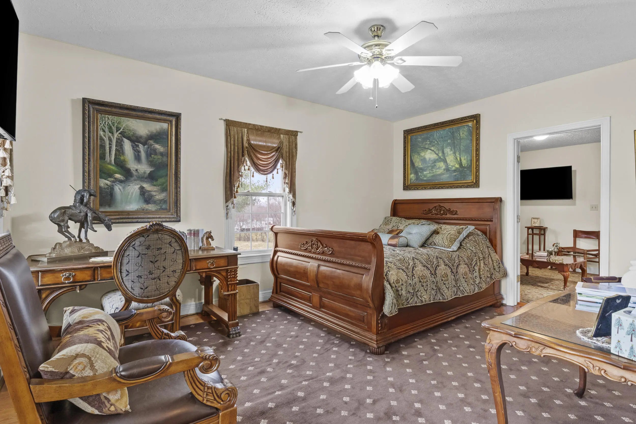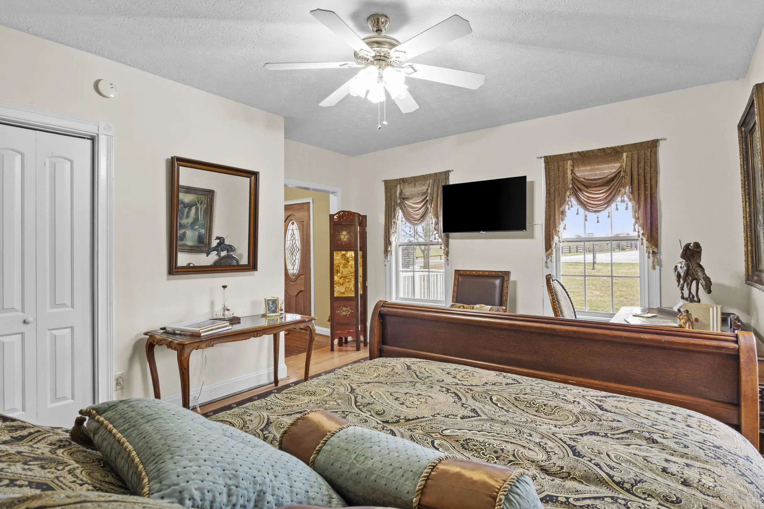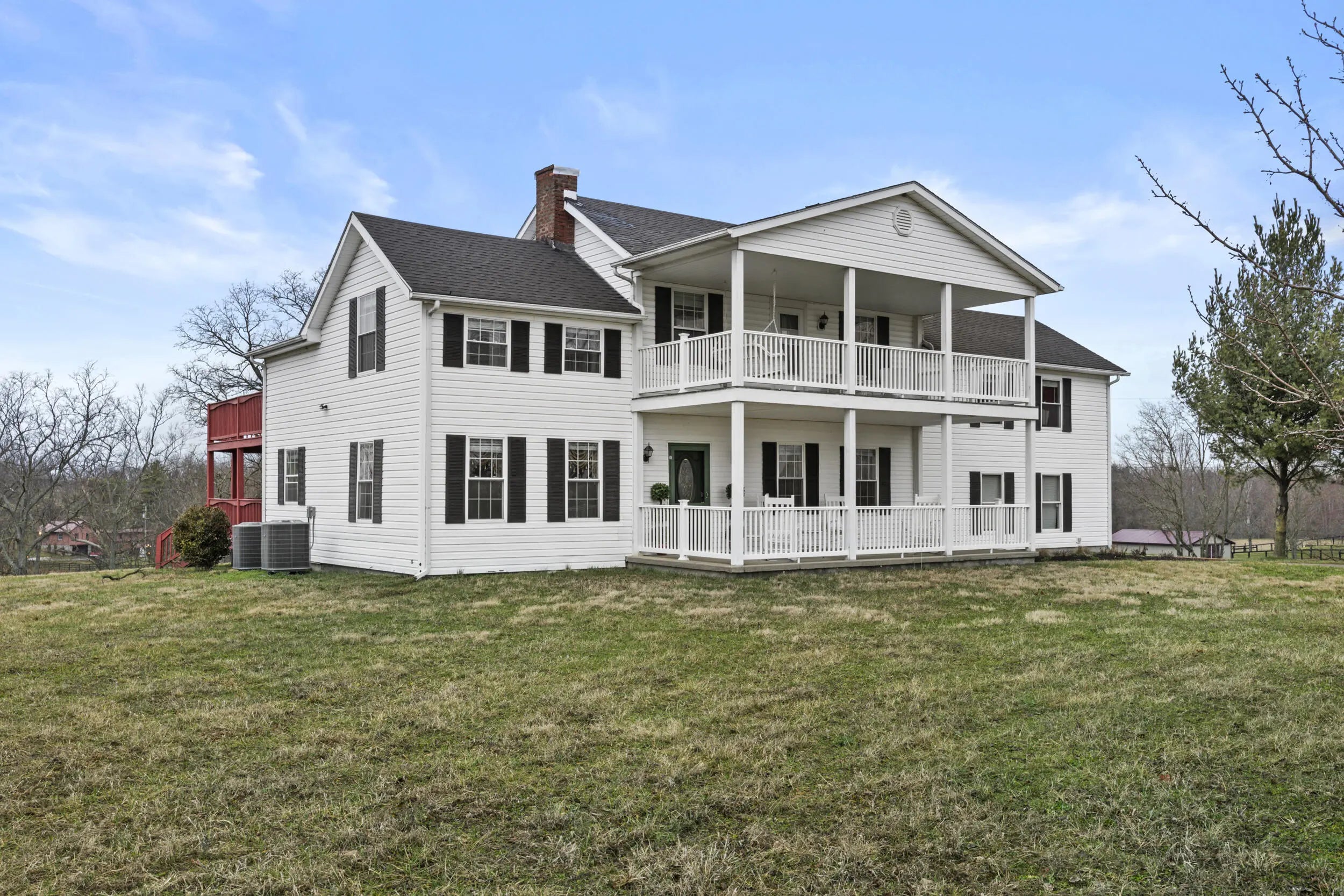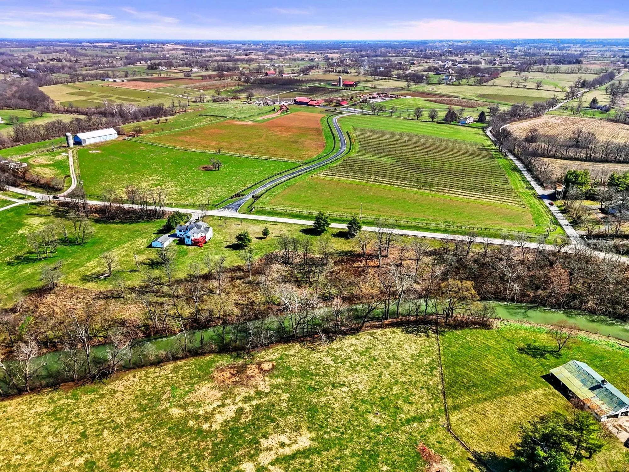Wow! This rare Southern Colonial Revival-style home on approximately 5.0 acres is now being offered by its long-time owners. Located across from Evans Orchard and just minutes from the Kentucky Horse Park, Fasig Tipton, The Red Mile, historic Keeneland, the Ark Encounter, and downtown Lexington, while overlooking scenic Elkhorn Creek. Whether you're searching for a turn key higher end rental opportunity, a primary residence, or a secondary Bluegrass getaway, this property offers exceptional versatility. The grounds feature five flat, usable acres and capture the charm and character that Kentucky countryside living is known for. Throughout the home, you'll find inviting access to the outdoors, with multiple decks and porches that allow you to fully enjoy the surrounding landscape. Each themed room tells its own story, with five bedrooms and two full baths providing ample space to entertain guests and escape. With favorable zoning, the property also offers flexibility for a variety of potential uses and future possibilities. Upon entering the front foyer, you're welcomed by a gorgeous staircase and a charming fireplace that immediately sets the tone for the home's character. Additional features include some hardwood flooring, 8x8 picture windows placed in various bedrooms, unique lighting fixtures, a spacious utility room, alongside a bar and coffee room! The property also features a large attached garage and a detached two-car garage, offering abundant space for parking, storage, hobbies, equipment, or workshop use. For added peace of mind, the HVAC system is less than one year old, and the hot water heater was replaced just a few years ago. If you've been hoping to find a place where southern charm and graciousness still prevail, come experience one of Georgetown, Kentucky's most distinctive properties...