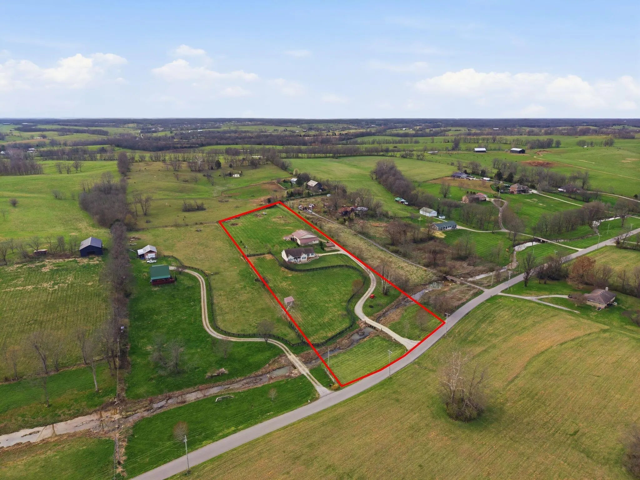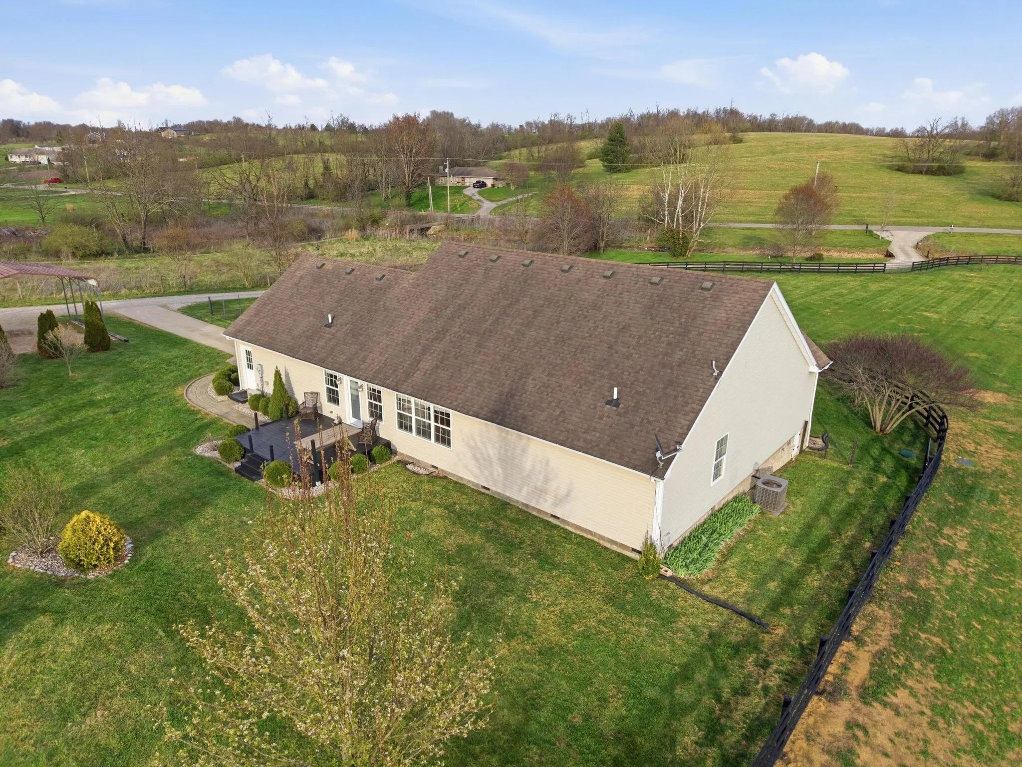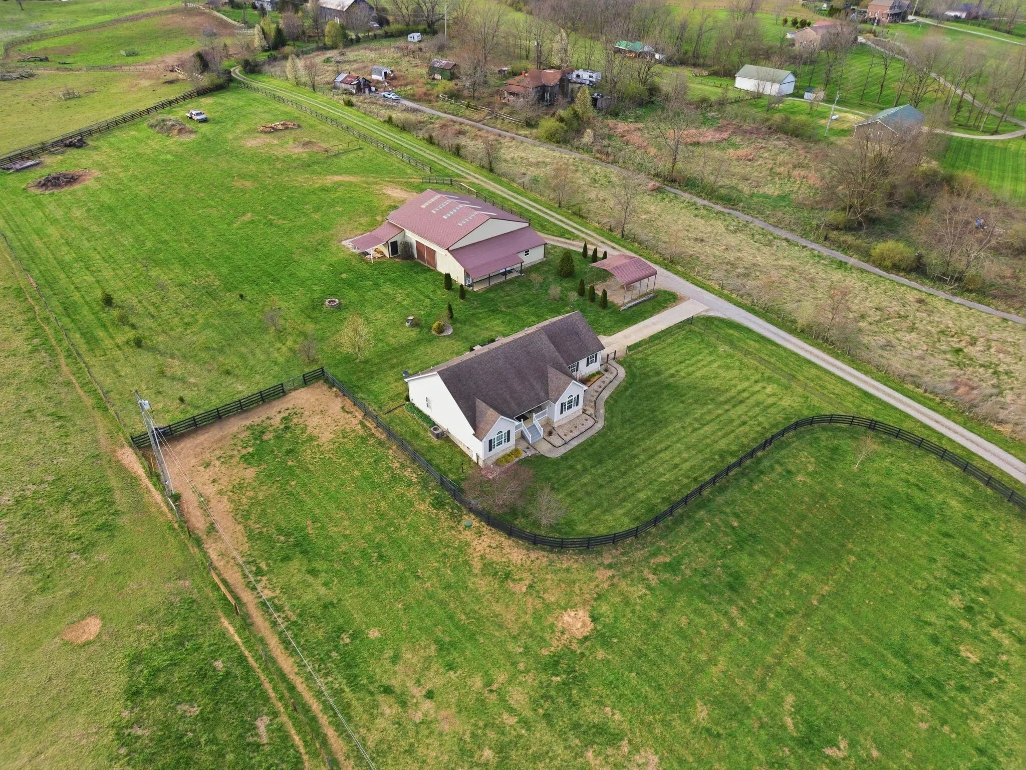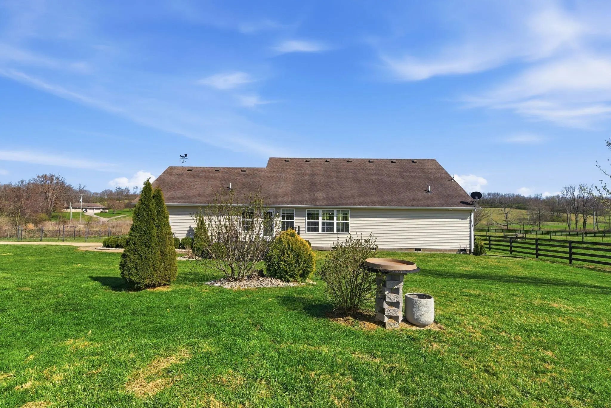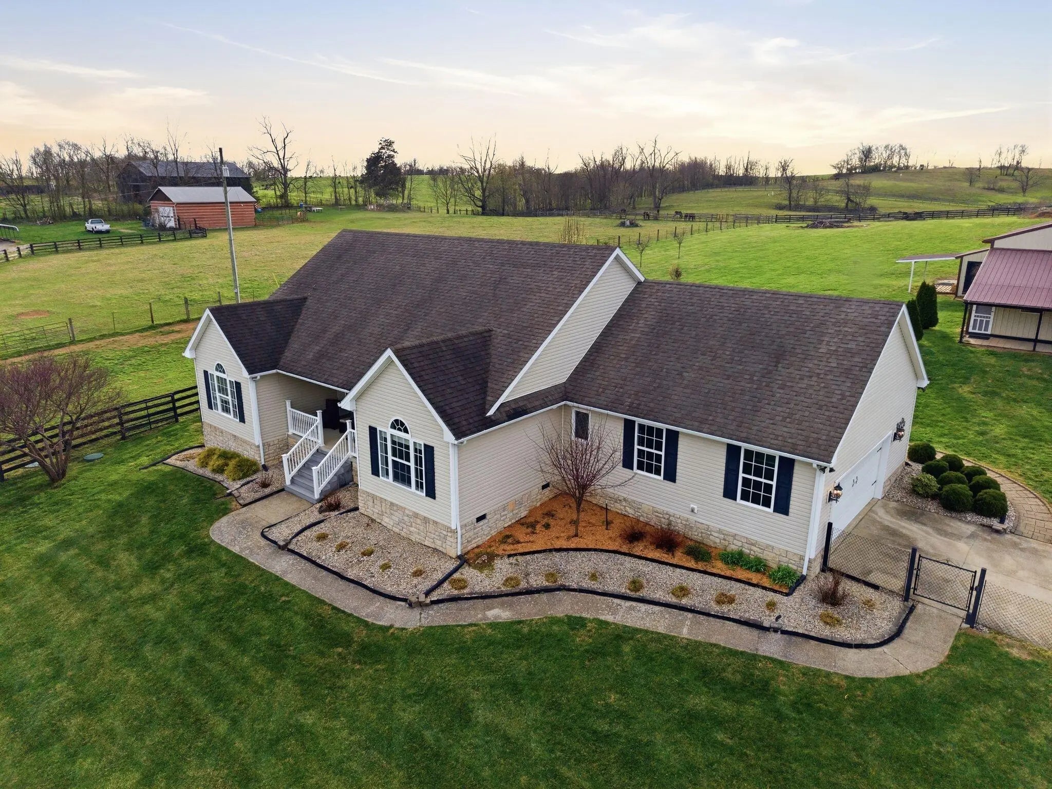 Million-dollar views and wide open Bluegrass skies set the stage for this well-built ranch home on beautiful acreage. Framed by classic four-board fencing, the property offers comfort, functionality, and country lifestyle. A thoughtfully designed split-bedroom layout features spacious rooms, including a private primary suite and two secondary bedrooms connected by a Jack-and-Jill bath. Hardwood floors run throughout the main living areas, and luxury vinyl plank complete the home for a carpet free home. The kitchen offers excellent storage with a large pantry, functional space and a beautiful custom peninsula. An additional flex space just off the kitchen provides versatility as a formal dining room, home office, or playroom. Outdoor enthusiasts and hobbyists will appreciate the impressive 50' x 50' metal barn, complete with tack room, hay storage, and a third garage bay—ideal for equipment, workshop space, or equestrian use. Additional highlights include a two-car attached garage that is insulated and equipped with a mini-split system, making it comfortable year-round. Major updates include a newer roof and HVAC system for added peace of mind. This farm is conveniently located just off Highway 227, offering an easy commute to Georgetown while still enjoying the tranquility and views that make country living so special.