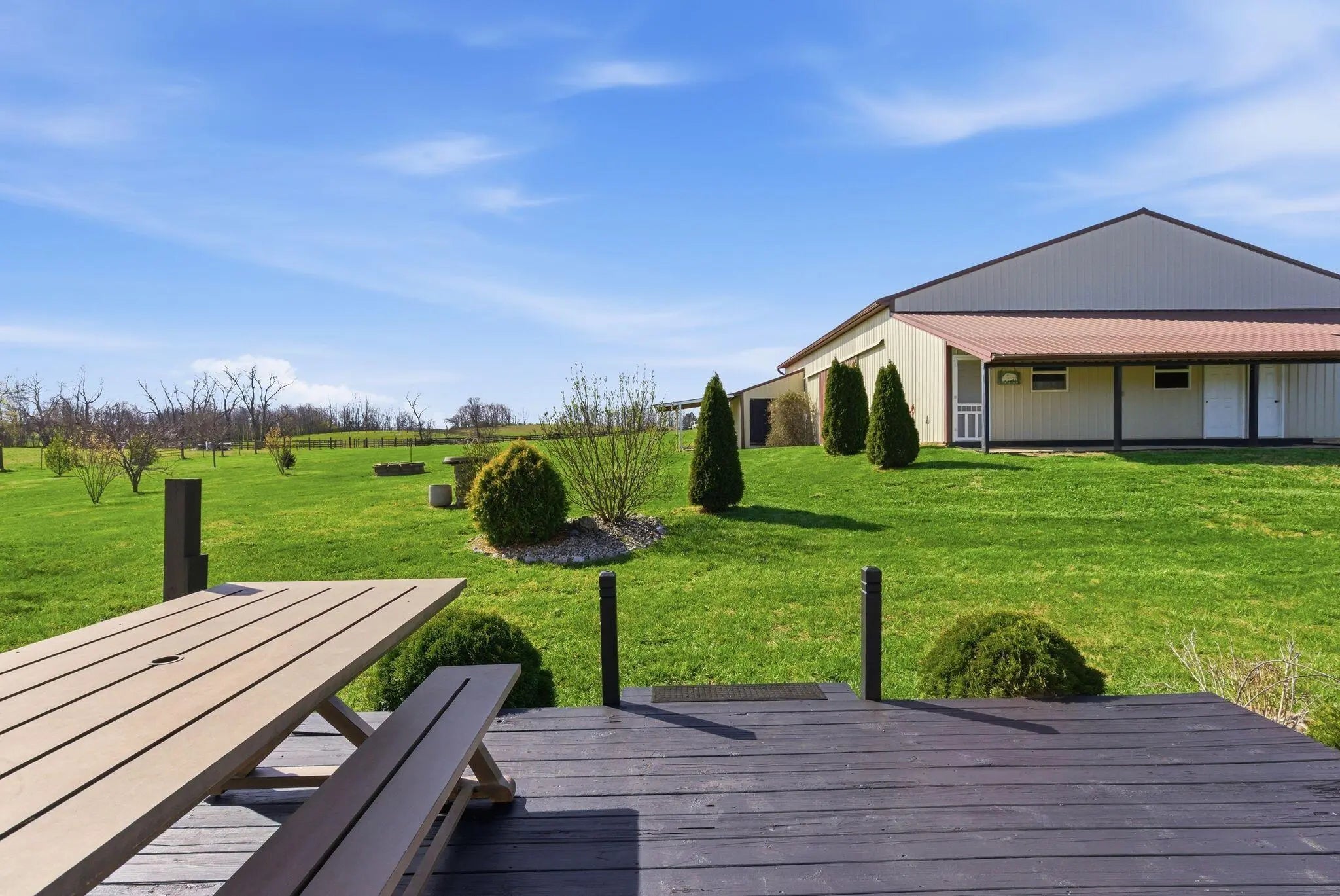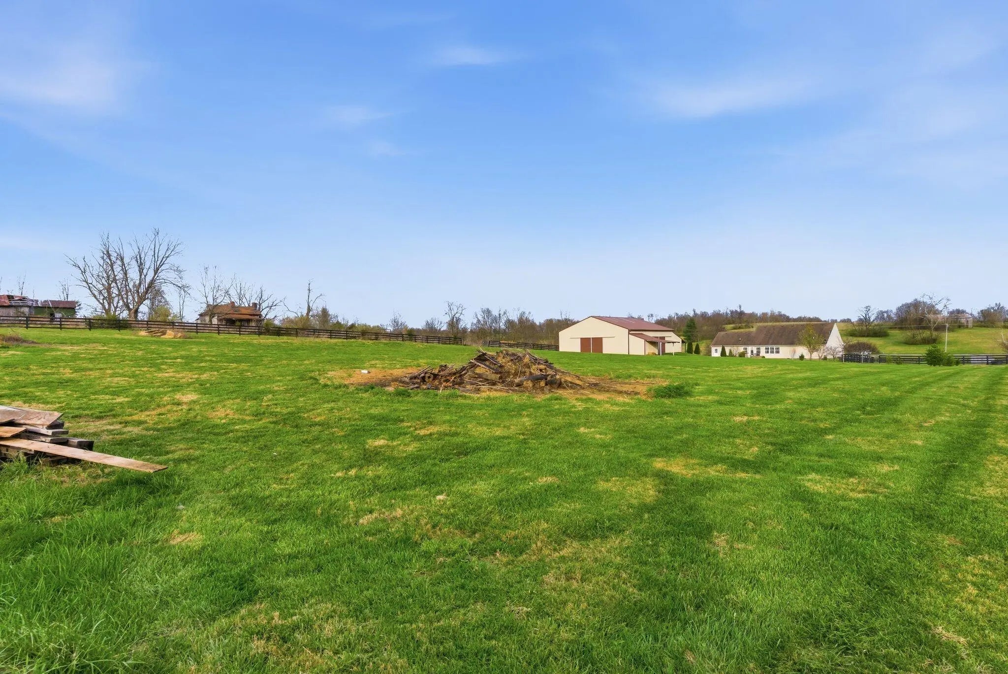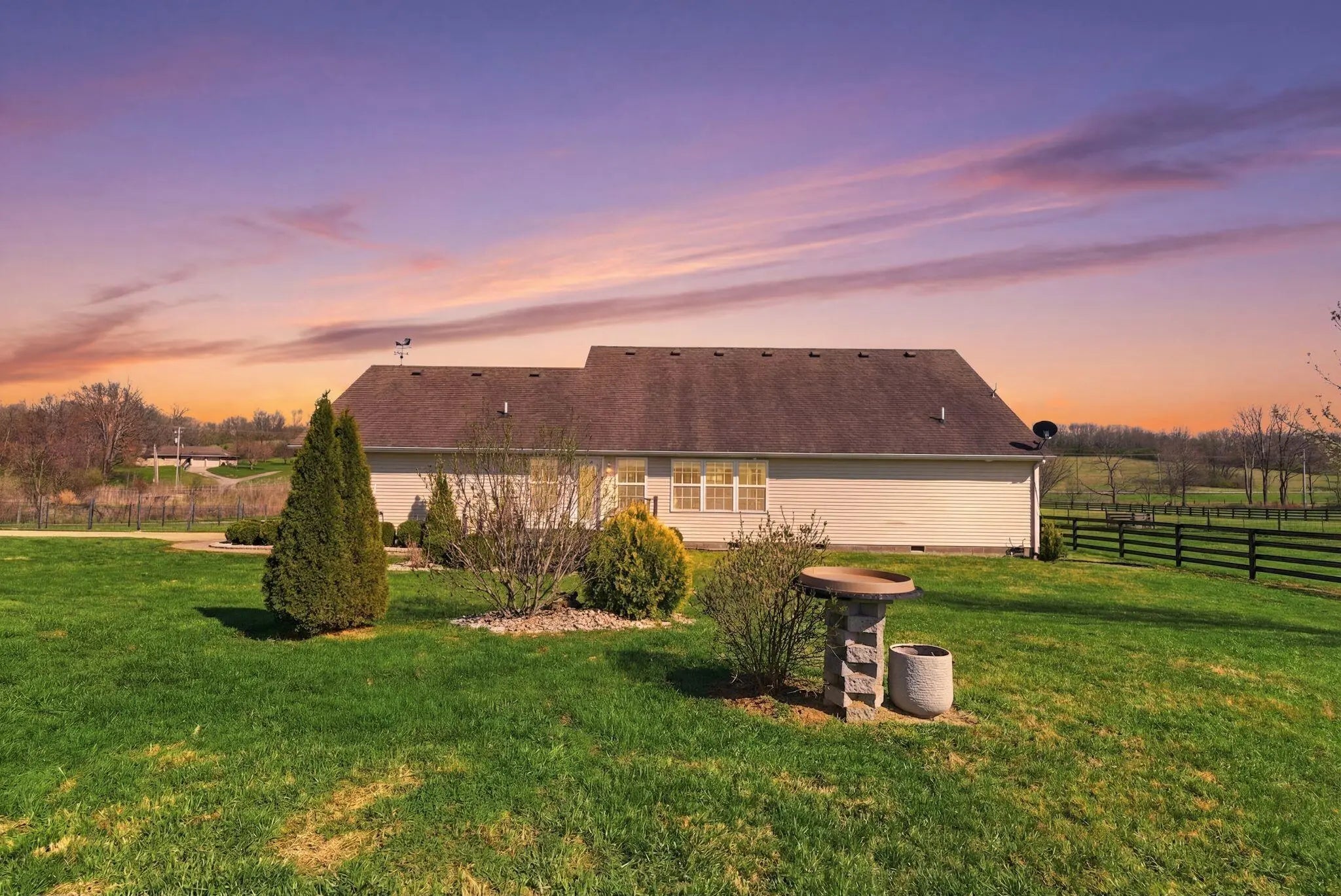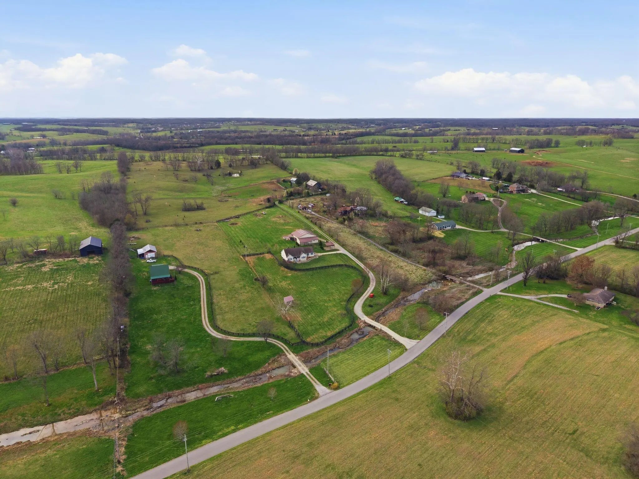Million-dollar views and wide open Bluegrass skies set the stage for this well-built ranch home on beautiful acreage. Framed by classic four-board fencing, the property offers comfort, functionality, and country lifestyle. A thoughtfully designed split-bedroom layout features spacious rooms, including a private primary suite and two secondary bedrooms connected by a Jack-and-Jill bath. Hardwood floors run throughout the main living areas, and luxury vinyl plank complete the home for a carpet free home. The kitchen offers excellent storage with a large pantry, functional space and a beautiful custom peninsula. An additional flex space just off the kitchen provides versatility as a formal dining room, home office, or playroom. Outdoor enthusiasts and hobbyists will appreciate the impressive 50' x 50' metal barn, complete with tack room, hay storage, and a third garage bay—ideal for equipment, workshop space, or equestrian use. Additional highlights include a two-car attached garage that is insulated and equipped with a mini-split system, making it comfortable year-round. Major updates include a newer roof and HVAC system for added peace of mind. This farm is conveniently located just off Highway 227, offering an easy commute to Georgetown while still enjoying the tranquility and views that make country living so special.