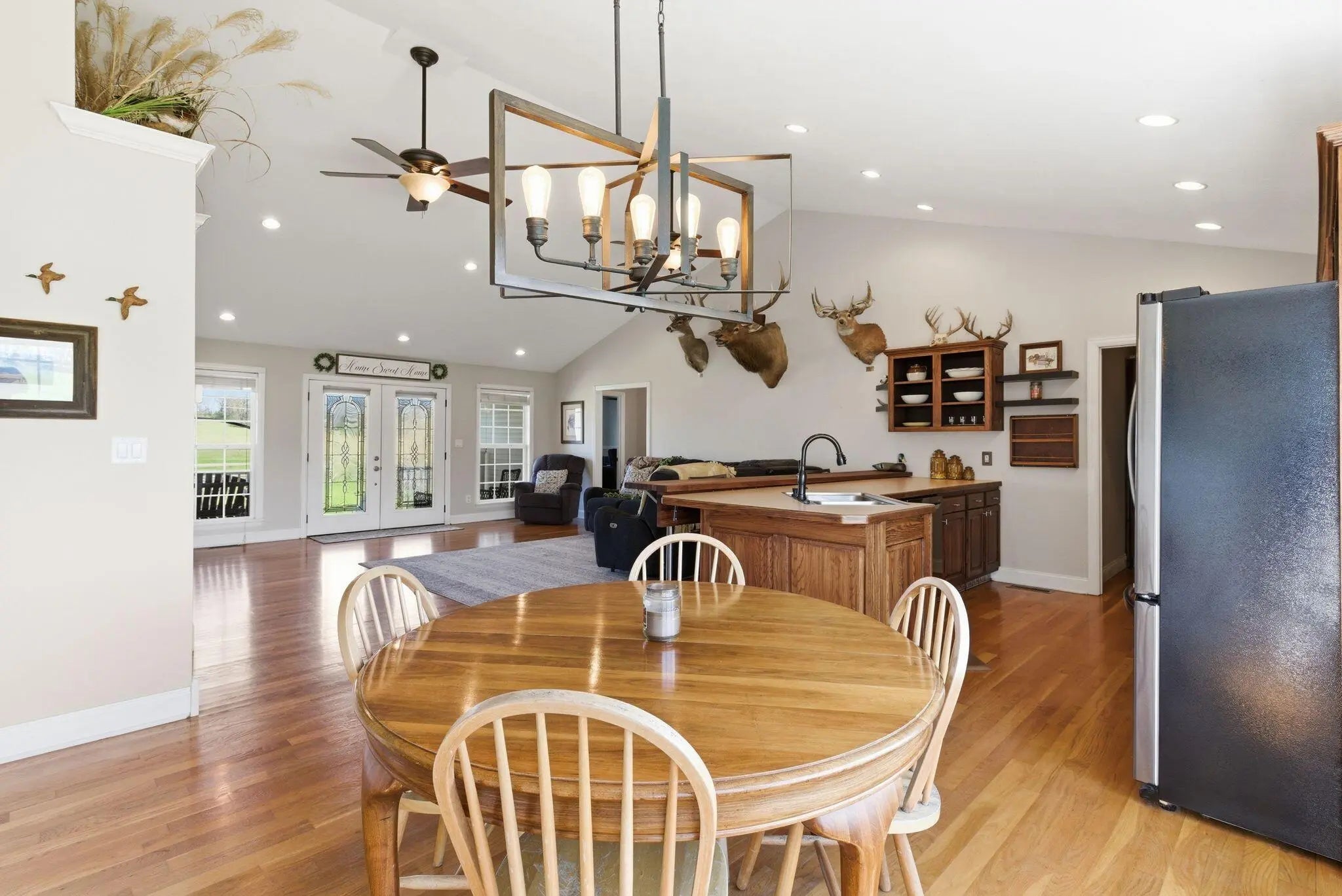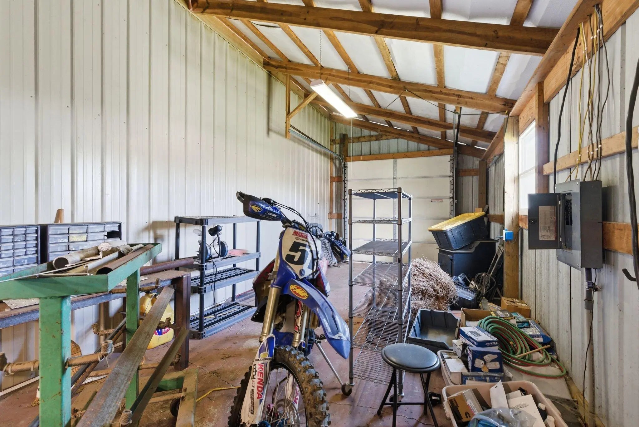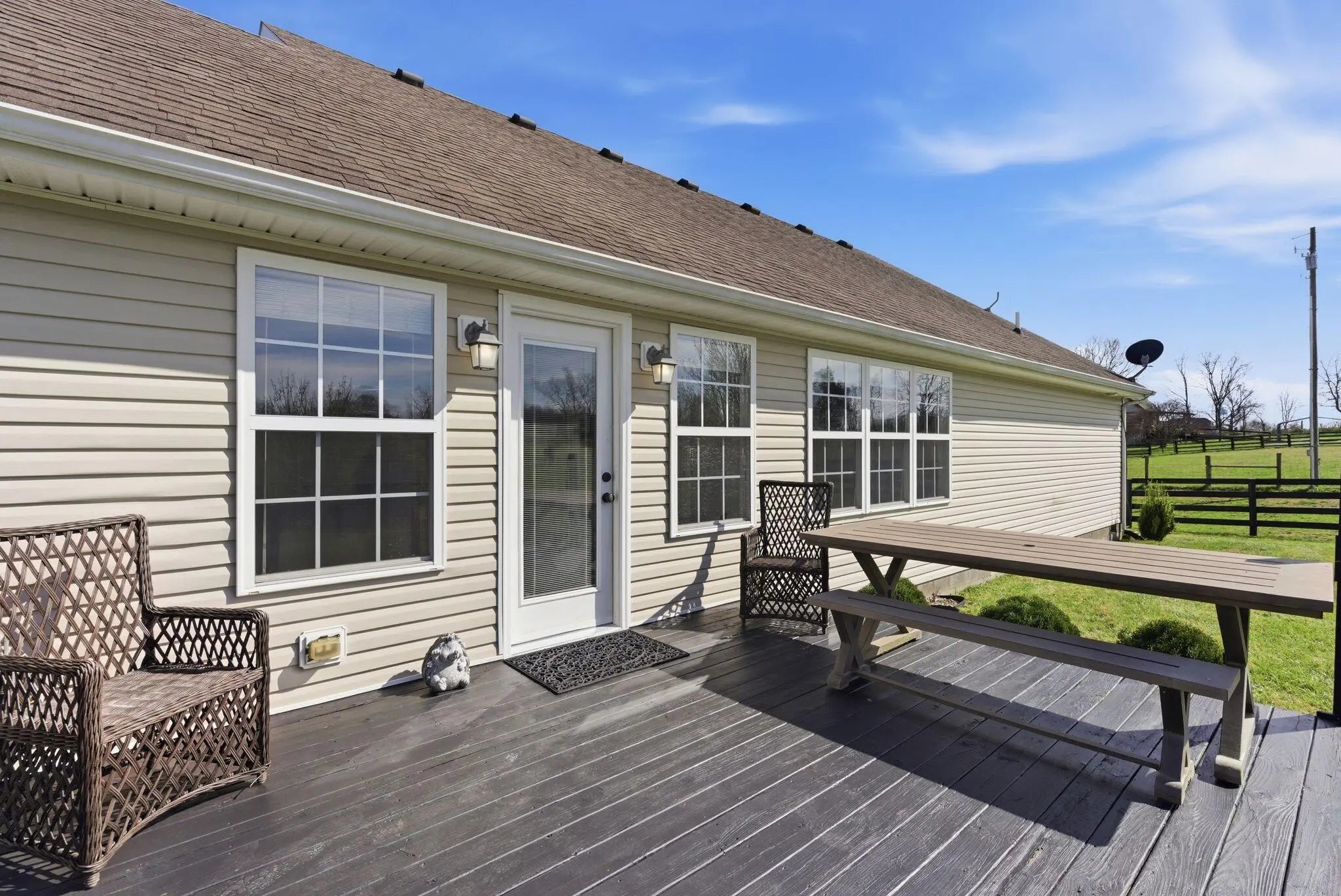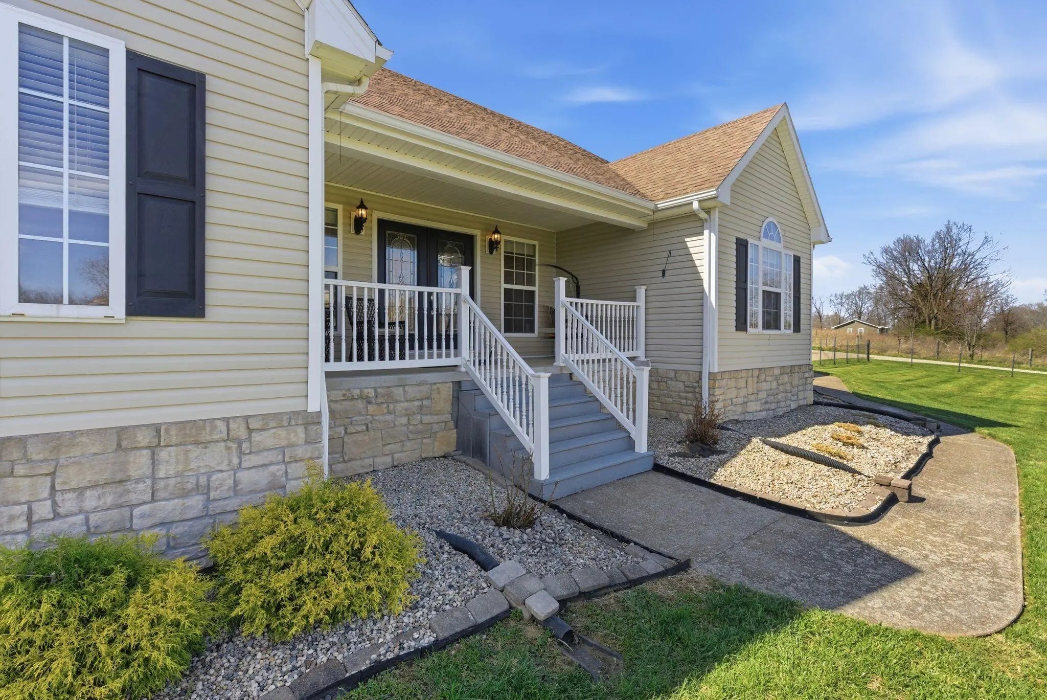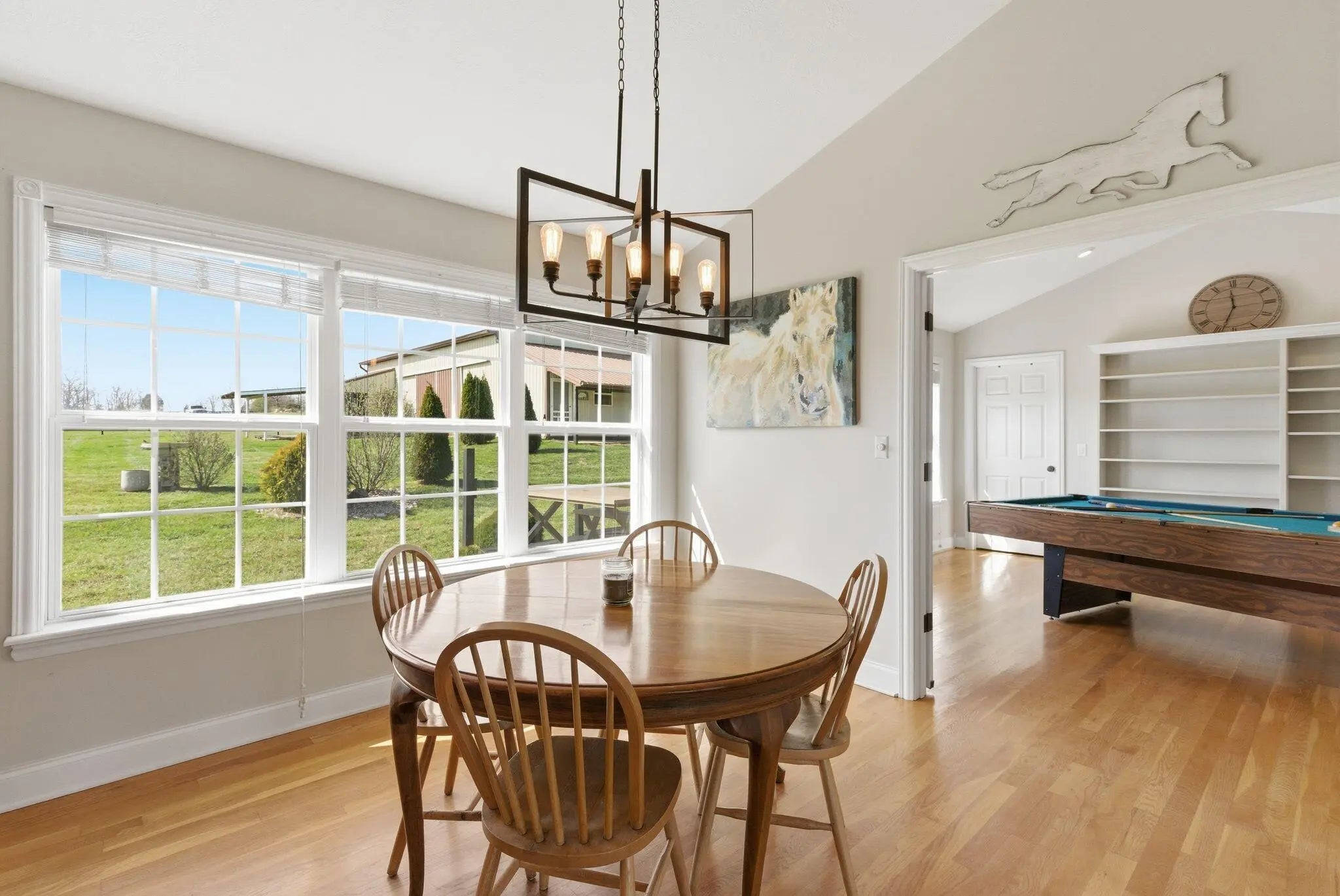 Million-dollar views and wide open Bluegrass skies set the stage for this well-built ranch home on beautiful acreage. Framed by classic four-board fencing, the property offers comfort, functionality, and country lifestyle. A thoughtfully designed split-bedroom layout features spacious rooms, including a private primary suite and two secondary bedrooms connected by a Jack-and-Jill bath. Hardwood floors run throughout the main living areas, and luxury vinyl plank complete the home for a carpet free home. The kitchen offers excellent storage with a large pantry, functional space and a beautiful custom peninsula. An additional flex space just off the kitchen provides versatility as a formal dining room, home office, or playroom. Outdoor enthusiasts and hobbyists will appreciate the impressive 50' x 50' metal barn, complete with tack room, hay storage, and a third garage bay—ideal for equipment, workshop space, or equestrian use. Additional highlights include a two-car attached garage that is insulated and equipped with a mini-split system, making it comfortable year-round. Major updates include a newer roof and HVAC system for added peace of mind. This farm is conveniently located just off Highway 227, offering an easy commute to Georgetown while still enjoying the tranquility and views that make country living so special.
