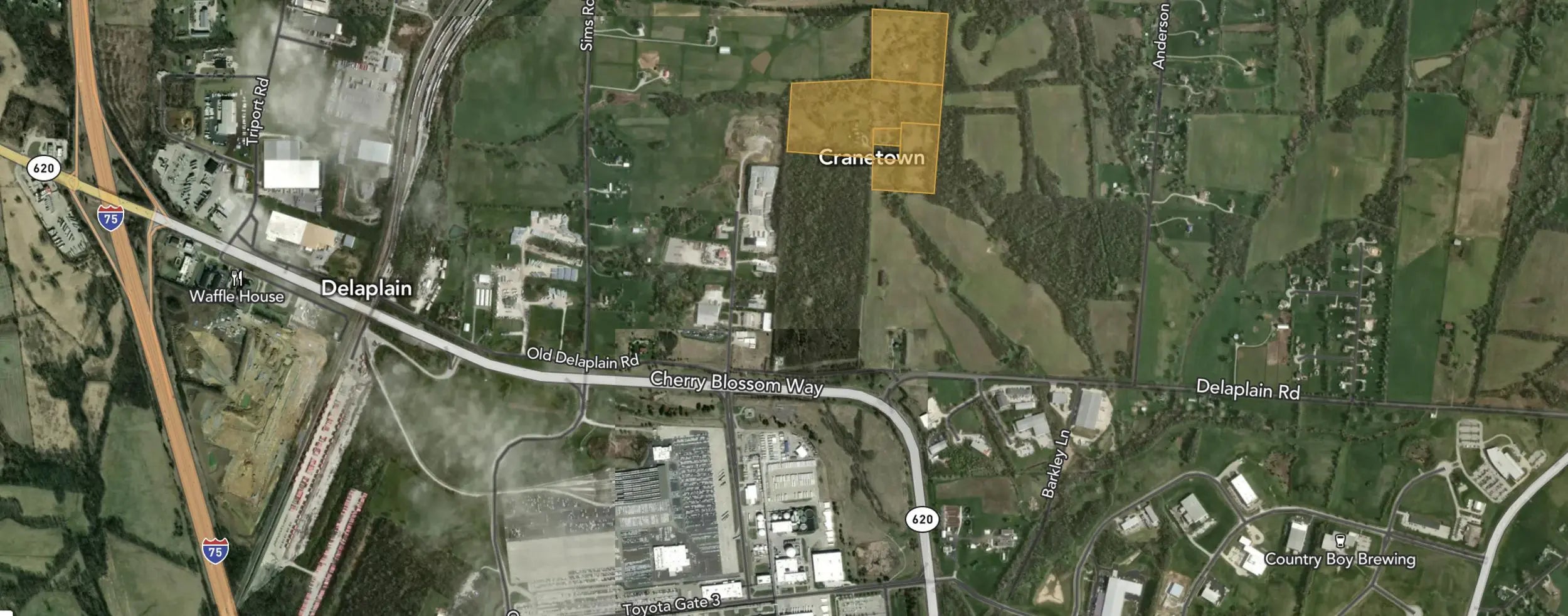 A noteworthy opportunity for investors and developers for over 40 acres of land situated near Toyota Motor Manufacturing and I-75 in Georgetown. The property is currently zoned A-1, with 13 acres within the Georgetown-Scott County Comprehensive Plan FLU, indicating a potential zone change for Industrial Use. The properties situated to the south and west are designated as I-1 and are incorporated within the Georgetown municipal boundaries. Prime real estate in a prime location, offering endless possibilities, and conveniently located off Cherry Blossom Way, just 1.5 miles from 1-75. Nearby businesses include Toyota Motor Manufacturing (currently employing over 9,500), Aichi Forge, ORBIS, and Lanes Run Business Park. Consistently recognized as one of Kentucky's fastest-growing markets, Georgetown continues to experience ongoing expansion across all sectors. This property's strategic location is conducive to growth and business success. Its prime position facilitates convenient access to essential services, transportation networks, and valuable business resources, thereby fostering an environment in which enterprises can flourish.