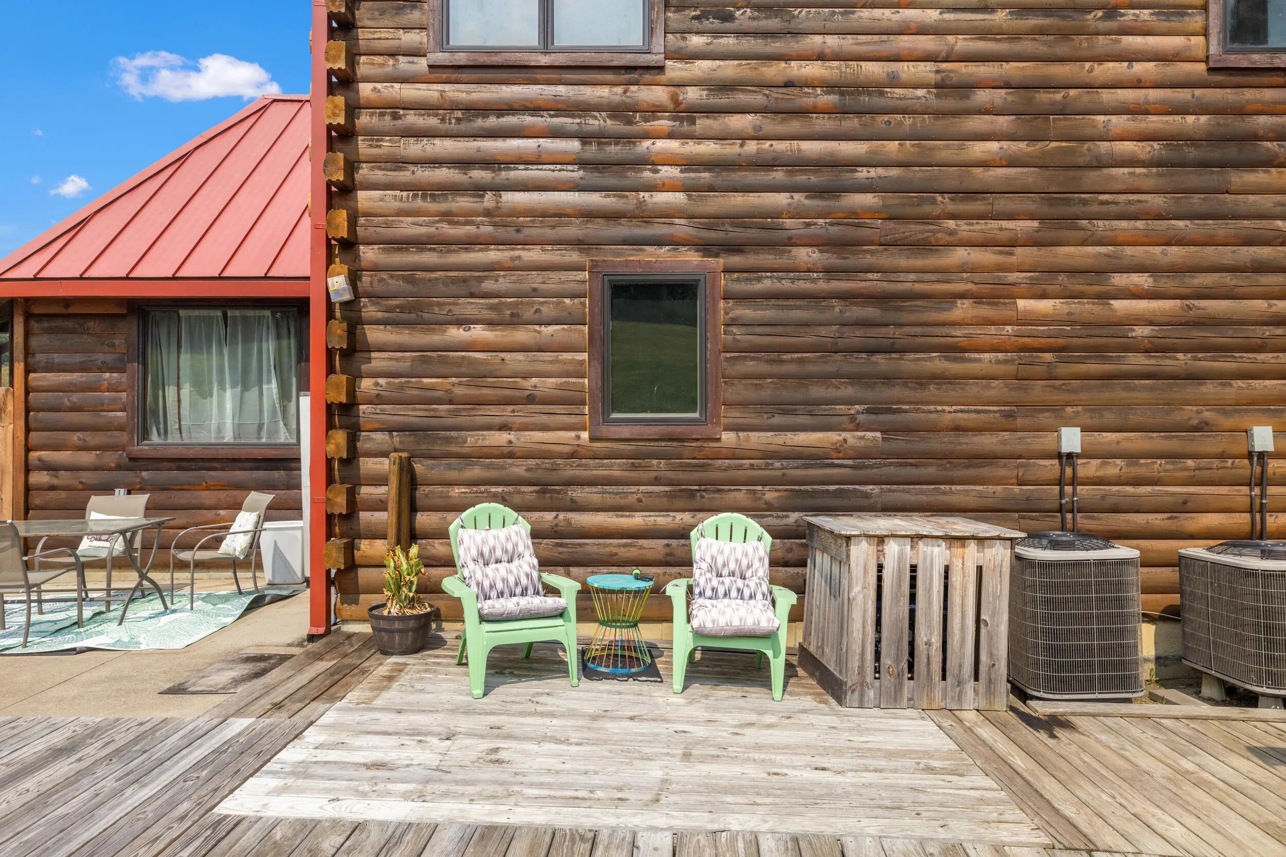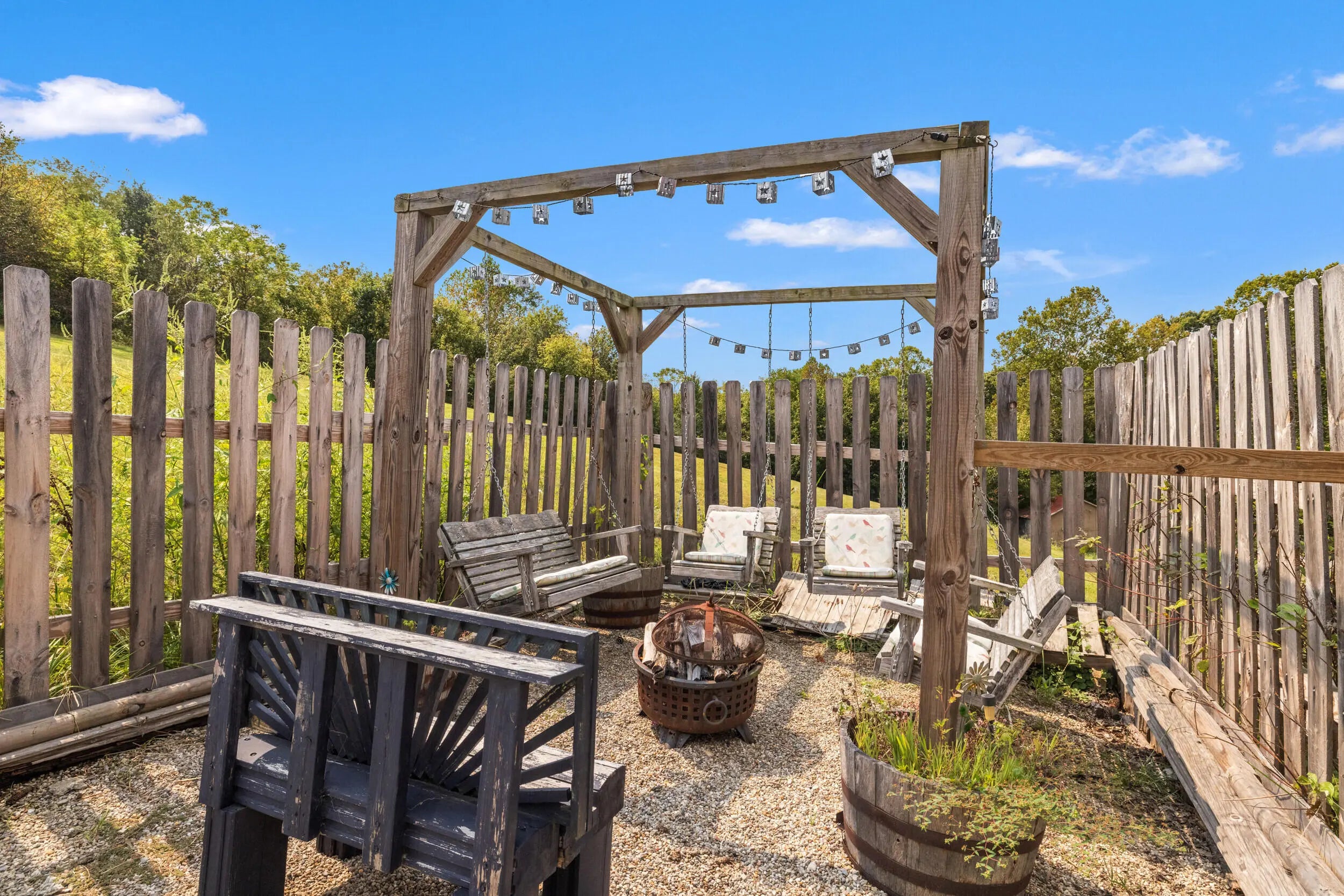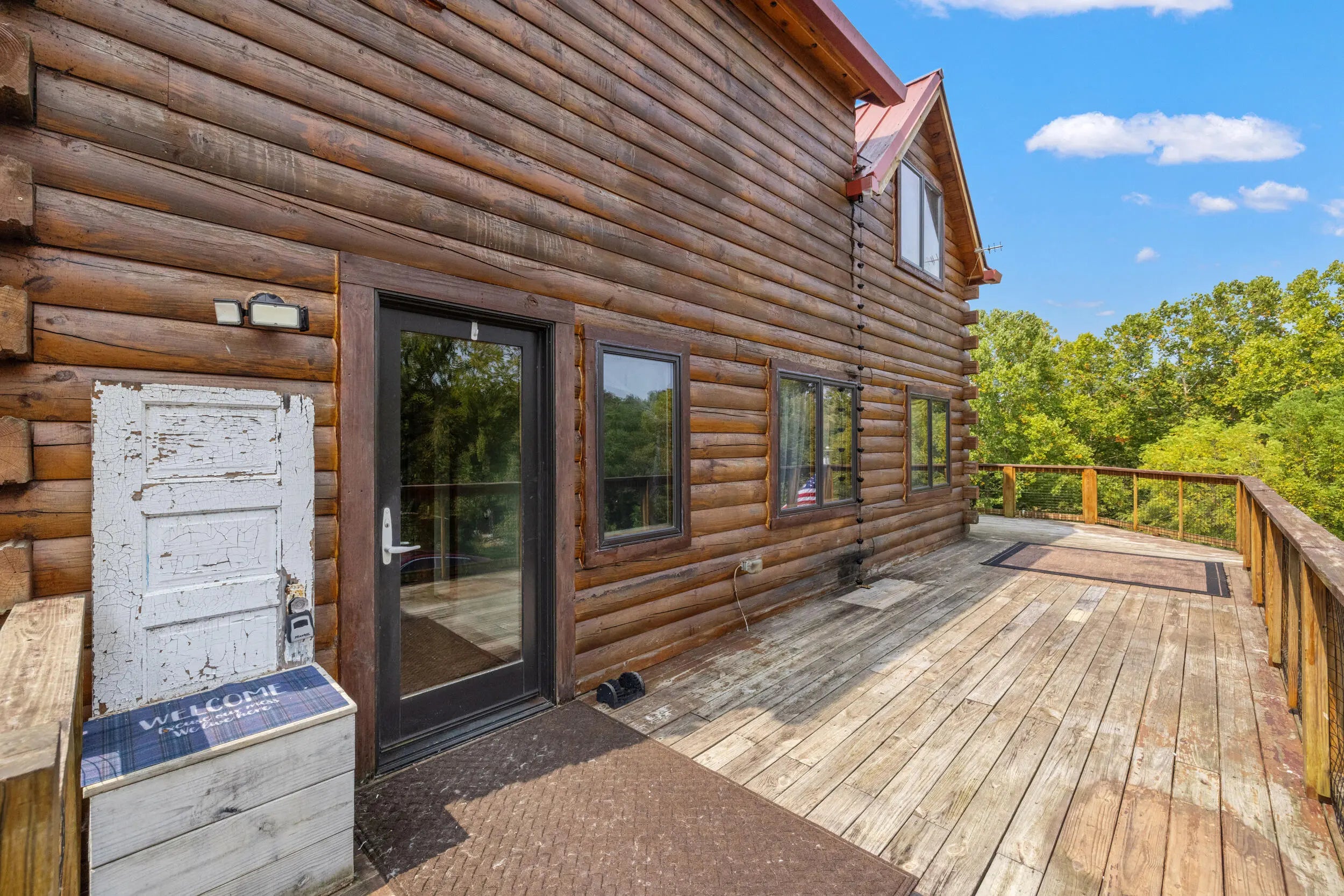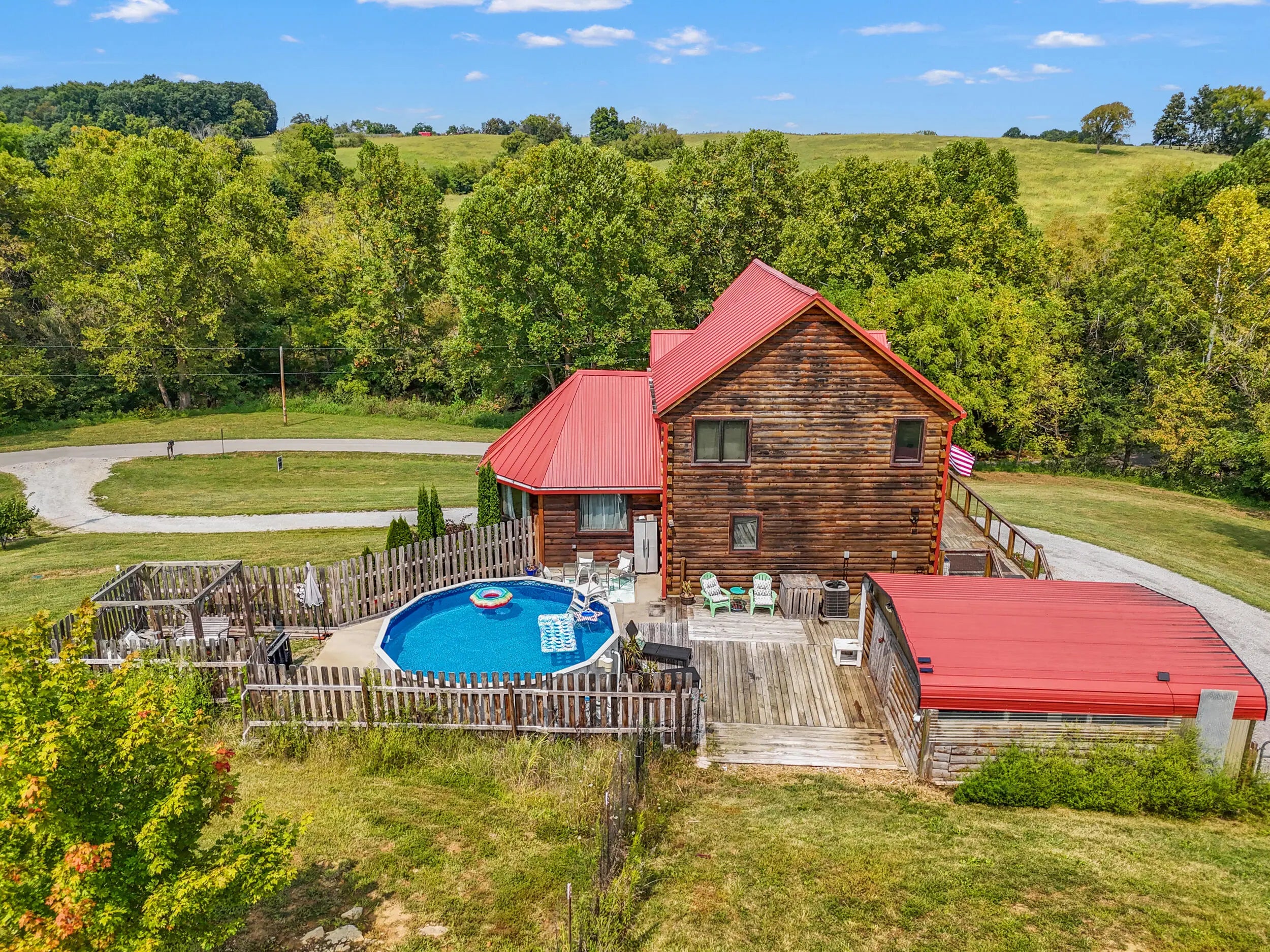 Welcome to peaceful country living in this one-of-a-kind custom log home, offered for the first time. Thoughtfully designed and meticulously crafted, every detail of this D-log style home reflects quality, character, and care. A wraparound deck spans the main living area, and patio off the first floor with matching swings—is the perfect place for relaxing and taking in the serene surroundings. Inside, soaring vaulted ceilings with exposed wood beams and abundant natural light create a warm, inviting atmosphere, beautifully complemented by bamboo flooring throughout. The kitchen is both stylish and functional, featuring granite countertops, a spacious walk-in pantry, and a deep farmhouse sink. A charming half bath showcases a truly unique custom vanity, crafted from a vintage sewing machine with a copper basin. Upstairs, the expansive primary suite offers vaulted ceilings, a large walk-in closet, and a spa-like bathroom complete with an oversized tiled shower, a classic clawfoot tub, and a distinctive vanity made from an antique pie safe. Step out onto the private balcony for breathtaking stargazing nights. The home office is rich with character, featuring custom-built shelving and a desk crafted from reclaimed wood, adding warmth and history to the space. The finished walkout basement is designed for both comfort and entertaining, featuring a live-edge wood bar, full bathroom, two additional bedrooms, a cozy den, and a utility room. Outdoors, the backyard is an entertainer's dream with a saltwater pool, inviting firepit area, and plenty of space to unwind. The barn includes concrete flooring and electricity, offering versatility for hobbies or storage. A whole-home generator provides peace of mind year-round. Fruit trees, including peach and apple, flourish in the lower valley, adding to the property's natural charm. Conveniently located just minutes from Chowning Boat Dock, local wineries, and the growing community of Bloomfield, this home offers the perfect blend of tranquility and accessibility. Experience the beauty, craftsmanship, and lifestyle this exceptional property has to offer—your private retreat awaits.