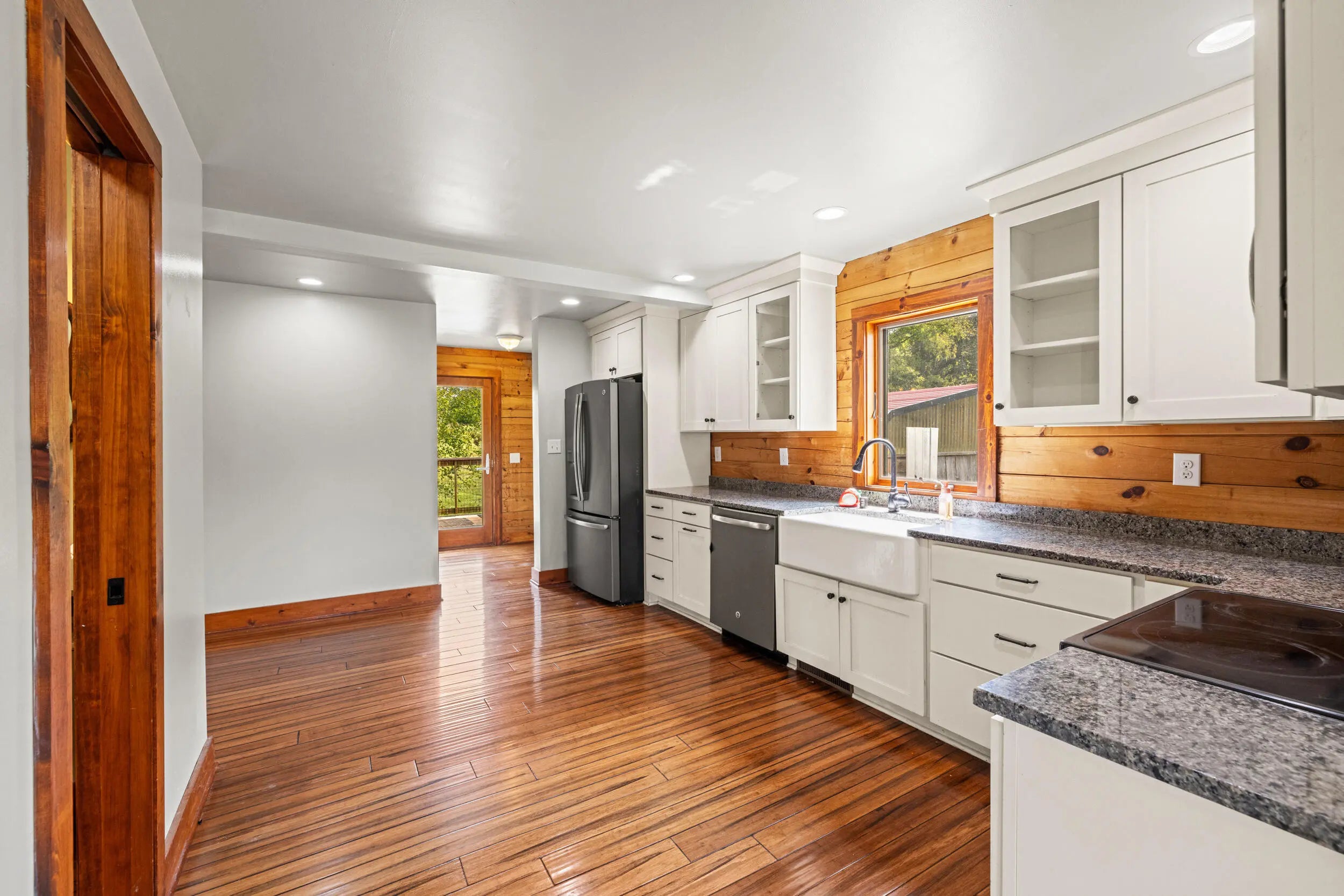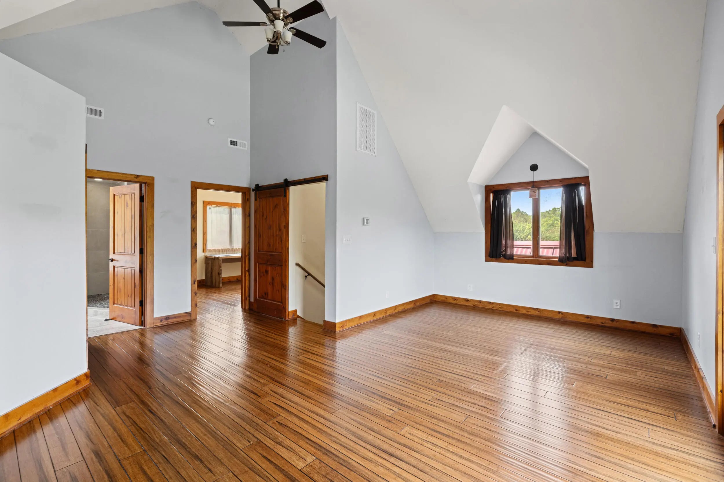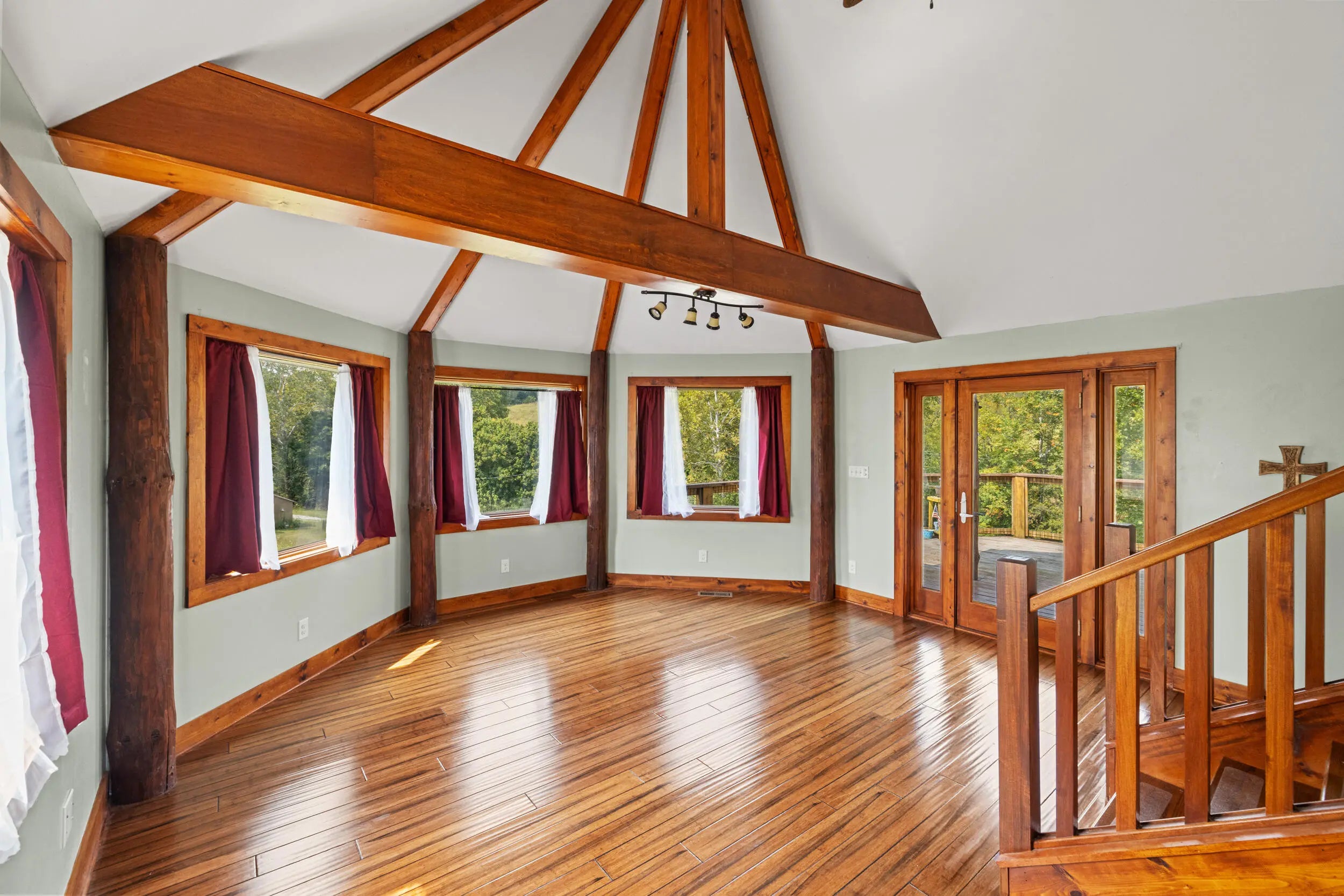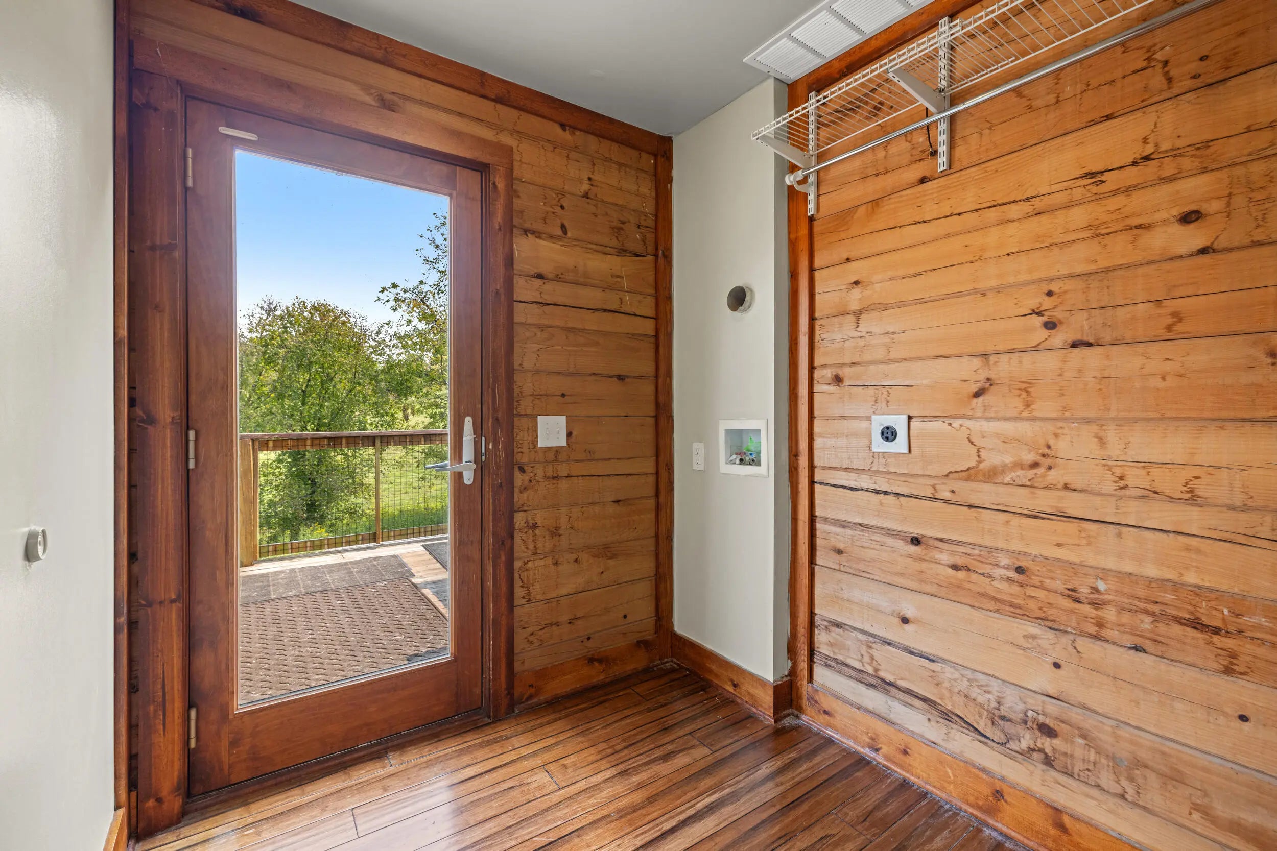 Welcome to peaceful country living in this one-of-a-kind custom log home, offered for the first time. Thoughtfully designed and meticulously crafted, every detail of this D-log style home reflects quality, character, and care. A wraparound deck spans the main living area, and patio off the first floor with matching swings—is the perfect place for relaxing and taking in the serene surroundings. Inside, soaring vaulted ceilings with exposed wood beams and abundant natural light create a warm, inviting atmosphere, beautifully complemented by bamboo flooring throughout. The kitchen is both stylish and functional, featuring granite countertops, a spacious walk-in pantry, and a deep farmhouse sink. A charming half bath showcases a truly unique custom vanity, crafted from a vintage sewing machine with a copper basin. Upstairs, the expansive primary suite offers vaulted ceilings, a large walk-in closet, and a spa-like bathroom complete with an oversized tiled shower, a classic clawfoot tub, and a distinctive vanity made from an antique pie safe. Step out onto the private balcony for breathtaking stargazing nights. The home office is rich with character, featuring custom-built shelving and a desk crafted from reclaimed wood, adding warmth and history to the space. The finished walkout basement is designed for both comfort and entertaining, featuring a live-edge wood bar, full bathroom, two additional bedrooms, a cozy den, and a utility room. Outdoors, the backyard is an entertainer's dream with a saltwater pool, inviting firepit area, and plenty of space to unwind. The barn includes concrete flooring and electricity, offering versatility for hobbies or storage. A whole-home generator provides peace of mind year-round. Fruit trees, including peach and apple, flourish in the lower valley, adding to the property's natural charm. Conveniently located just minutes from Chowning Boat Dock, local wineries, and the growing community of Bloomfield, this home offers the perfect blend of tranquility and accessibility. Experience the beauty, craftsmanship, and lifestyle this exceptional property has to offer—your private retreat awaits.