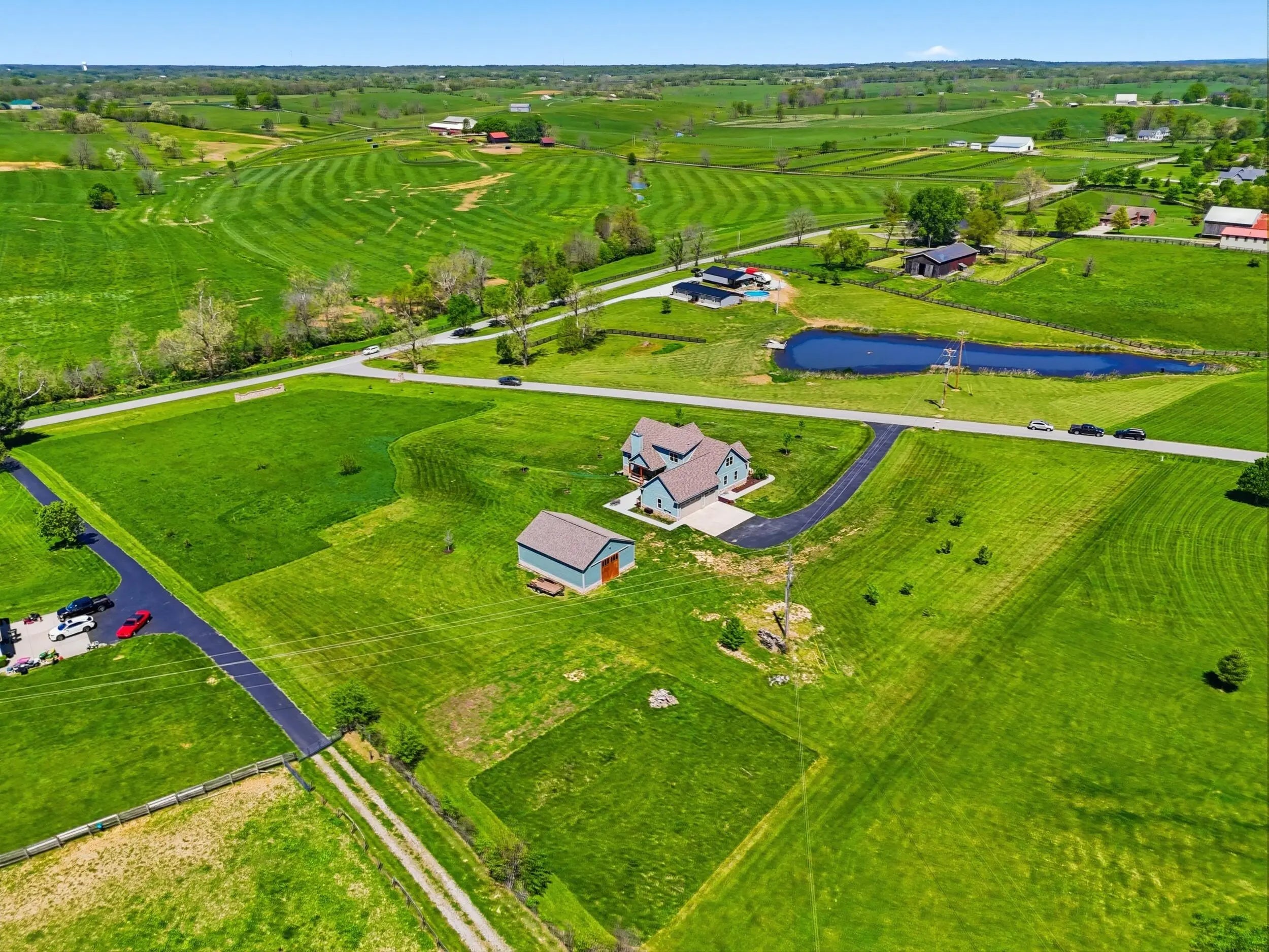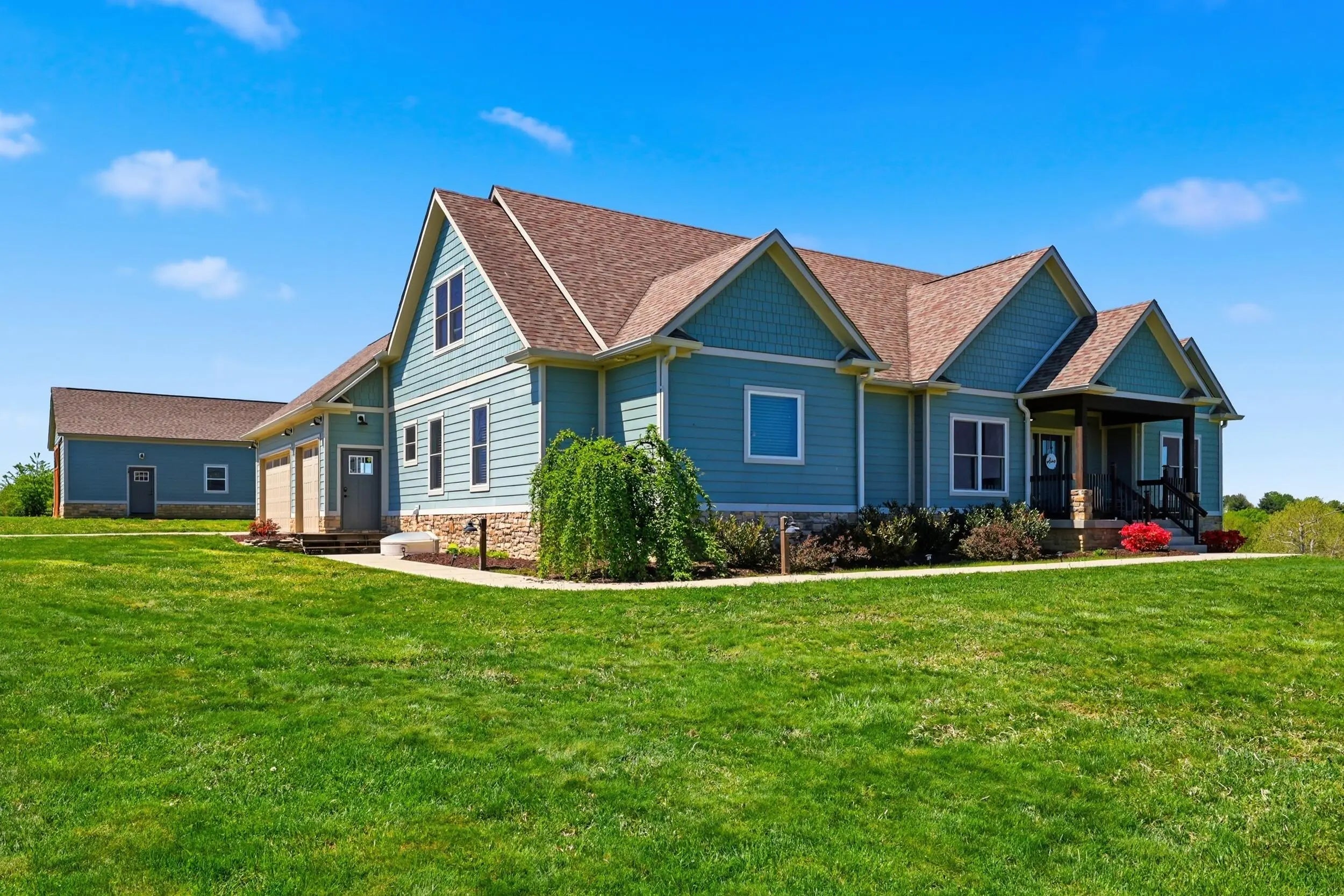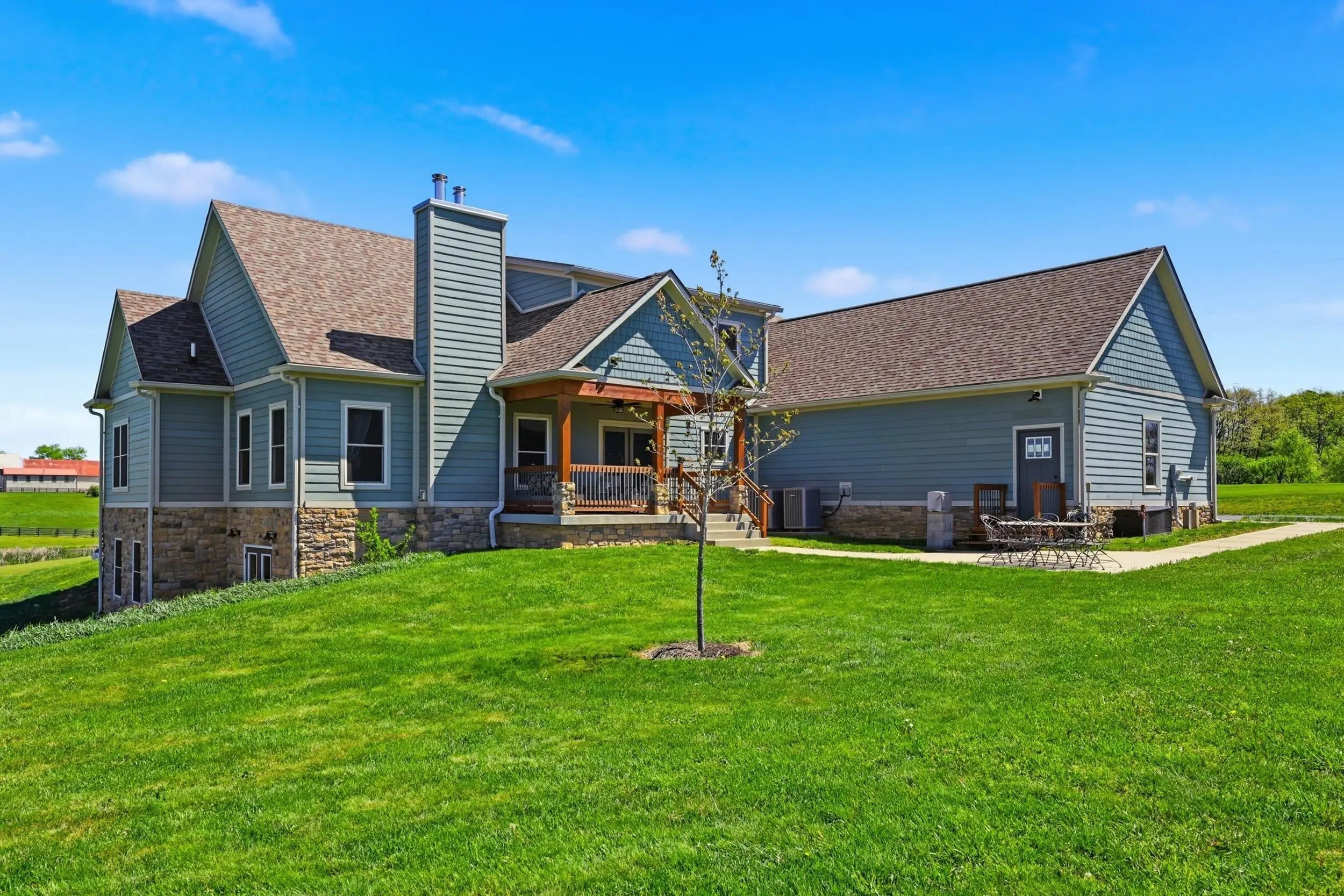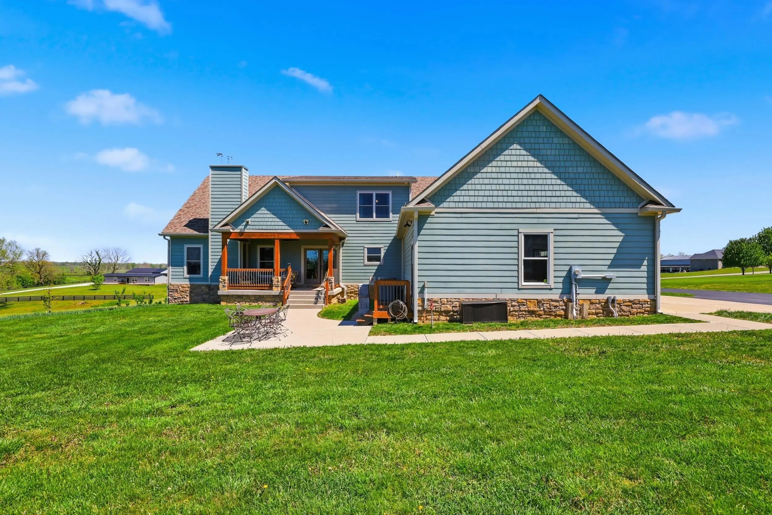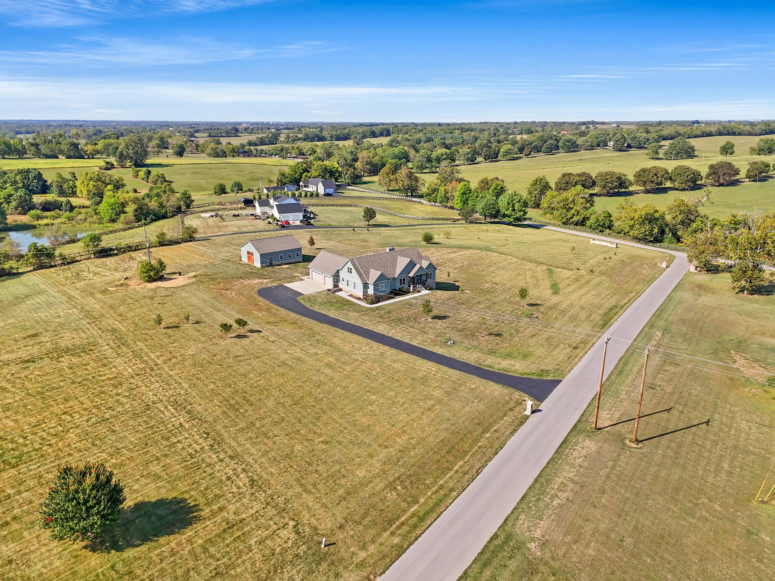 Wow...this is a rare find! Gorgeous story & a half custom-built home with full walk-out basement, sitting on picturesque 5-acre lot, with adjacent barn. The floorplan of this home is a dream! Enter through the covered front porch into formal foyer with open hardwood tread staircase. To the right are French style doors opening into the Study with 9' ceilings, fan & loads of natural light. Private door off the study to a ½ bath with stone top vanity. To the left of the Foyer you will find the Dining Room that is also open to Kitchen & Breakfast. Head from the Foyer straight into the stunning Great Room. The Great Room has a cathedral ceiling, stone hearth wood burning fireplace, beautiful pendant lighting & ceiling fan. The heart of this home is the Kitchen! You will love the beauty and detail of the Amish custom-built maple cabinetry. The cook of the family will love the details including large island, pot filler, bread cabinet, roll-out trash bin, soft close cabinets, & floor to ceiling cabinetry. Need just a bit more kitchen space? No worries, just off the kitchen you will find an incredible Butler style pantry with beverage cooler, wine & stem rack. This home has a private first floor Primary Bedroom & Bath. Walk from the spacious Primary Bedroom into an ensuite bath with 2 walk-in closets, custom tiled shower, soaking tub & double bowl vanity. One of the closets has a sit-down vanity with salon style roll-out cabinet! There is a first floor mudroom with drop zone & separate laundry room! The second level offers an open flex space overlooking the Great Room, full hall bath, & 2 generous size bedrooms with large closets. There is a large hall closet & off of Bedroom 3 you will find a huge walk-in storage area!!! The lower level offers over 2300 more square feet of living! This does not feel like your typical basement... it is truly another level with walk-out exit and loads of natural light. There is a den/office with 2 closets, gathering family room area, recreation area with walk-up wet bar, exercise room, & 4th bedroom. The full bath in the lower level has a low threshold walk-in shower. There is also an area under the front porch that could be used as a safe room or would make a perfect wine cellar! This home has an attached 3 car garage with over 800 square feet of space. Enjoy entertaining or relaxing on the covered back patio. Need a little more space? Walk out back to the adjacent barn built to match the home! This oversized barn has electric, water and gravel floor ready for concrete if desired! There are so many details to this home so be sure to scroll the pictures & videos! This is a home you will definitely want to view in person!