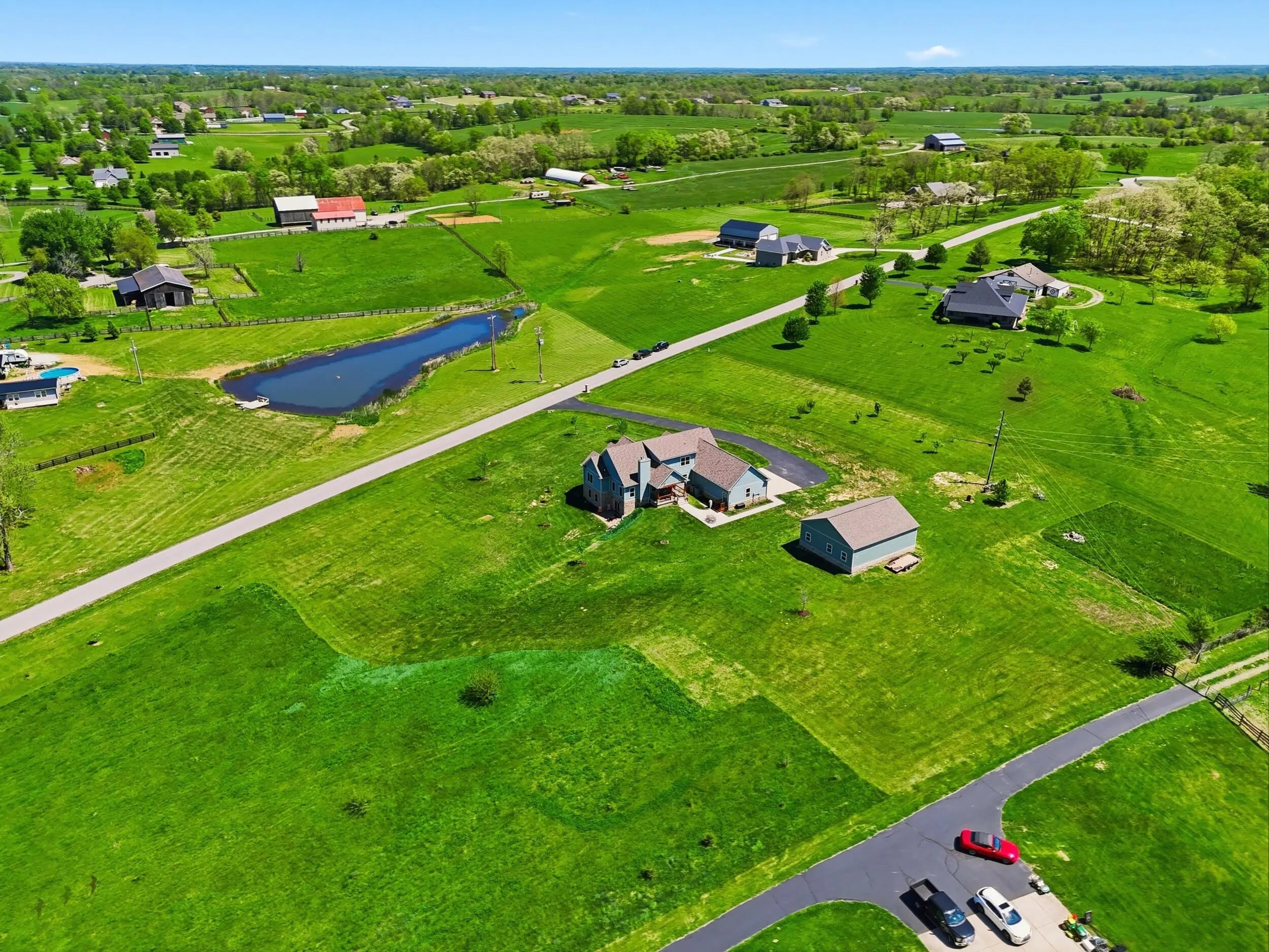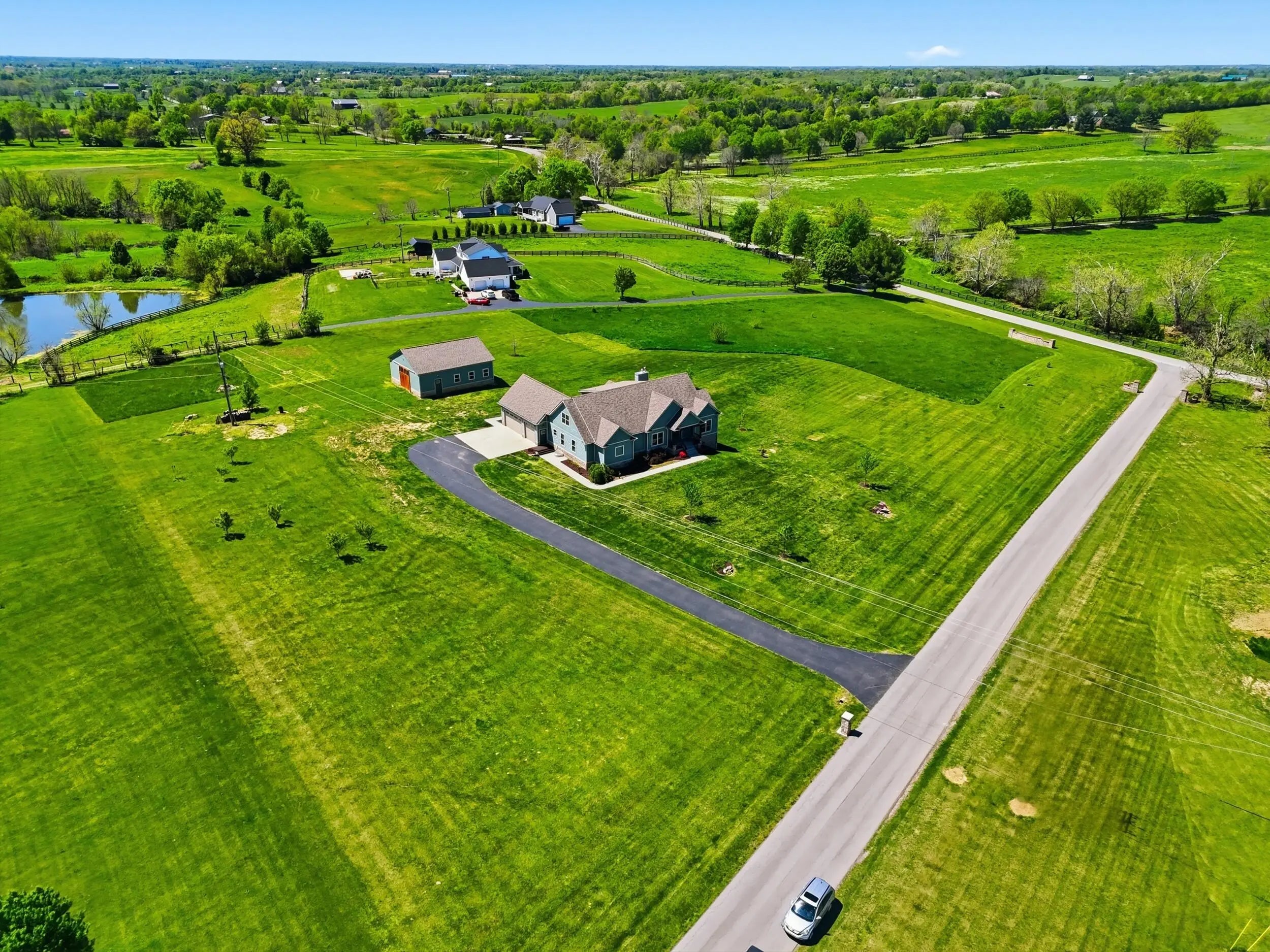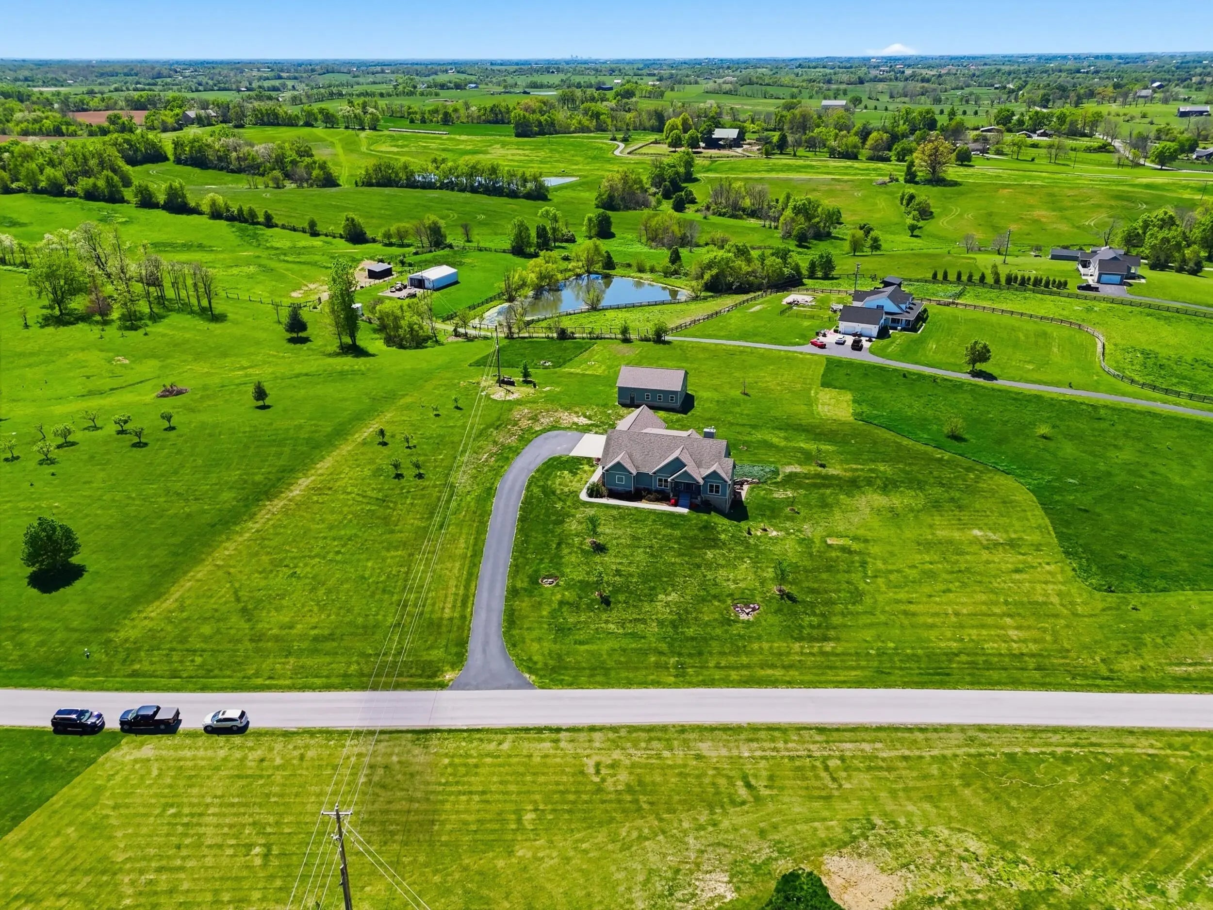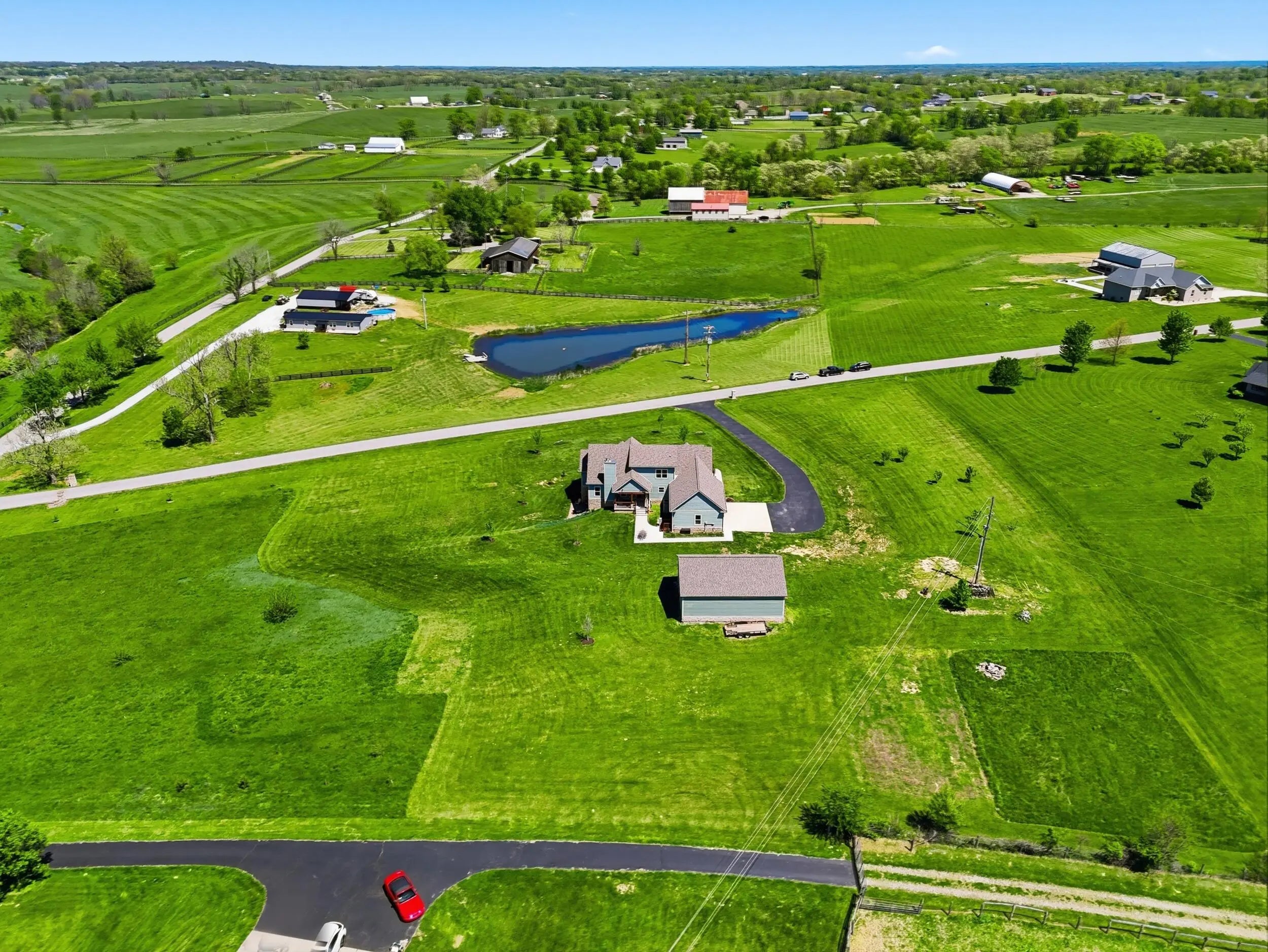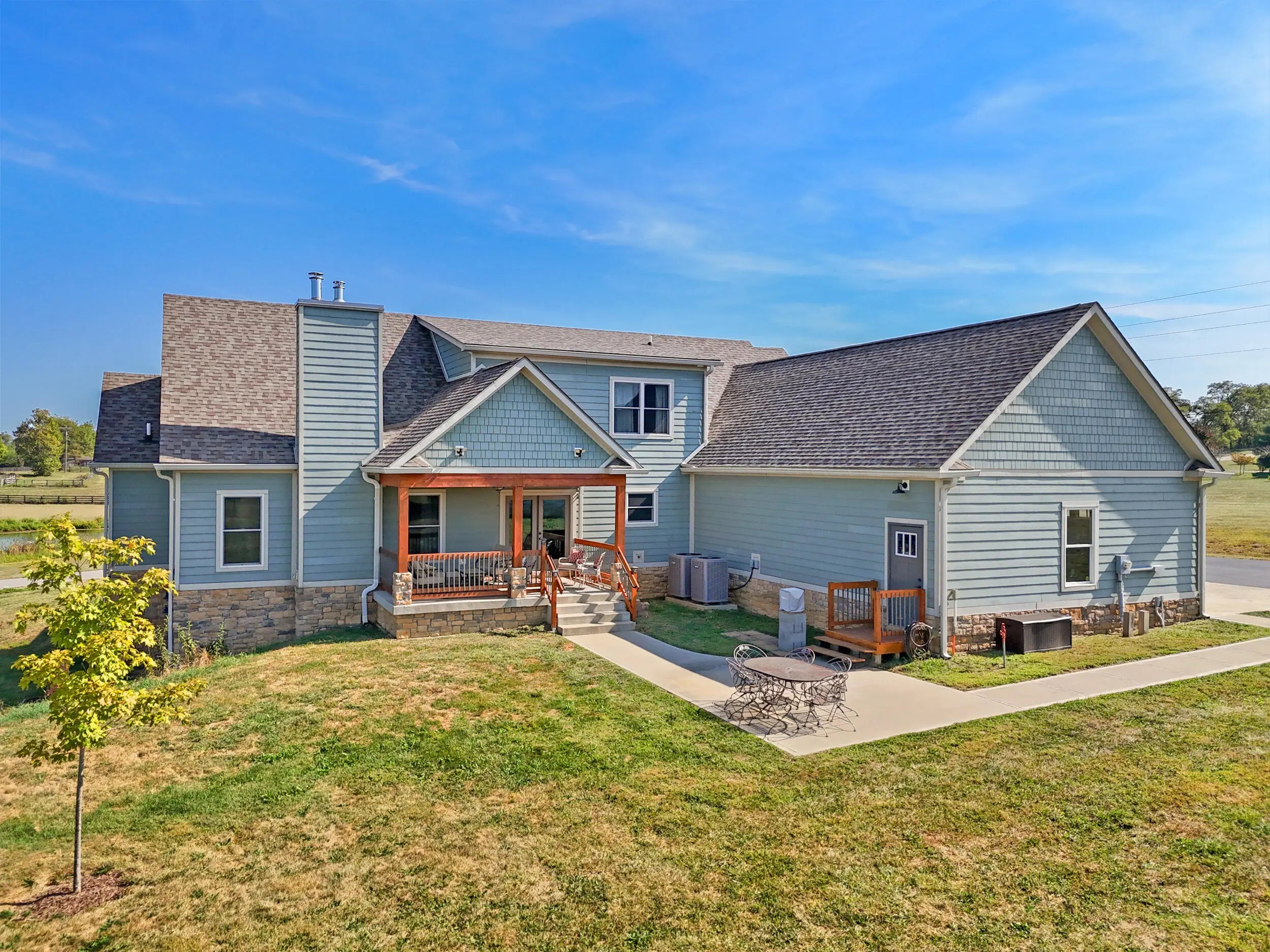 Wow...this is a rare find! Gorgeous story & a half custom-built home with full walk-out basement, sitting on picturesque 5-acre lot, with adjacent barn. The floorplan of this home is a dream! Enter through the covered front porch into formal foyer with open hardwood tread staircase. To the right are French style doors opening into the Study with 9' ceilings, fan & loads of natural light. Private door off the study to a ½ bath with stone top vanity. To the left of the Foyer you will find the Dining Room that is also open to Kitchen & Breakfast. Head from the Foyer straight into the stunning Great Room. The Great Room has a cathedral ceiling, stone hearth wood burning fireplace, beautiful pendant lighting & ceiling fan. The heart of this home is the Kitchen! You will love the beauty and detail of the Amish custom-built maple cabinetry. The cook of the family will love the details including large island, pot filler, bread cabinet, roll-out trash bin, soft close cabinets, & floor to ceiling cabinetry. Need just a bit more kitchen space? No worries, just off the kitchen you will find an incredible Butler style pantry with beverage cooler, wine & stem rack. This home has a private first floor Primary Bedroom & Bath. Walk from the spacious Primary Bedroom into an ensuite bath with 2 walk-in closets, custom tiled shower, soaking tub & double bowl vanity. One of the closets has a sit-down vanity with salon style roll-out cabinet! There is a first floor mudroom with drop zone & separate laundry room! The second level offers an open flex space overlooking the Great Room, full hall bath, & 2 generous size bedrooms with large closets. There is a large hall closet & off of Bedroom 3 you will find a huge walk-in storage area!!! The lower level offers over 2300 more square feet of living! This does not feel like your typical basement... it is truly another level with walk-out exit and loads of natural light. There is a den/office with 2 closets, gathering family room area, recreation area with walk-up wet bar, exercise room, & 4th bedroom. The full bath in the lower level has a low threshold walk-in shower. There is also an area under the front porch that could be used as a safe room or would make a perfect wine cellar! This home has an attached 3 car garage with over 800 square feet of space. Enjoy entertaining or relaxing on the covered back patio. Need a little more space? Walk out back to the adjacent barn built to match the home! This oversized barn has electric, water and gravel floor ready for concrete if desired! There are so many details to this home so be sure to scroll the pictures & videos! This is a home you will definitely want to view in person!