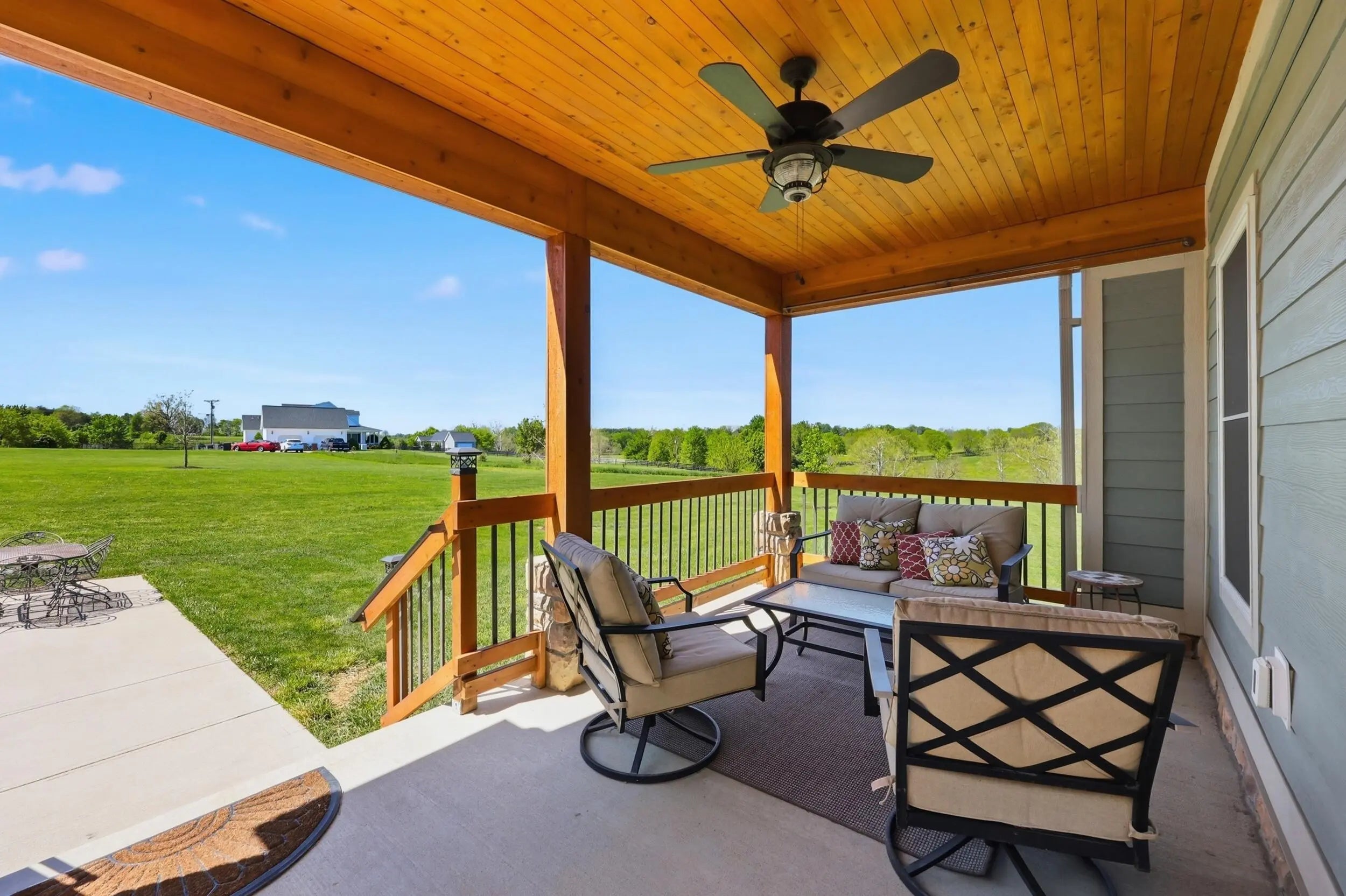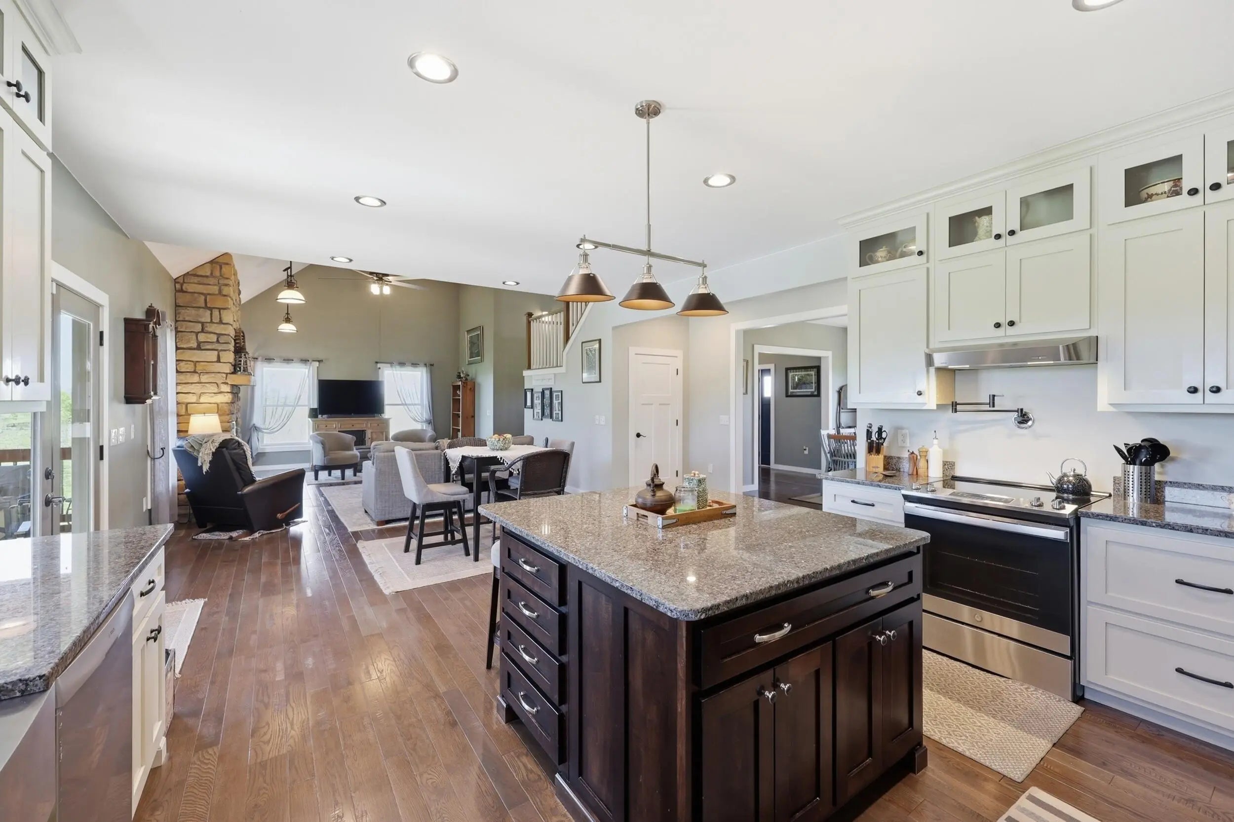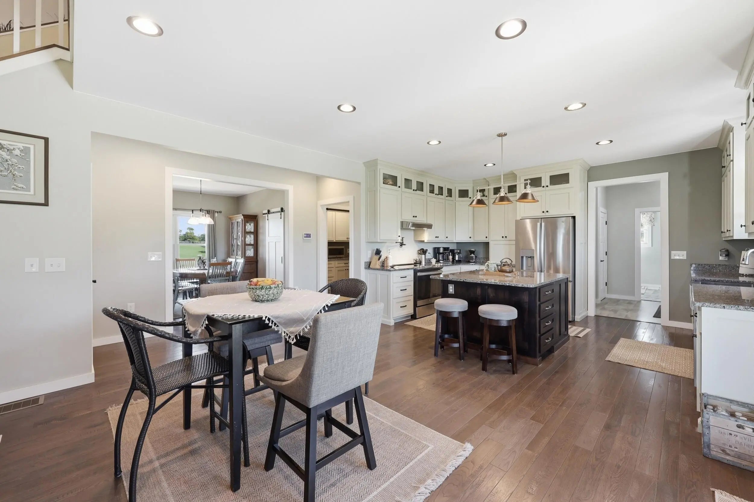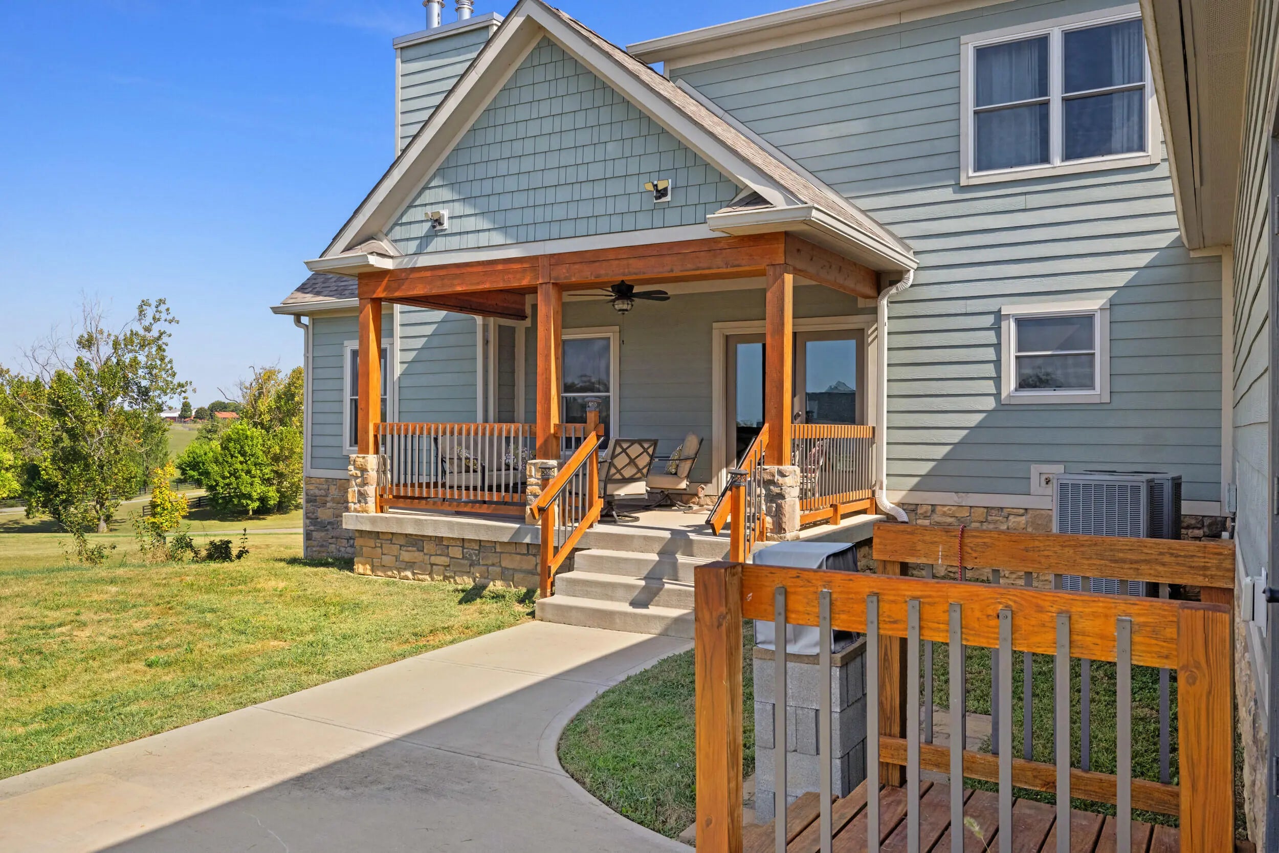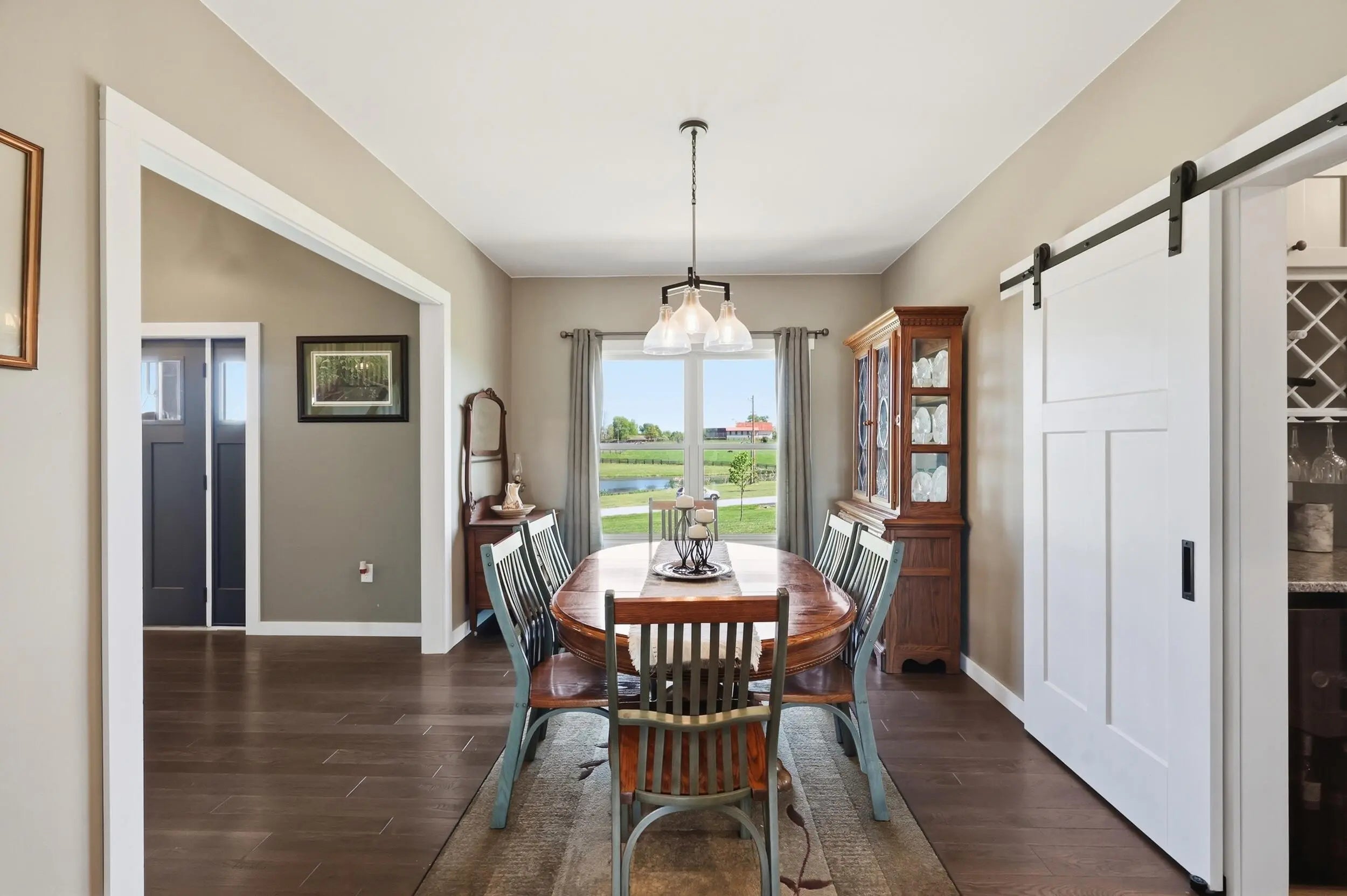 Wow...this is a rare find! Gorgeous story & a half custom-built home with full walk-out basement, sitting on picturesque 5-acre lot, with adjacent barn. The floorplan of this home is a dream! Enter through the covered front porch into formal foyer with open hardwood tread staircase. To the right are French style doors opening into the Study with 9' ceilings, fan & loads of natural light. Private door off the study to a ½ bath with stone top vanity. To the left of the Foyer you will find the Dining Room that is also open to Kitchen & Breakfast. Head from the Foyer straight into the stunning Great Room. The Great Room has a cathedral ceiling, stone hearth wood burning fireplace, beautiful pendant lighting & ceiling fan. The heart of this home is the Kitchen! You will love the beauty and detail of the Amish custom-built maple cabinetry. The cook of the family will love the details including large island, pot filler, bread cabinet, roll-out trash bin, soft close cabinets, & floor to ceiling cabinetry. Need just a bit more kitchen space? No worries, just off the kitchen you will find an incredible Butler style pantry with beverage cooler, wine & stem rack. This home has a private first floor Primary Bedroom & Bath. Walk from the spacious Primary Bedroom into an ensuite bath with 2 walk-in closets, custom tiled shower, soaking tub & double bowl vanity. One of the closets has a sit-down vanity with salon style roll-out cabinet! There is a first floor mudroom with drop zone & separate laundry room! The second level offers an open flex space overlooking the Great Room, full hall bath, & 2 generous size bedrooms with large closets. There is a large hall closet & off of Bedroom 3 you will find a huge walk-in storage area!!! The lower level offers over 2300 more square feet of living! This does not feel like your typical basement... it is truly another level with walk-out exit and loads of natural light. There is a den/office with 2 closets, gathering family room area, recreation area with walk-up wet bar, exercise room, & 4th bedroom. The full bath in the lower level has a low threshold walk-in shower. There is also an area under the front porch that could be used as a safe room or would make a perfect wine cellar! This home has an attached 3 car garage with over 800 square feet of space. Enjoy entertaining or relaxing on the covered back patio. Need a little more space? Walk out back to the adjacent barn built to match the home! This oversized barn has electric, water and gravel floor ready for concrete if desired! There are so many details to this home so be sure to scroll the pictures & videos! This is a home you will definitely want to view in person!